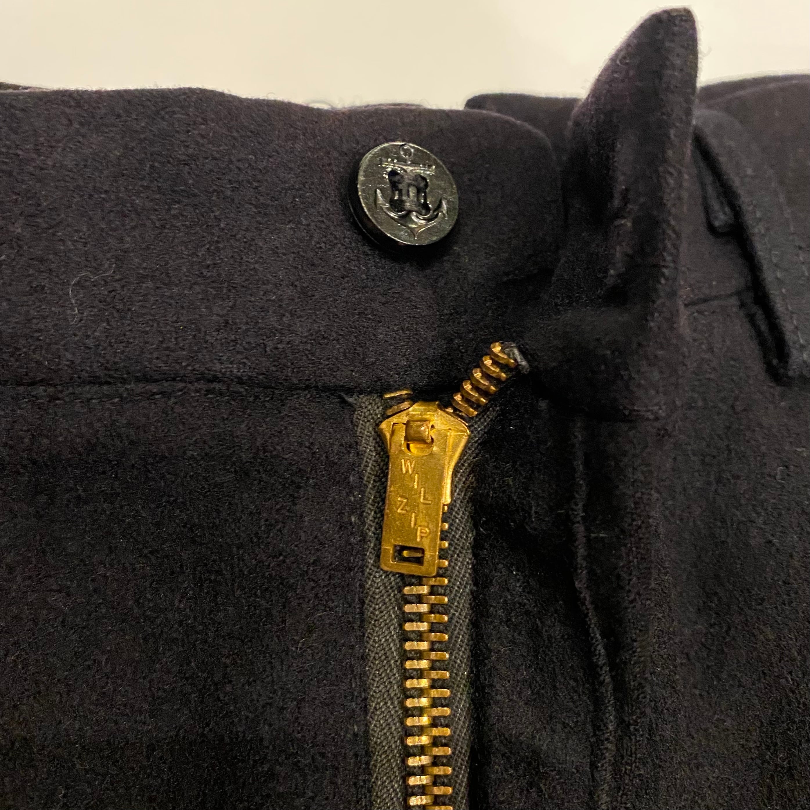 1950年代ビンテージのU.S.NAVY のウールスラックスパンツになります。黒っぽい濃紺カラー、古い目の詰まったウール生地です。裾幅が広く裾にかけてズドっと太いシルエットです。ボタンがたくさん付くセーラータイプではなく、シンプルでベルトループが付くこちらのタイプは使いやすく意外と無いアイテムだと思います。サイズバランスも良くおすすめです。※フロント両ポケット欠損していて縁が縫い付けられていて使用不可となっております。バックポケットボタンひとつ欠損しています。