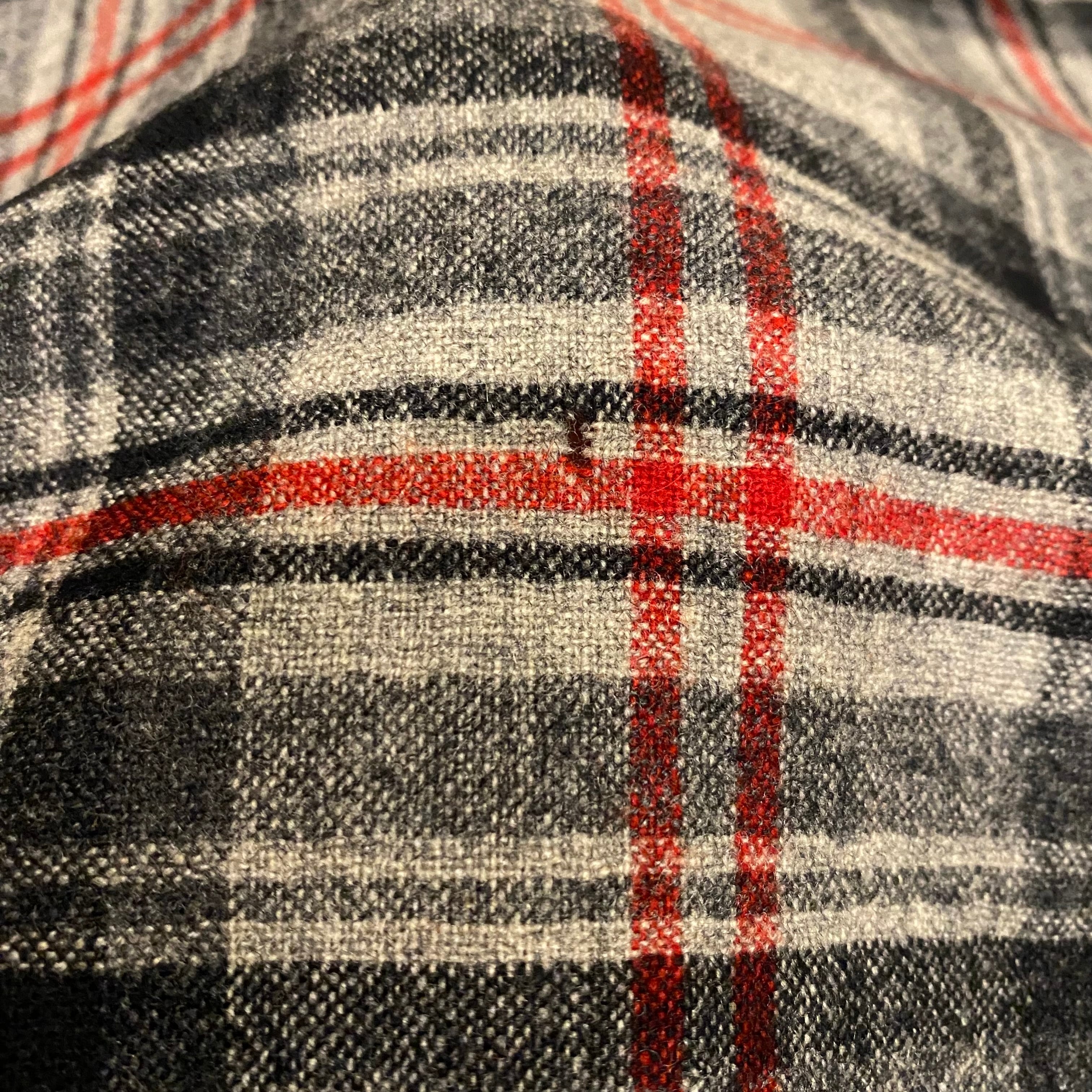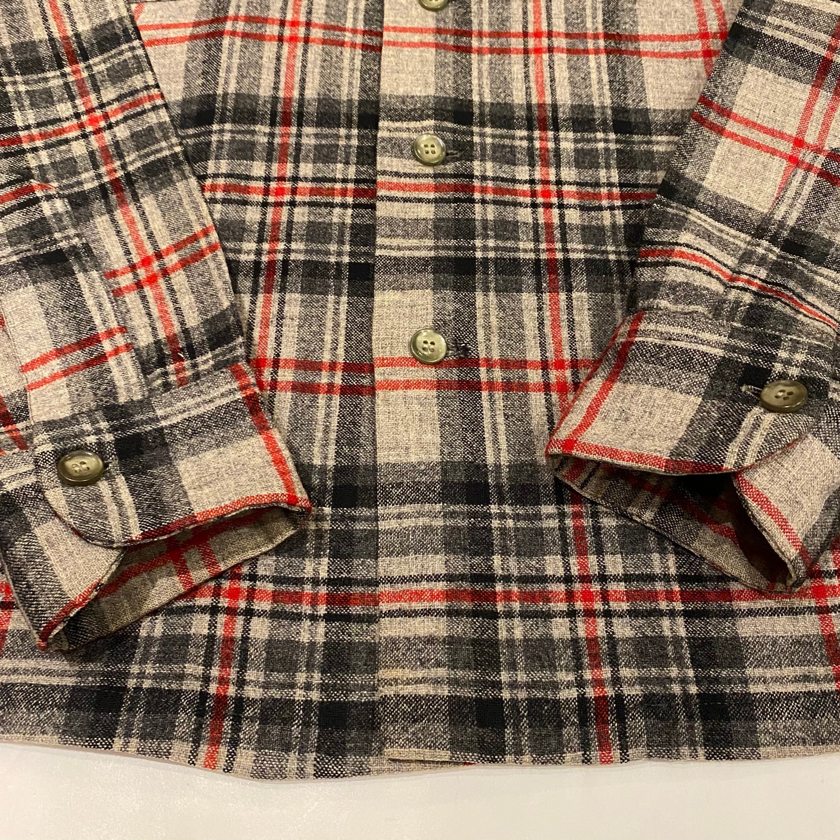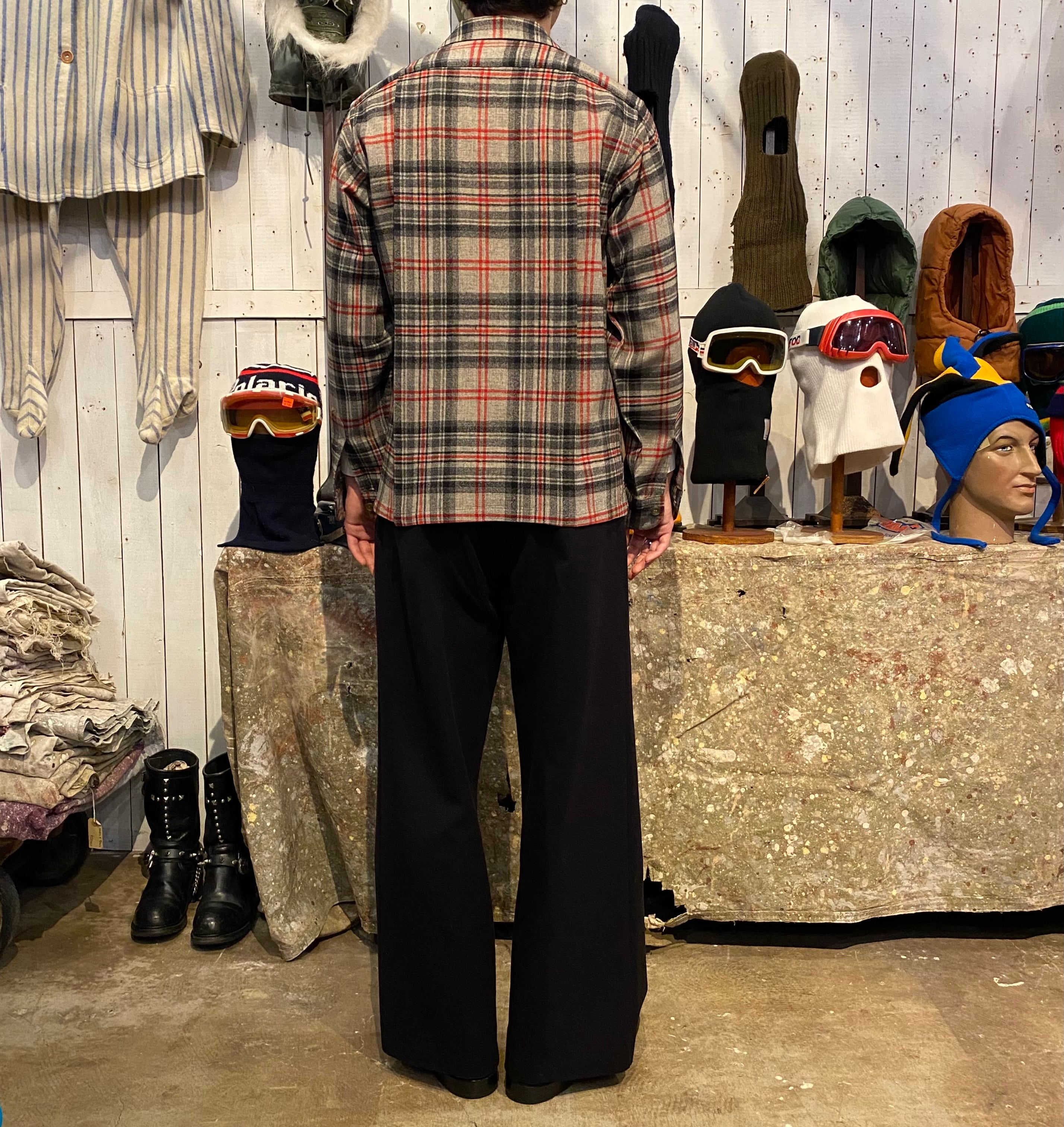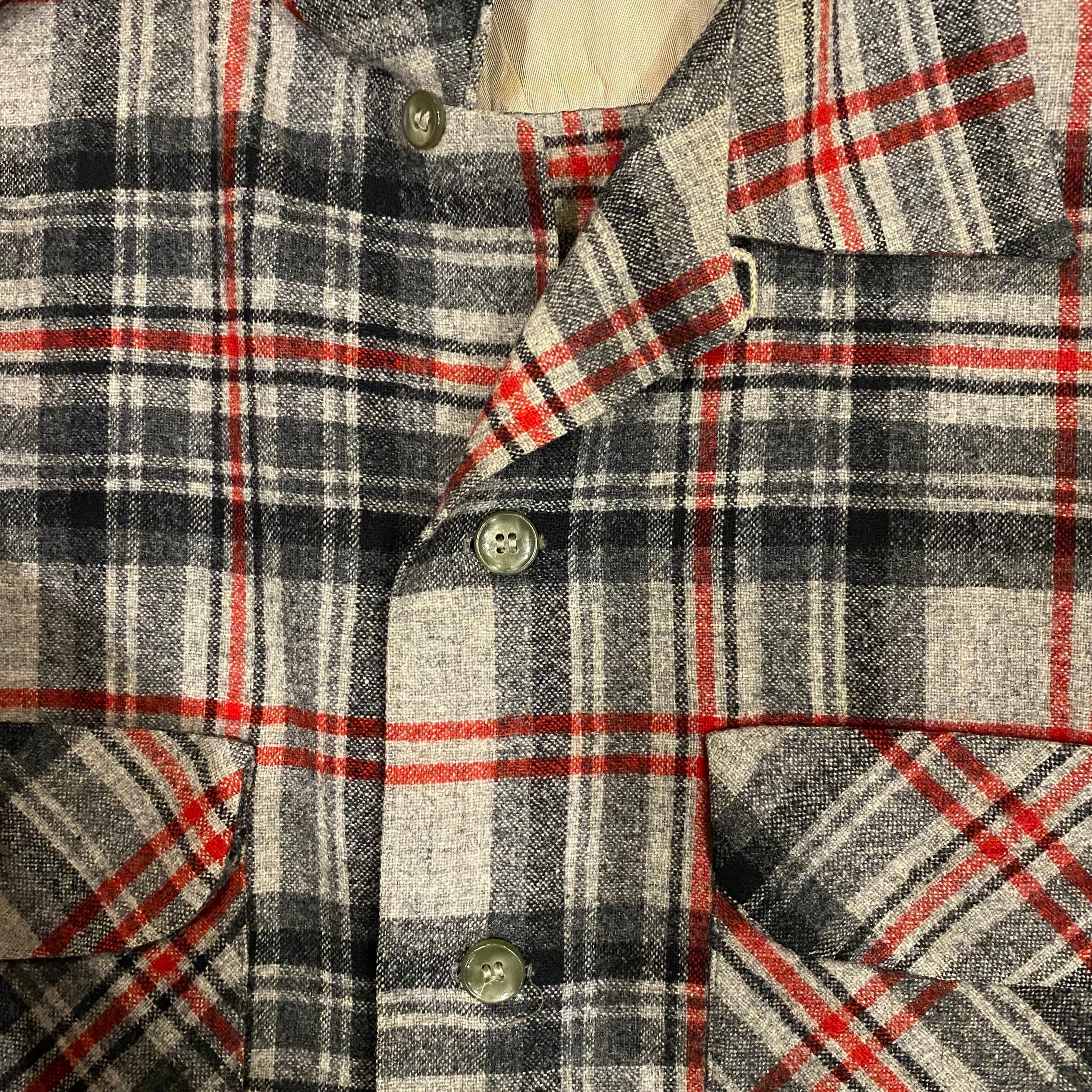 古い1950年代のビンテージペンドルトンになります。ボックスシルエットのオープンカラータイプです。グレー×ブラック×レッドの配色。同系色のグレーの練りボタンも雰囲気があります。サイズMサイズ表記でバジっとジャストサイズで着ていただけるサイズ感です。50sのスラックスとキャップトゥのレザーシューズをジャストサイズで合わせてコーディネートしました。※右そでの剣ぼろ横に小穴、右ひじ付近生地が薄くなっている箇所が有ります。後ろ身頃真ん中あたりに小穴があります。