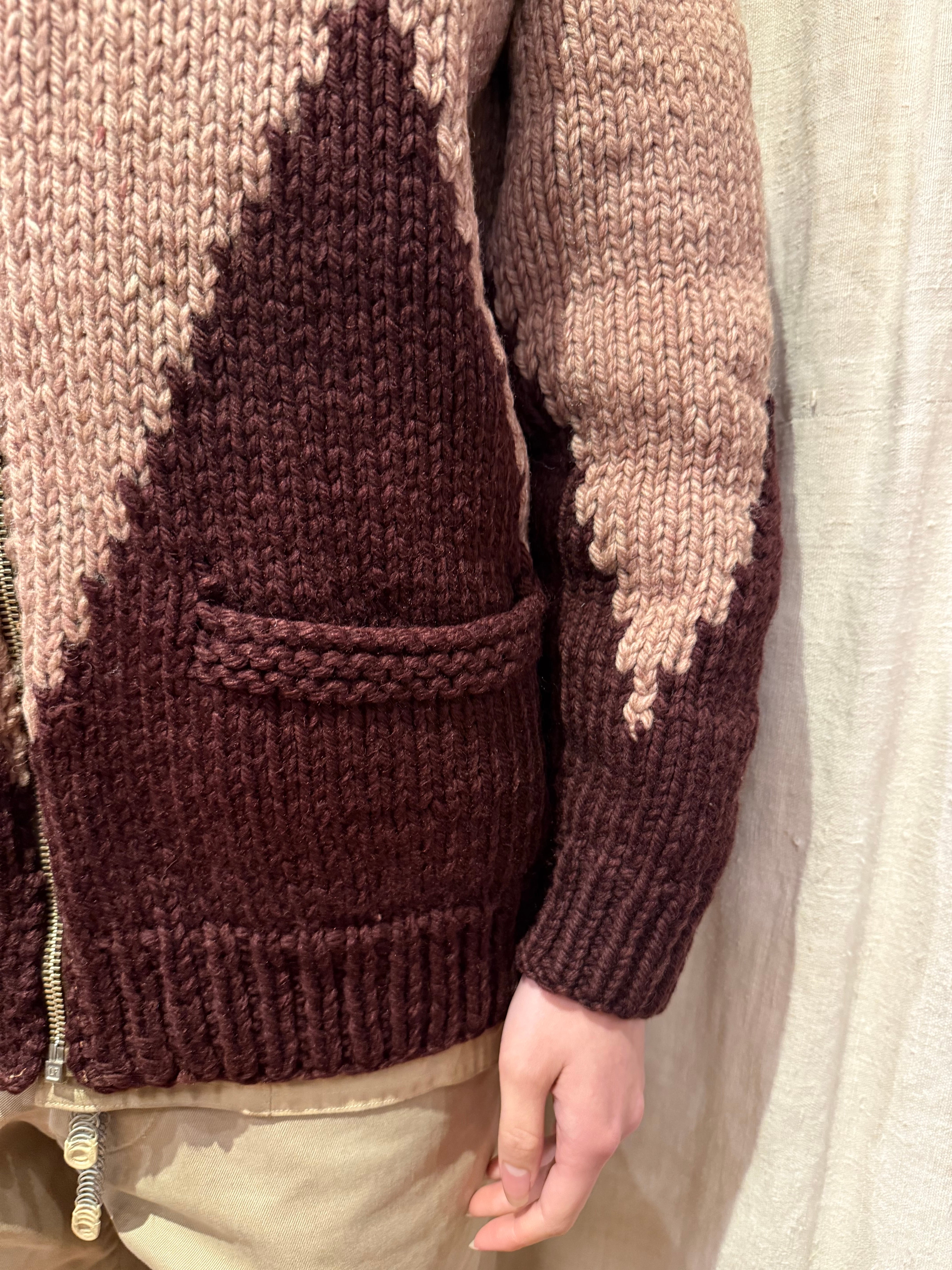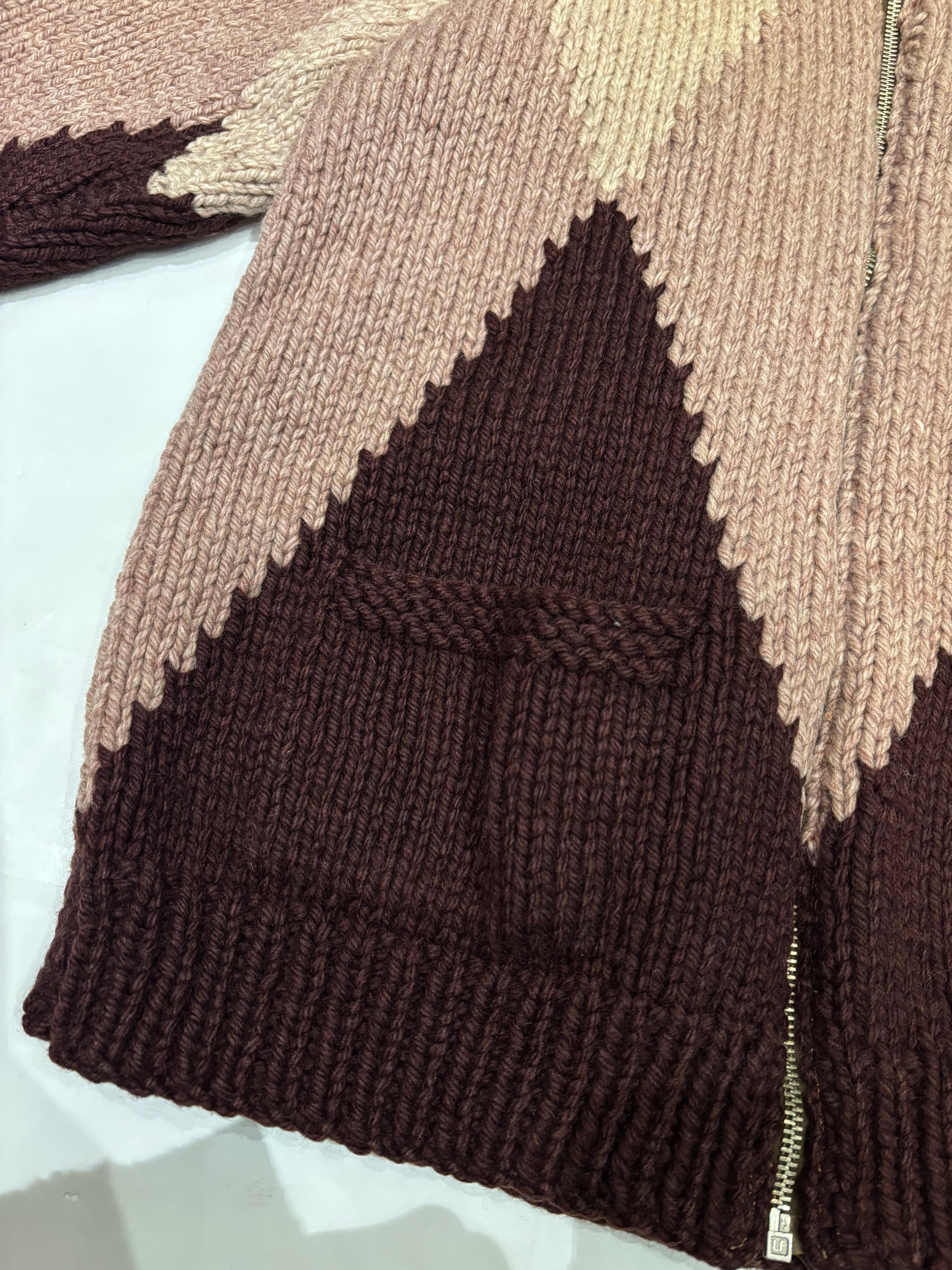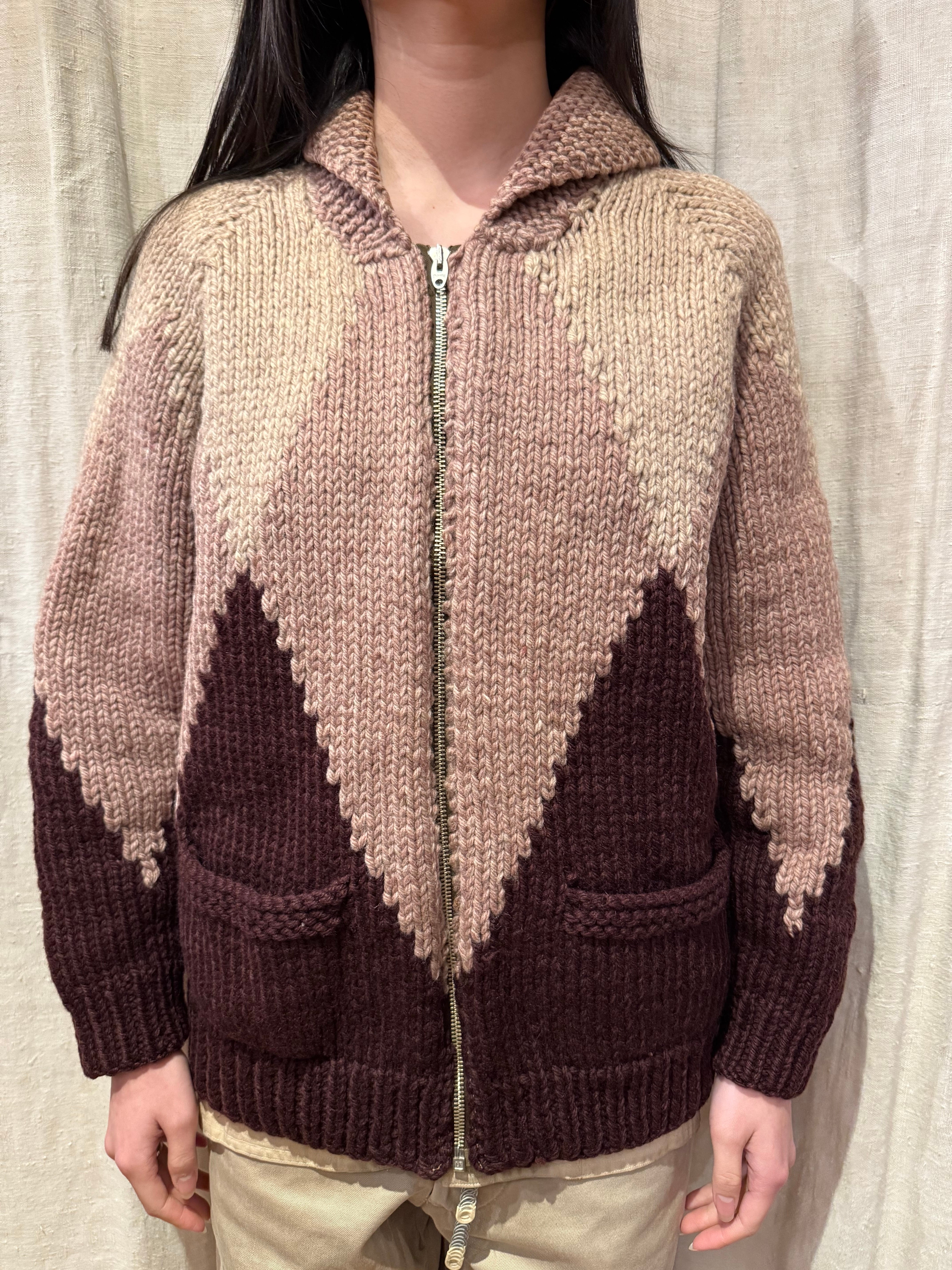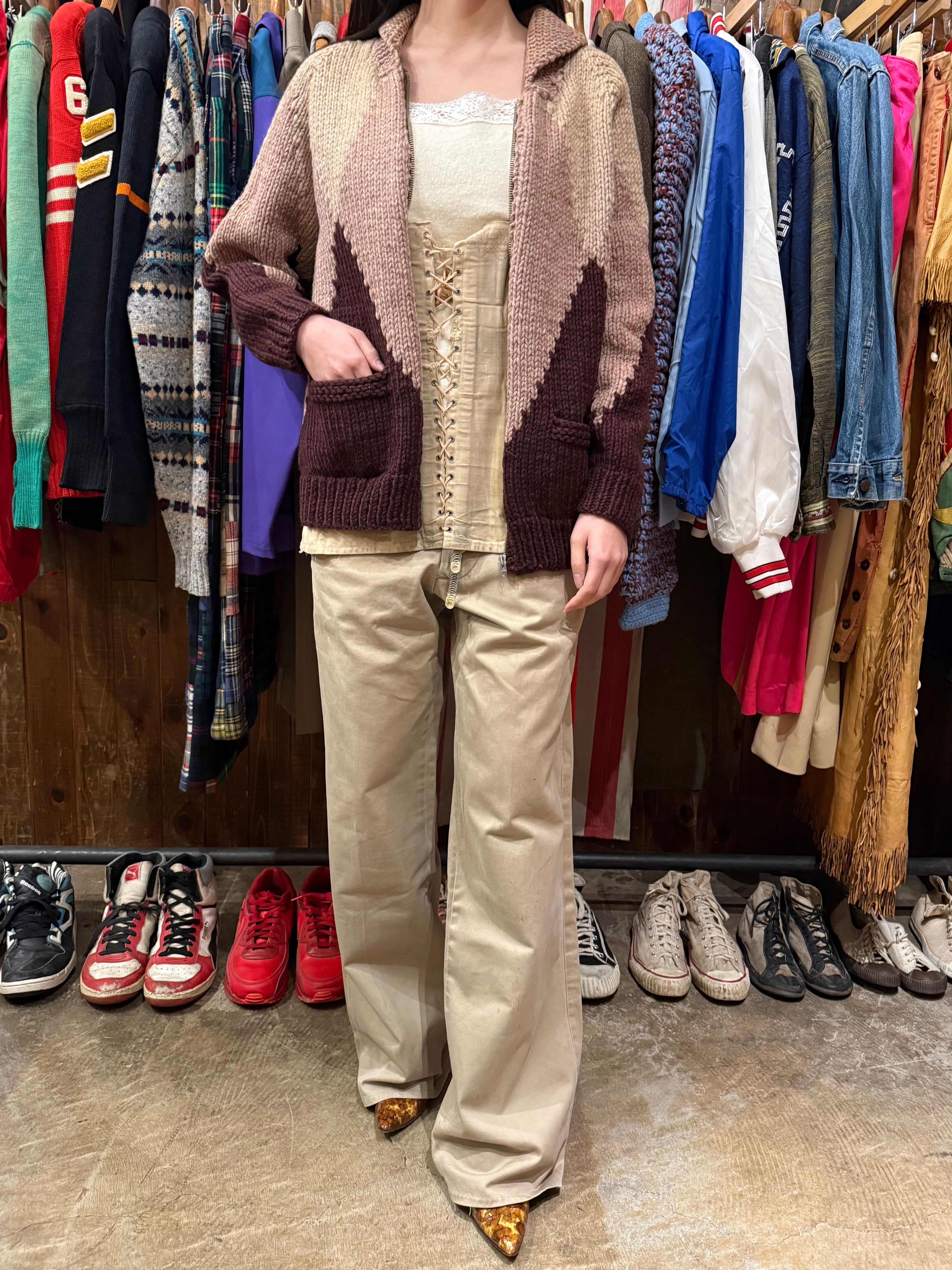 古いカウチンニットジャケットでございます。こちらはカウチンの中でも珍しいノーモチーフタイプ。王道過ぎない感じがかっこよく、配色も可愛らしいです。女性の方でも挑戦しやすいのかなと。見た目よりも温かい作りなので今の時期にオススメです。