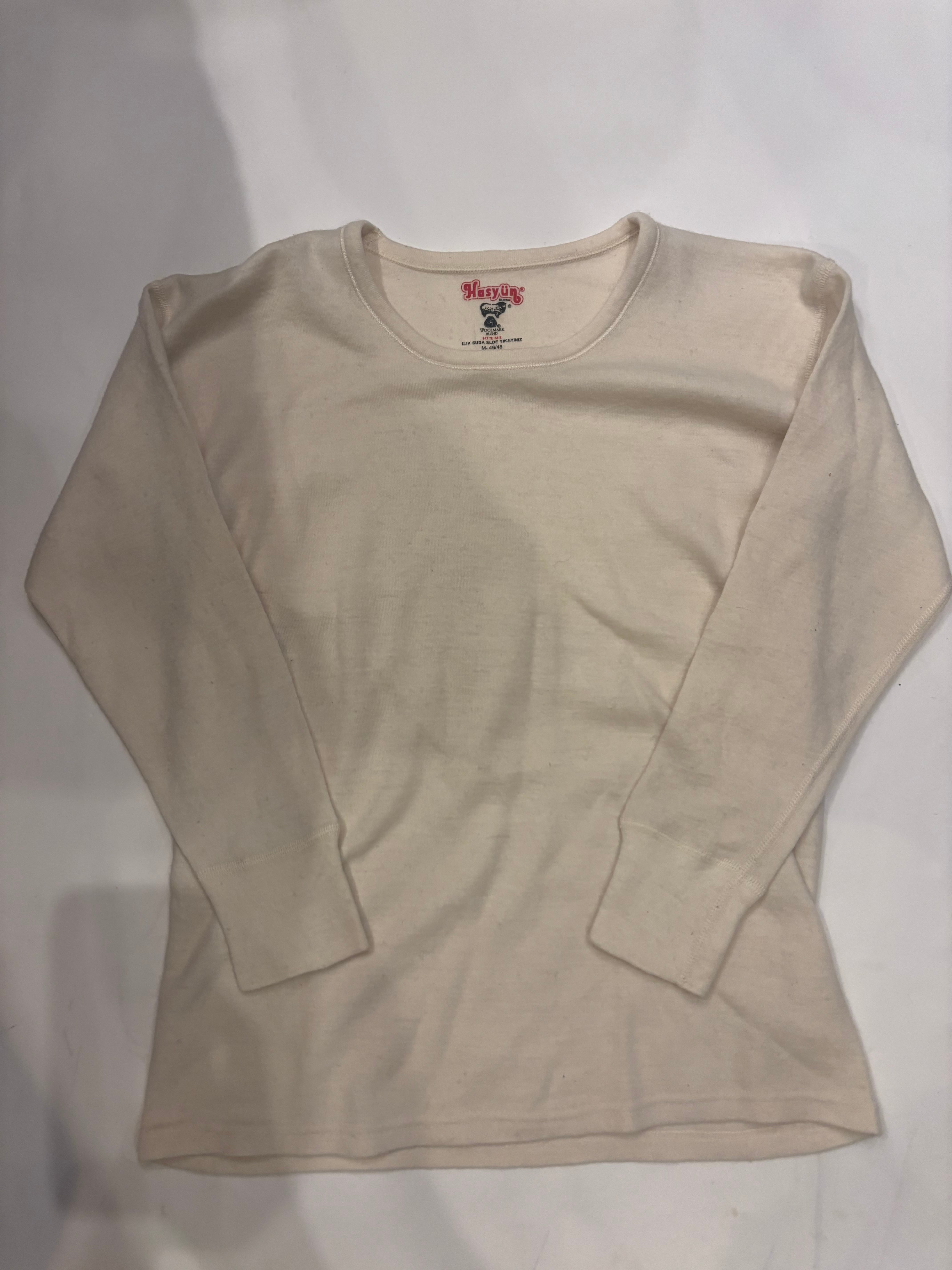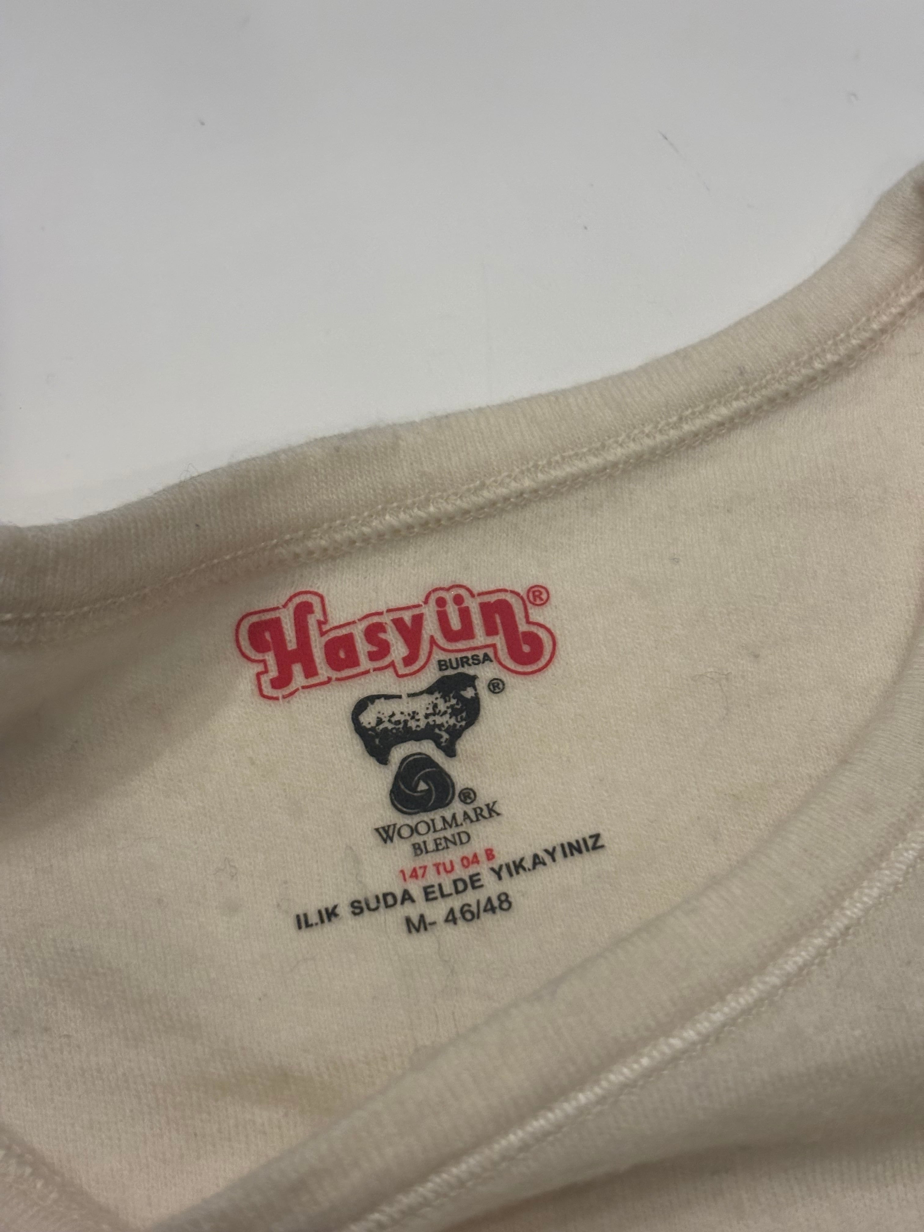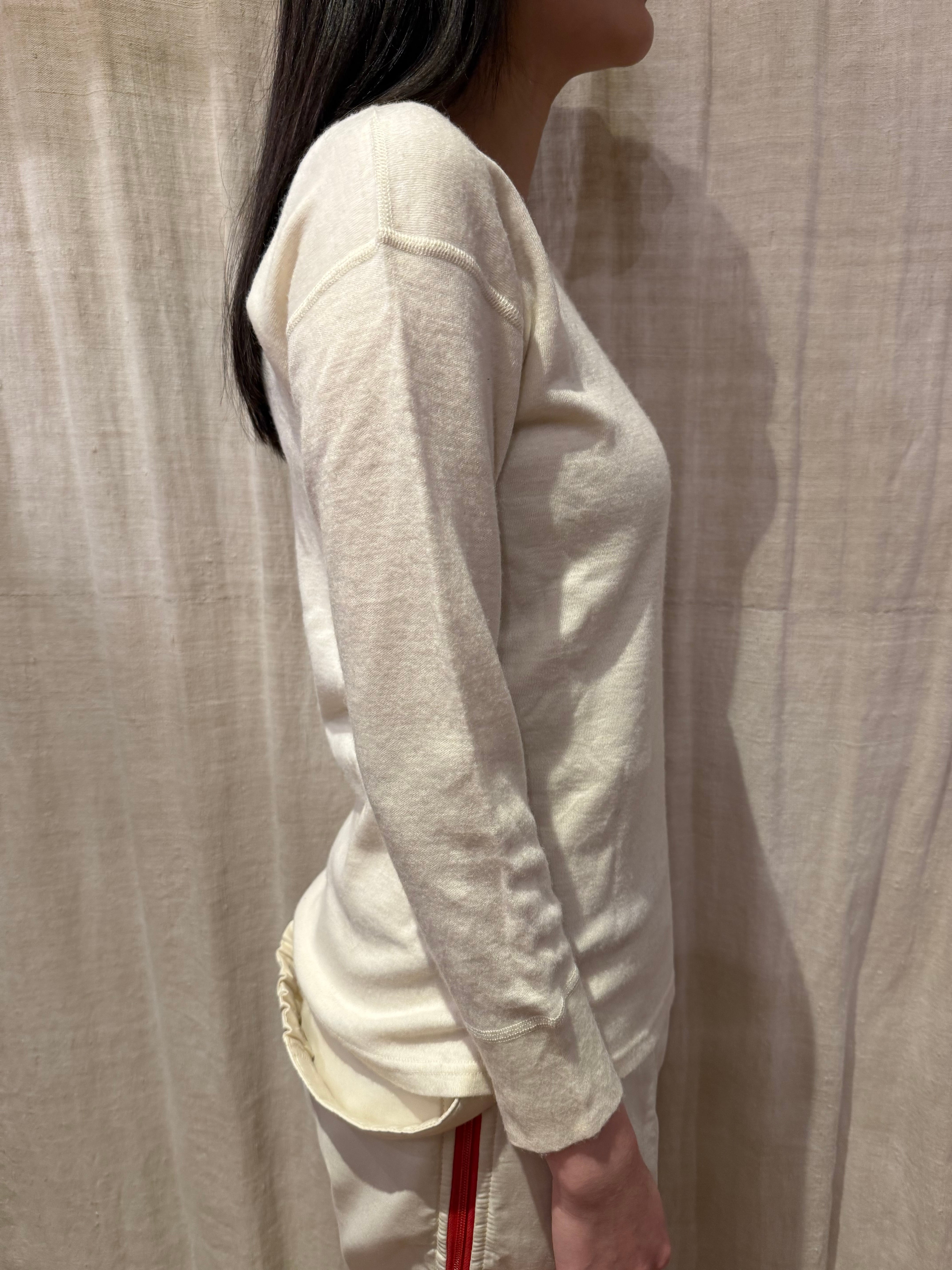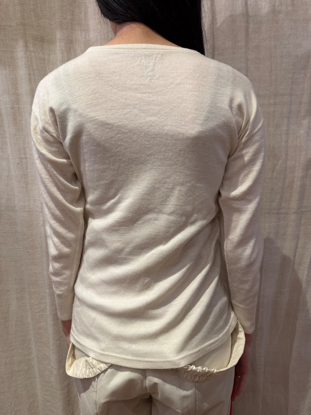 ウールのアンダーウェアでございます。ウールなので普通のtシャツよりも暖かく、起毛した感じも暖かさを感じさせてくれます。インナーとしては勿論。白でコーディネートを組んだ際にも使い勝手がよく、ランジェリーやキャミソールドレスなどとも相性抜群です。