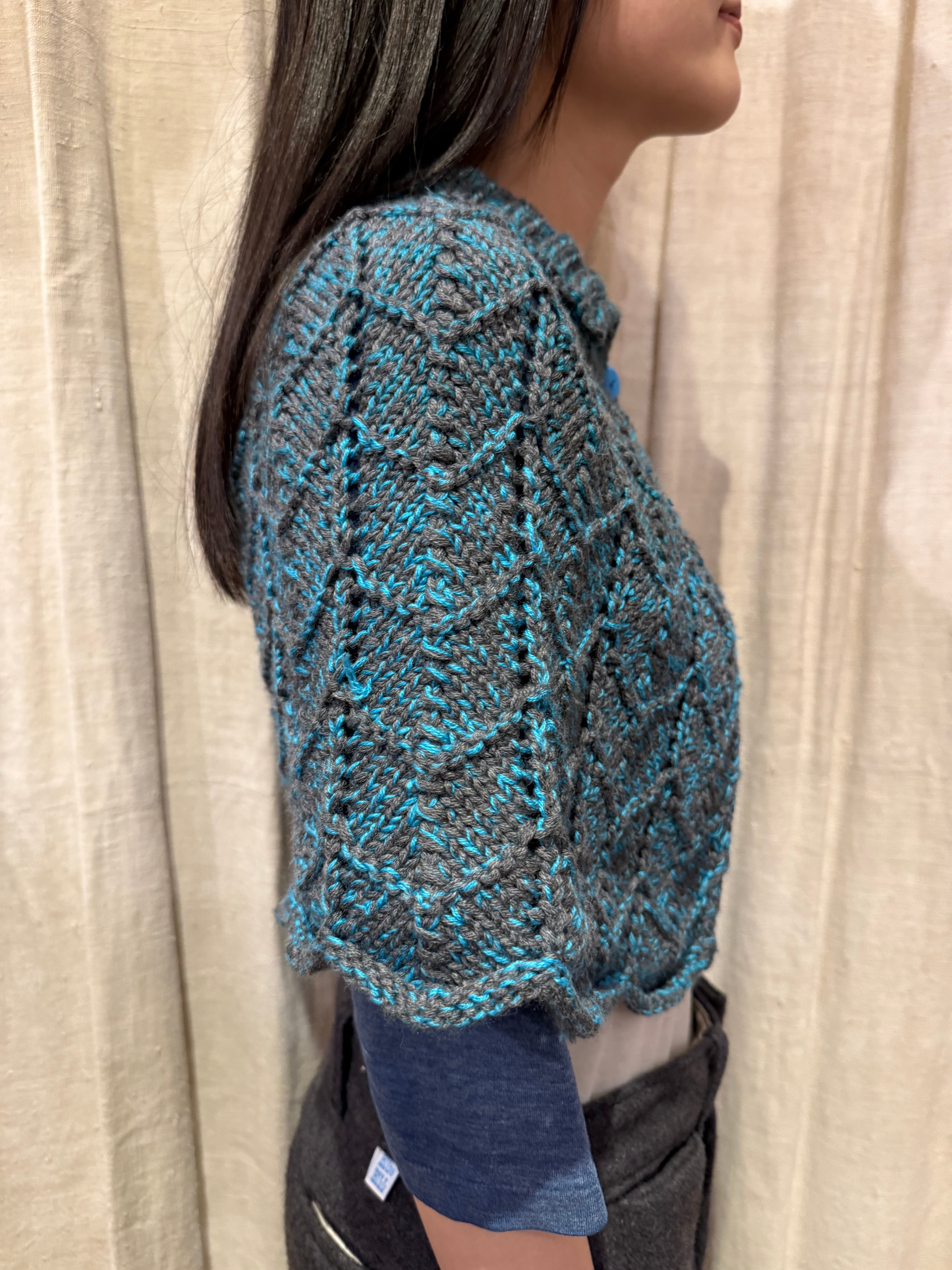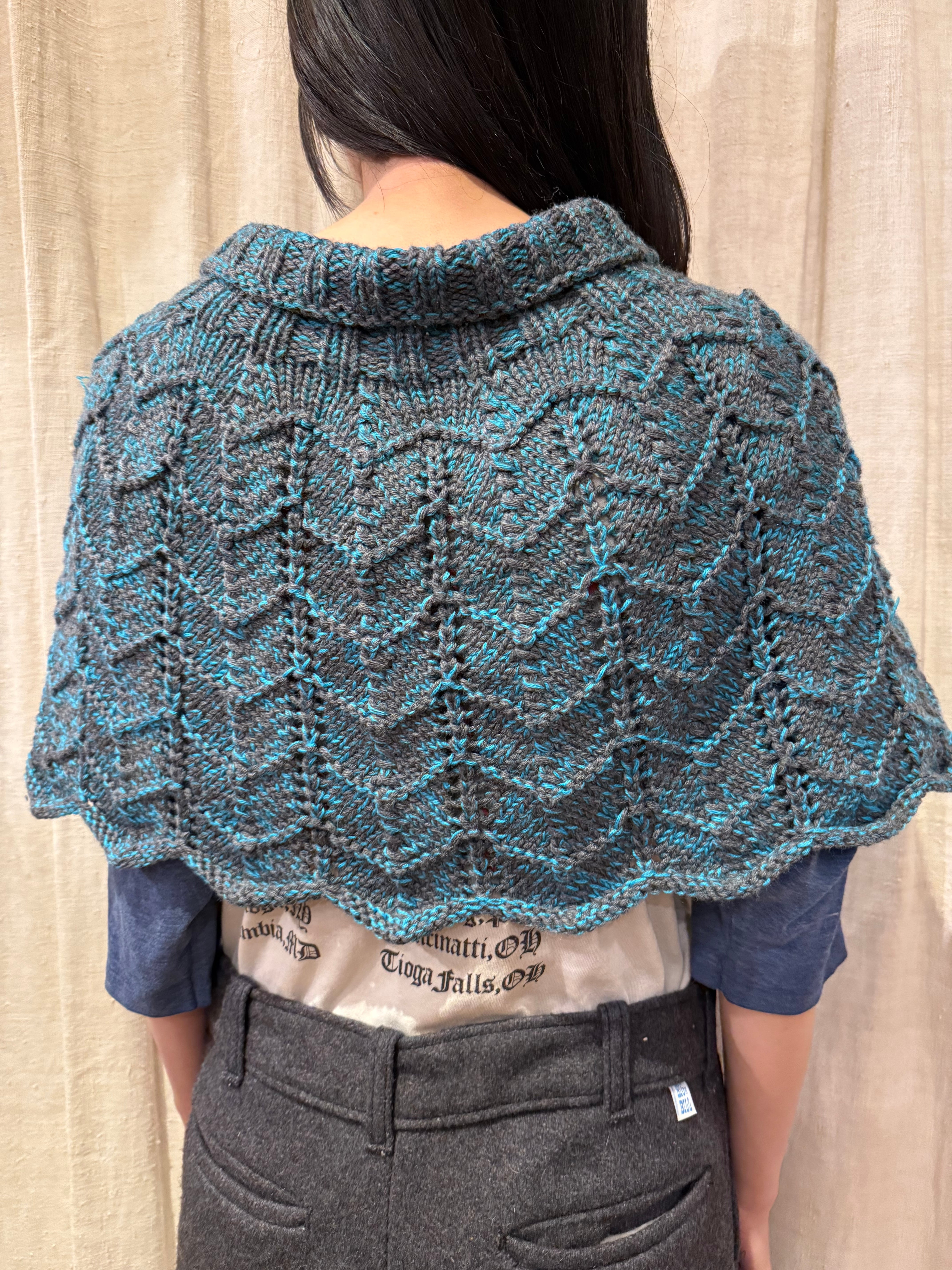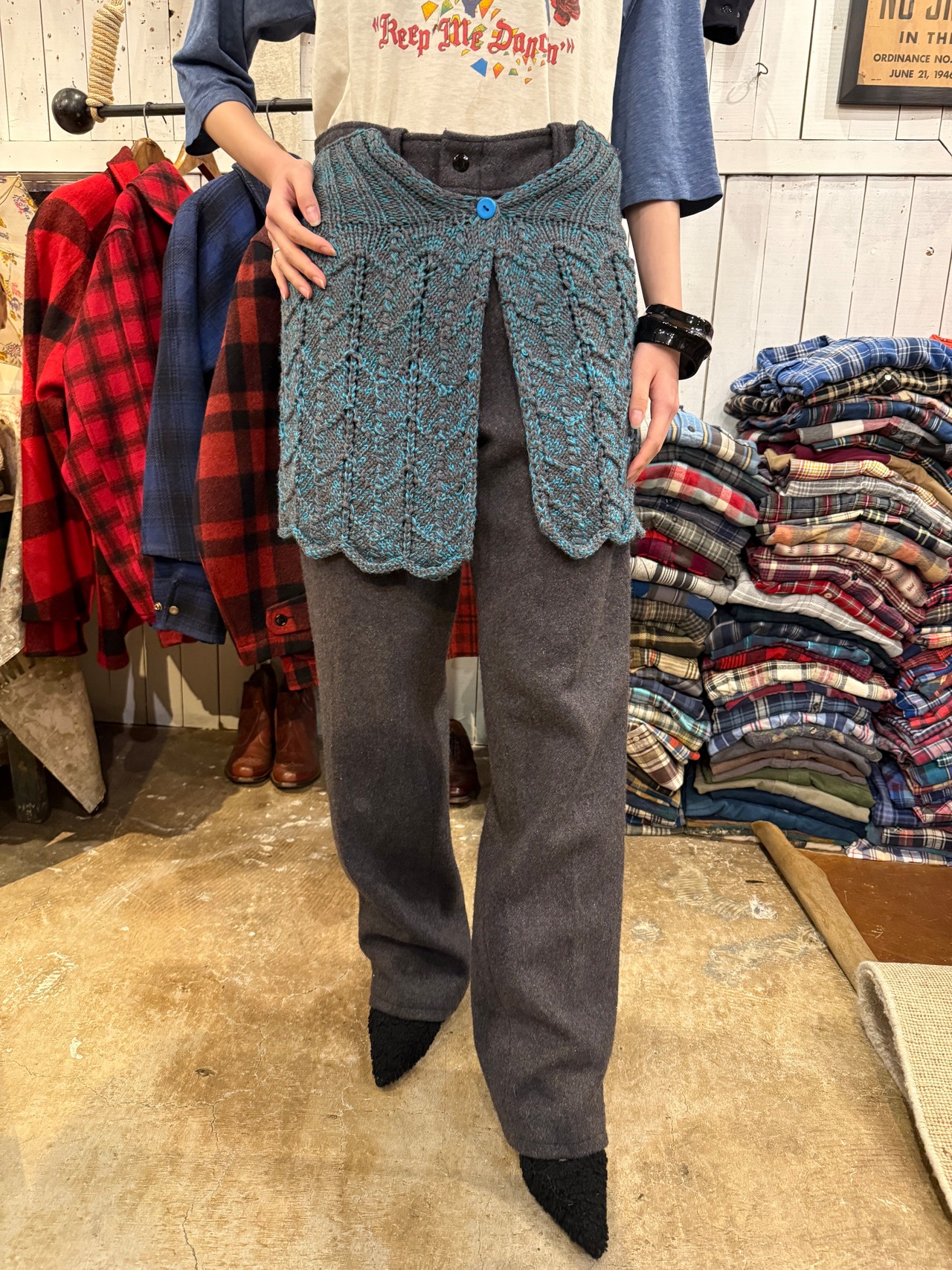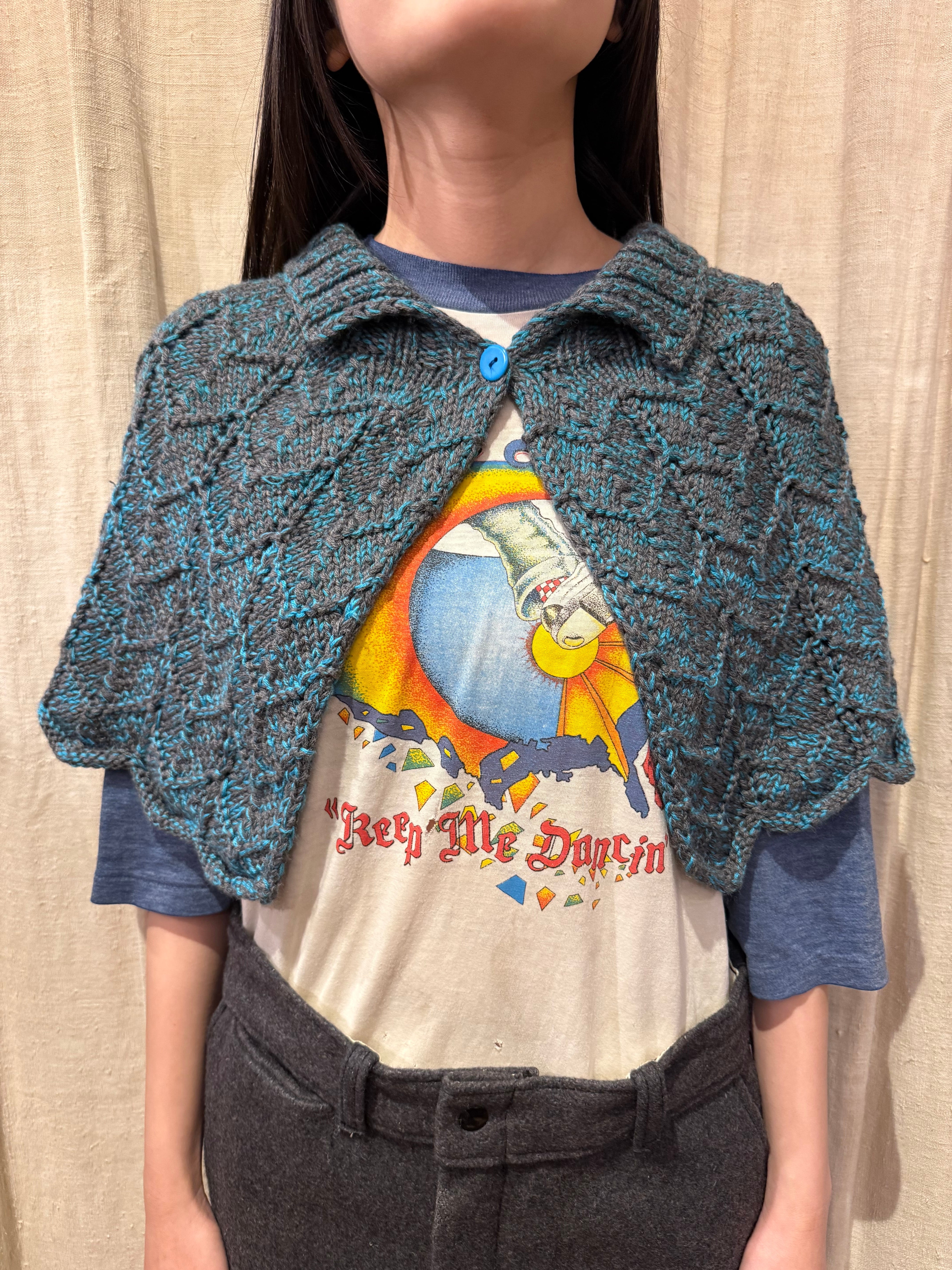 ブルーとグレーの配色が可愛らしいニットケープ。ハンドメイドのような程よくチープな見た目が可愛らしく見えます。ボタンを一点留めの仕様ですがピンやブローチで留めても◎スカートとしても使えるのでレイヤードが色々楽しめそうです。