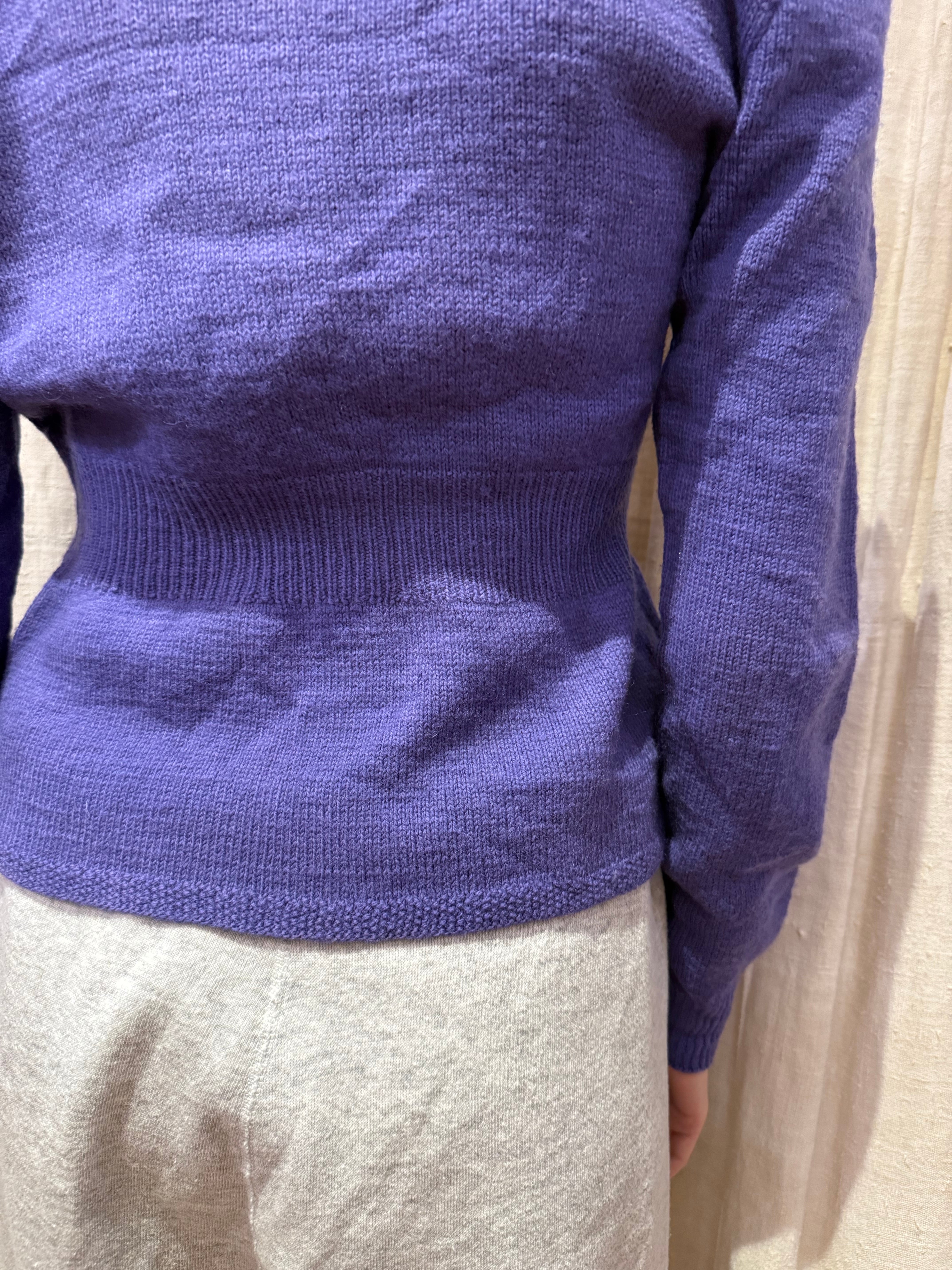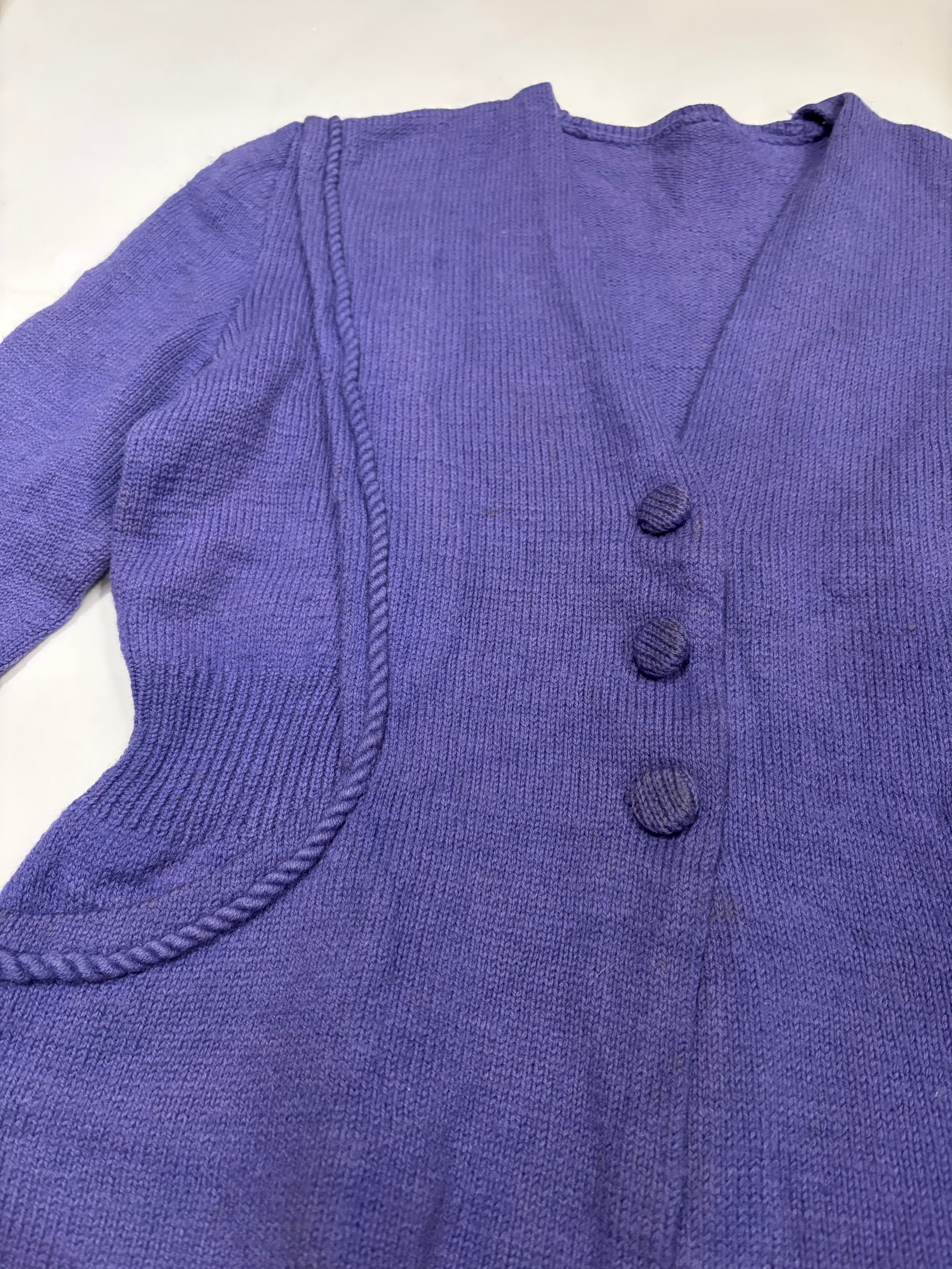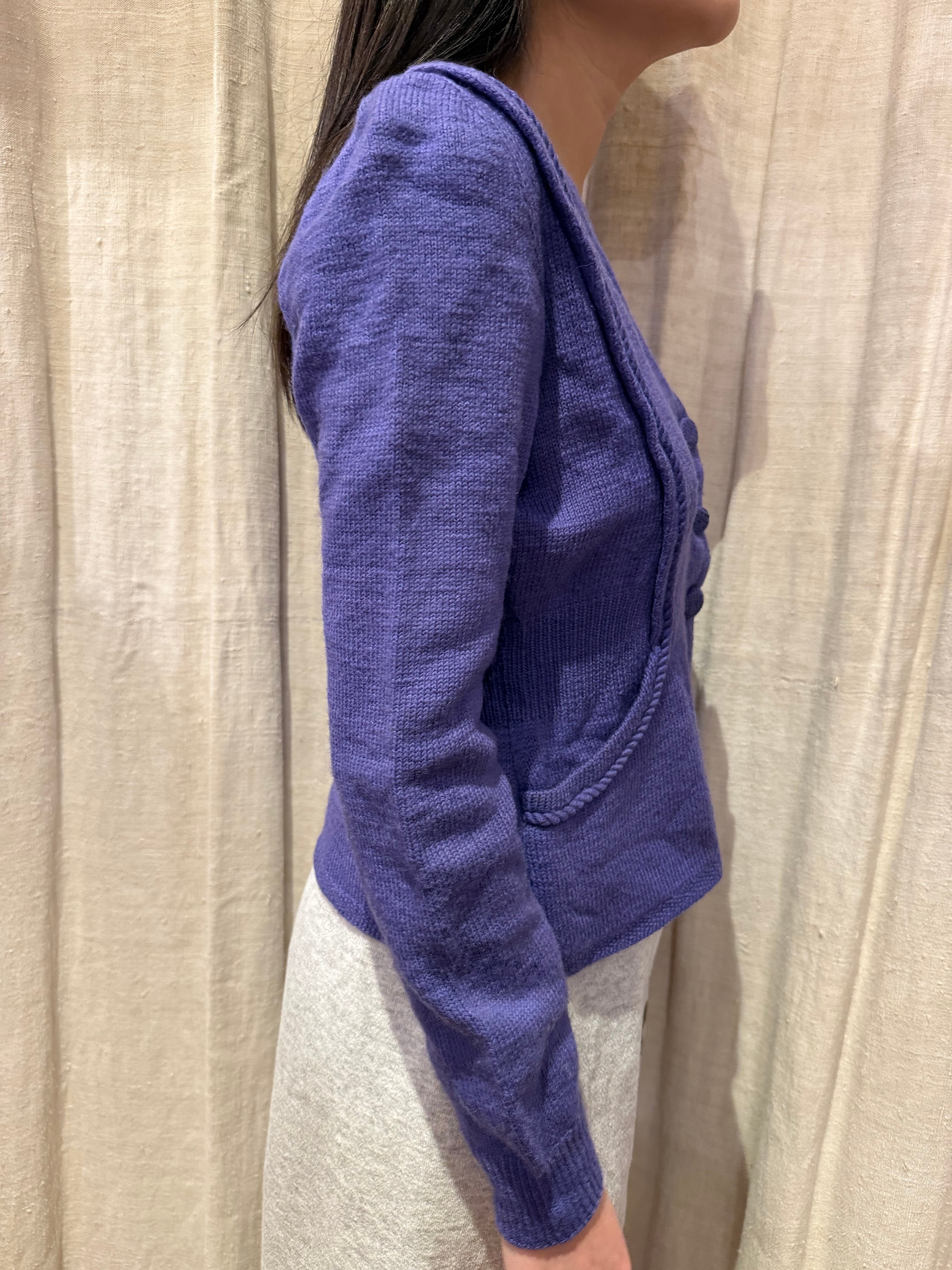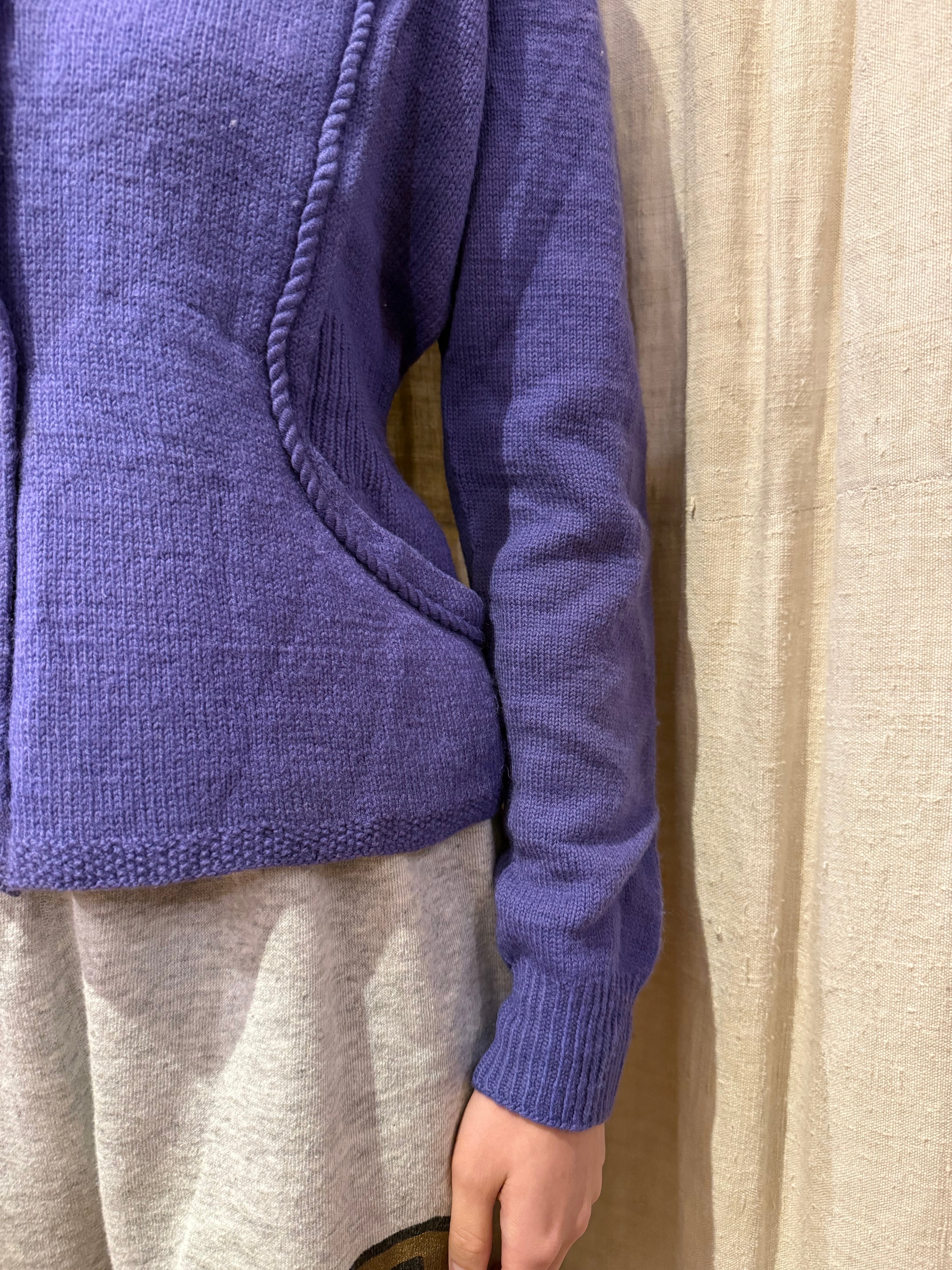 パープルカラーが可愛らしいカーディガン。コロンとした丸みのあるボタンに切り返して編み込みの様なデザインが◎そこまで厚手すぎず、ウエストマークがリブで入っているので着膨れせずにインナーとしても使えます。レイヤードにもおすすめです。