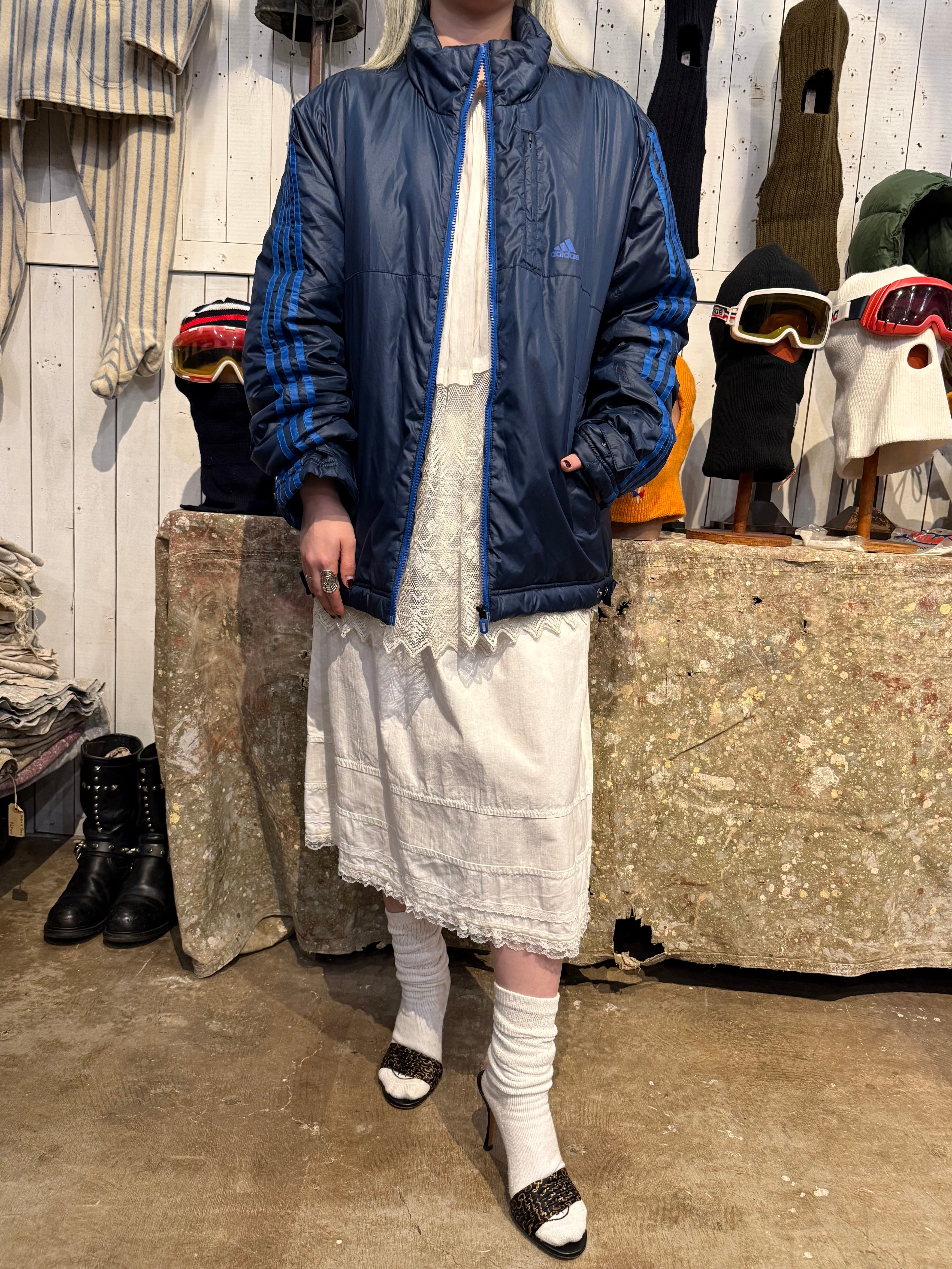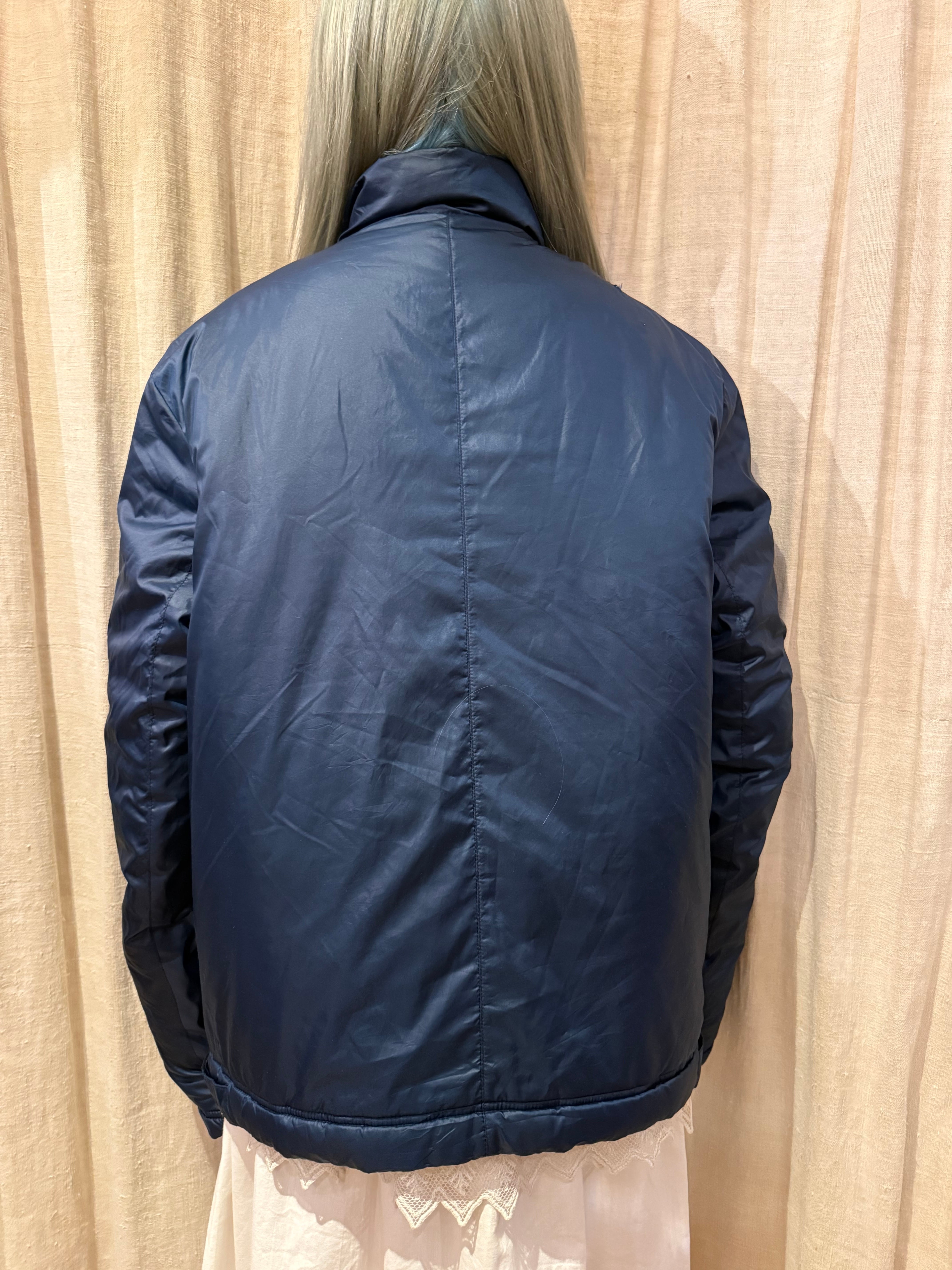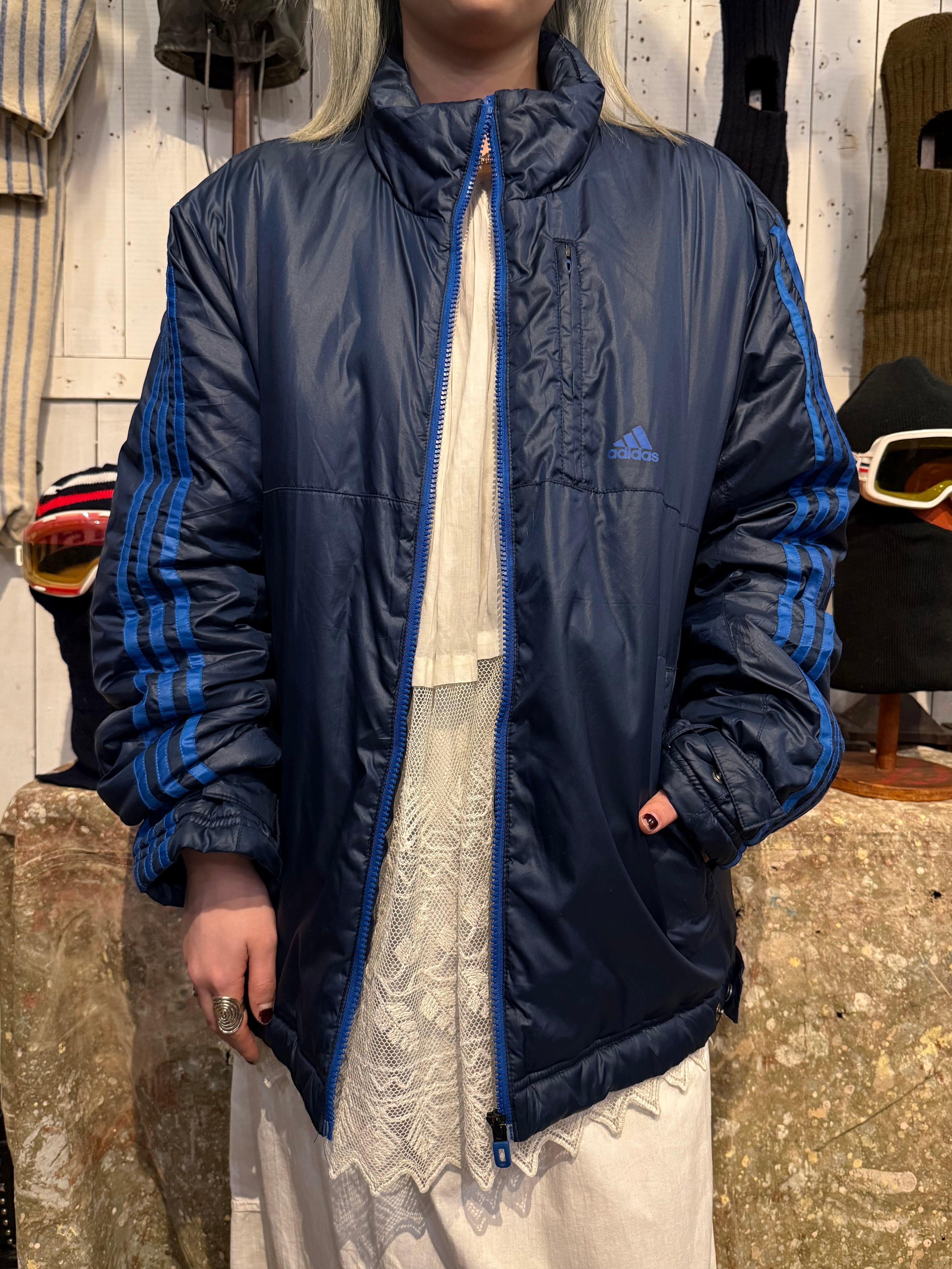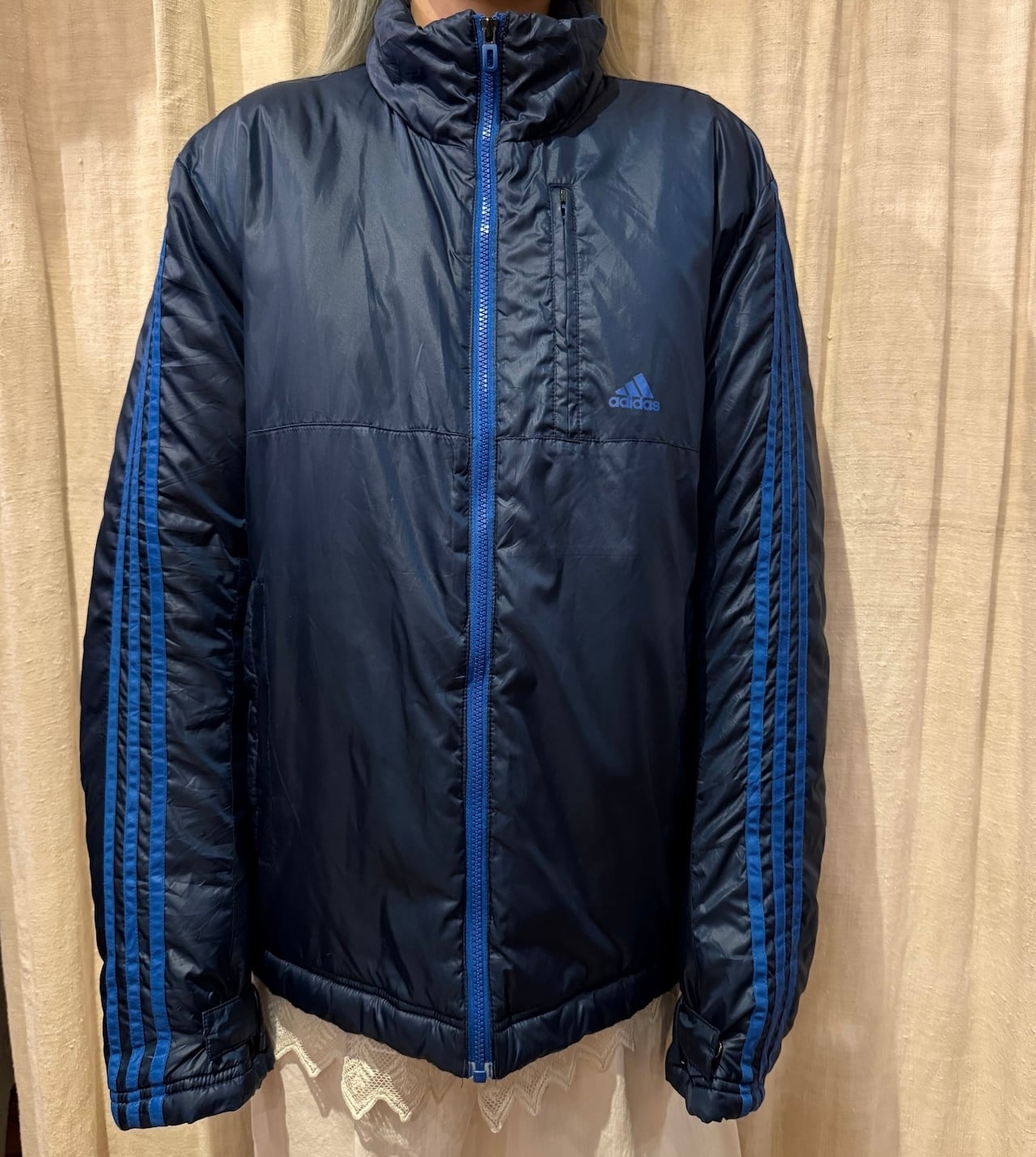 中綿の入った温かな着心地のパデッドジャケット。大きすぎないサイズ感で、ダブルジップになっているのもポイントです。ネイビー&ブルーの配色でコーディネートにも組み込みやすく、気軽に着れるのでオススメです。