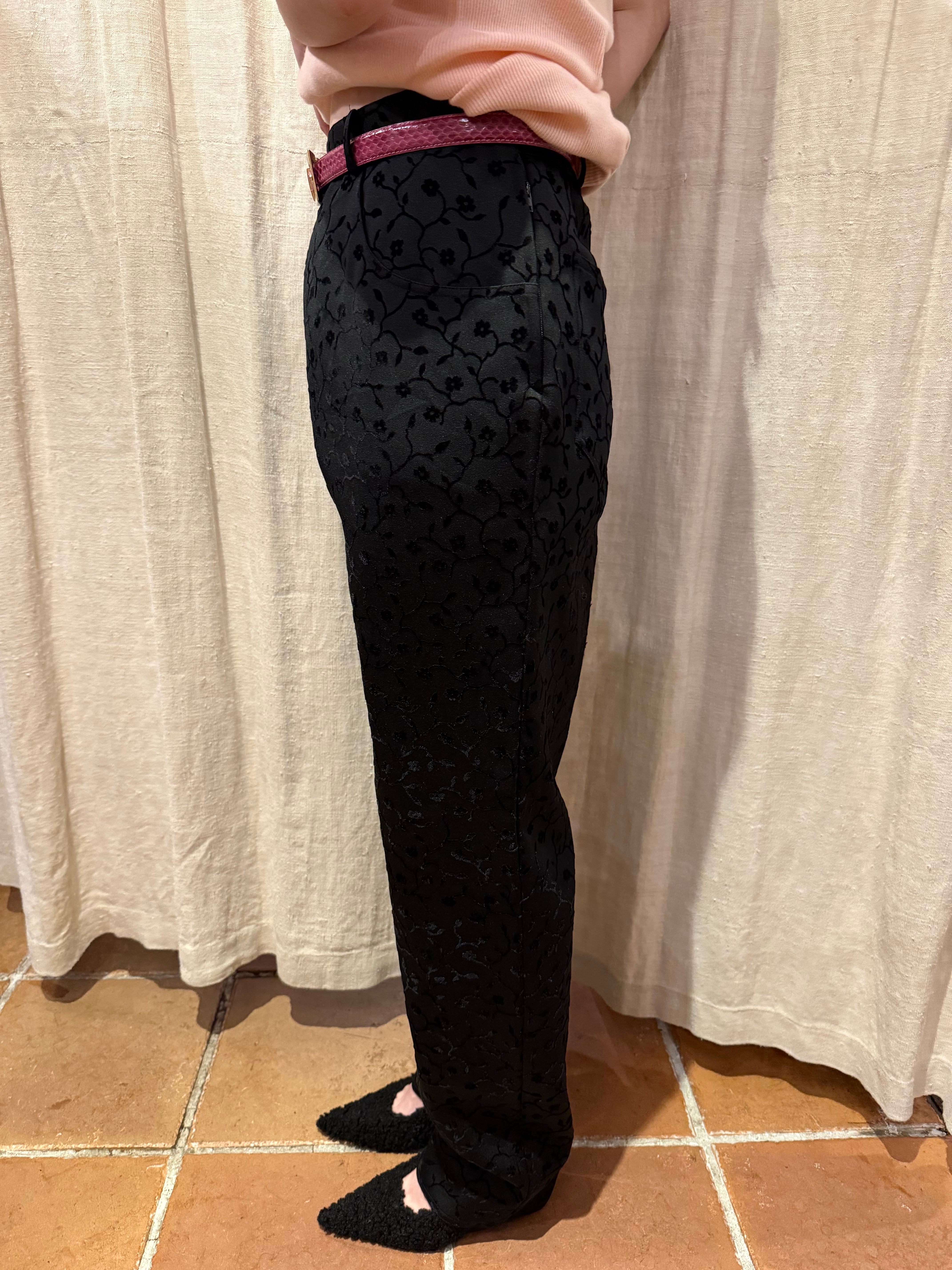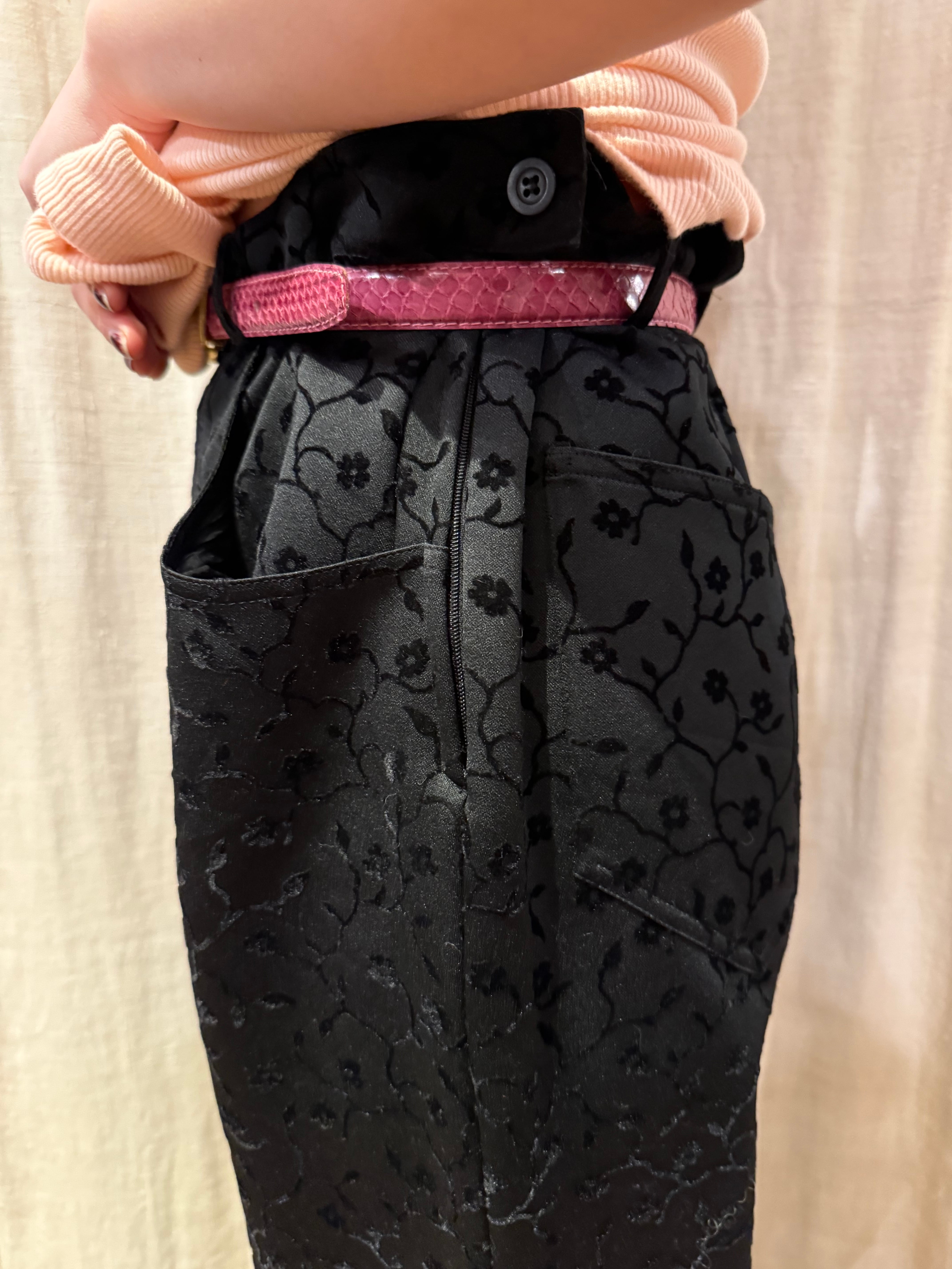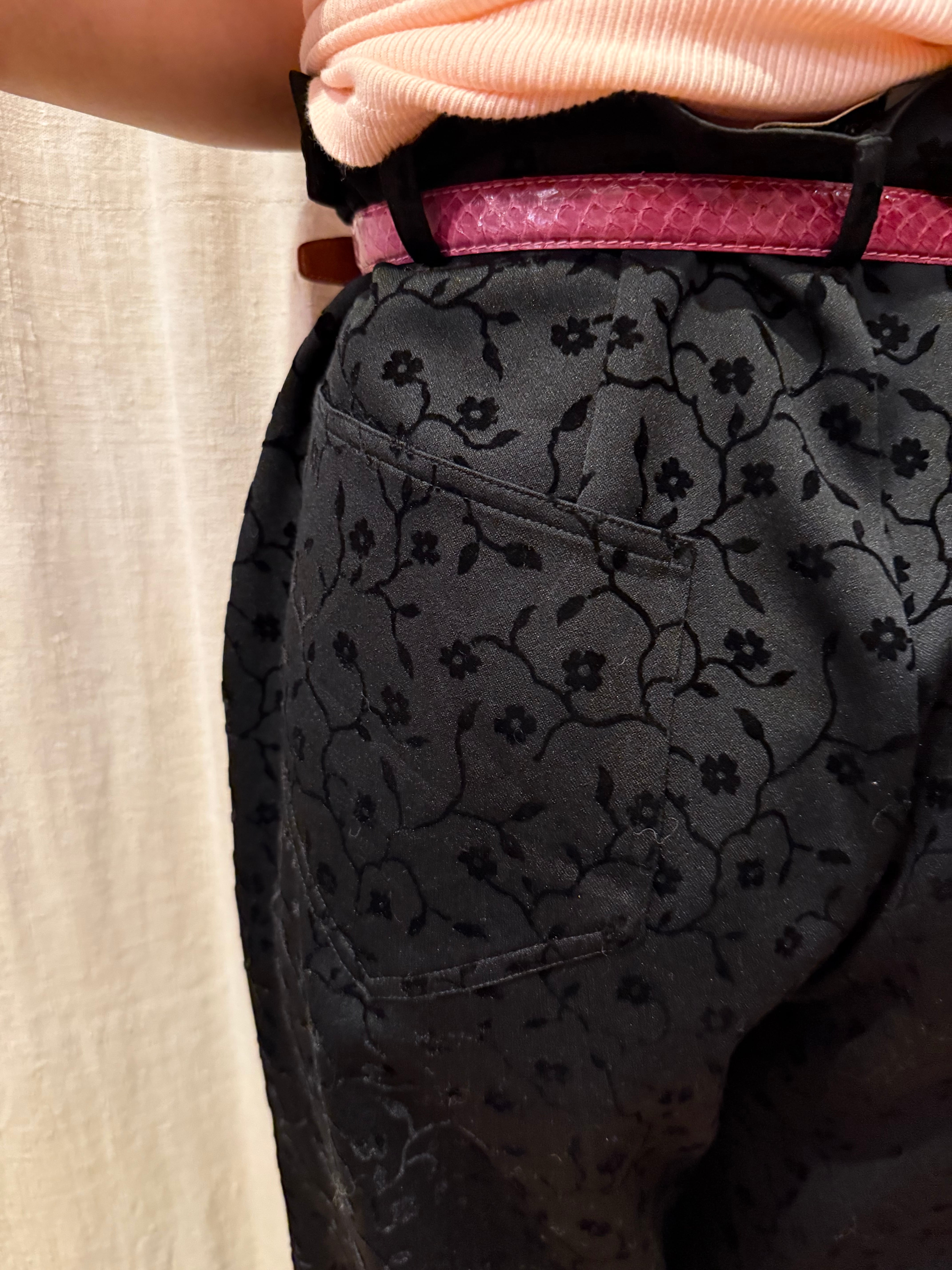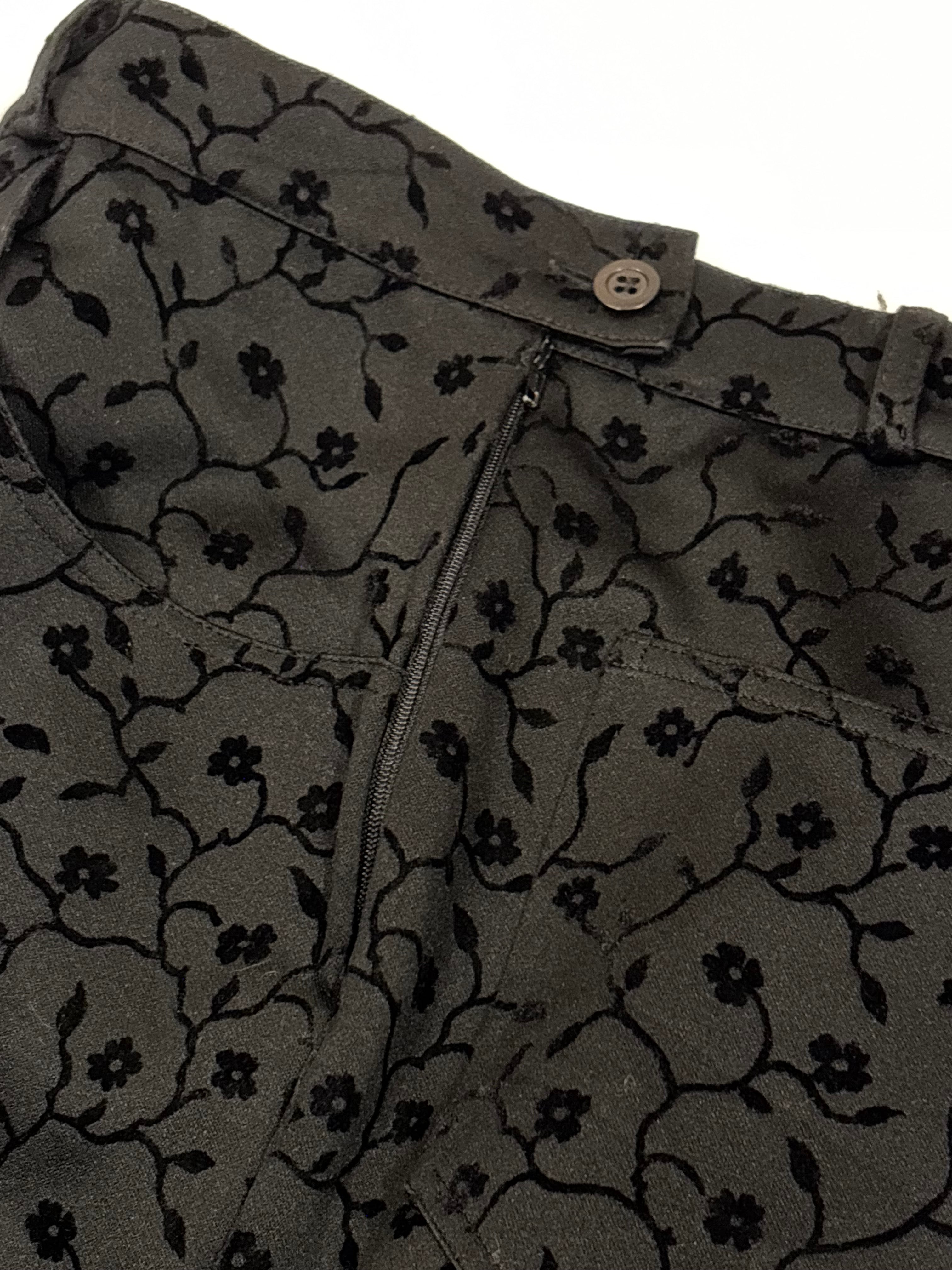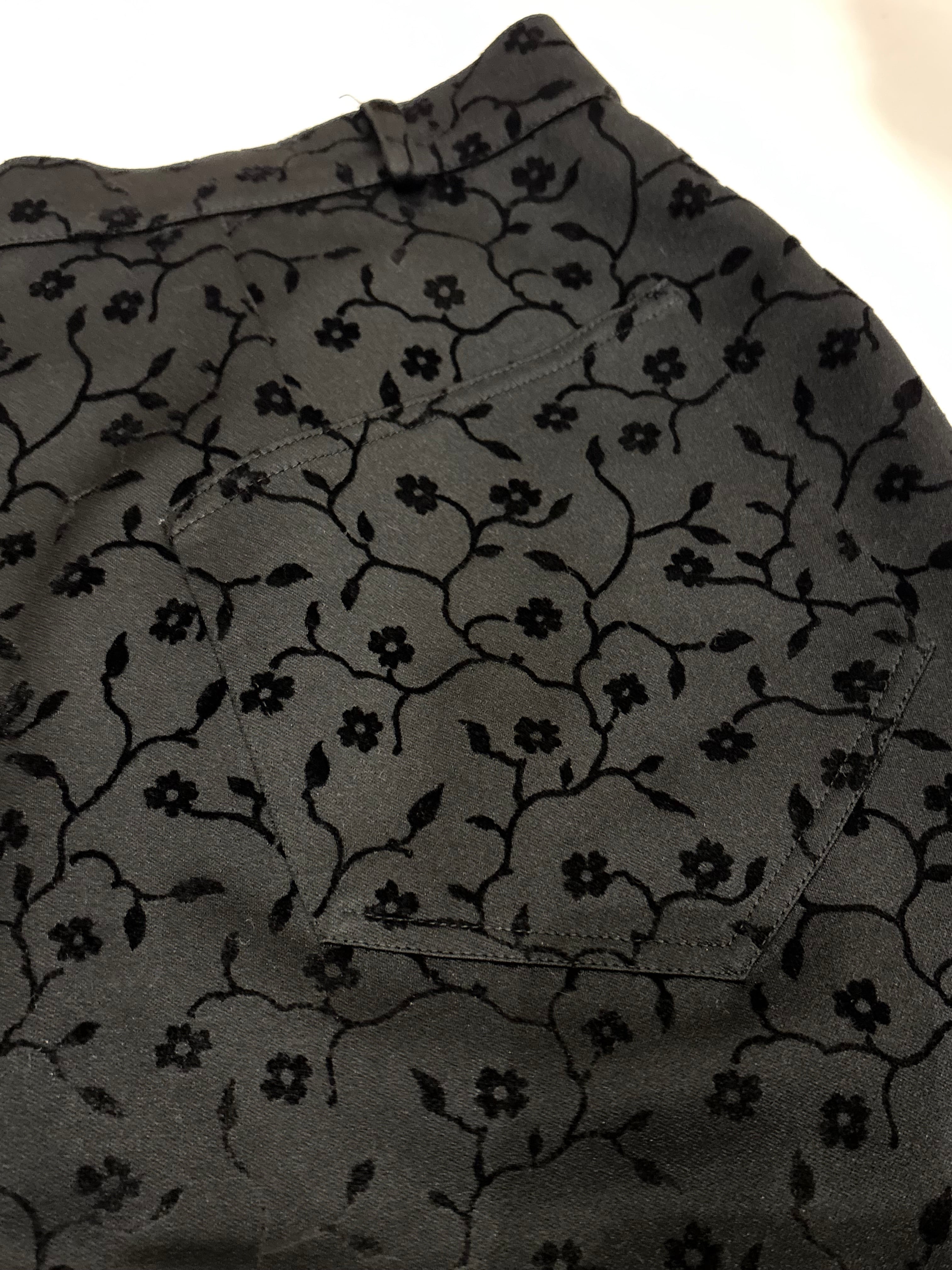 ブラックのフロッキープリントで高級感があります。総柄で、枝から花が咲いているような柄です。少しゆとりのある身幅で柔らかめの生地感なので着用しやすいです。普段柄物を着用しない方にもオススメのアイテムです。