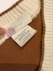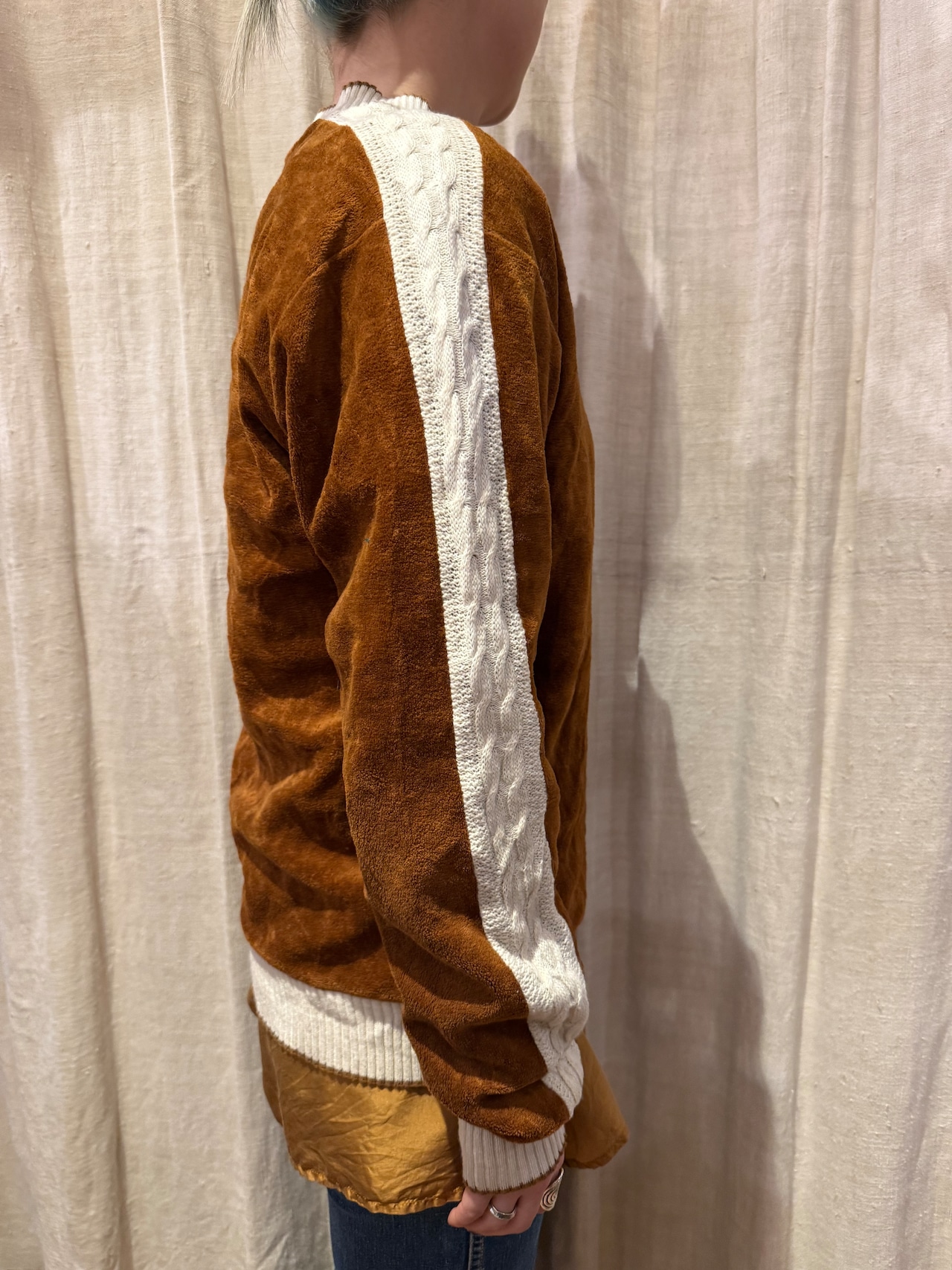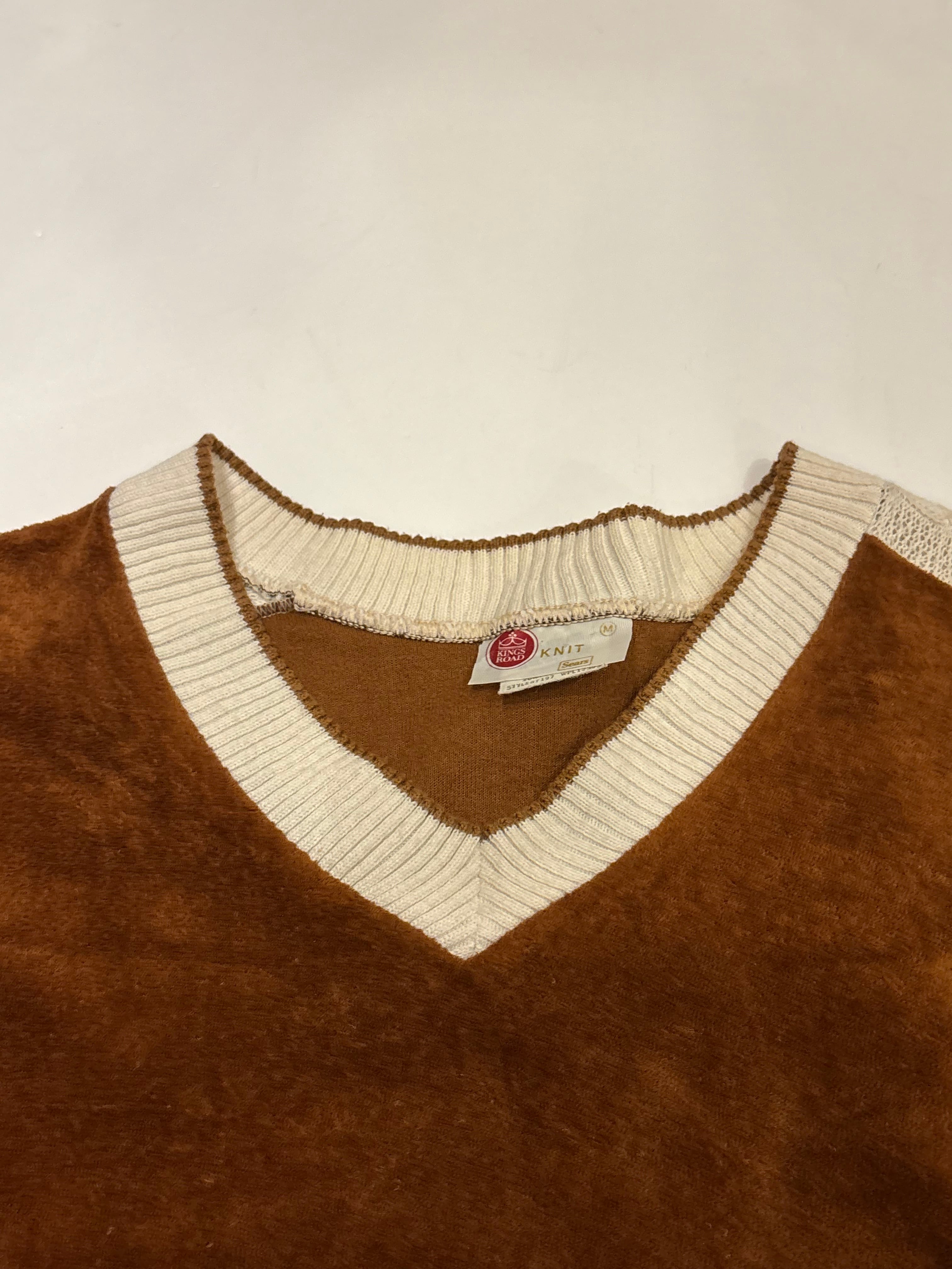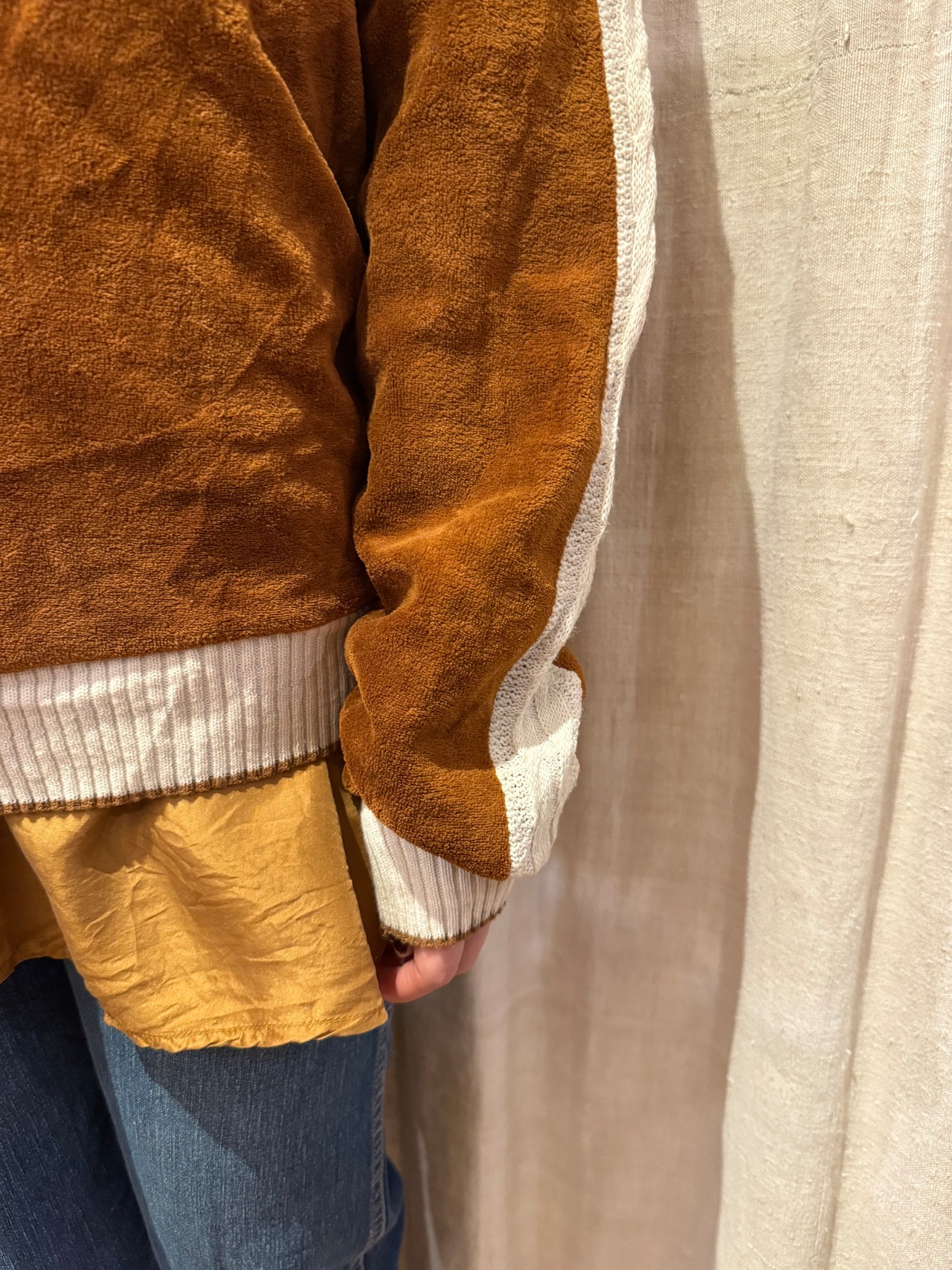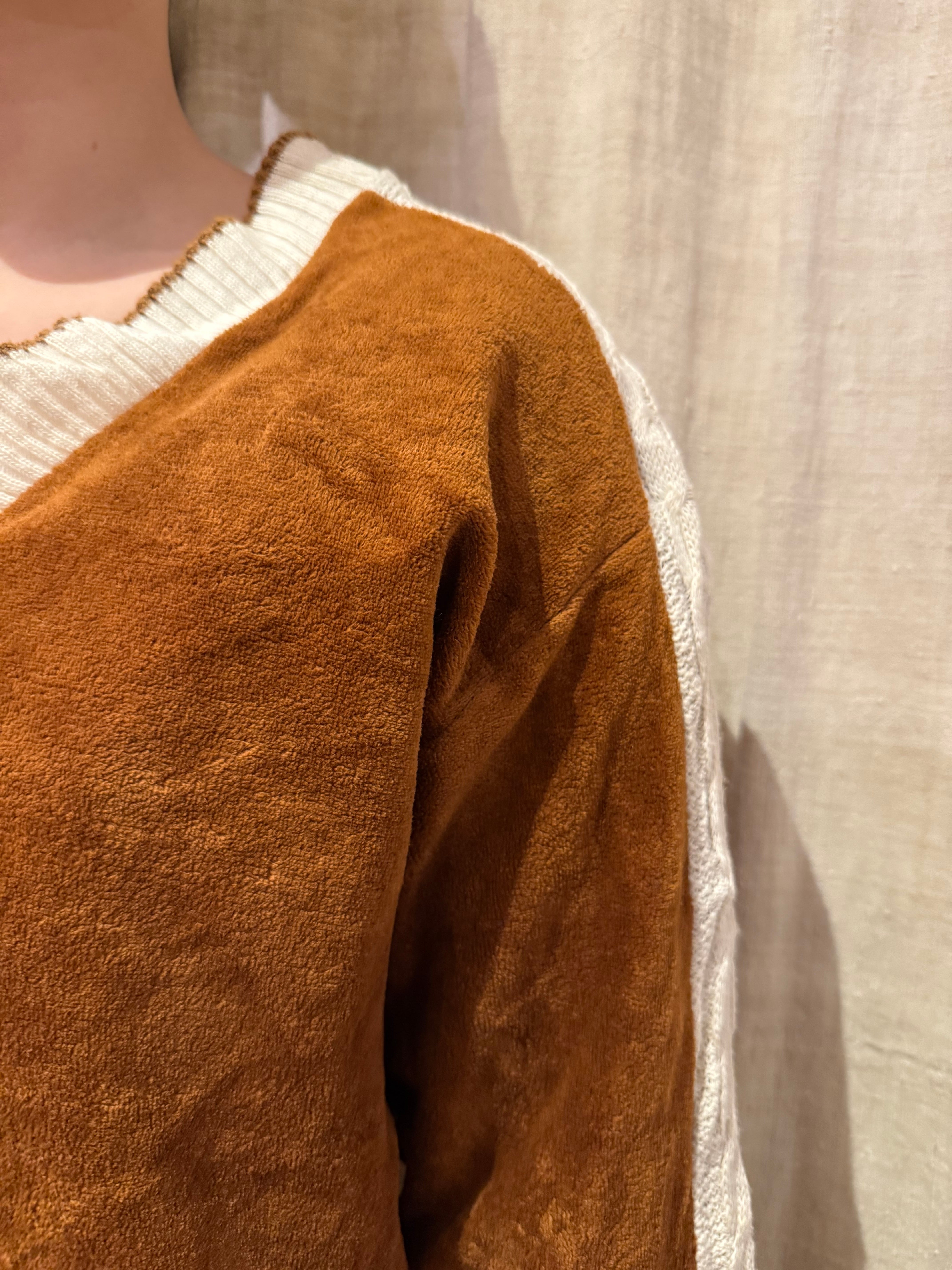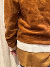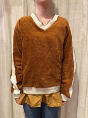ベロア素材のトップスです。Vネック仕様ですので、ネックレスと合わせても素敵です。Vネックや裾のリブは少し大きめで、袖にはニット編みのラインが施されており、メンズライクになり過ぎない点もポイントです。