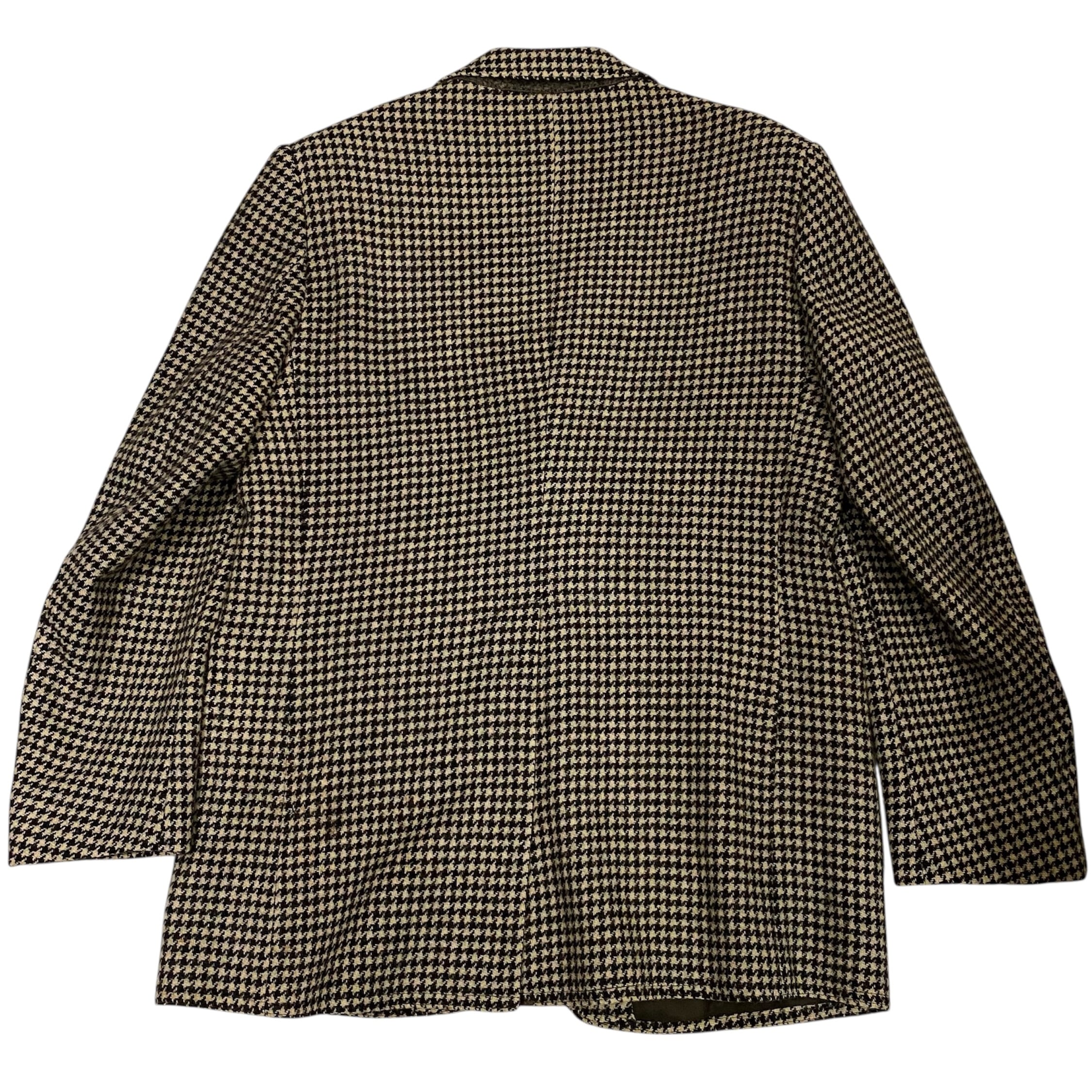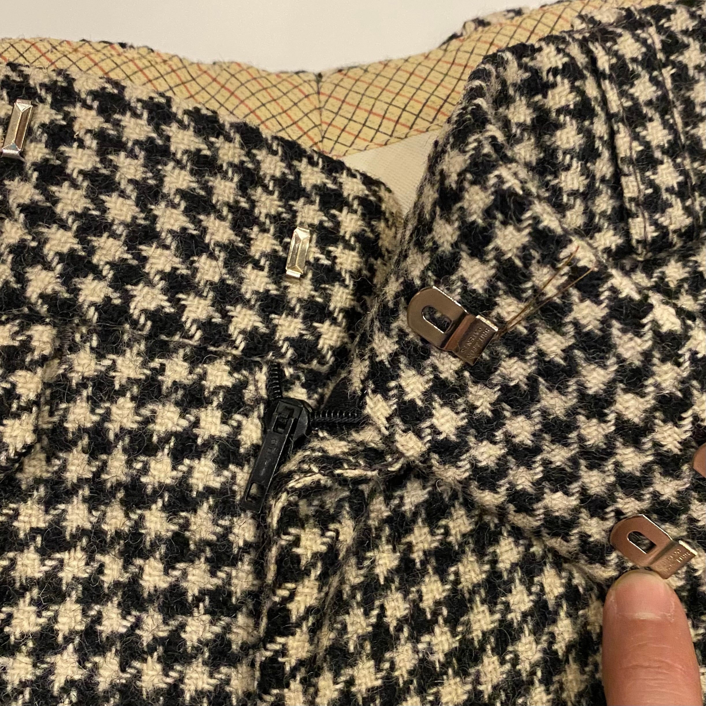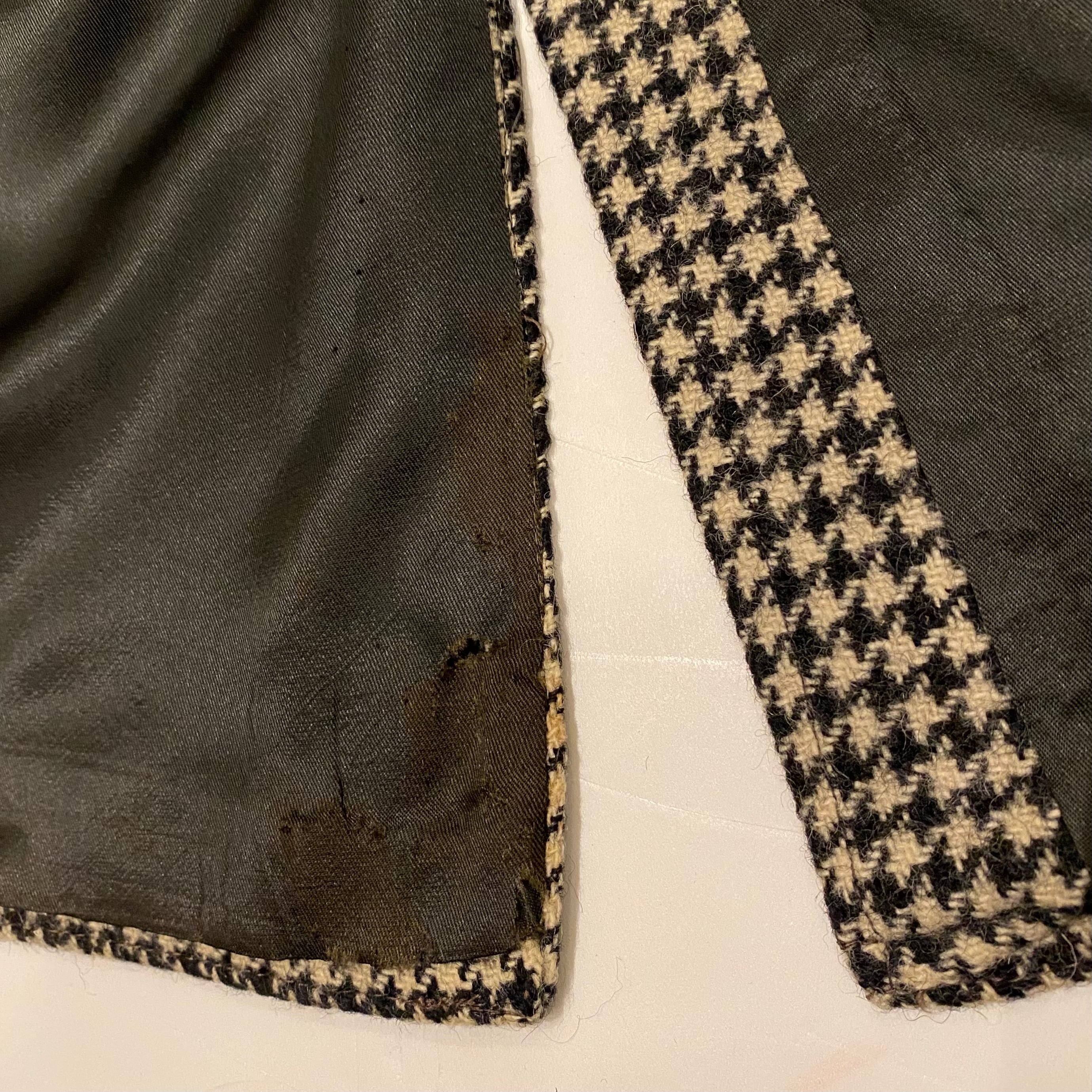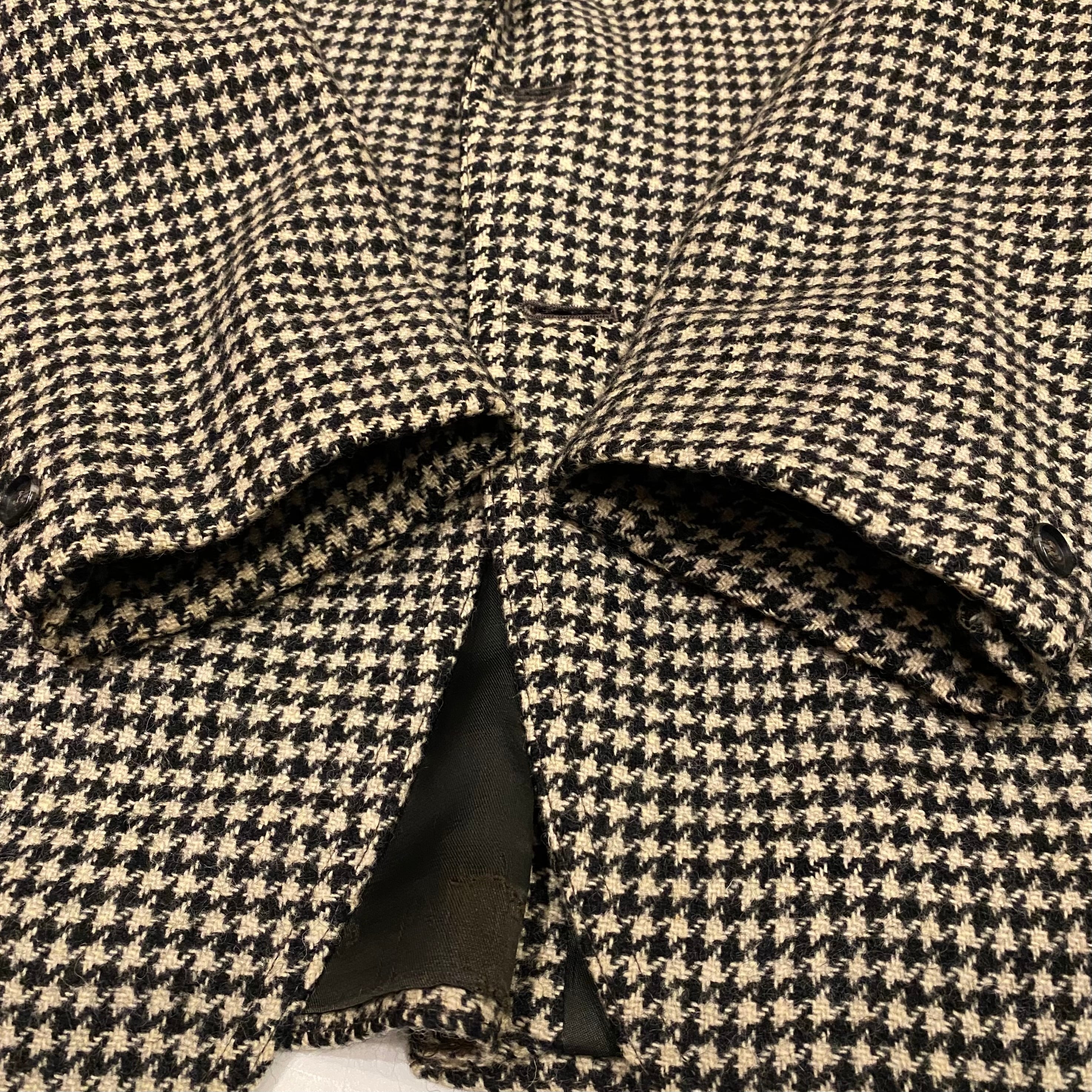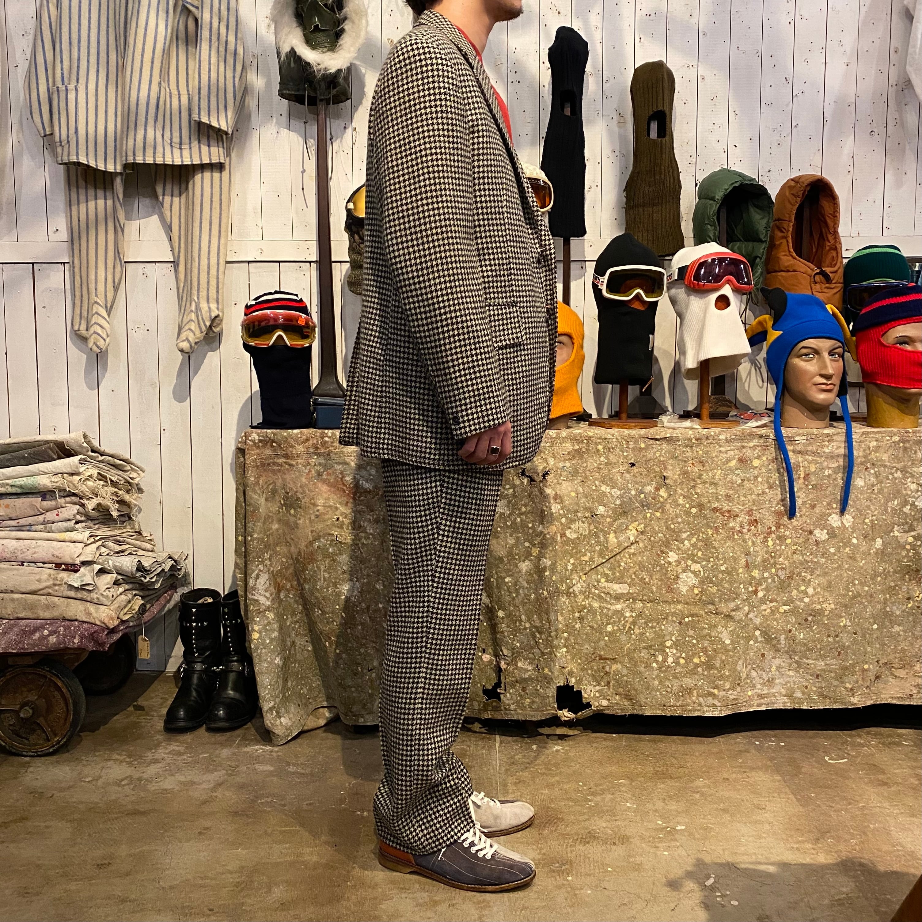 1970年代のビンテージの千鳥格子柄のウールスーツになります。ごわごわとしたツィード生地で厚みのあるしっかりとした生地感のセットアップです。ビジネスっぽくならない洒落たセットアップだと思いますので少しカジュアルなニットや紐なしのスリッポンシューズなどと合わせてタウンユースに。またドレスシャツやネクタイ、スカーフなどと合わせてちょっとしたパーティーシーンにも良さそうです。※ラペルの下の方の生地にダメージあり。裏地の裾付近に少しダメージあり。
