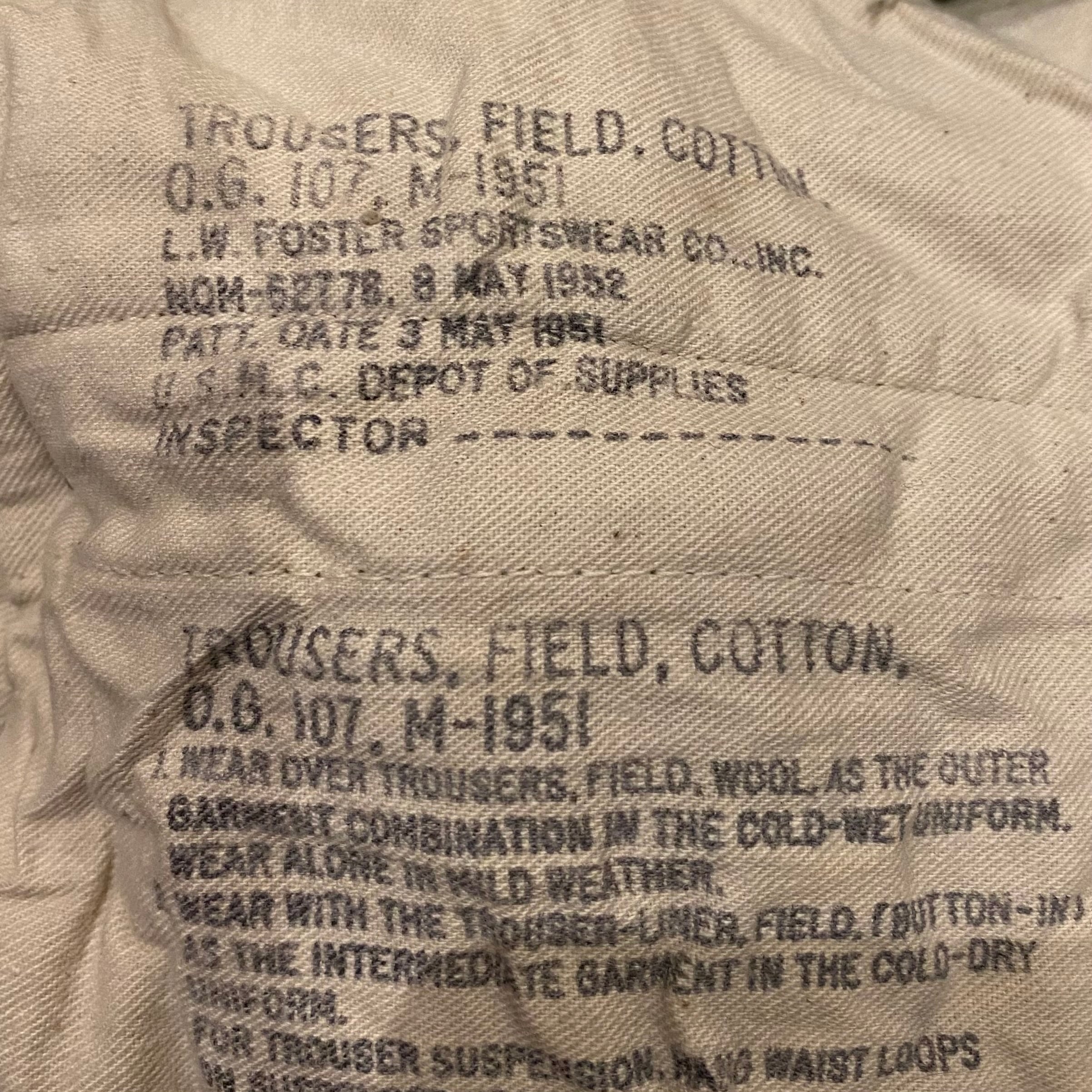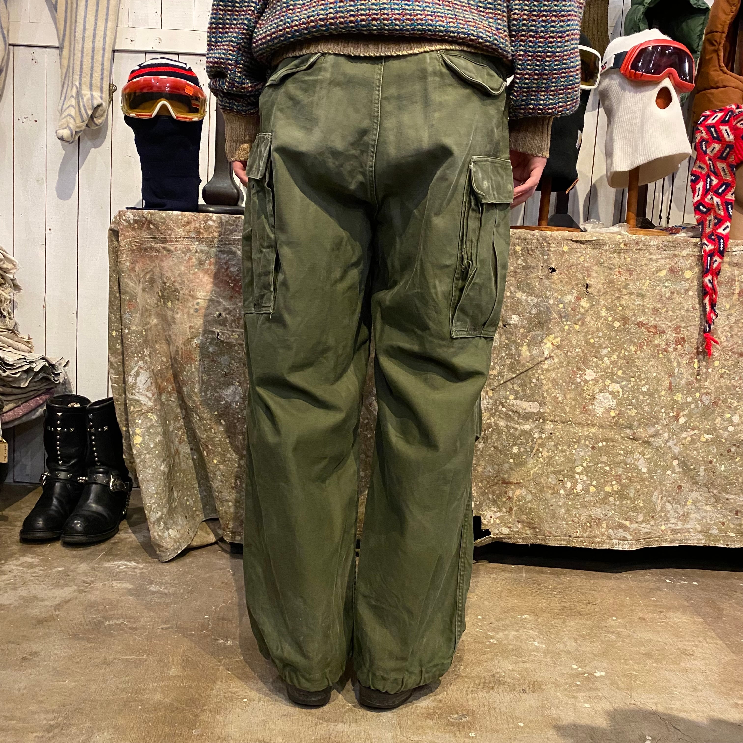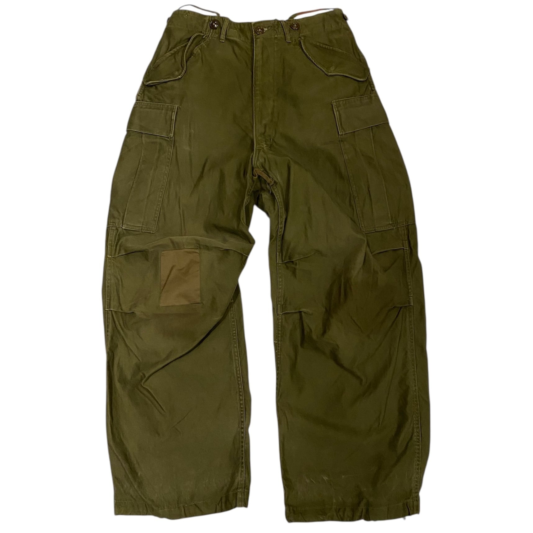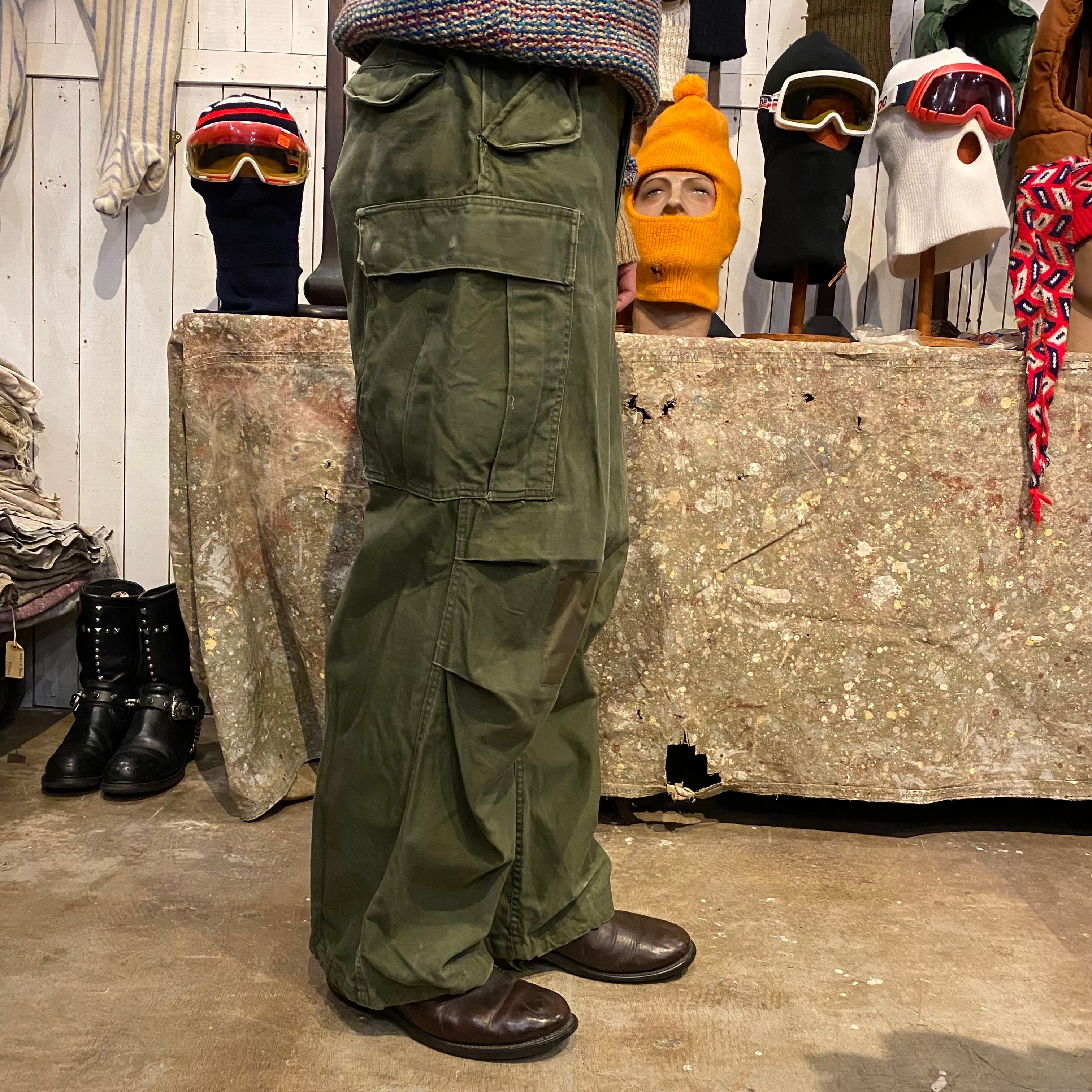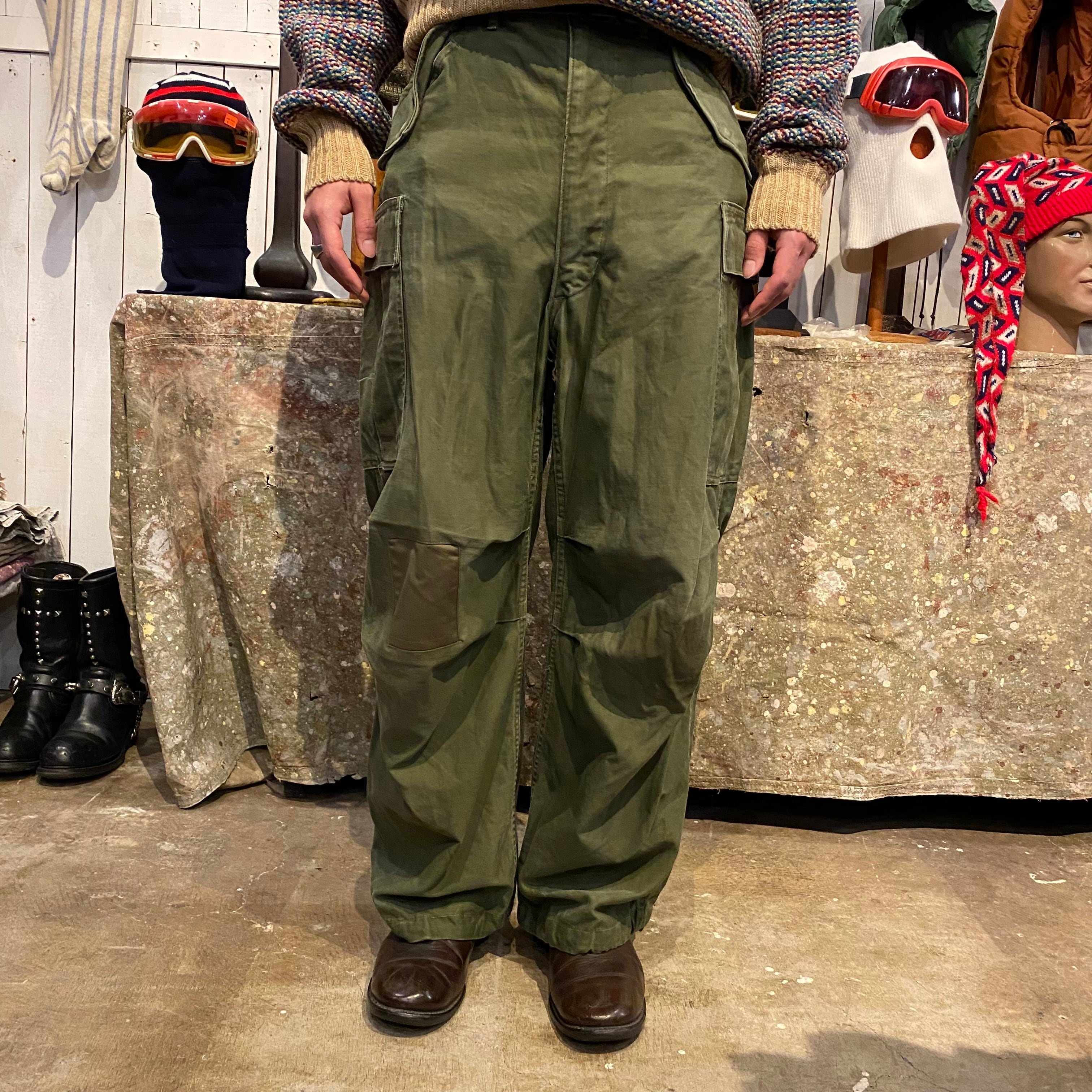 1950年代のアメリカ軍M-1951、6PK軍パンになります。しっかりとしたコットンの生地感、太いストレートシルエットです。ポケットのミルスペックの印字もまだ読みとれます。所々白っぽくあたりがでていて格好良いですし生地のコンディションはとても良いと思います。良いビンテージの6PK軍パンをお探しの方におすすめです。※右ひざあたり大きく後ろから生地をあててパッチワーク修理しています。