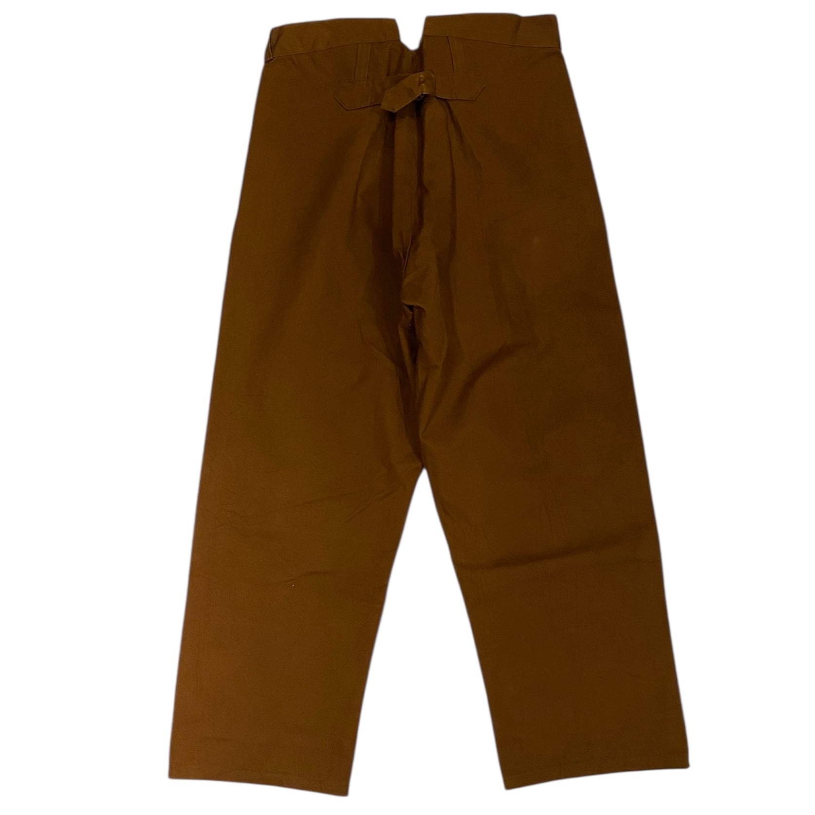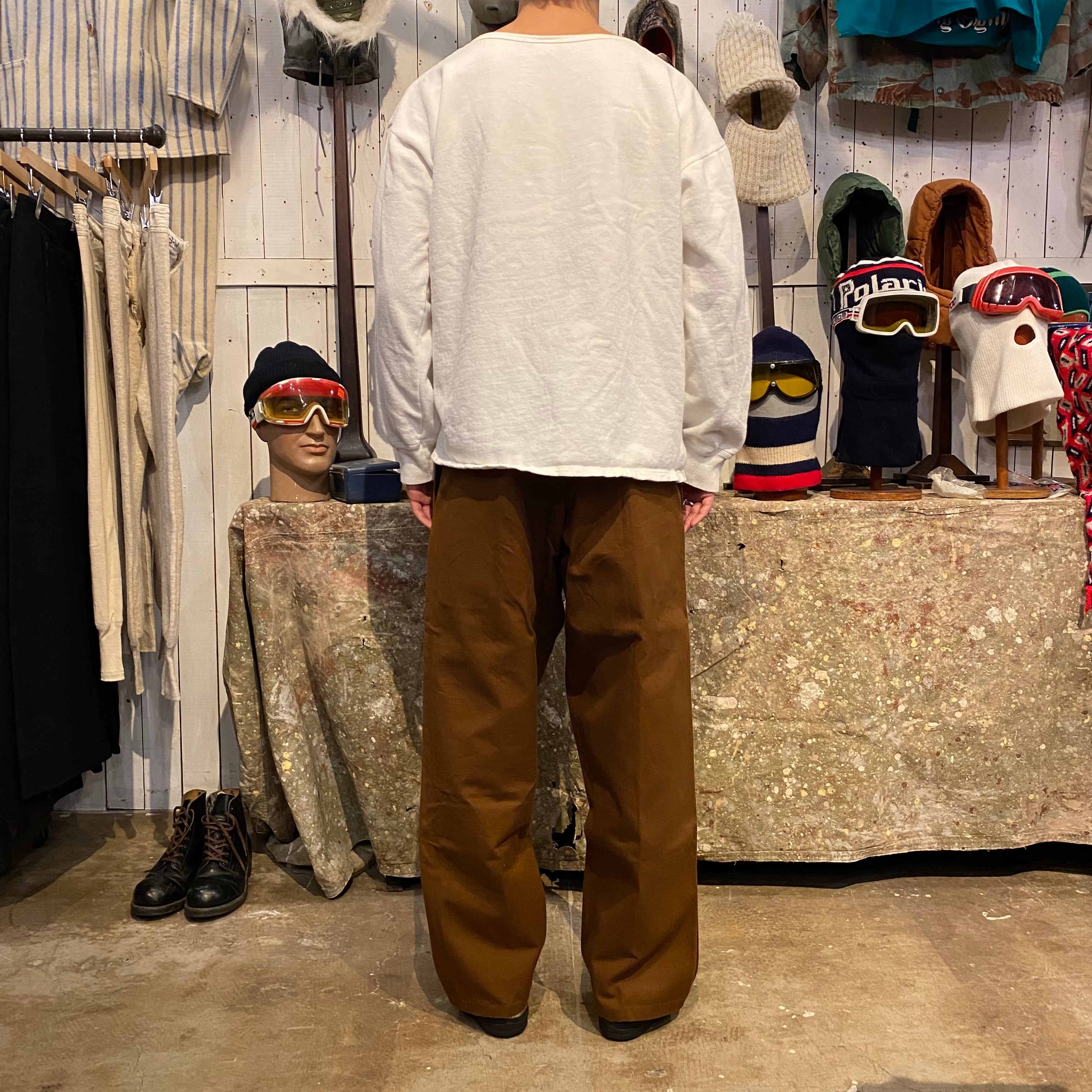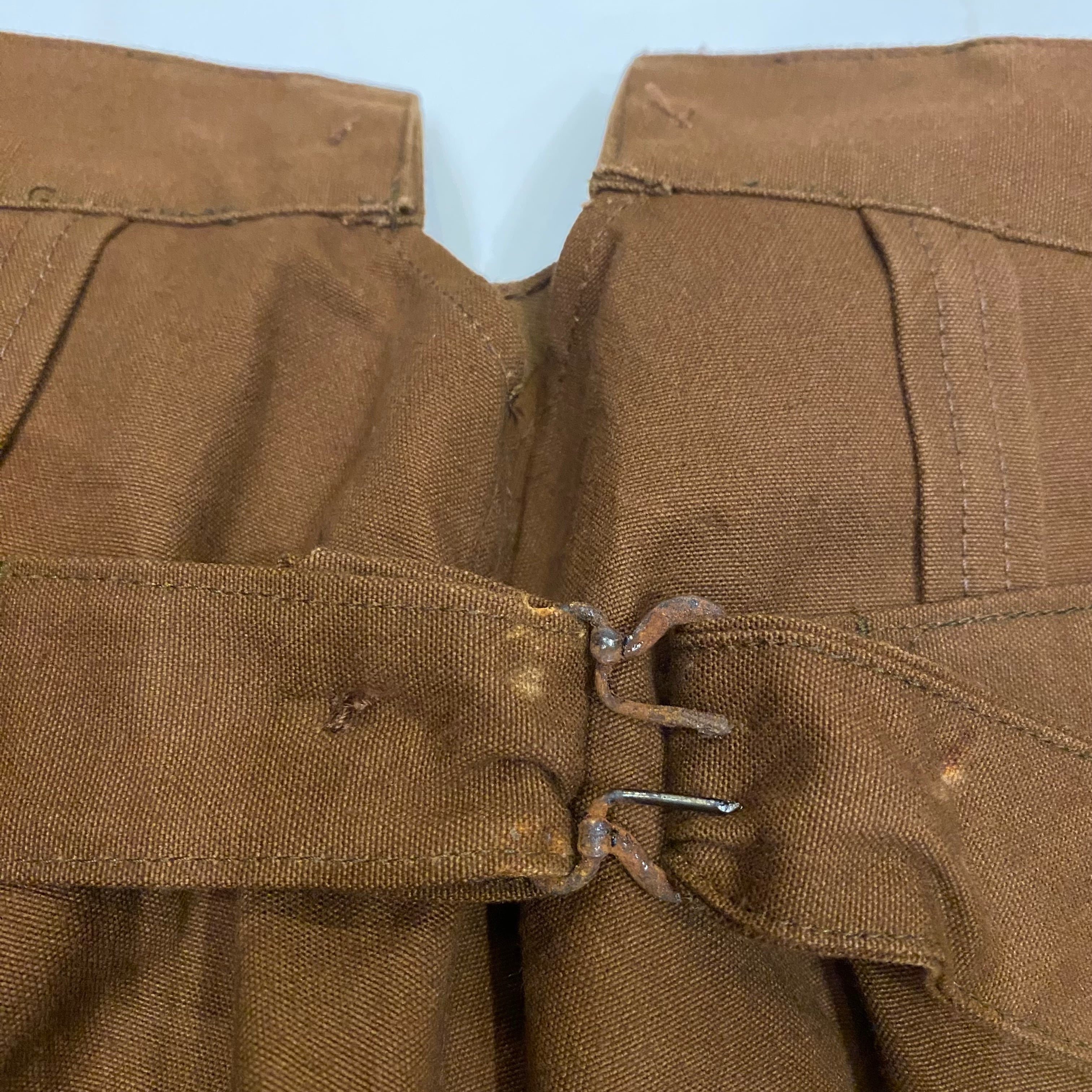 1940〜50年代頃のフレンチワークパンツになります。ブラウンダックのコットンキャンバス生地でしっかりとした硬い生地感です。ストレート〜若干テーパードした太いシルエットです。内側に生地がつくダブルニー仕様。ウエスト内側にサスペンダーボタンが付きますが、ベルトループも付いているので、どちらでも穿いていただけます。とても良いカラーですし、ワンウォッシュくらいの使用感のないグッドコンディションです。※針刺しのバックストラップ部分に錆が見られます。