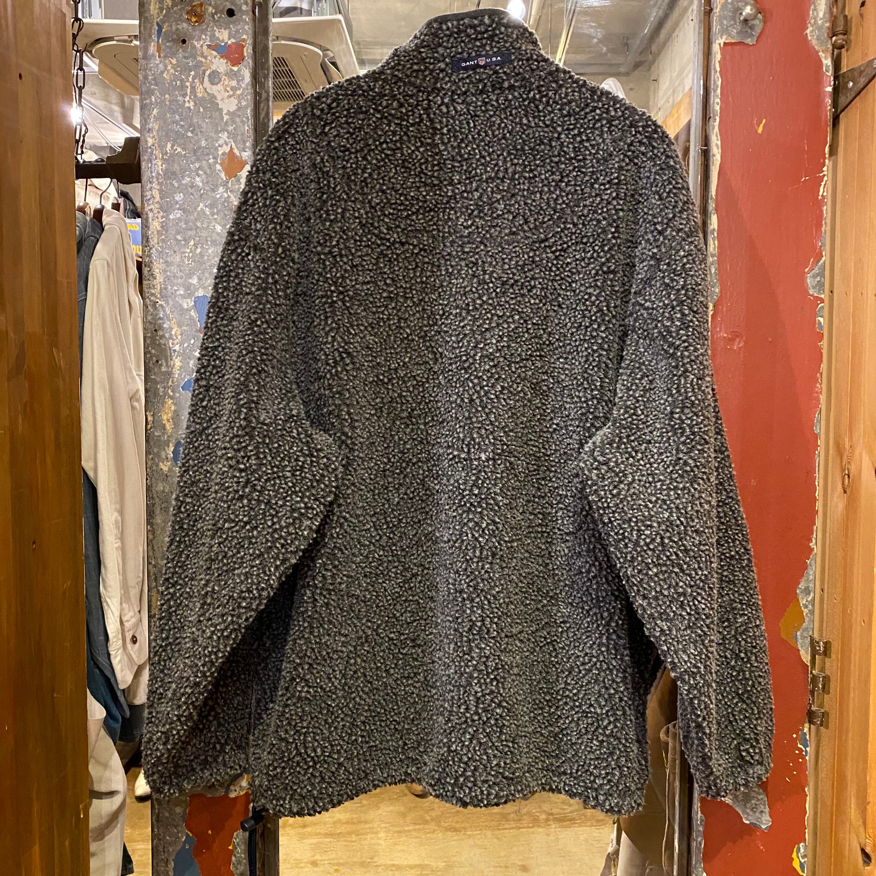 1990年代くらいのパイルフリースジャケットになります。両サイドポケットから真ん中がつながっているポケットが付きます。もこもことしたパイルの質感、グレーのカラーリングがとてもかわいいです。大きいサイズのハーフジップタイプのプルオーバースタイル、裾にはドローコードが付くので、絞って内側に折り返すと着丈も調整できて良い感じです。前身頃の内側にはナイロンの裏地も付くので風も通しにくいつくりになっております。