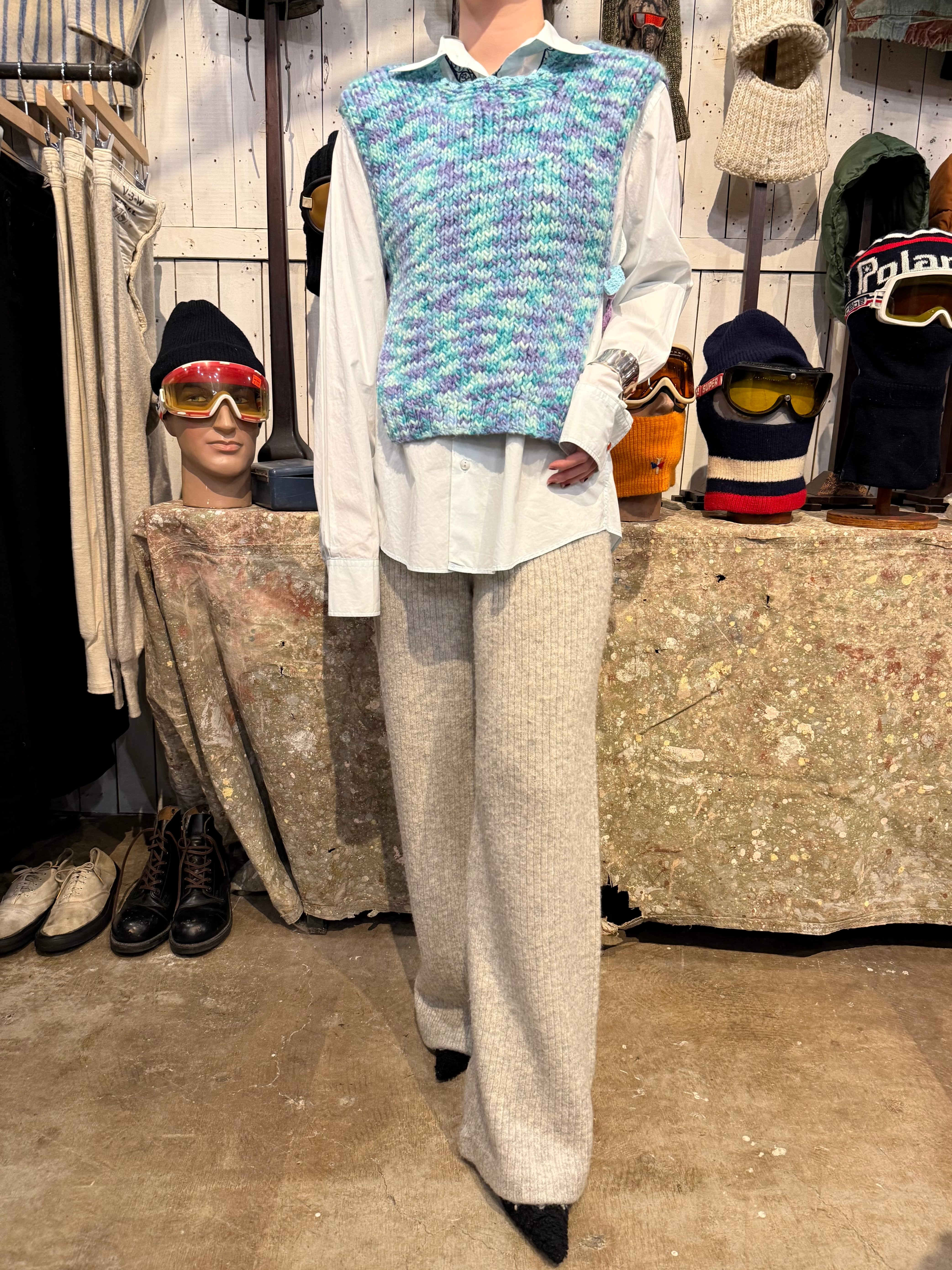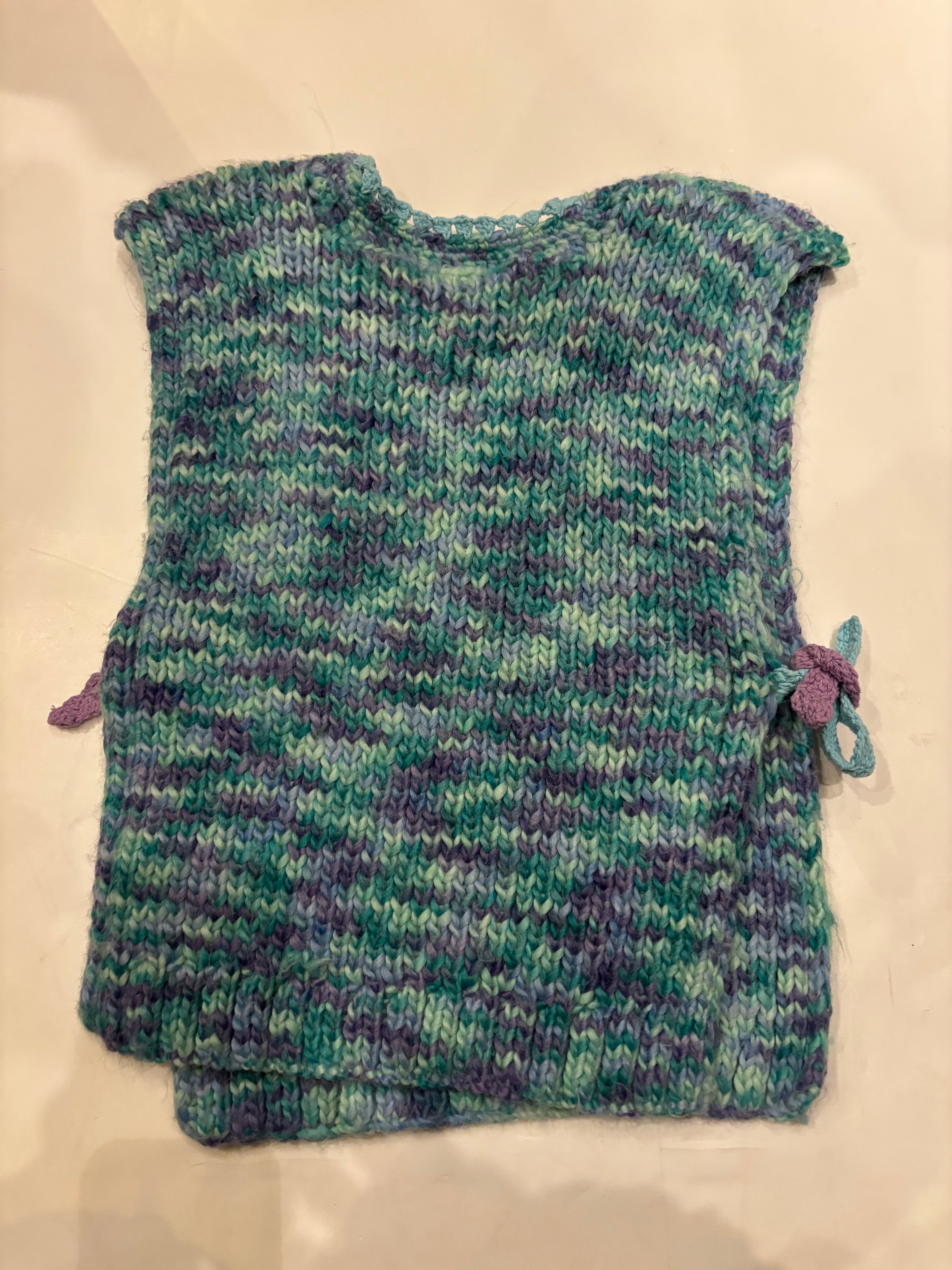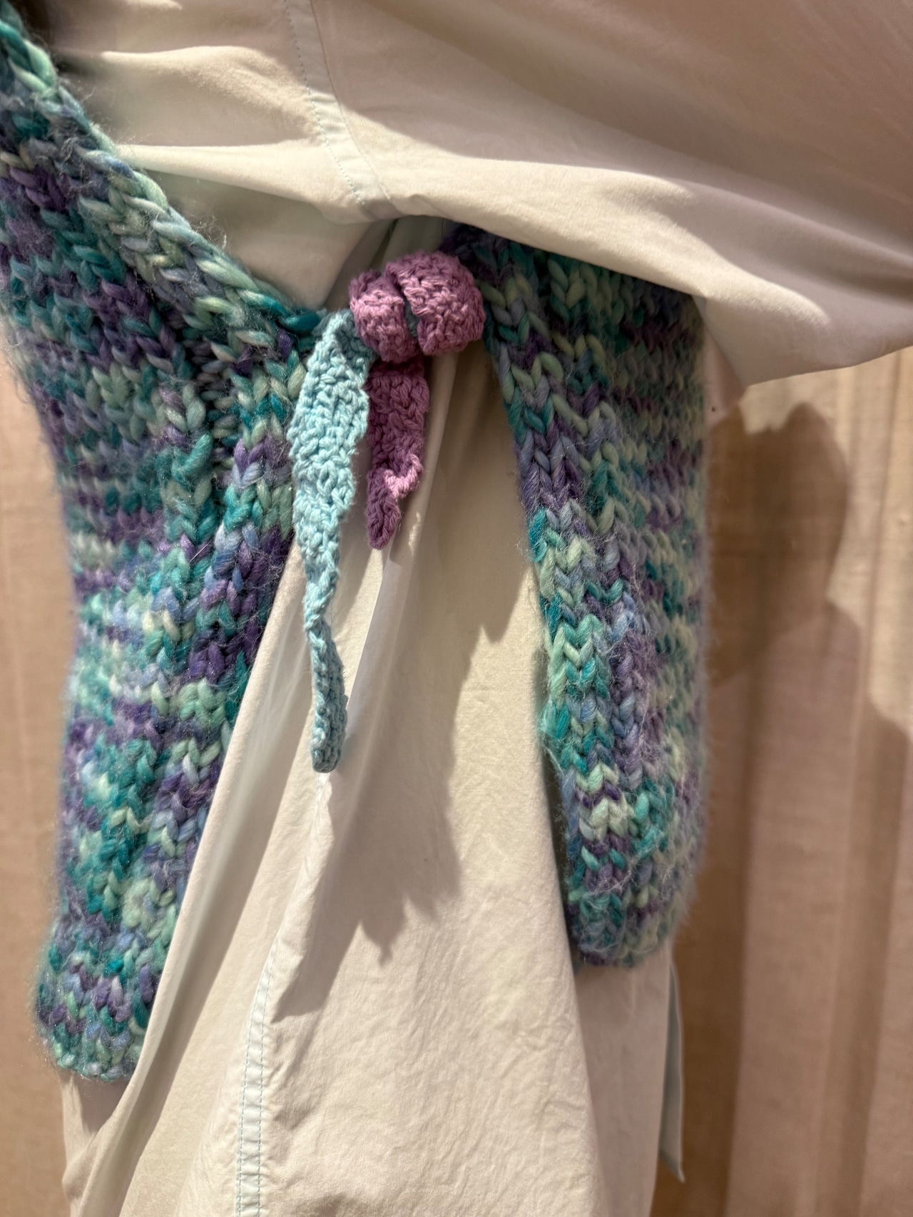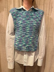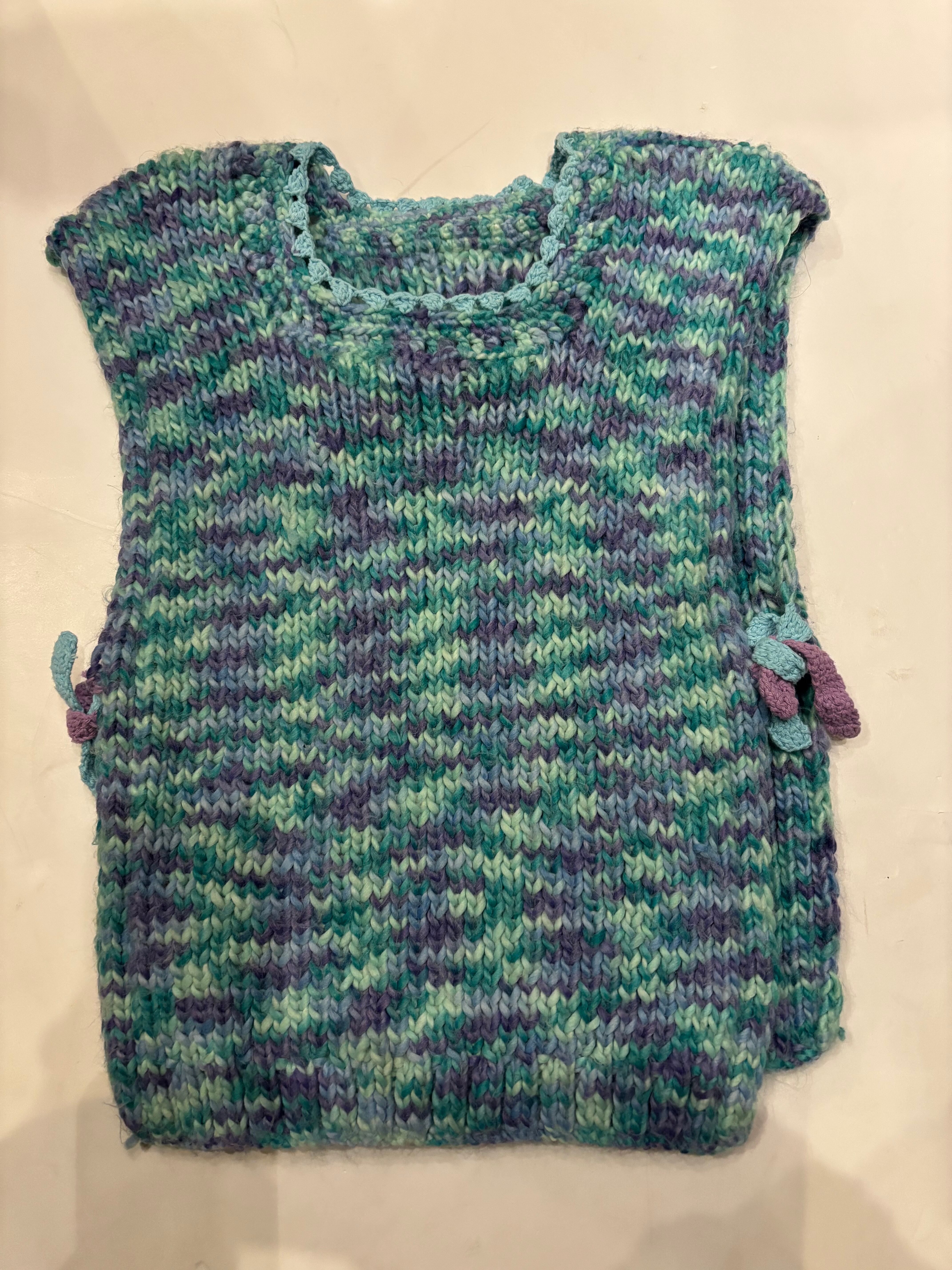 ハンドニット感が可愛らしいベストでございます。ブルーとパープルの寒色のカラーが可愛らしく、サイドは結ぶデザインとなっております。襟はポコポコとした装飾がついていて、ハンドメイドにしては手の込んだデザインです。レイヤードにも使えてオススメです。