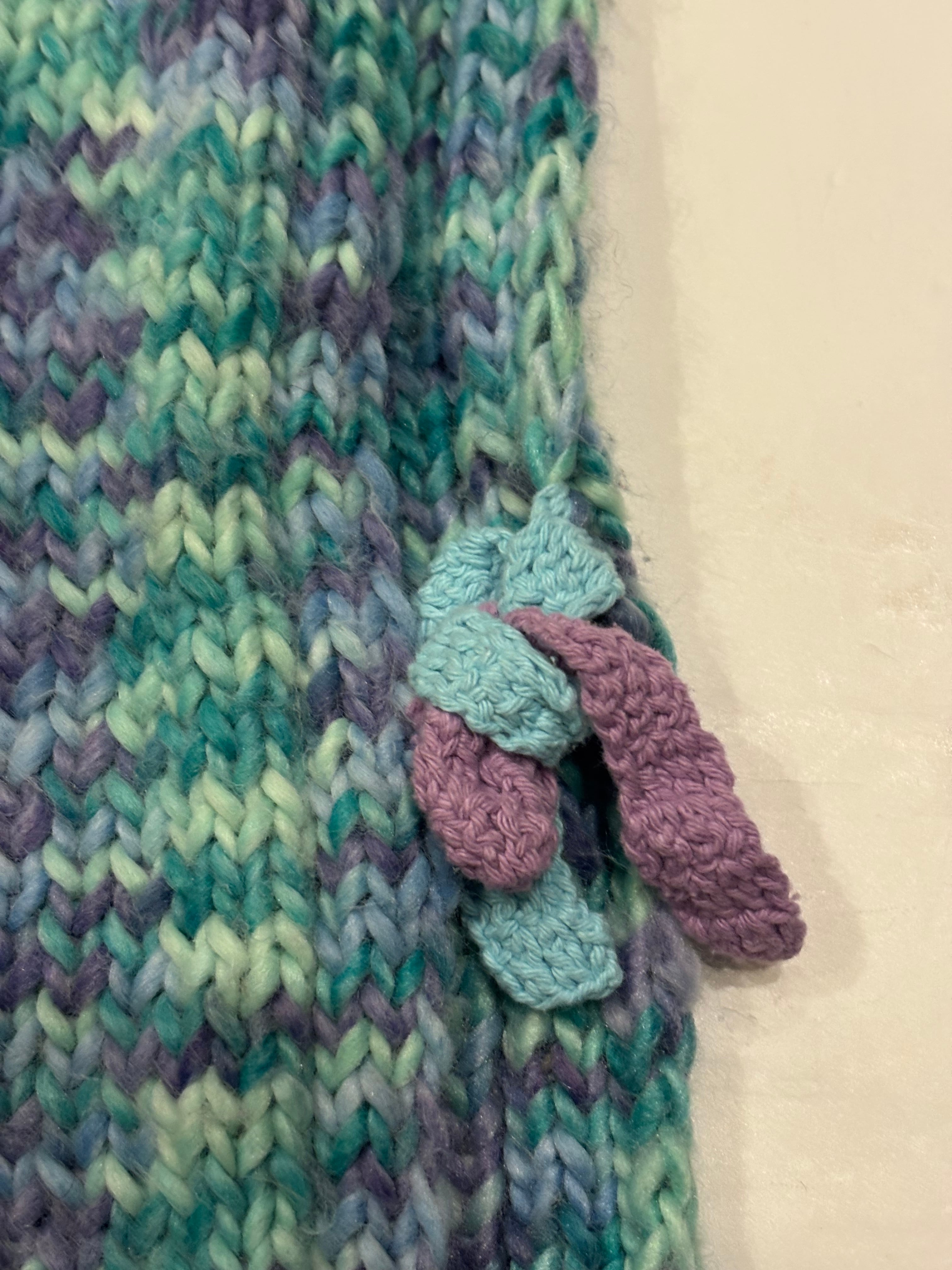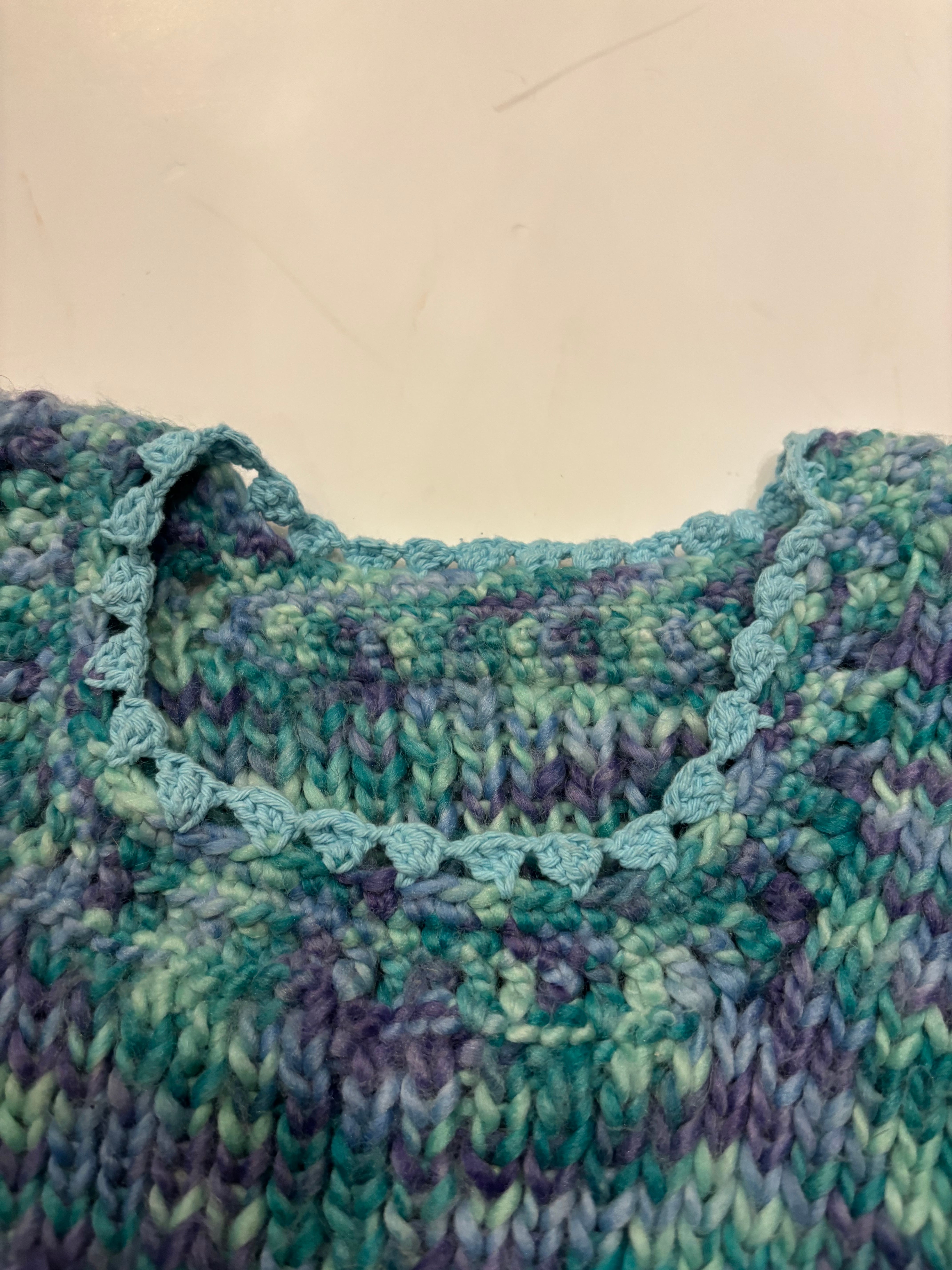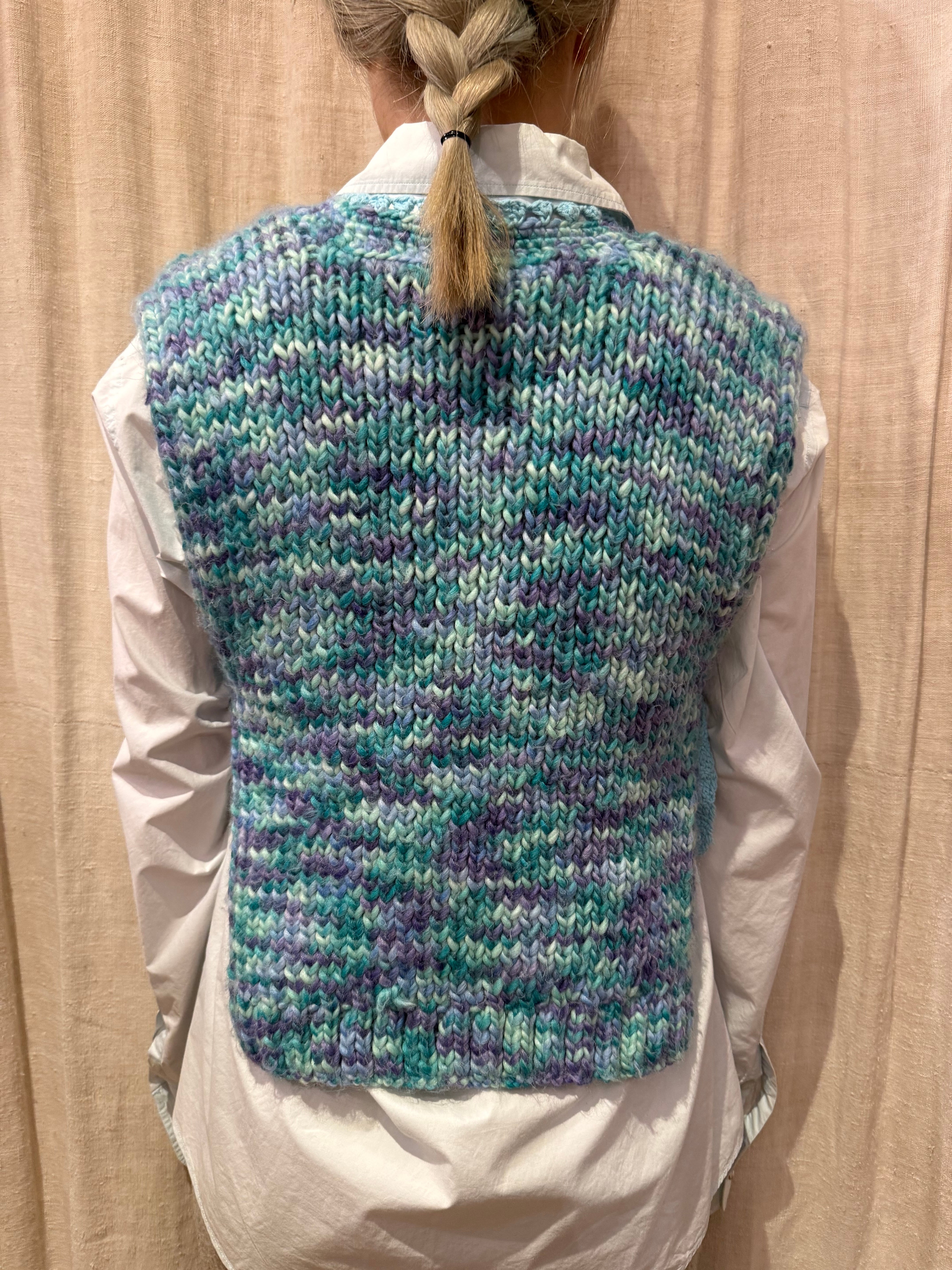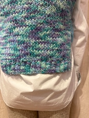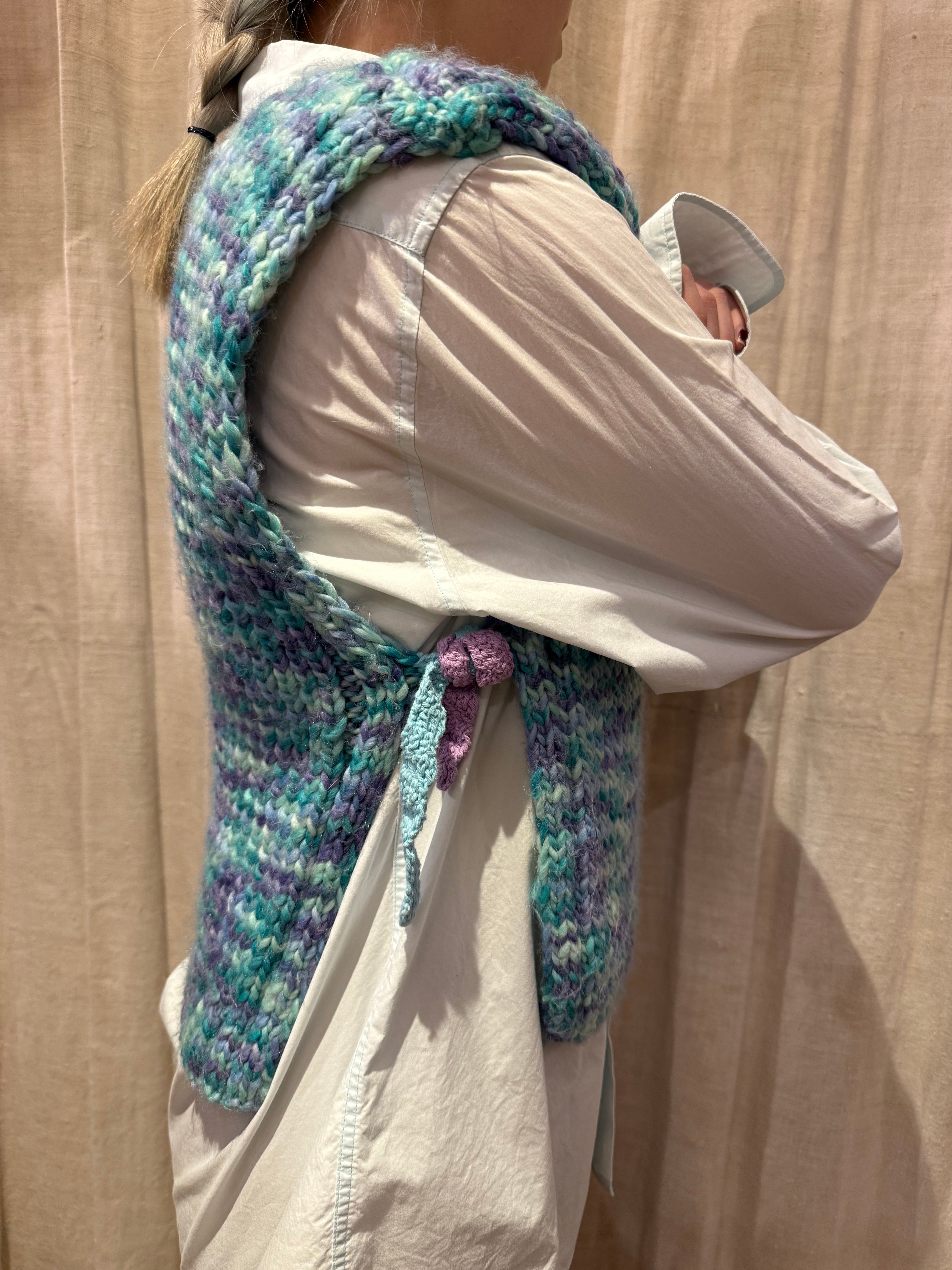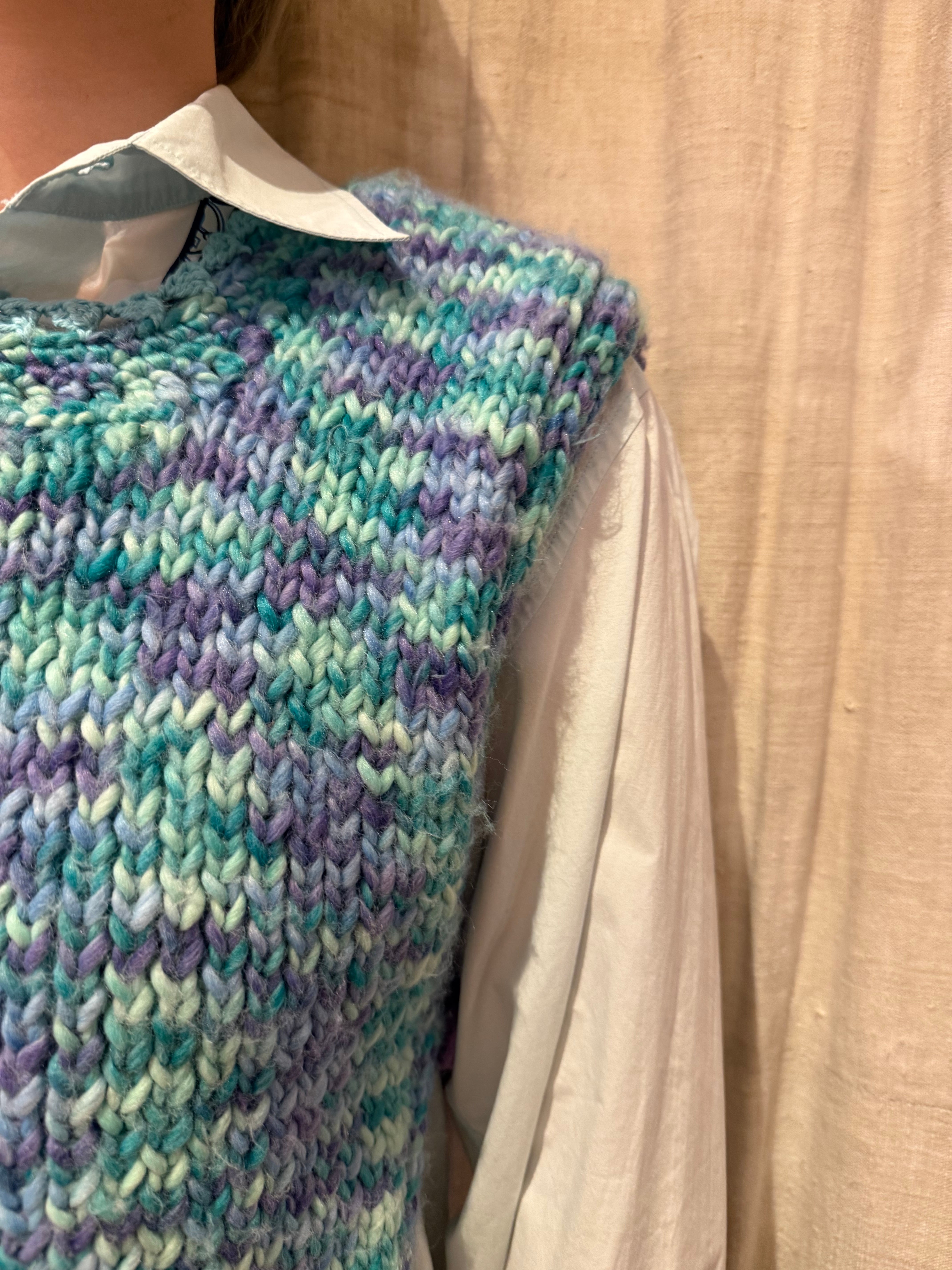ハンドニット感が可愛らしいベストでございます。ブルーとパープルの寒色のカラーが可愛らしく、サイドは結ぶデザインとなっております。襟はポコポコとした装飾がついていて、ハンドメイドにしては手の込んだデザインです。レイヤードにも使えてオススメです。