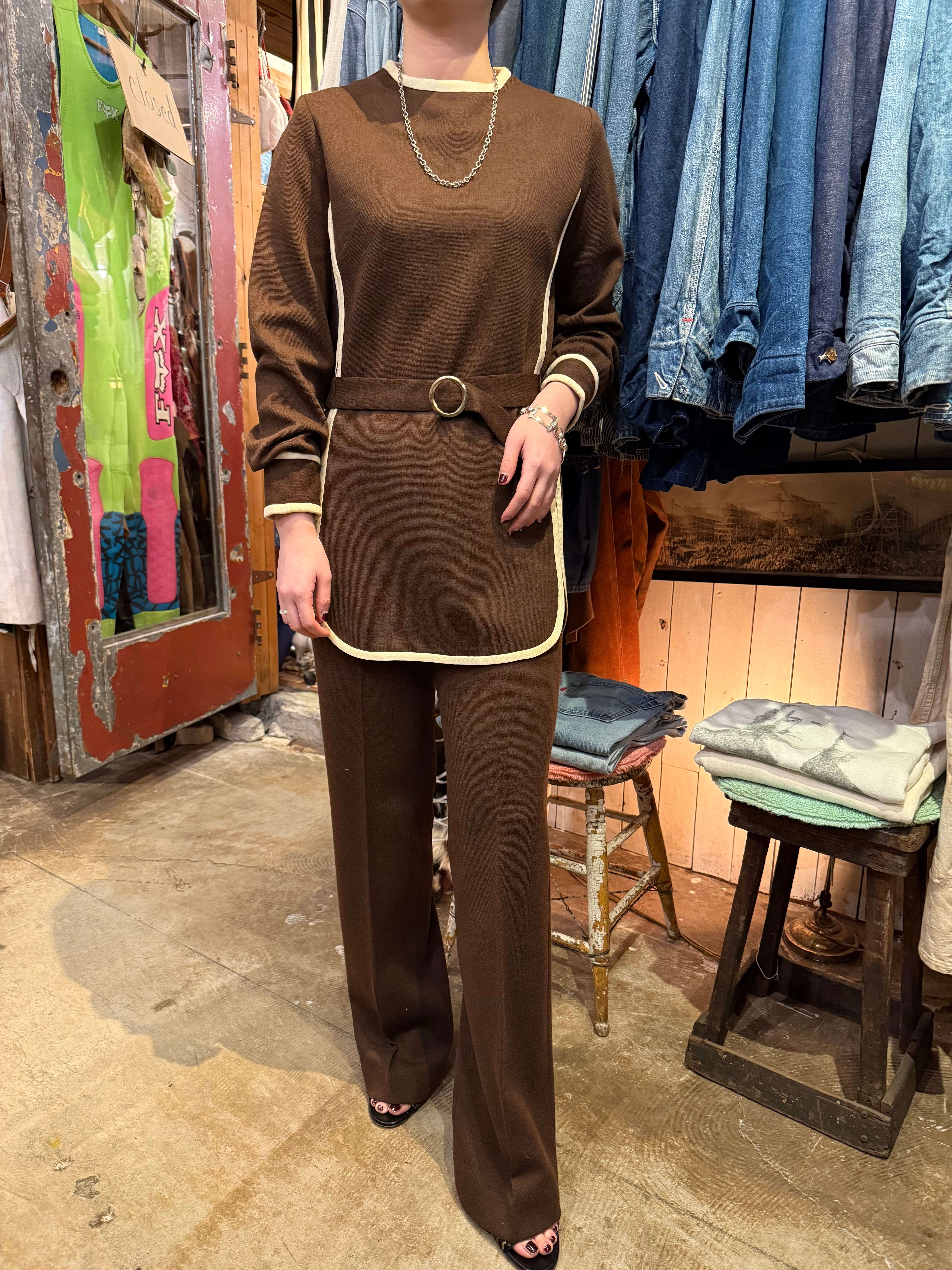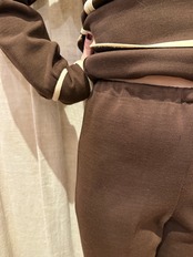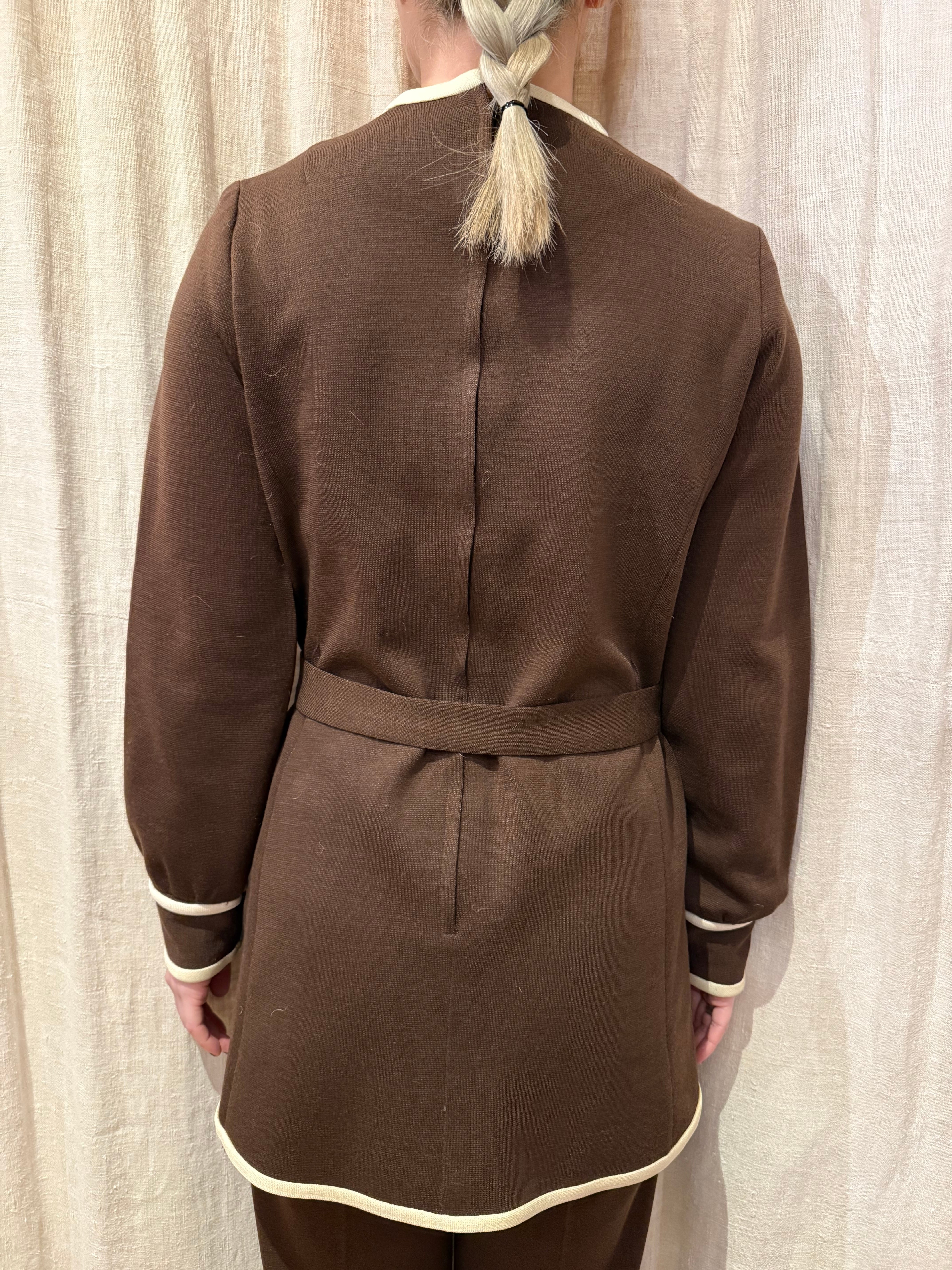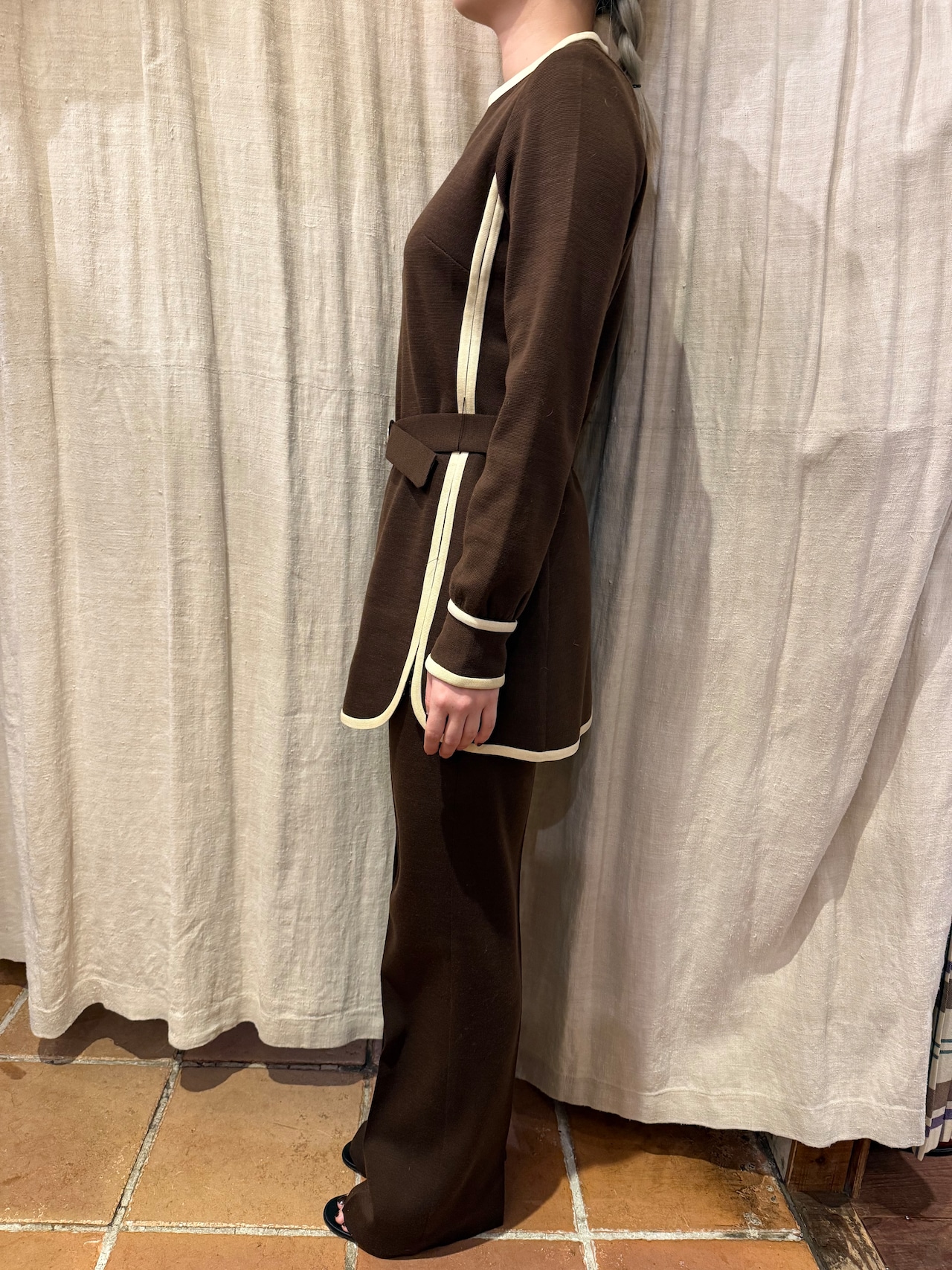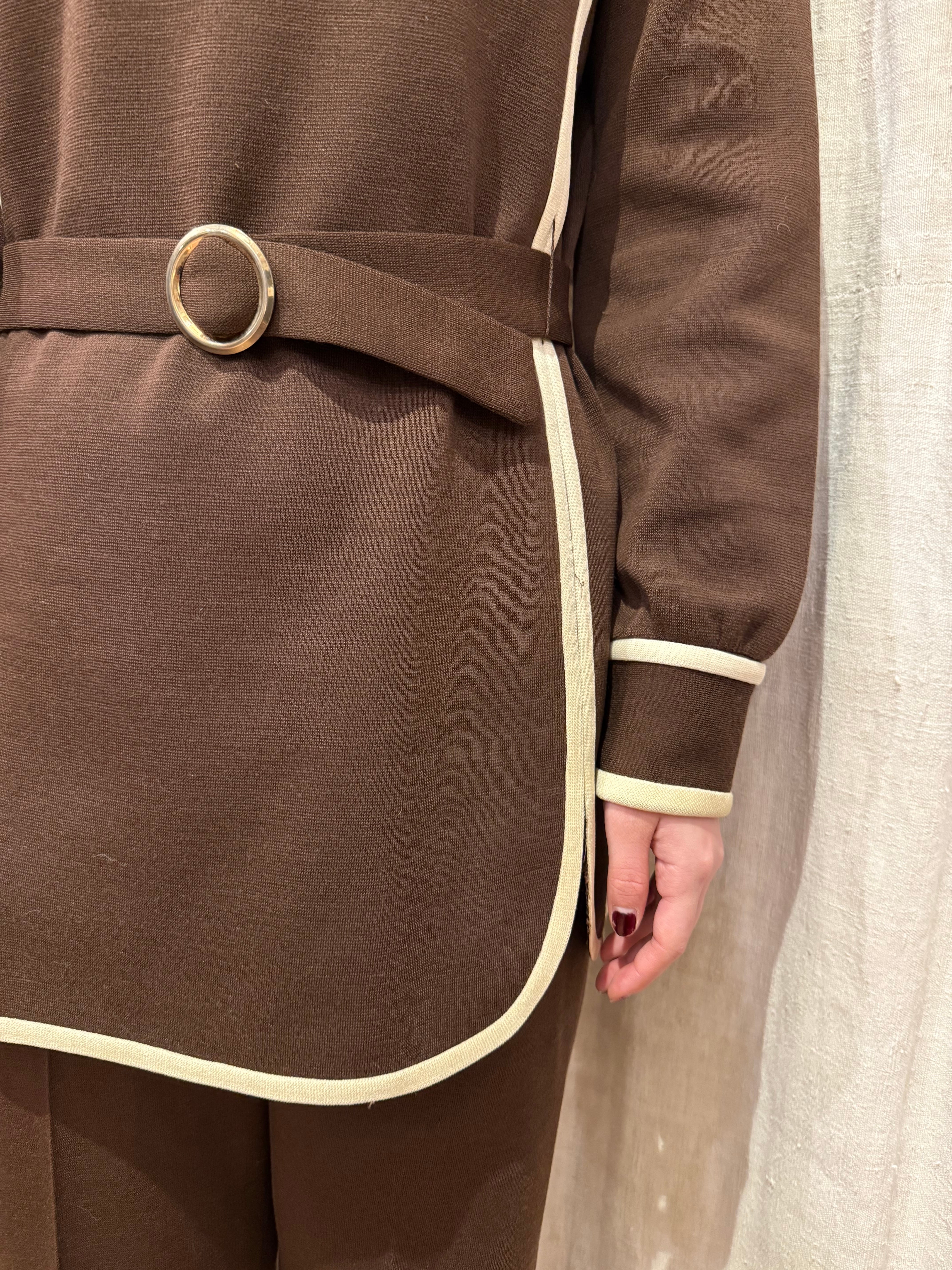スラリとしたストレートなシルエットで、上品なセットアップ。ブラウンボディでホワイトのパイピングが施されているのがとても可愛らしいです。ベルトも付属なので、3ピース別々で使うことも可能です。冬のファーアイテムとも相性が良さそうです◎
