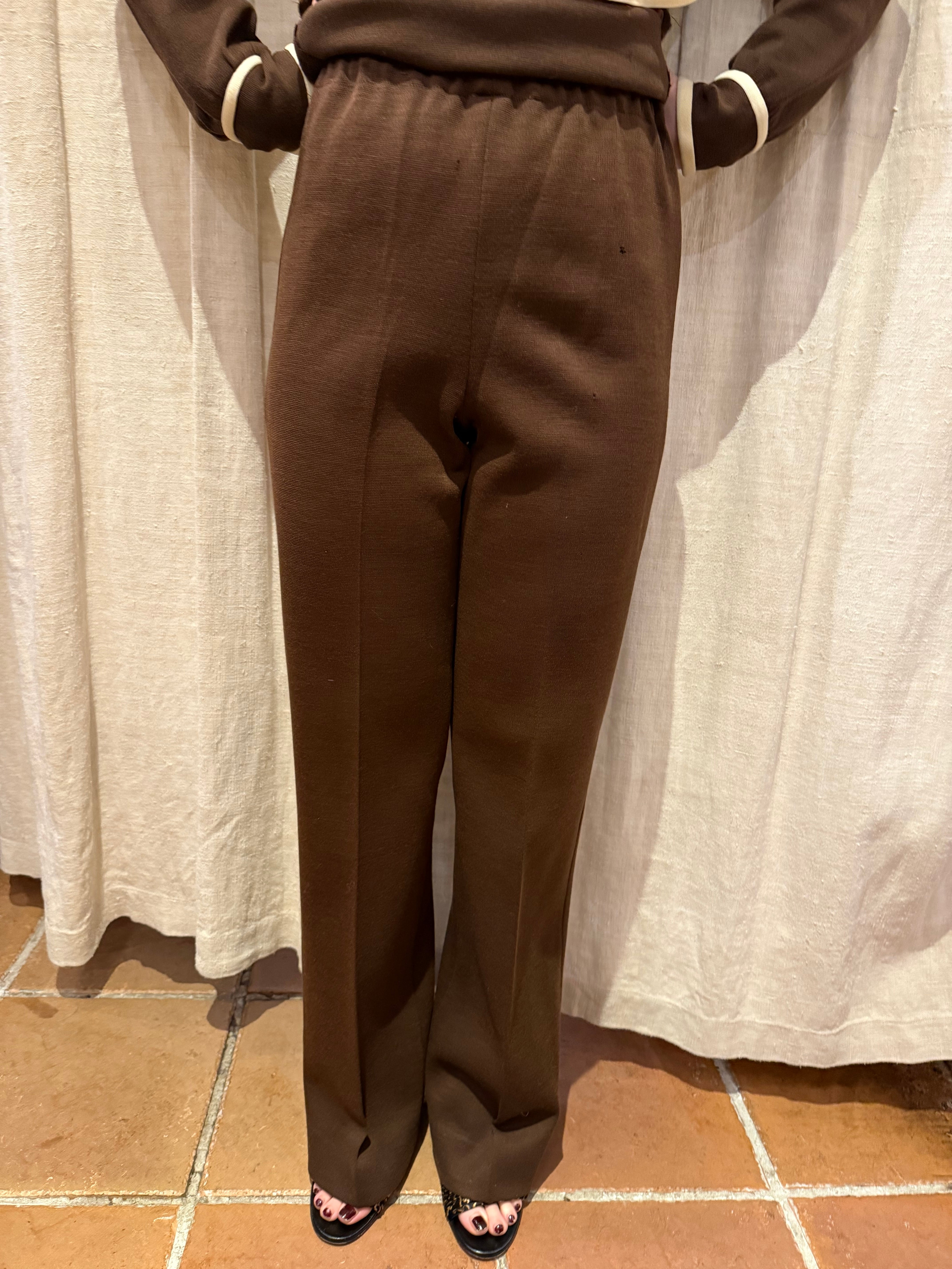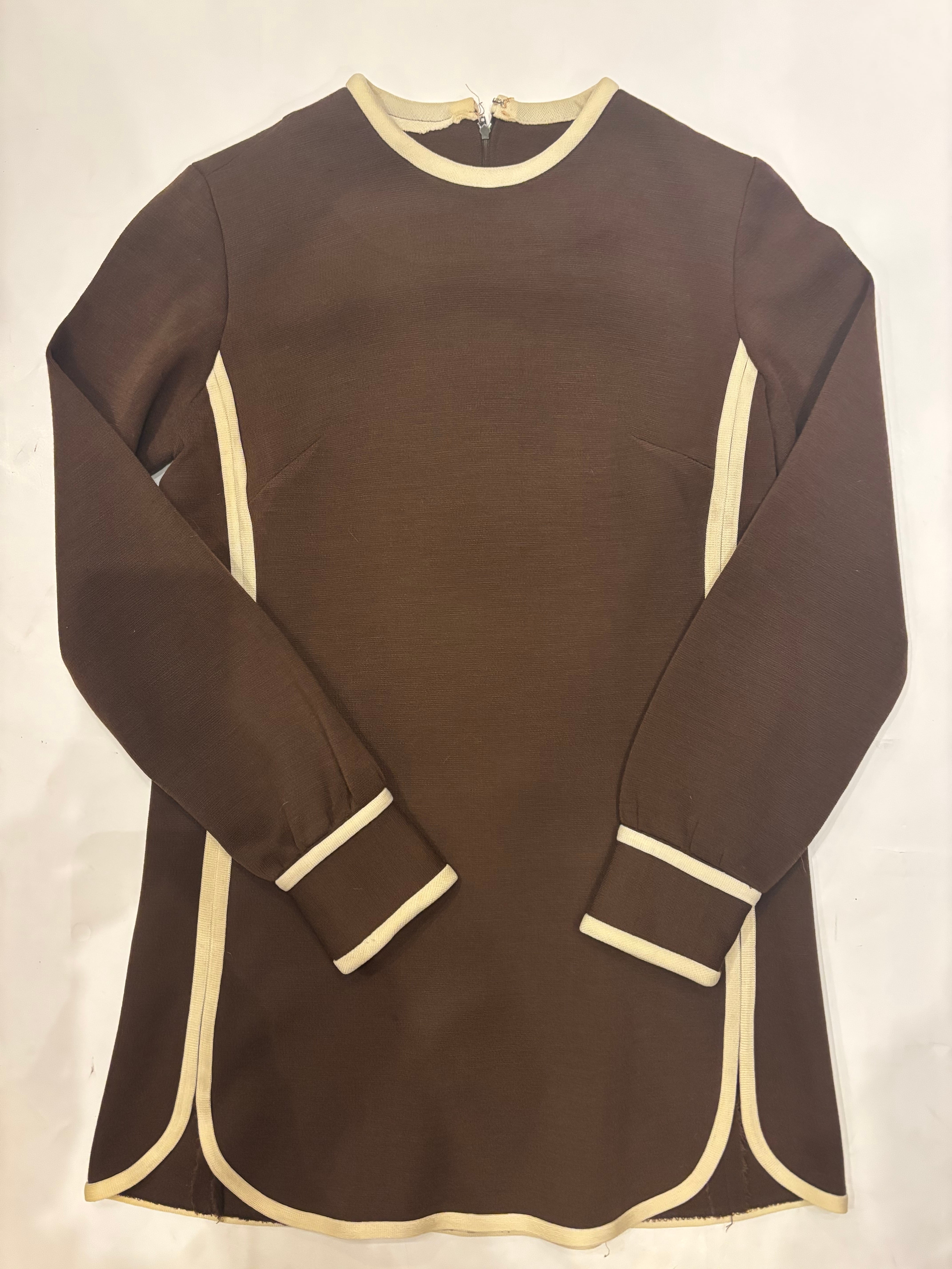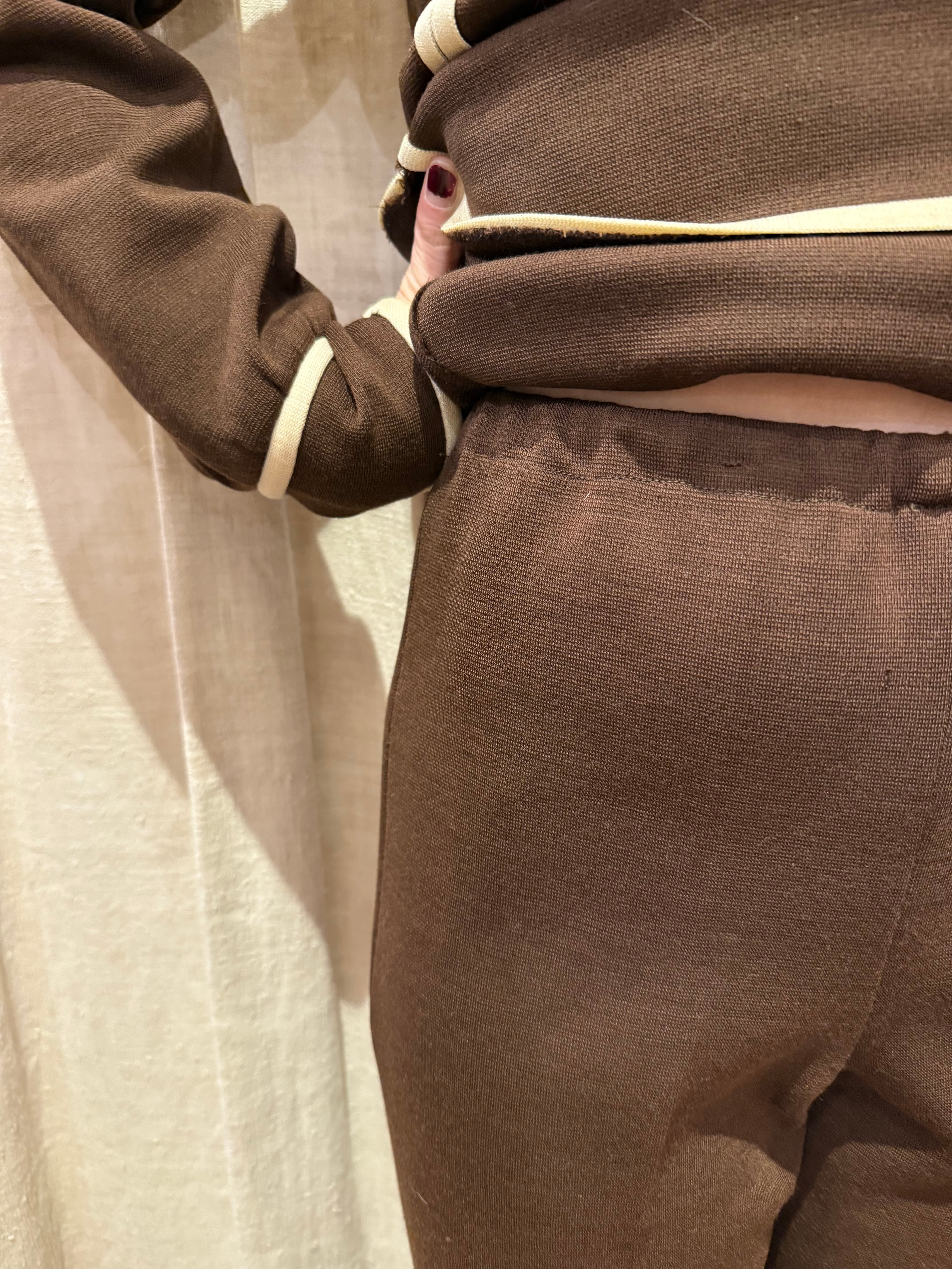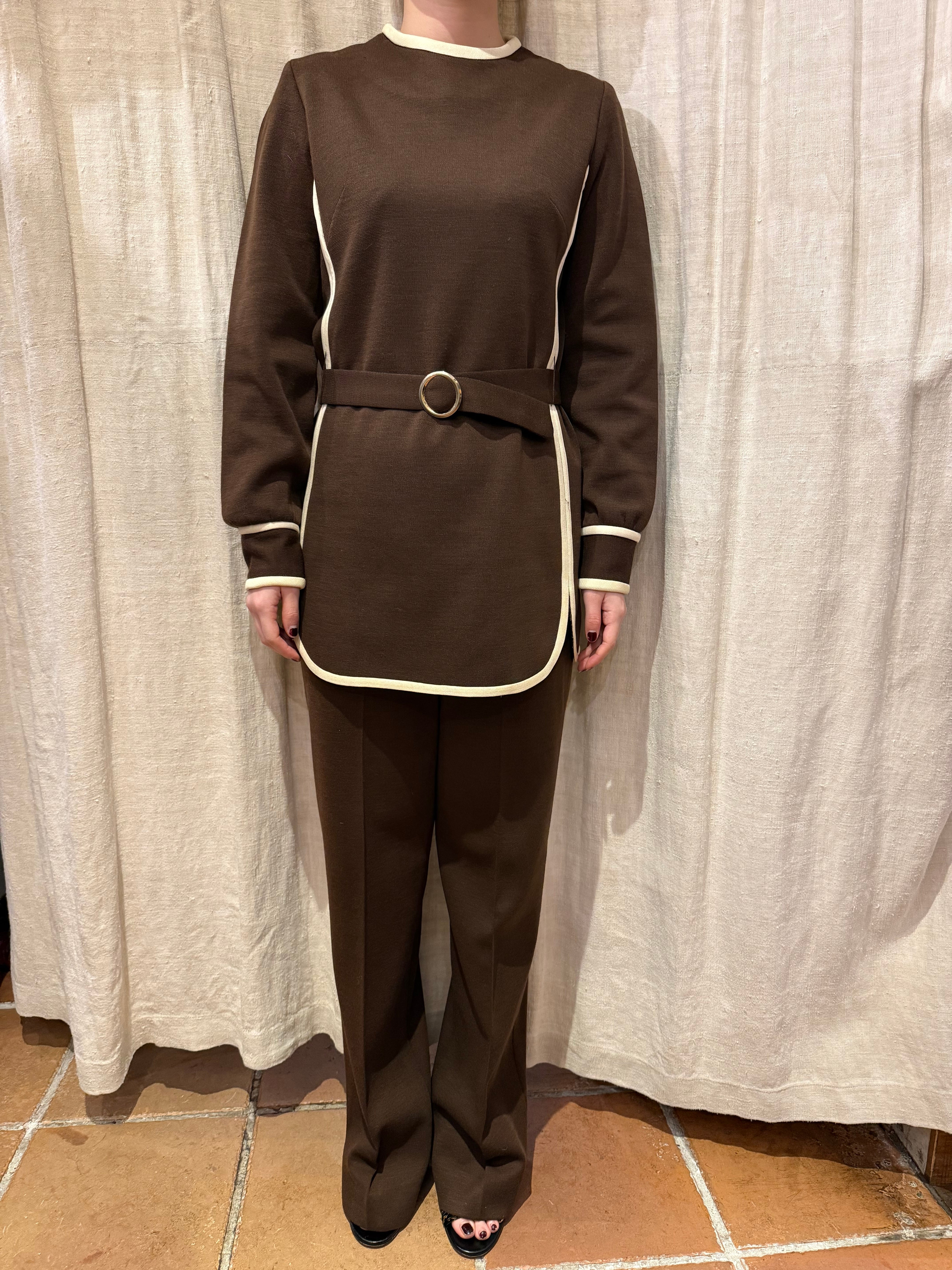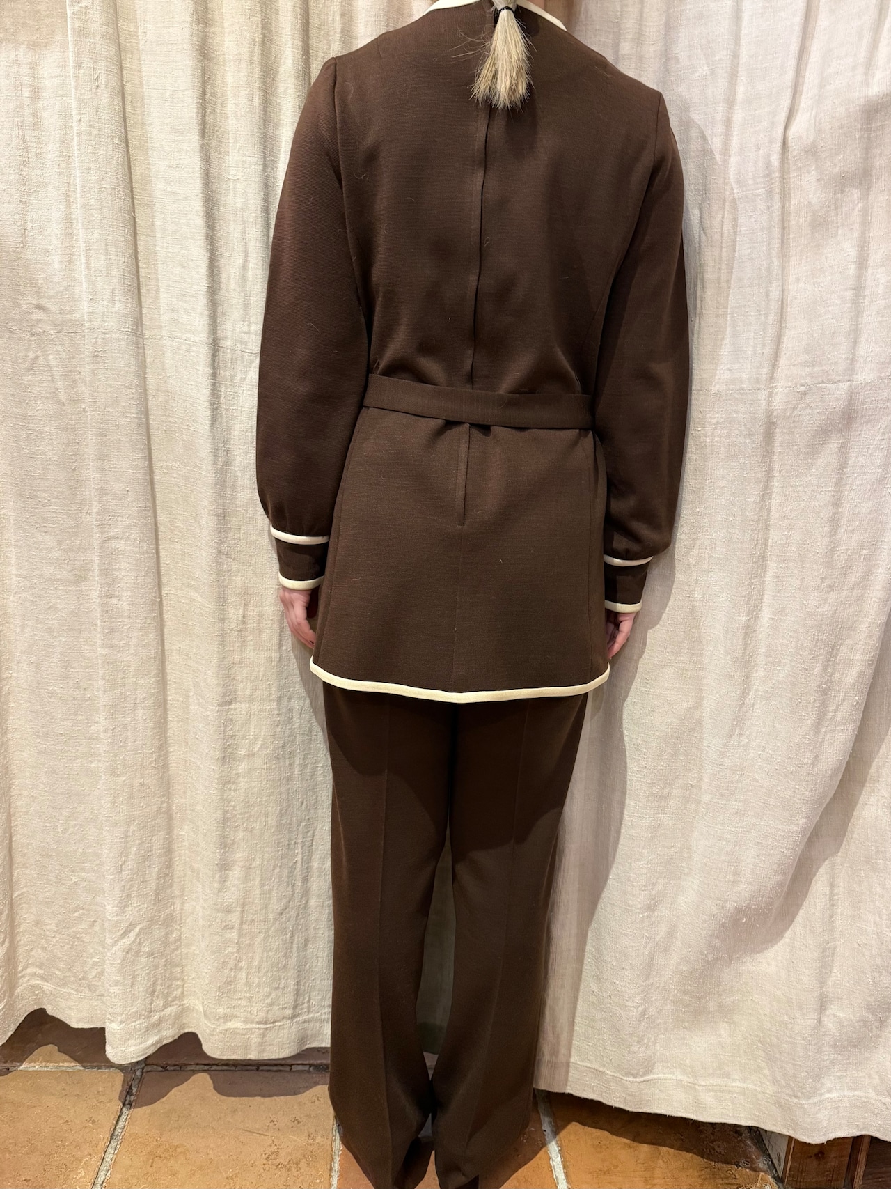 スラリとしたストレートなシルエットで、上品なセットアップ。ブラウンボディでホワイトのパイピングが施されているのがとても可愛らしいです。ベルトも付属なので、3ピース別々で使うことも可能です。冬のファーアイテムとも相性が良さそうです◎