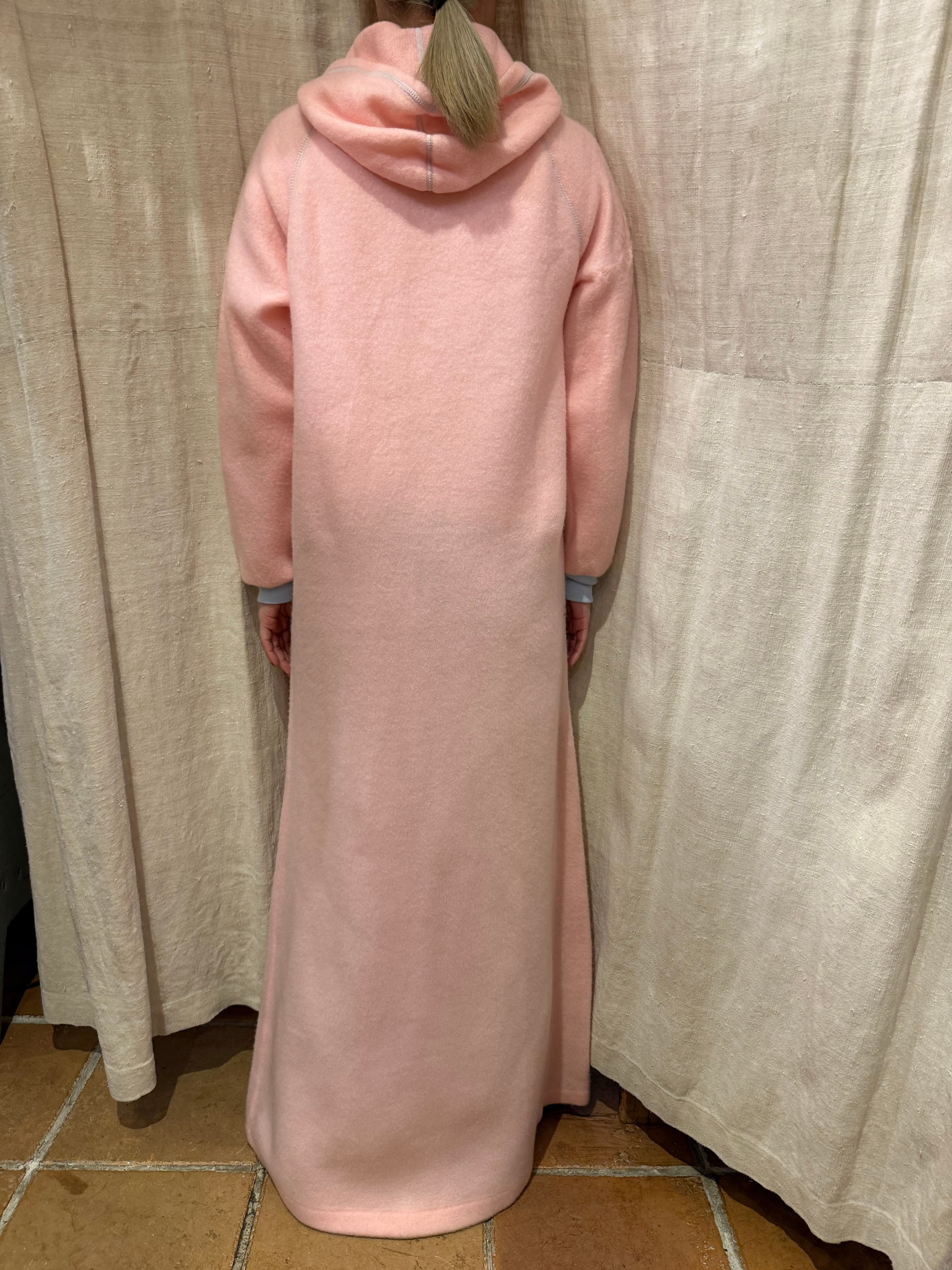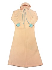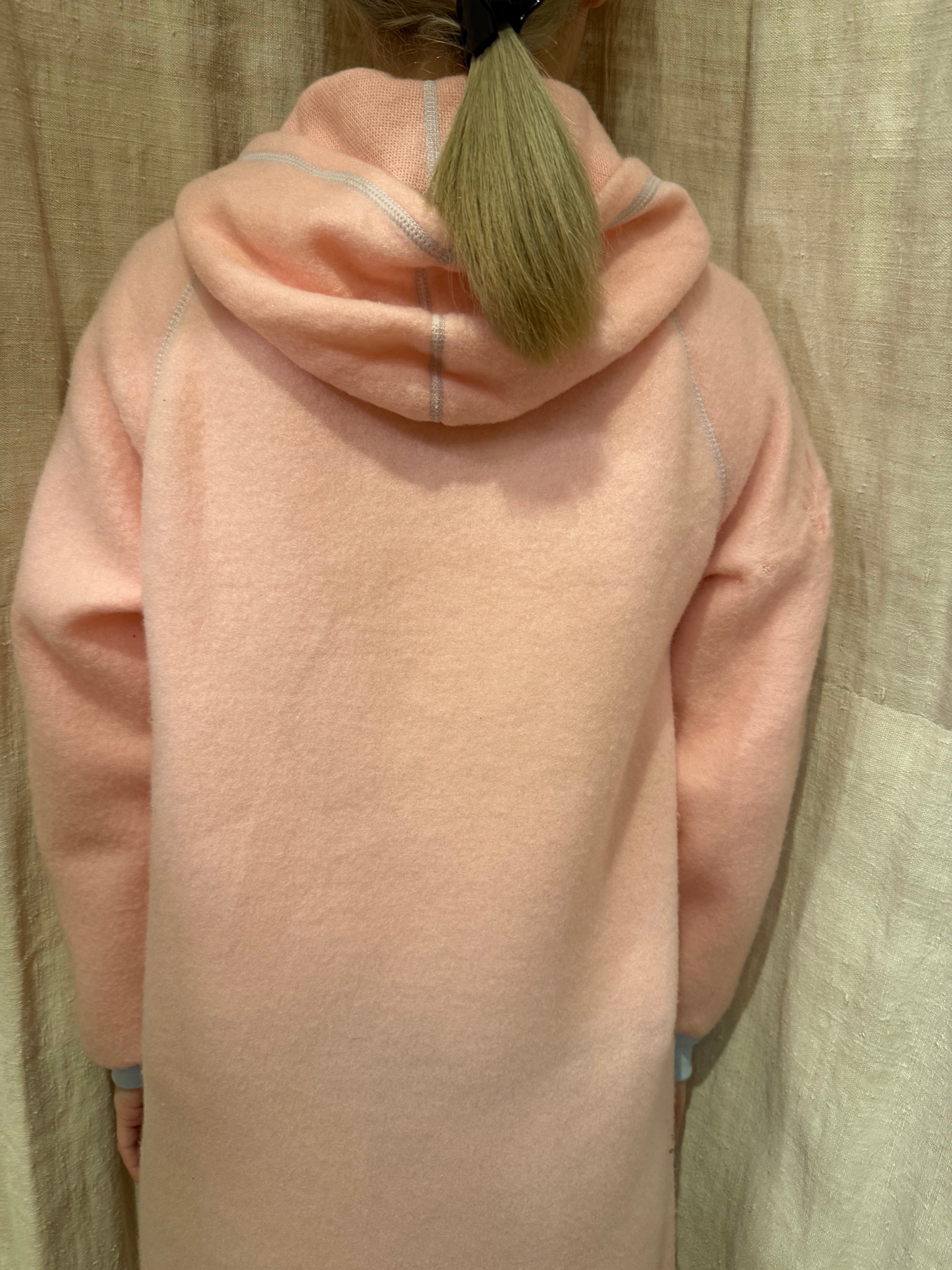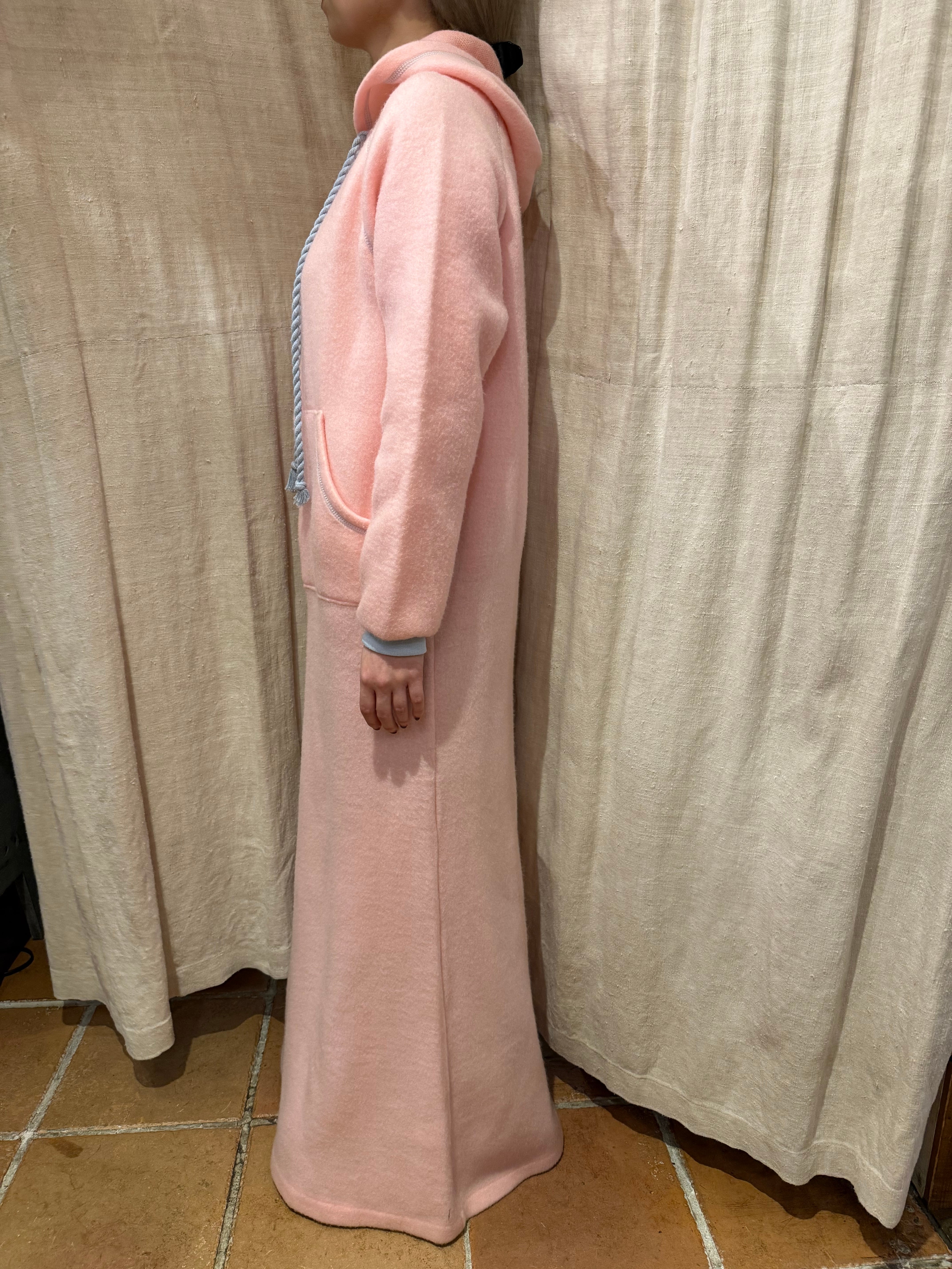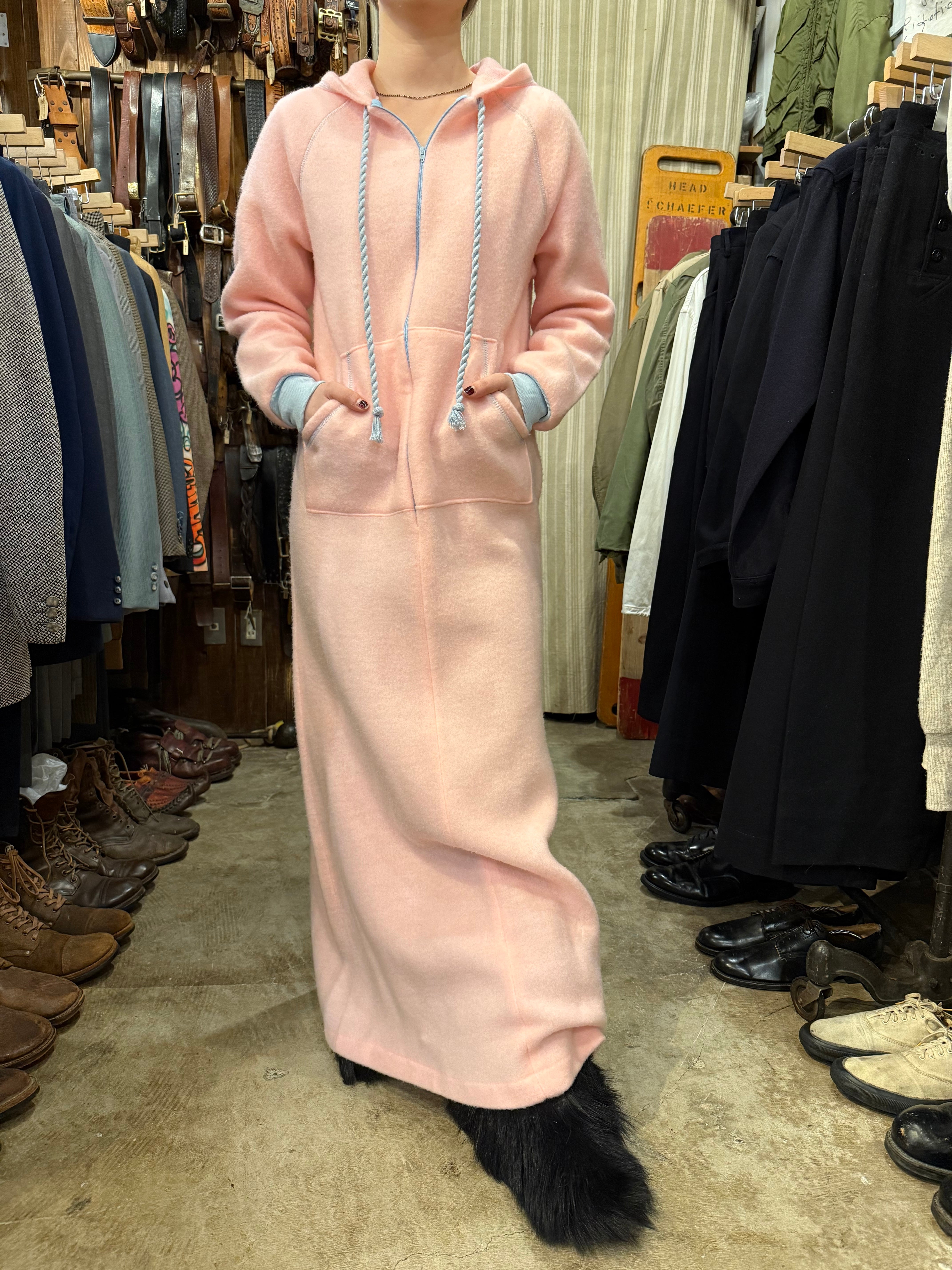 暖かいフリース素材のドレス。フード付きのポケットが付いたデザインで、カジュアルですが甘めのカラーリングで可愛らしい雰囲気を演出してくれます。やや長めの丈感ですがずるっと履いてブーツなどと合わせても良いと思います。