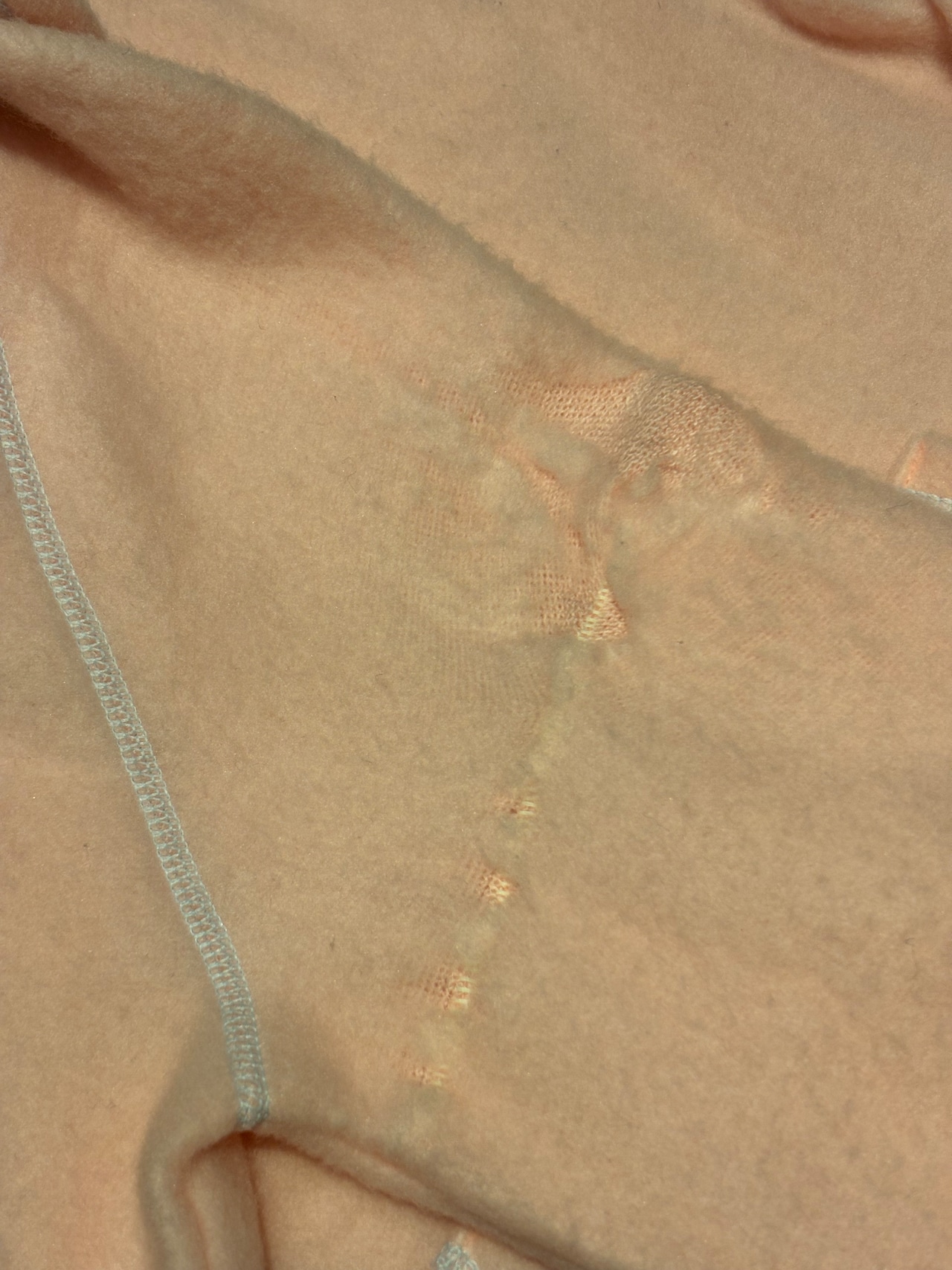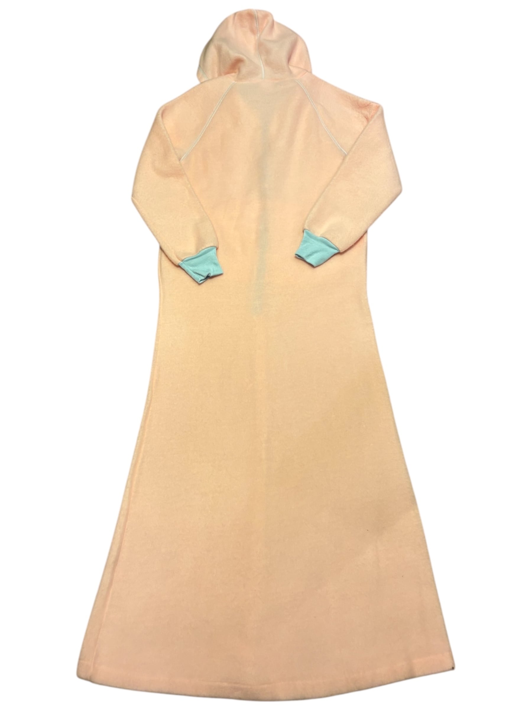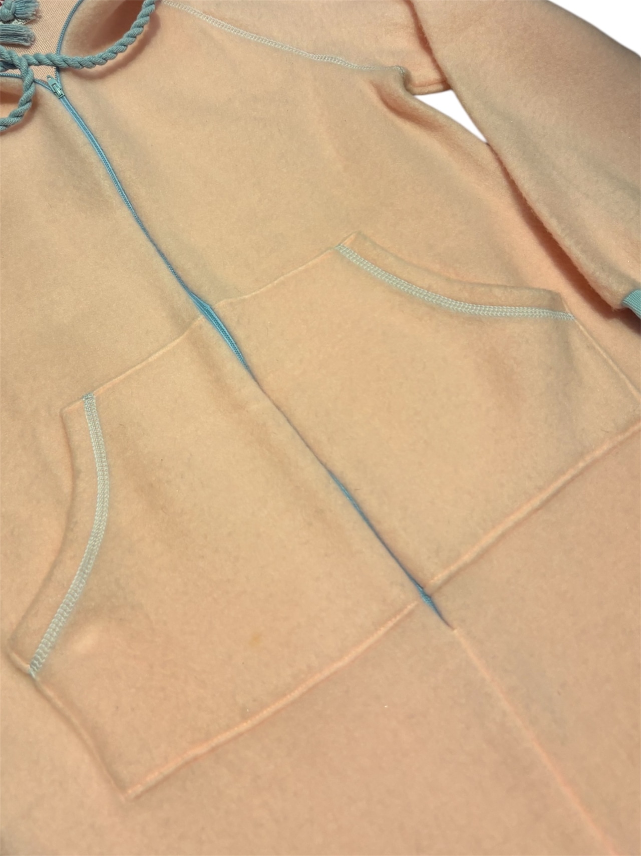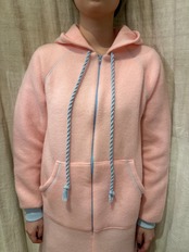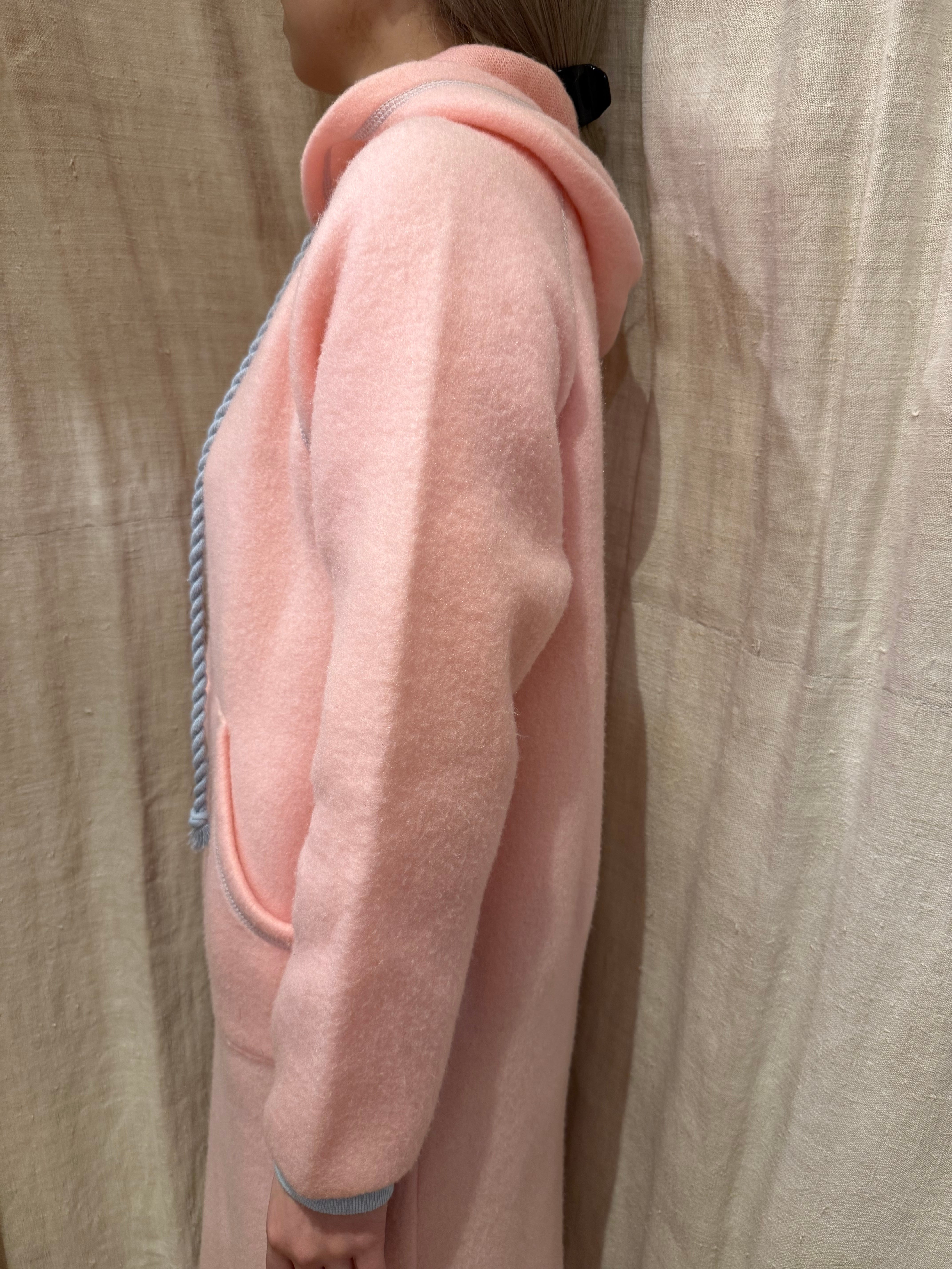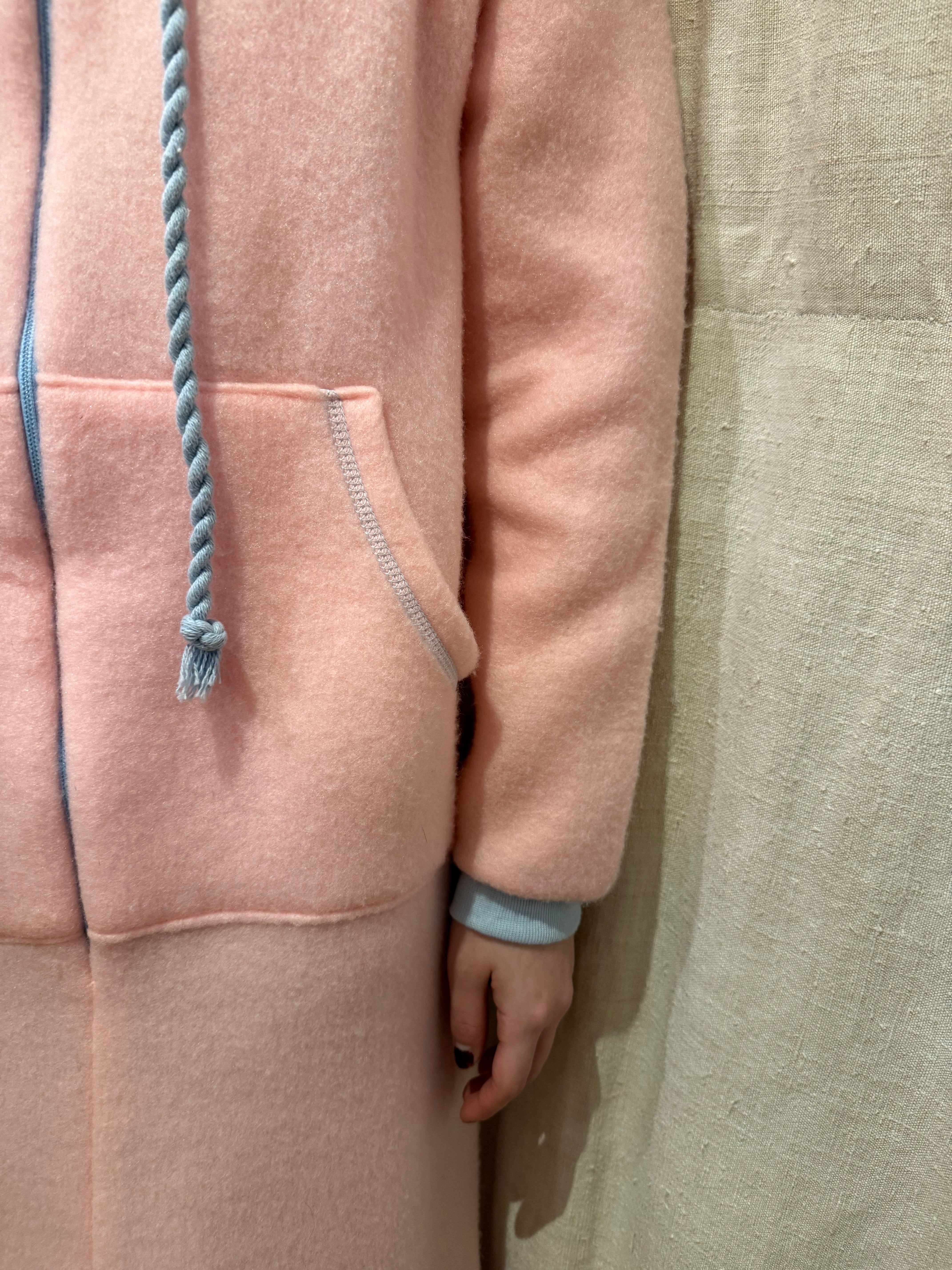 暖かいフリース素材のドレス。フード付きのポケットが付いたデザインで、カジュアルですが甘めのカラーリングで可愛らしい雰囲気を演出してくれます。やや長めの丈感ですがずるっと履いてブーツなどと合わせても良いと思います。