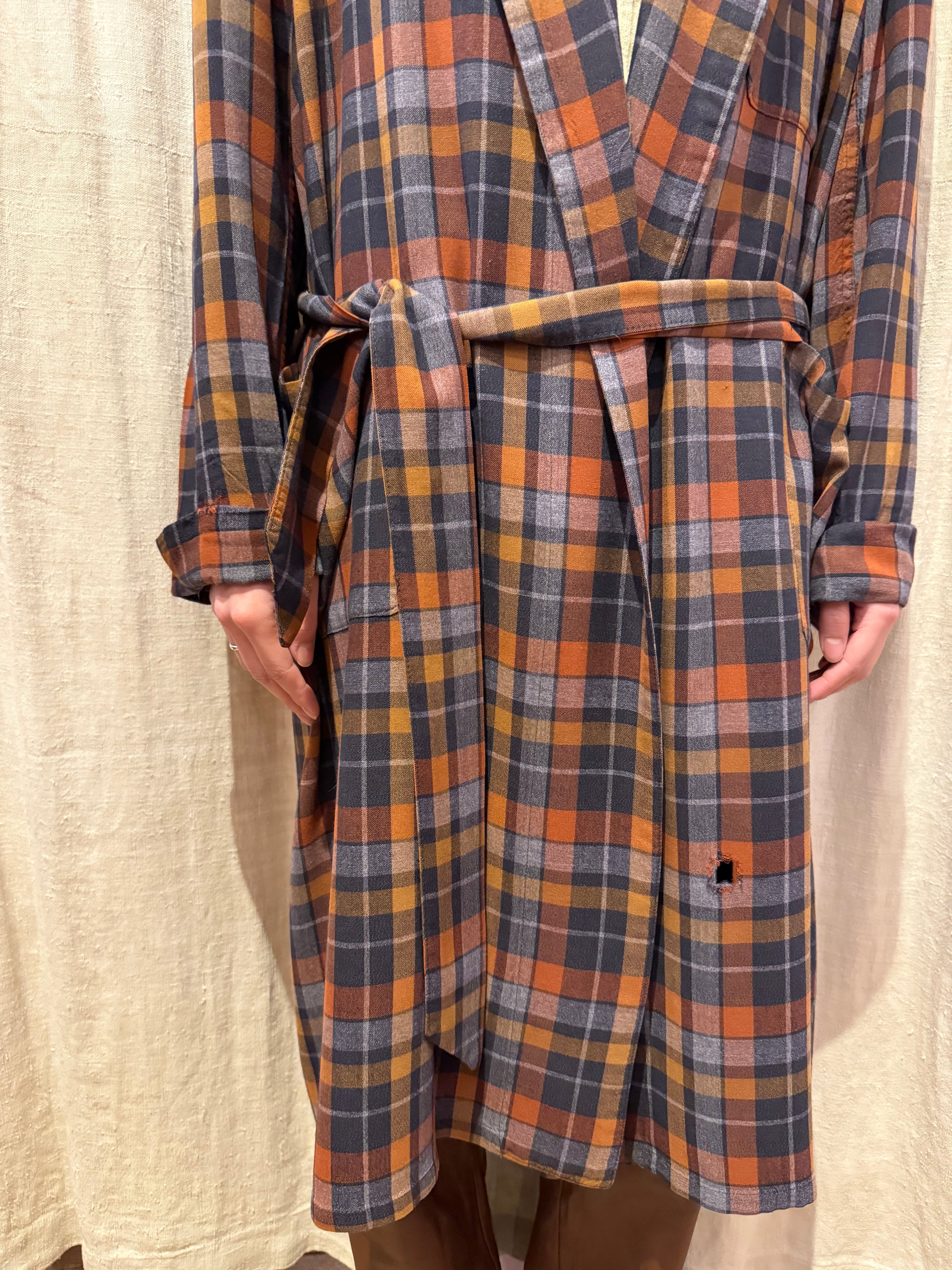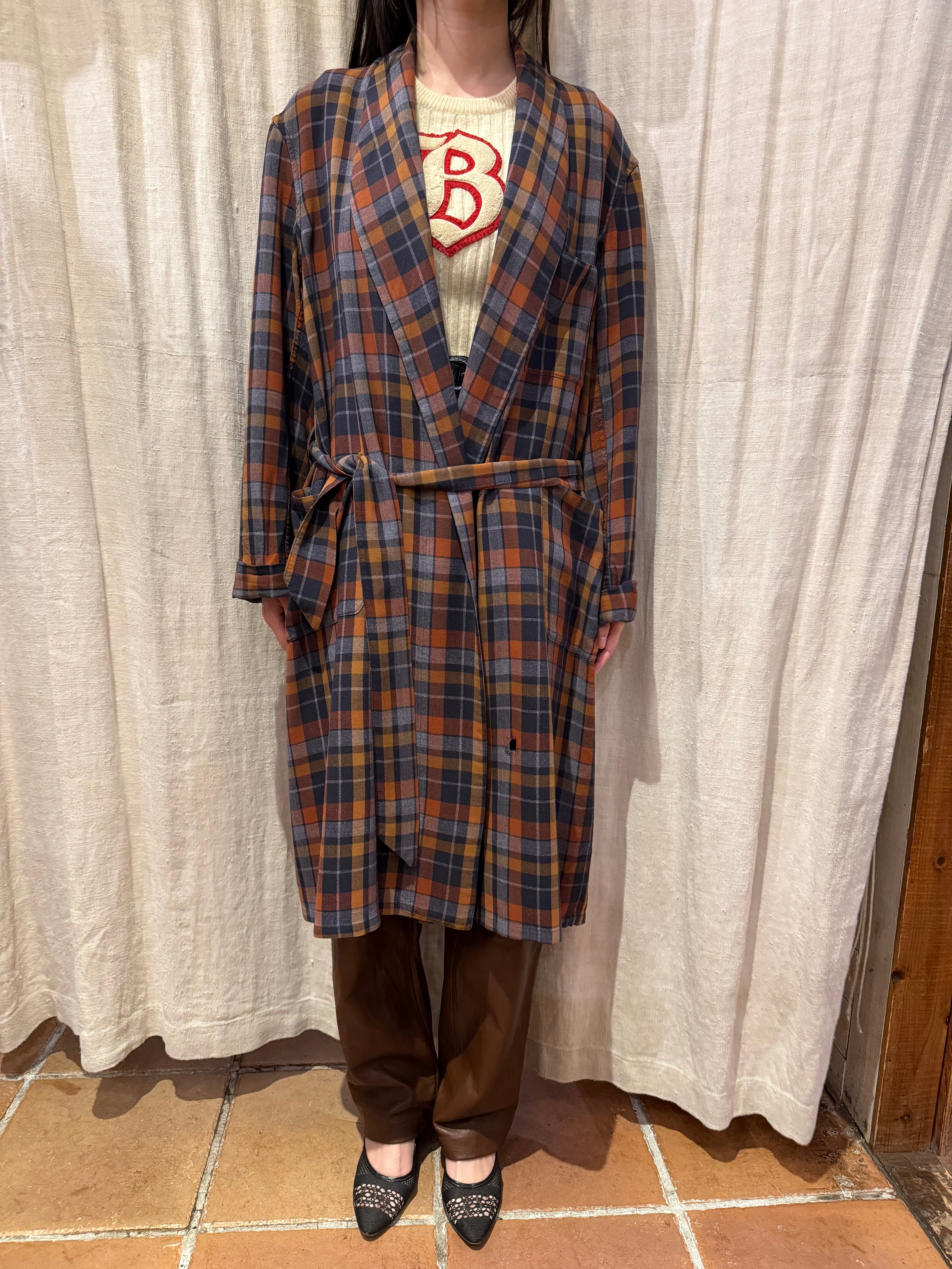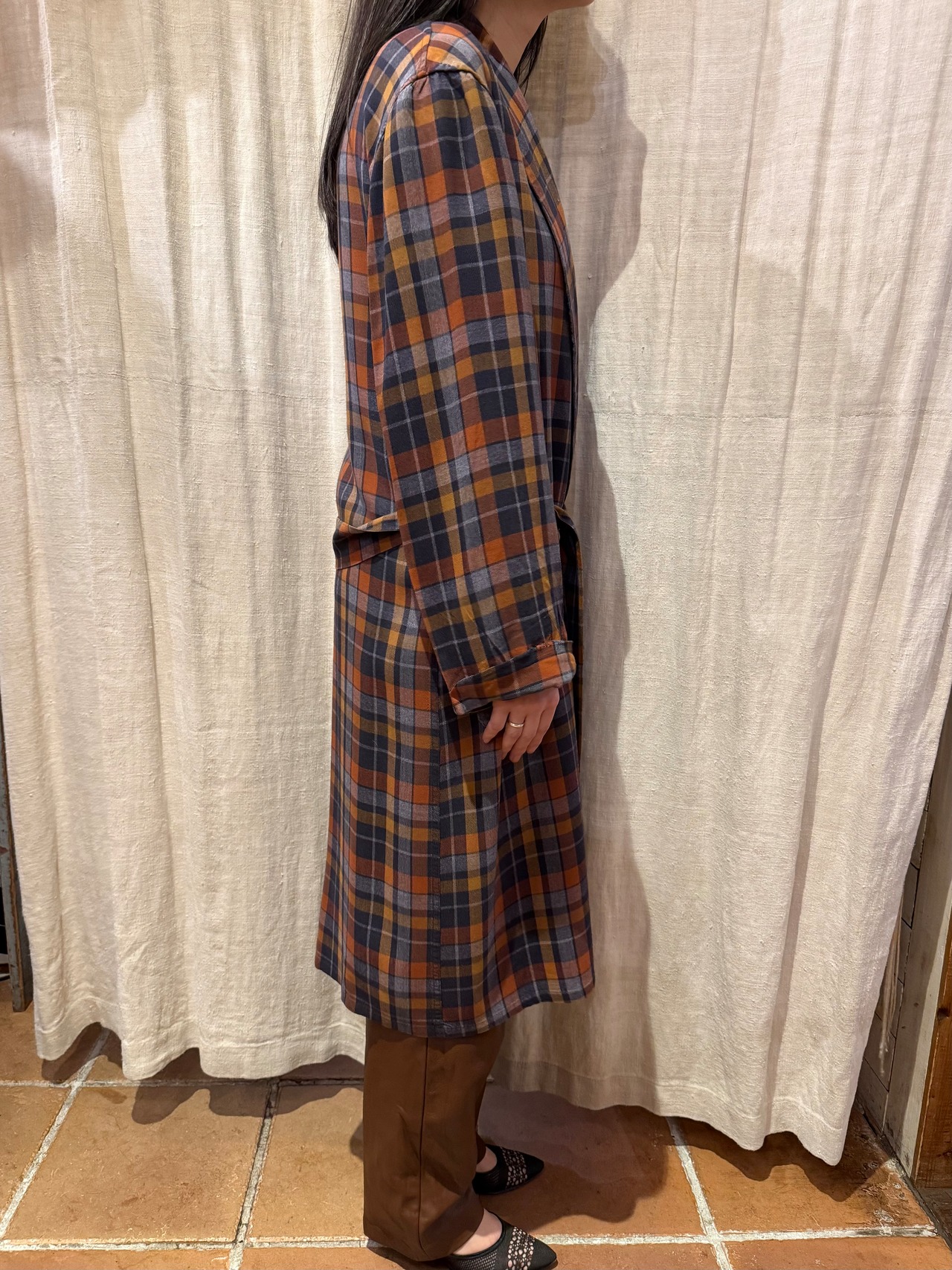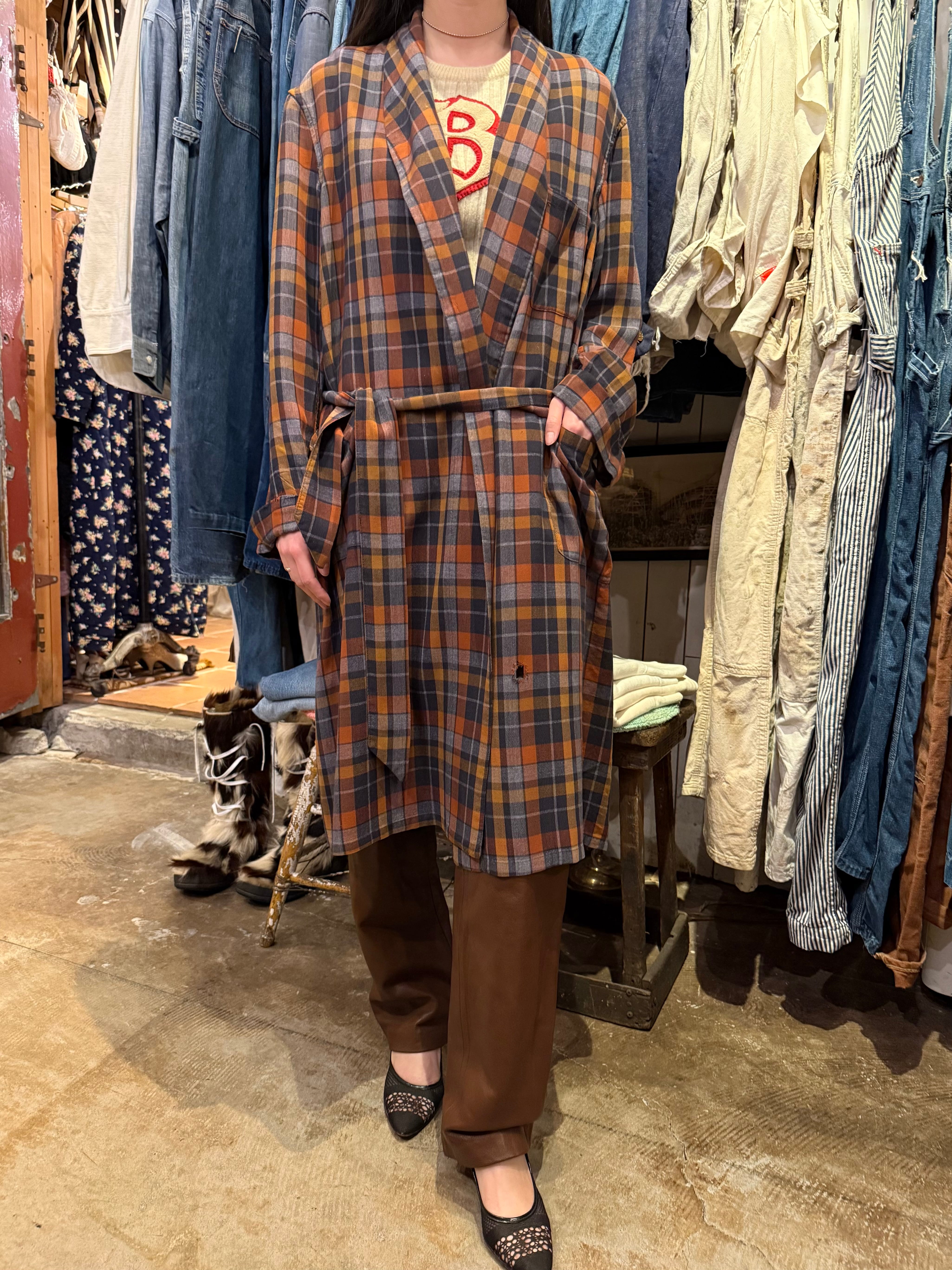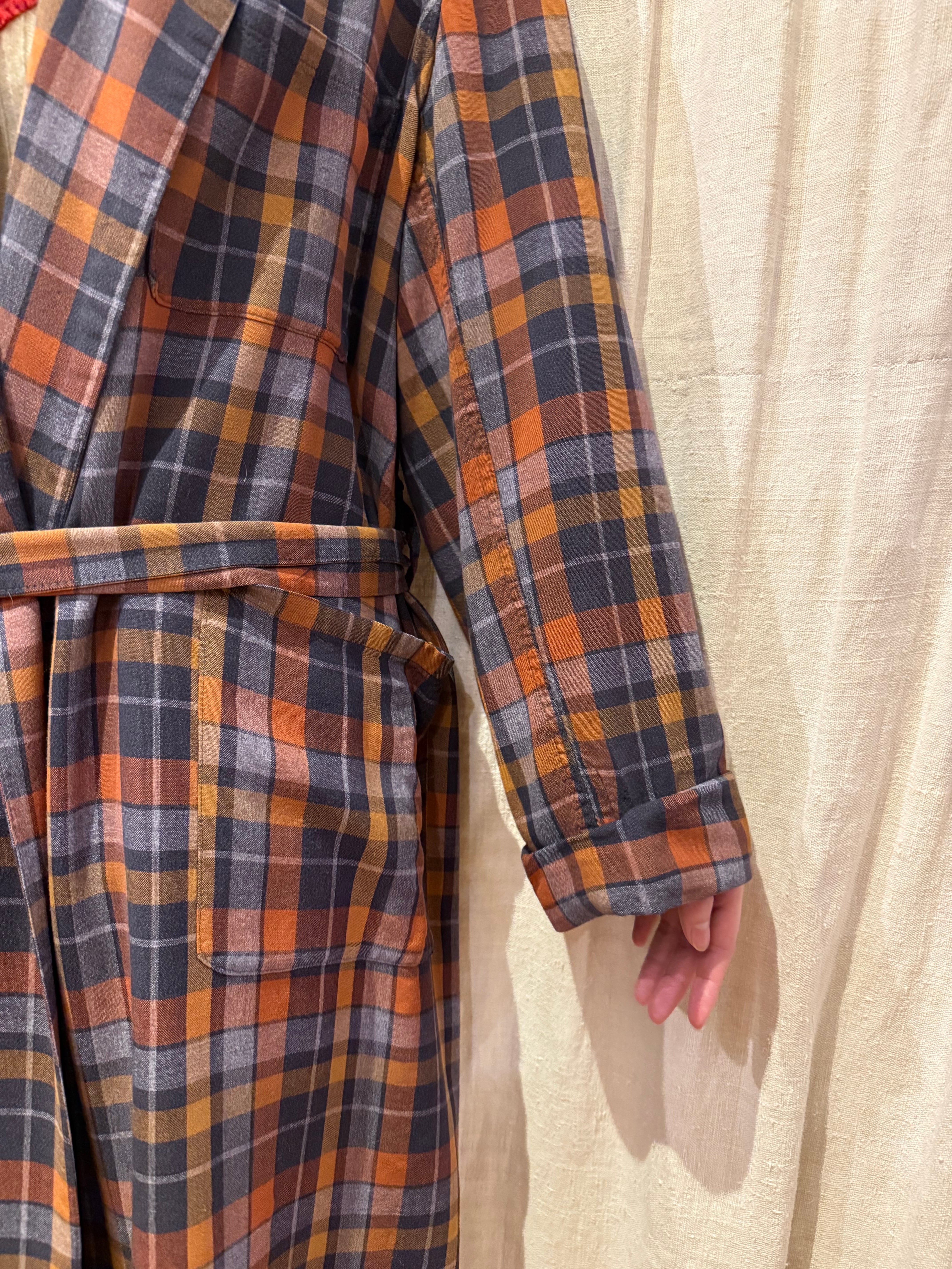 チェック柄のガウンです。薄手の着心地で今の時期アウターの下に仕込ませてレイヤードにも使えます。ドレスの様に着ても良いですね◎オレンジの入ったカラーでブラウンのパンツとも相性抜群です。