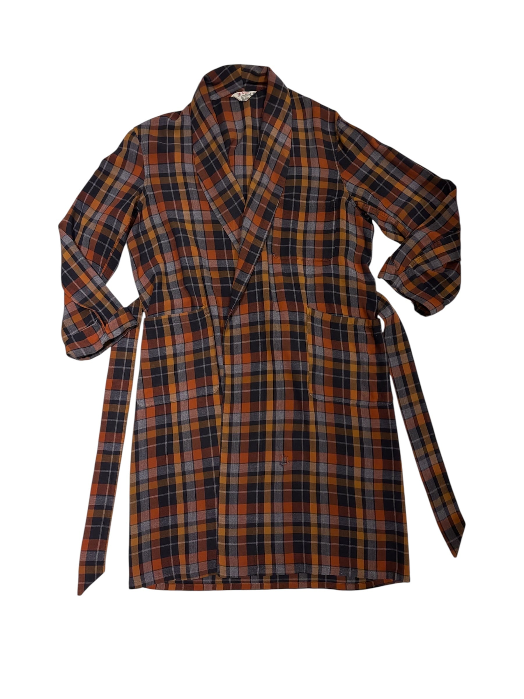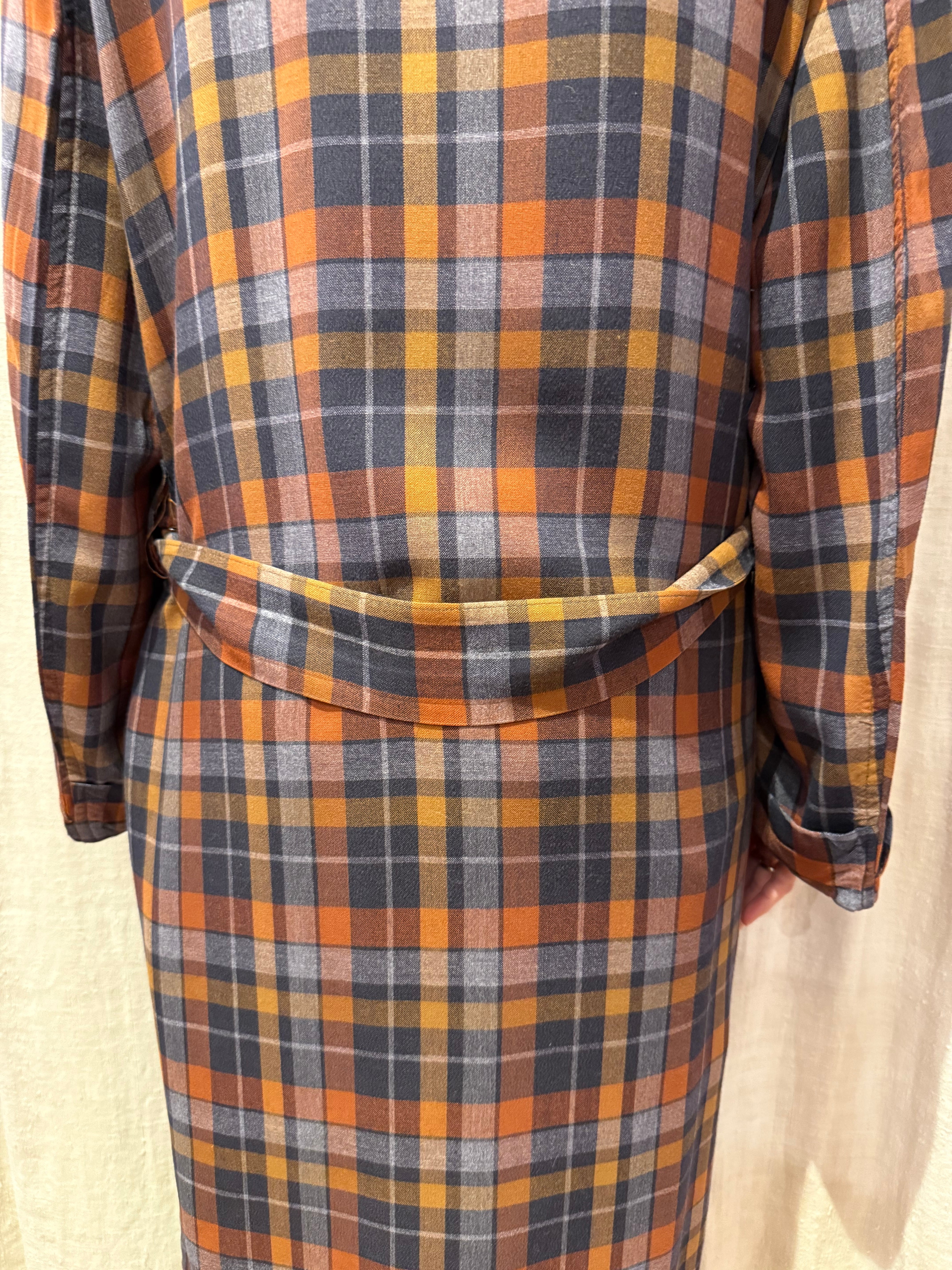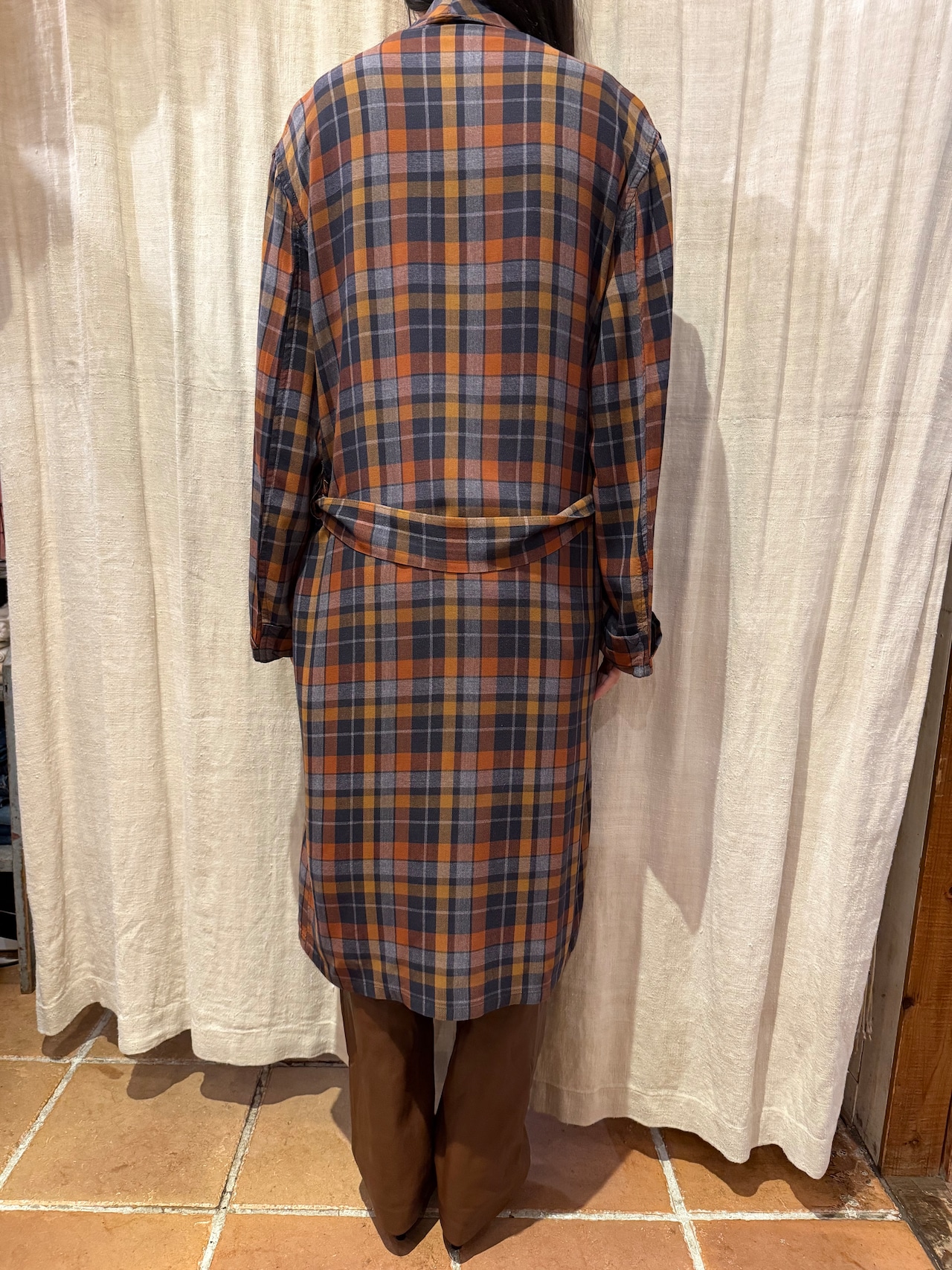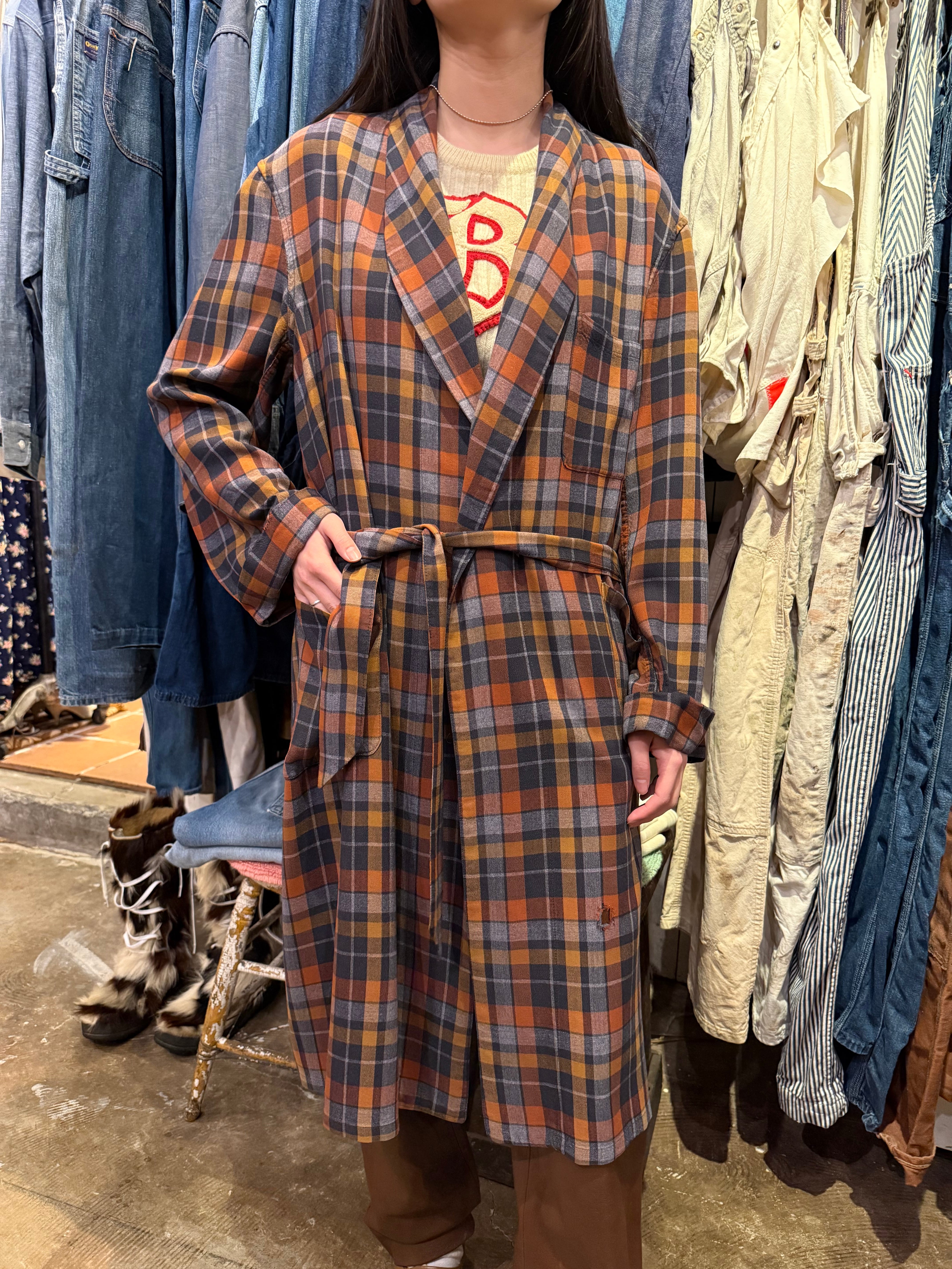 チェック柄のガウンです。薄手の着心地で今の時期アウターの下に仕込ませてレイヤードにも使えます。ドレスの様に着ても良いですね◎オレンジの入ったカラーでブラウンのパンツとも相性抜群です。