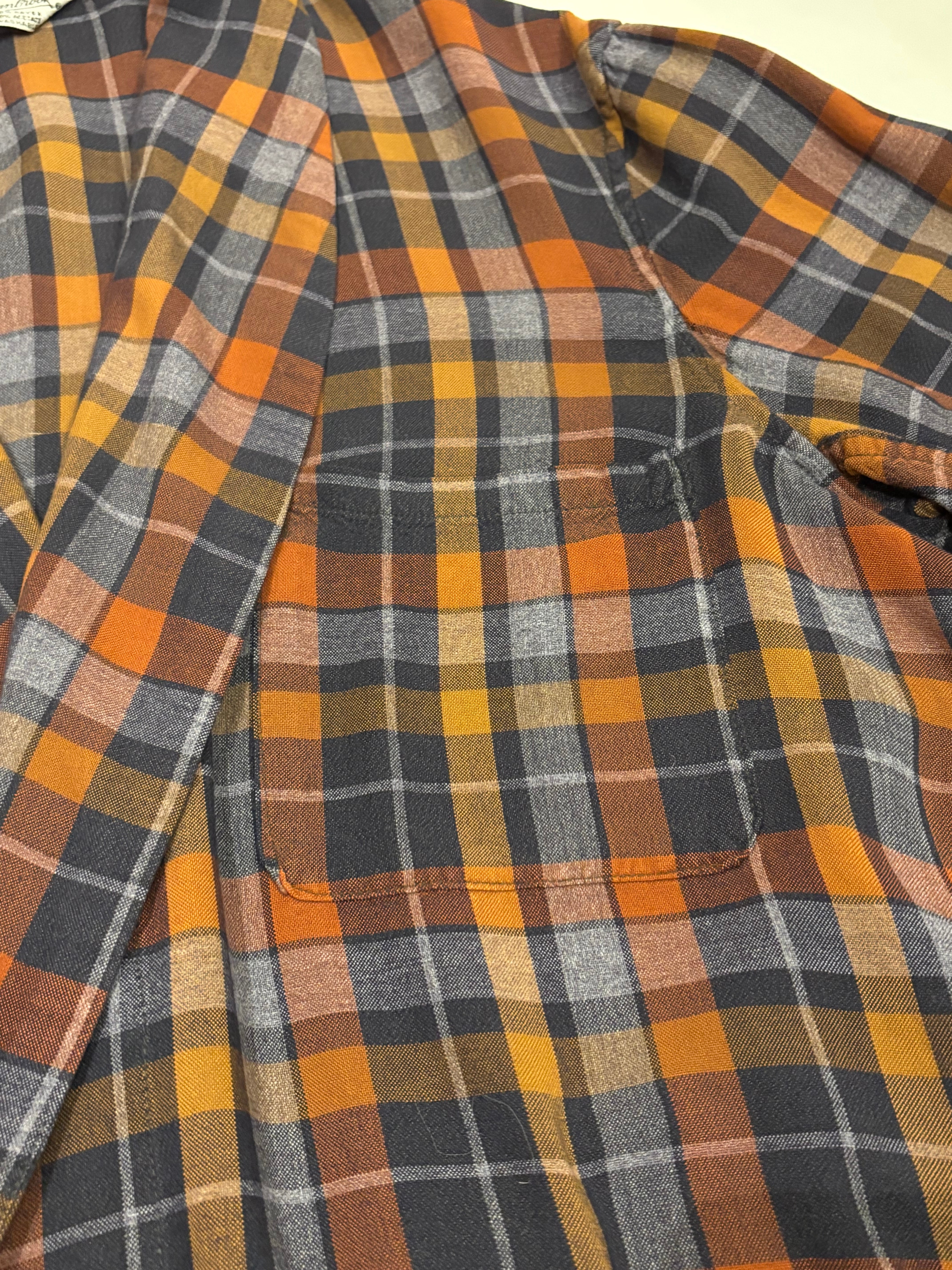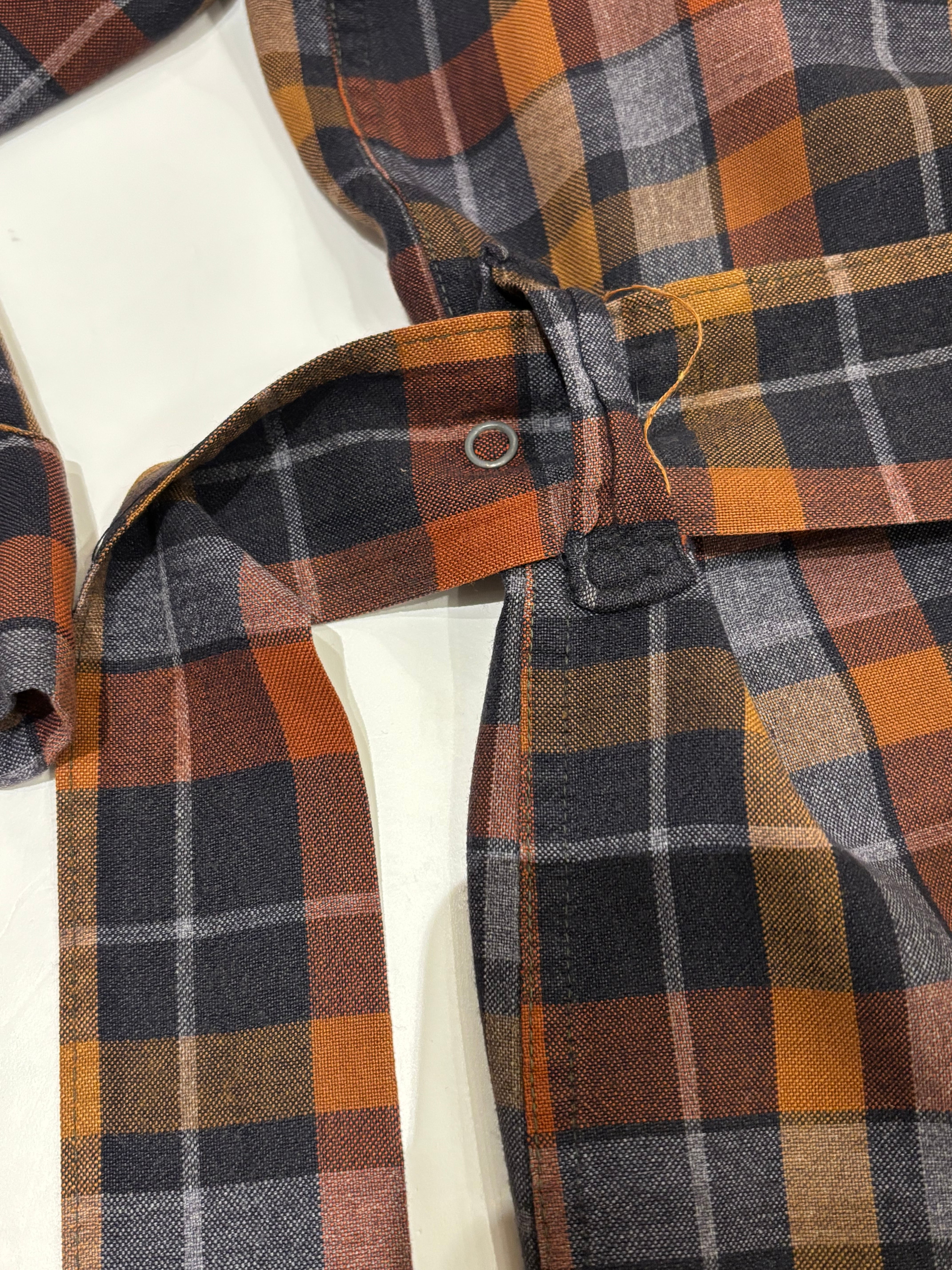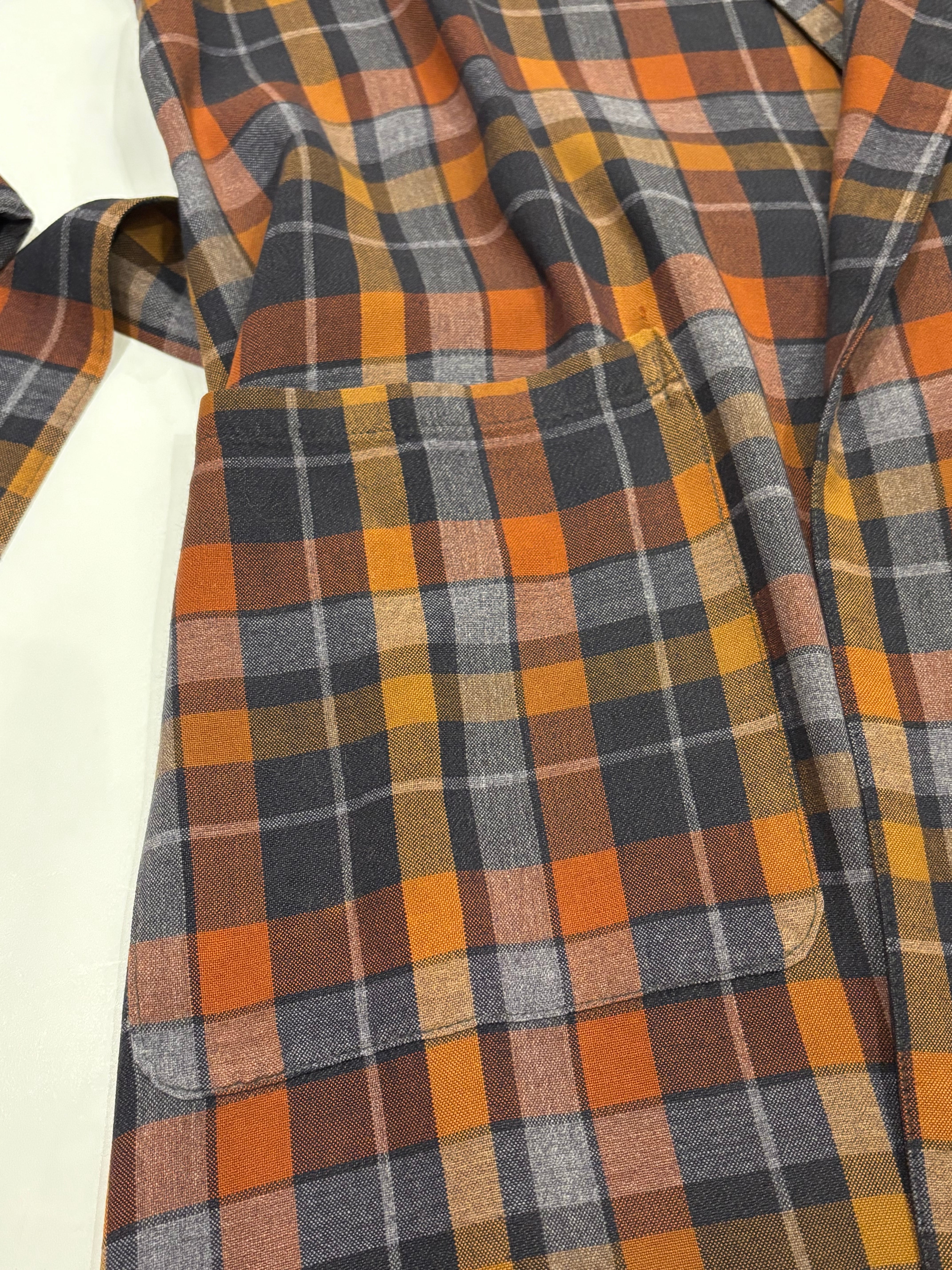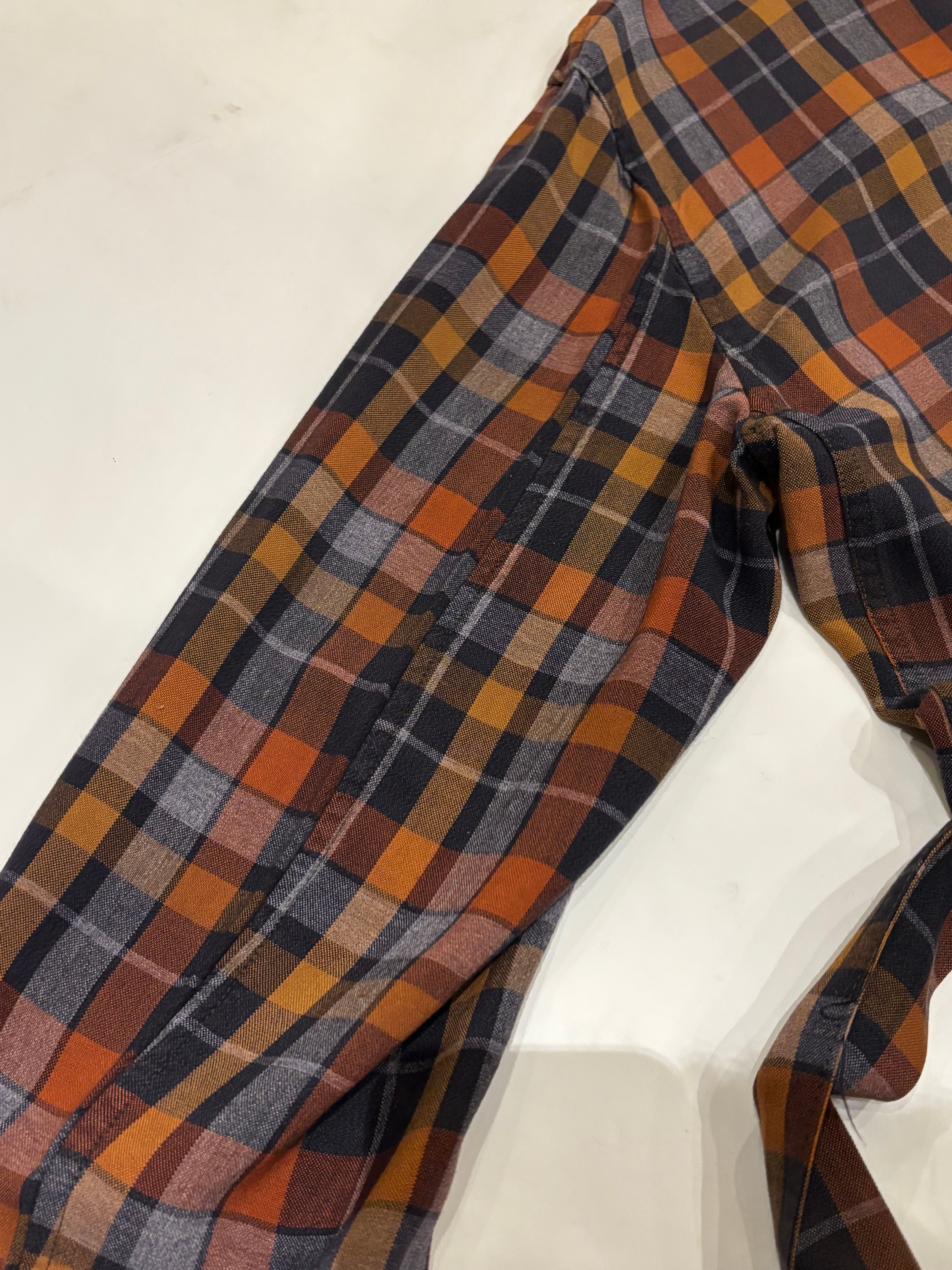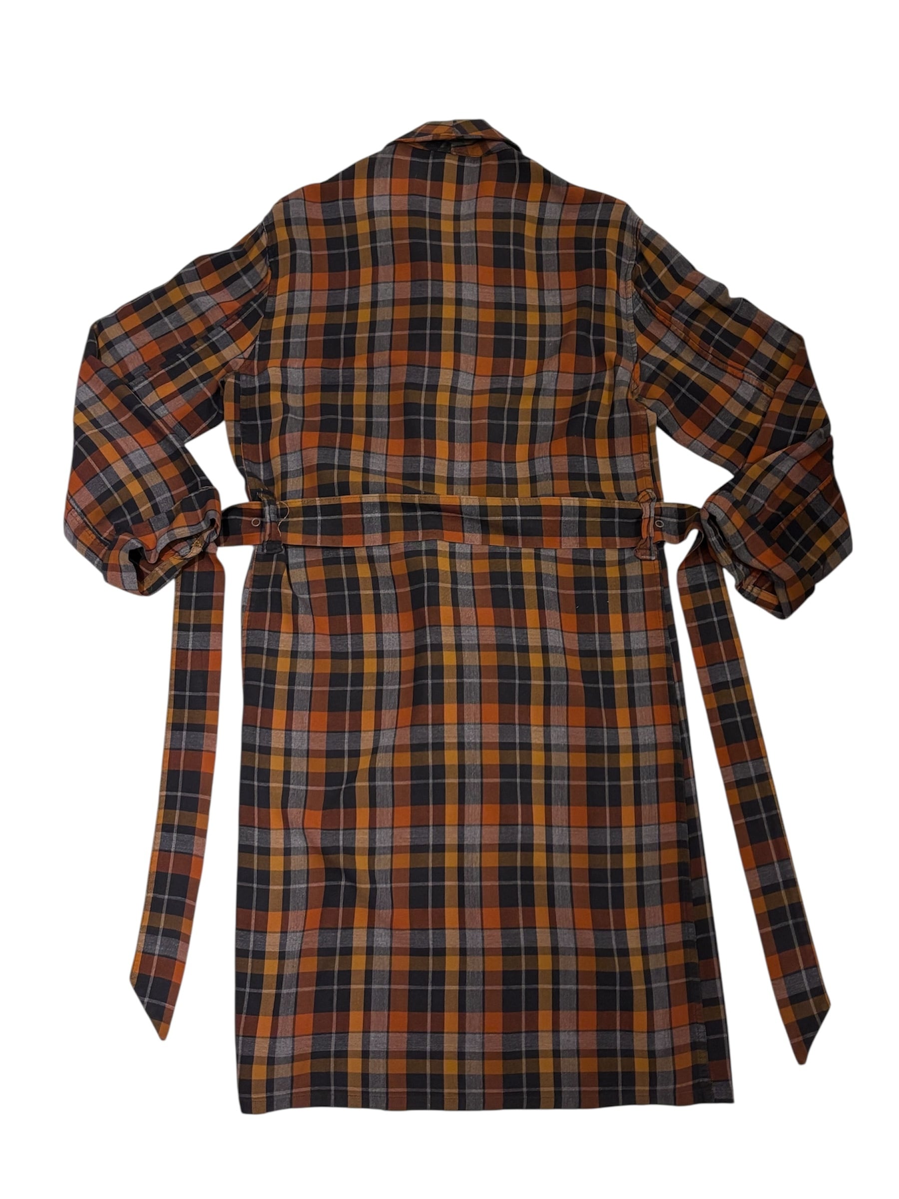 チェック柄のガウンです。薄手の着心地で今の時期アウターの下に仕込ませてレイヤードにも使えます。ドレスの様に着ても良いですね◎オレンジの入ったカラーでブラウンのパンツとも相性抜群です。