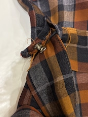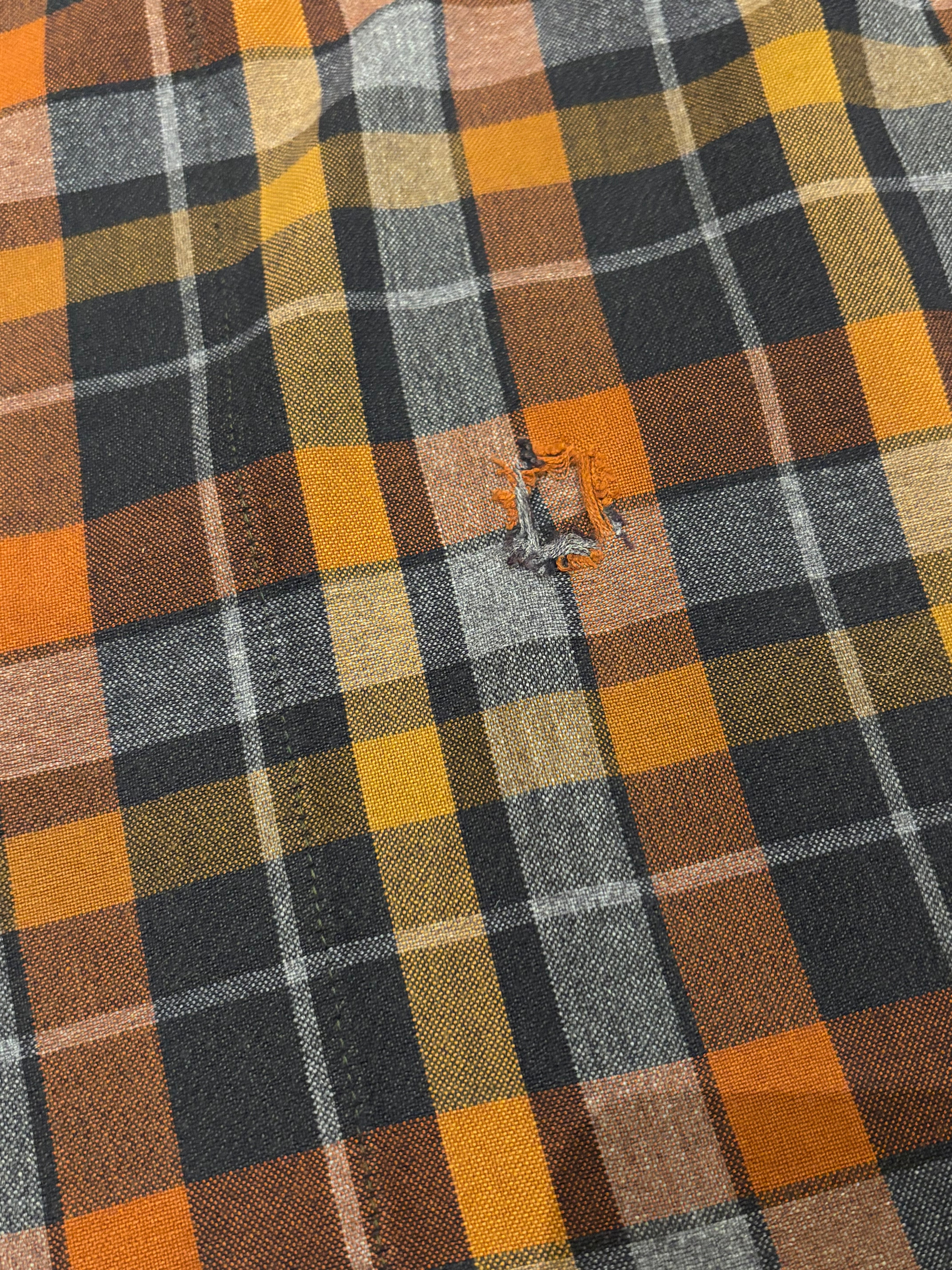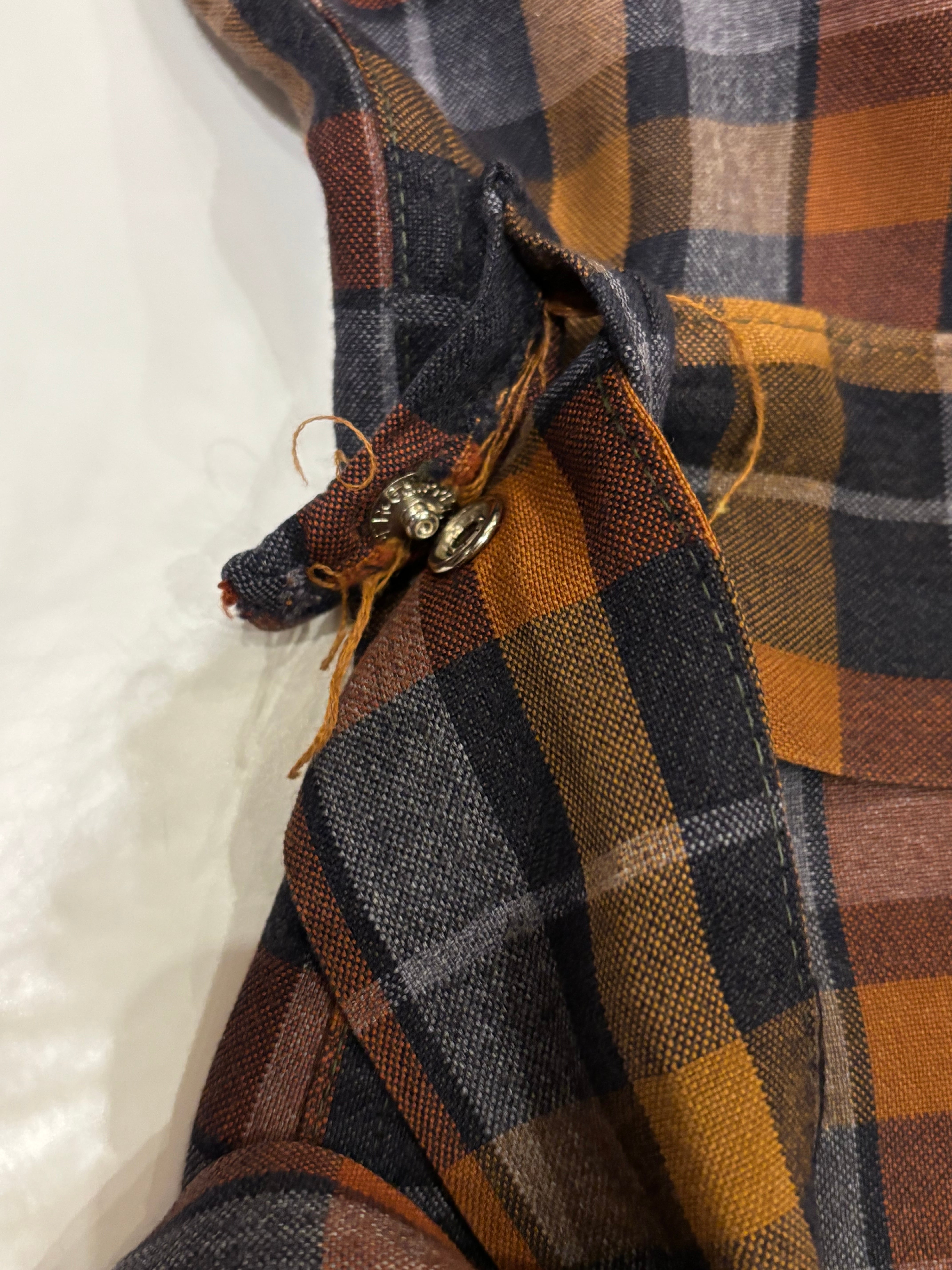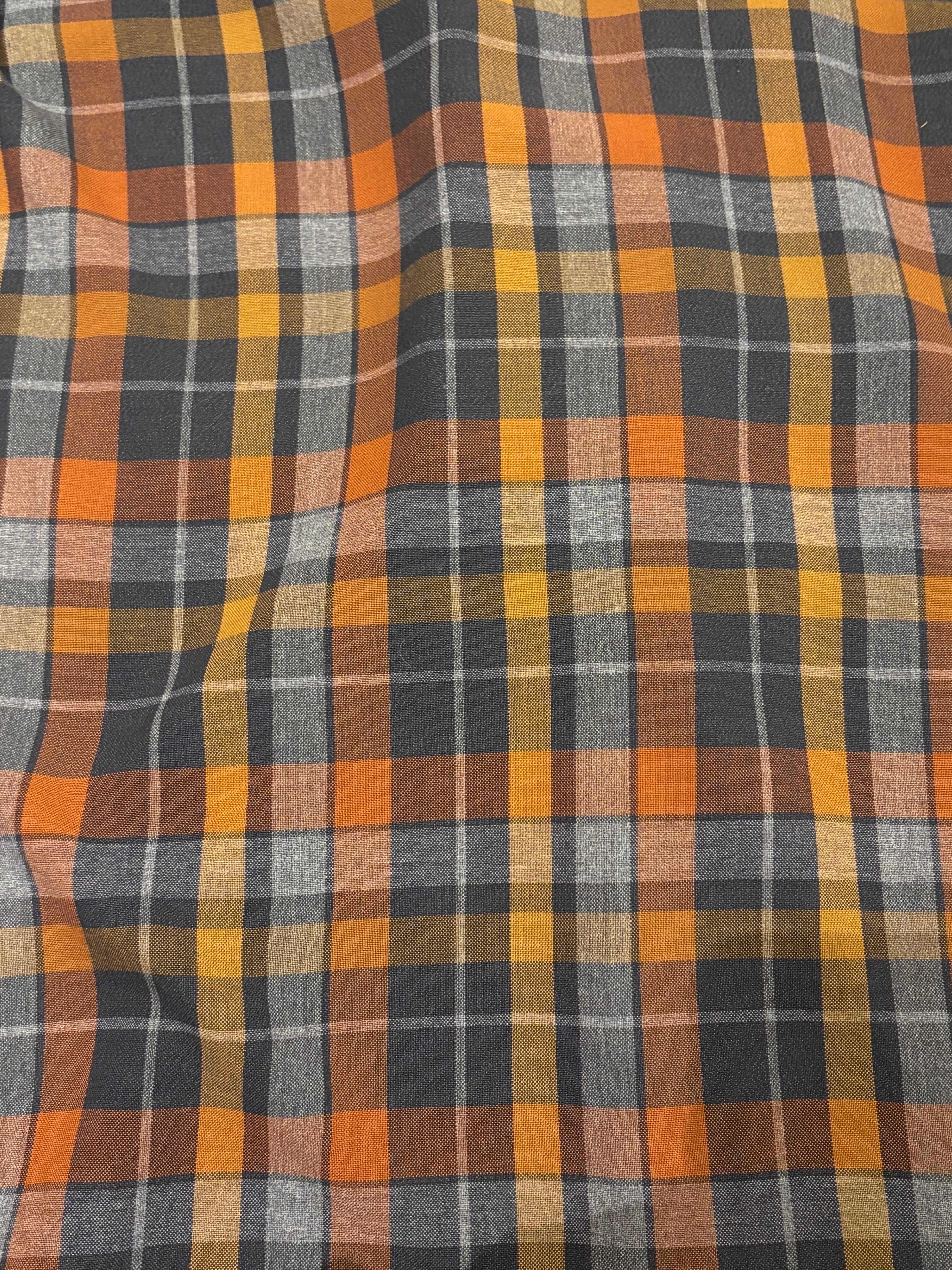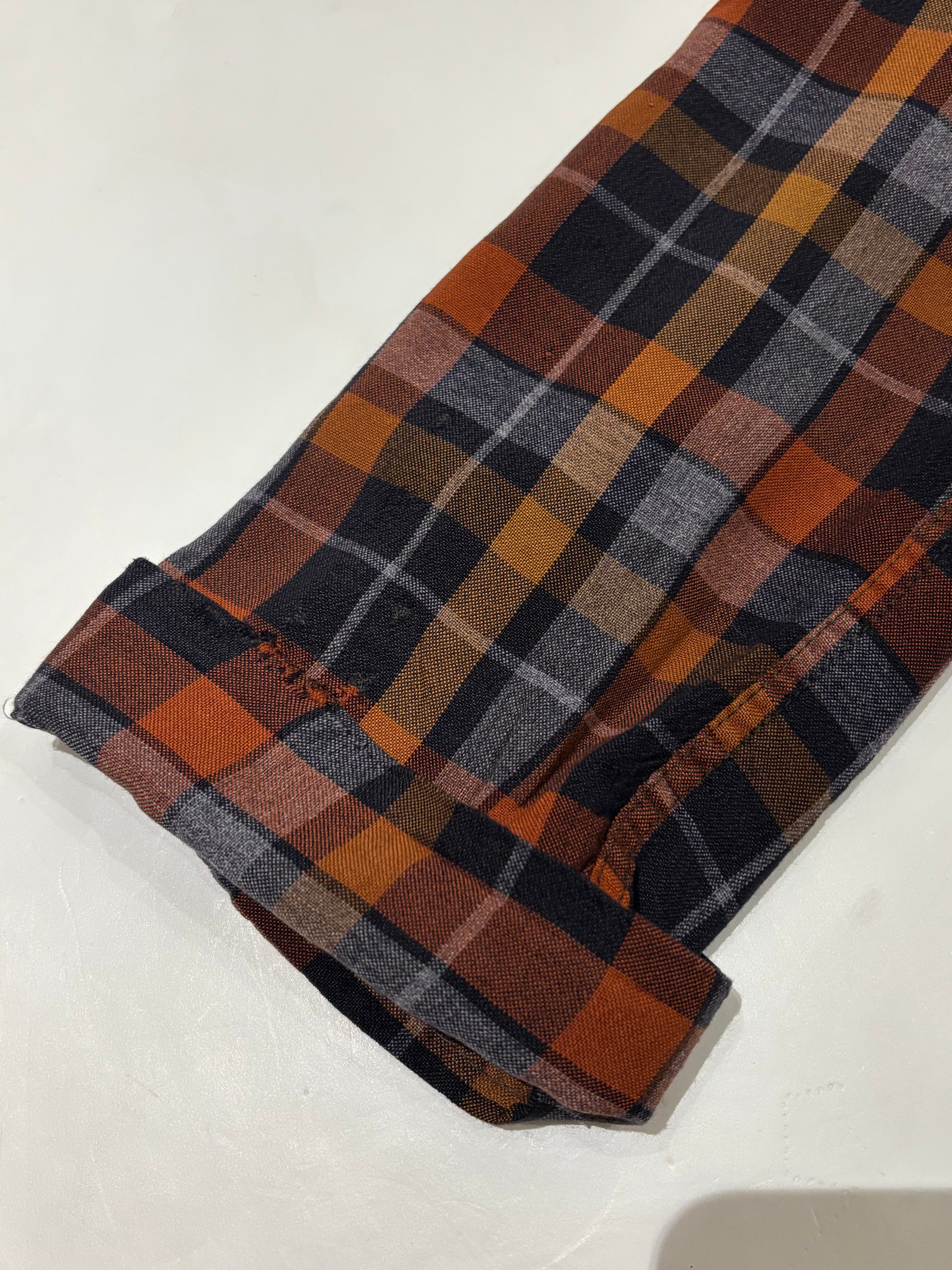 チェック柄のガウンです。薄手の着心地で今の時期アウターの下に仕込ませてレイヤードにも使えます。ドレスの様に着ても良いですね◎オレンジの入ったカラーでブラウンのパンツとも相性抜群です。