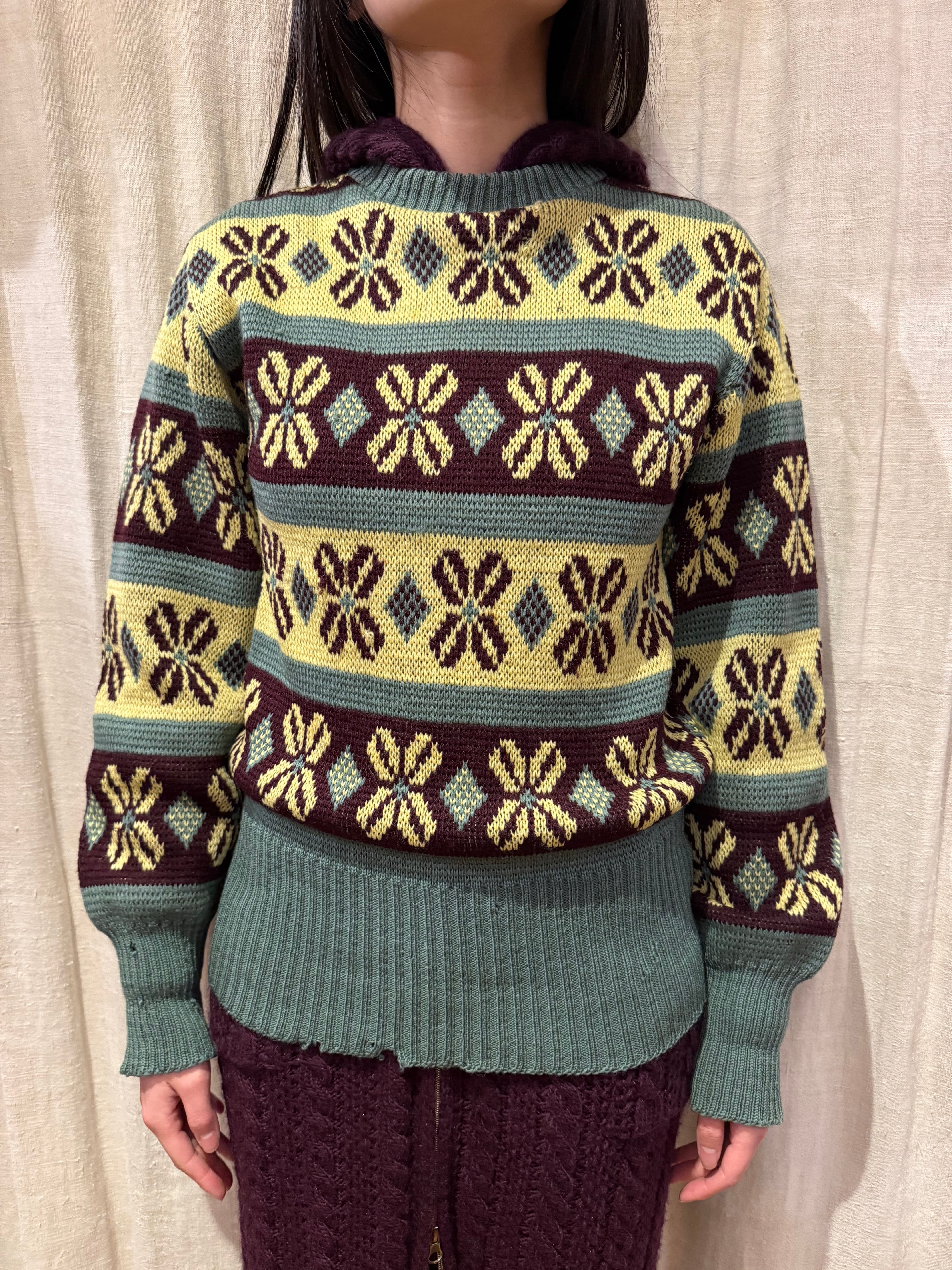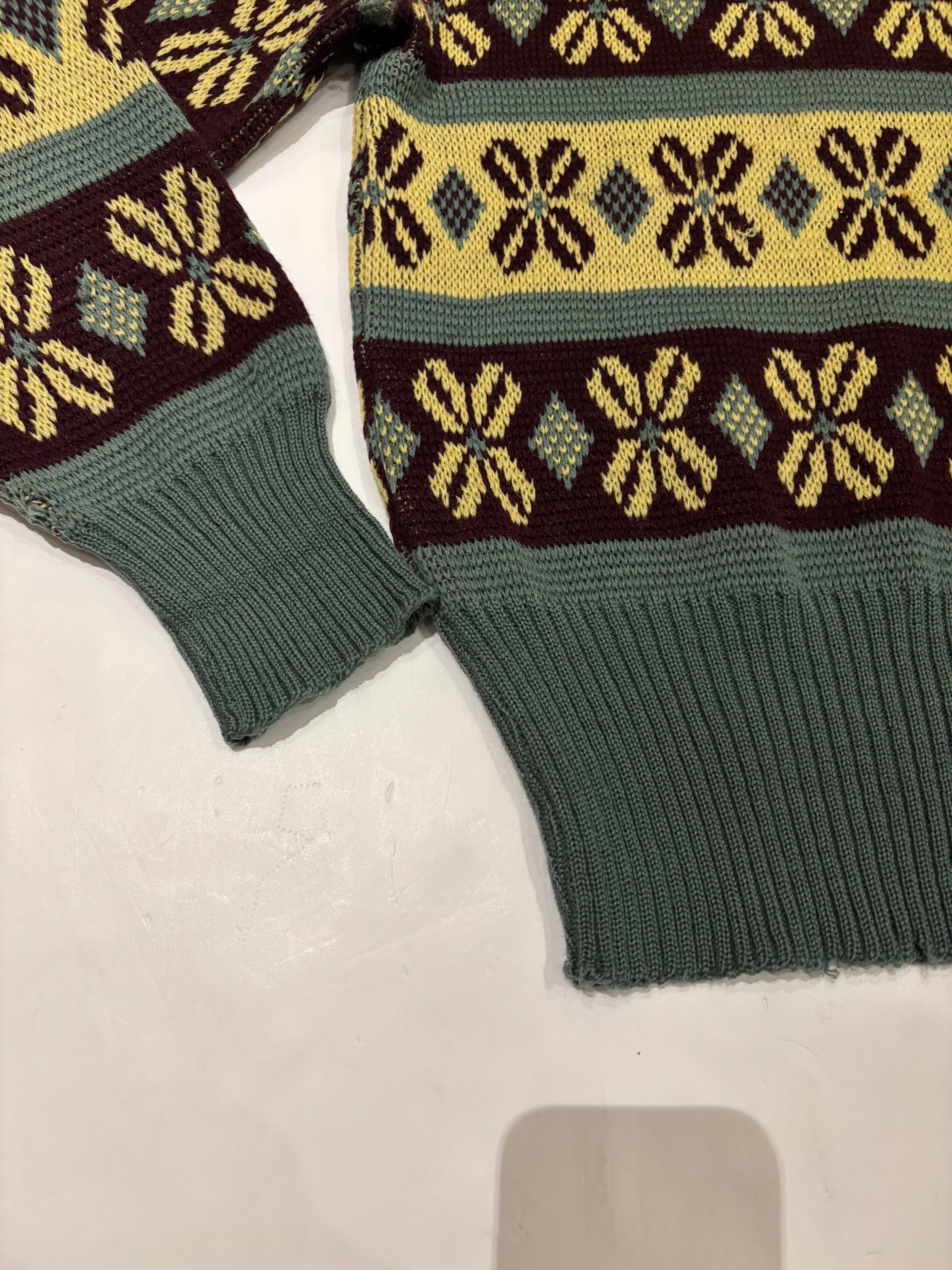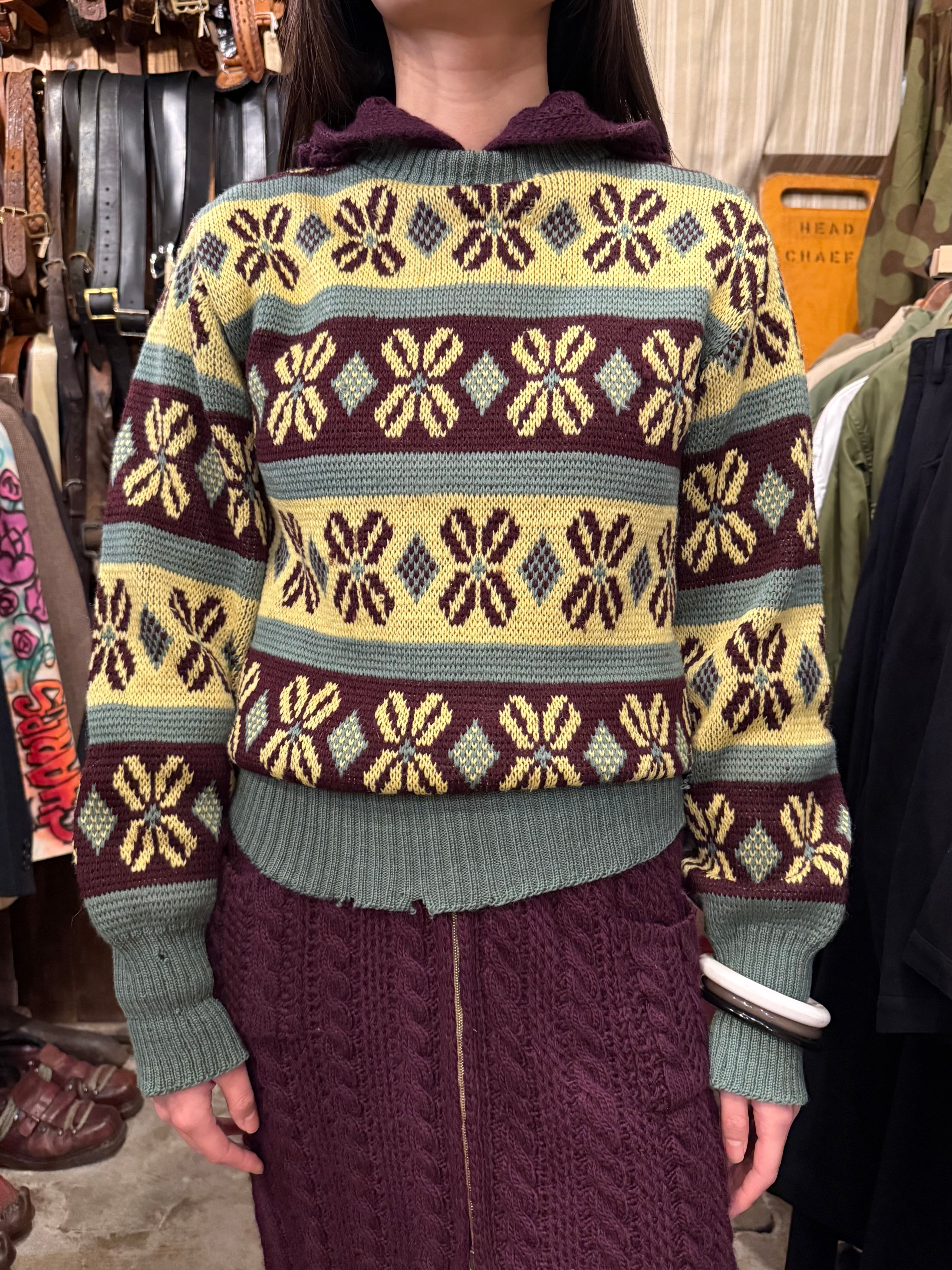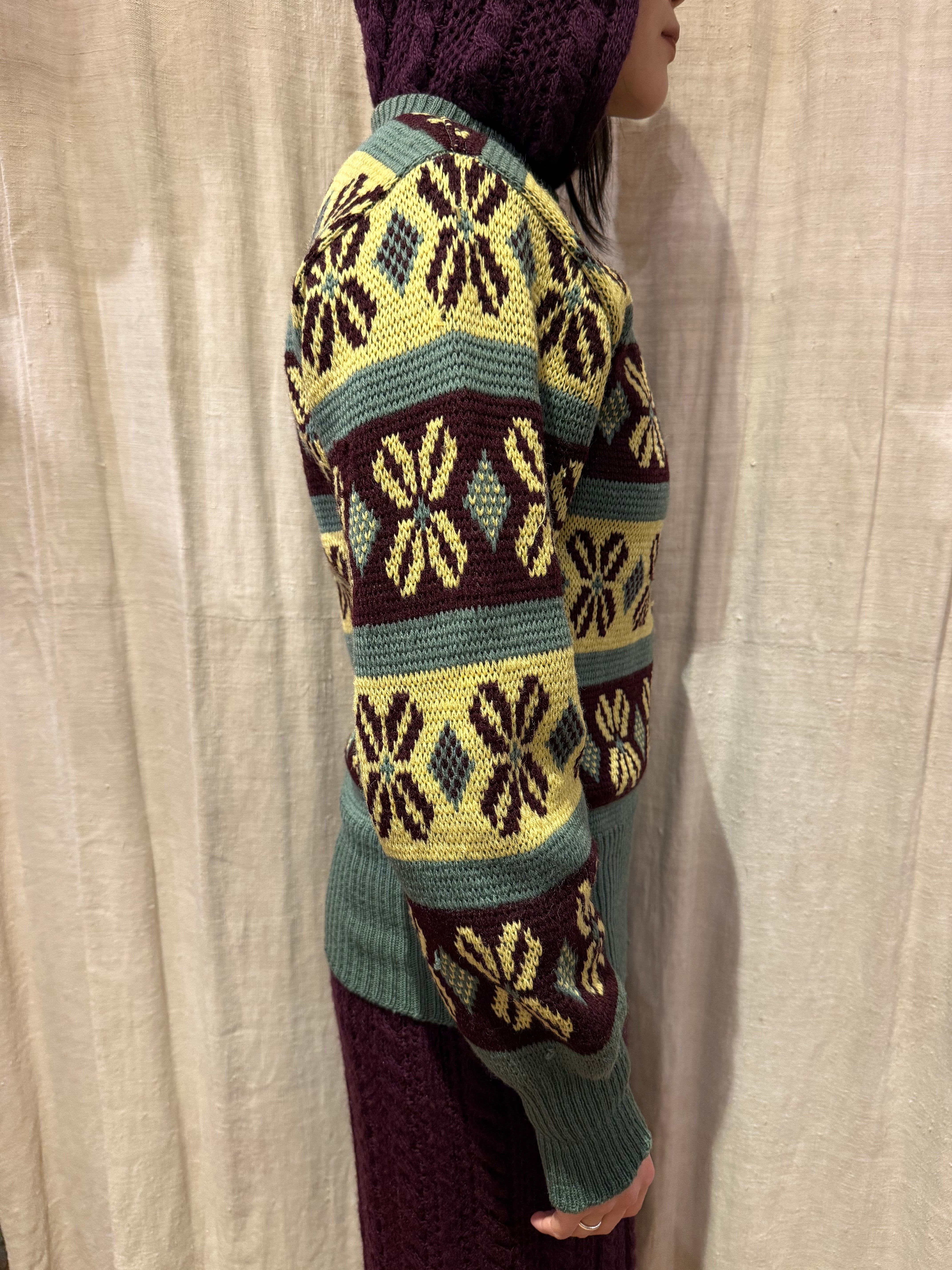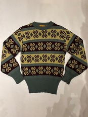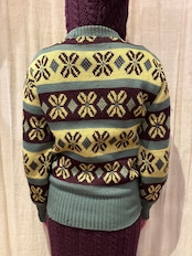 古いジャカード織りのセーターです。この年代のウールなのでチクチクしすぎない着心地で、リブの長さが堪らなく良いです。茶、黄、オリーブの珍しい配色なのも◎新しい物と合わせてコーディネートにギャップを生んでも面白そうです。