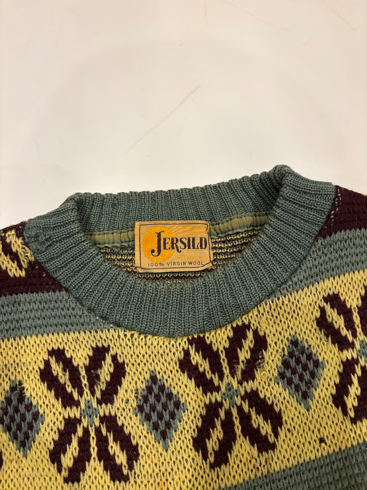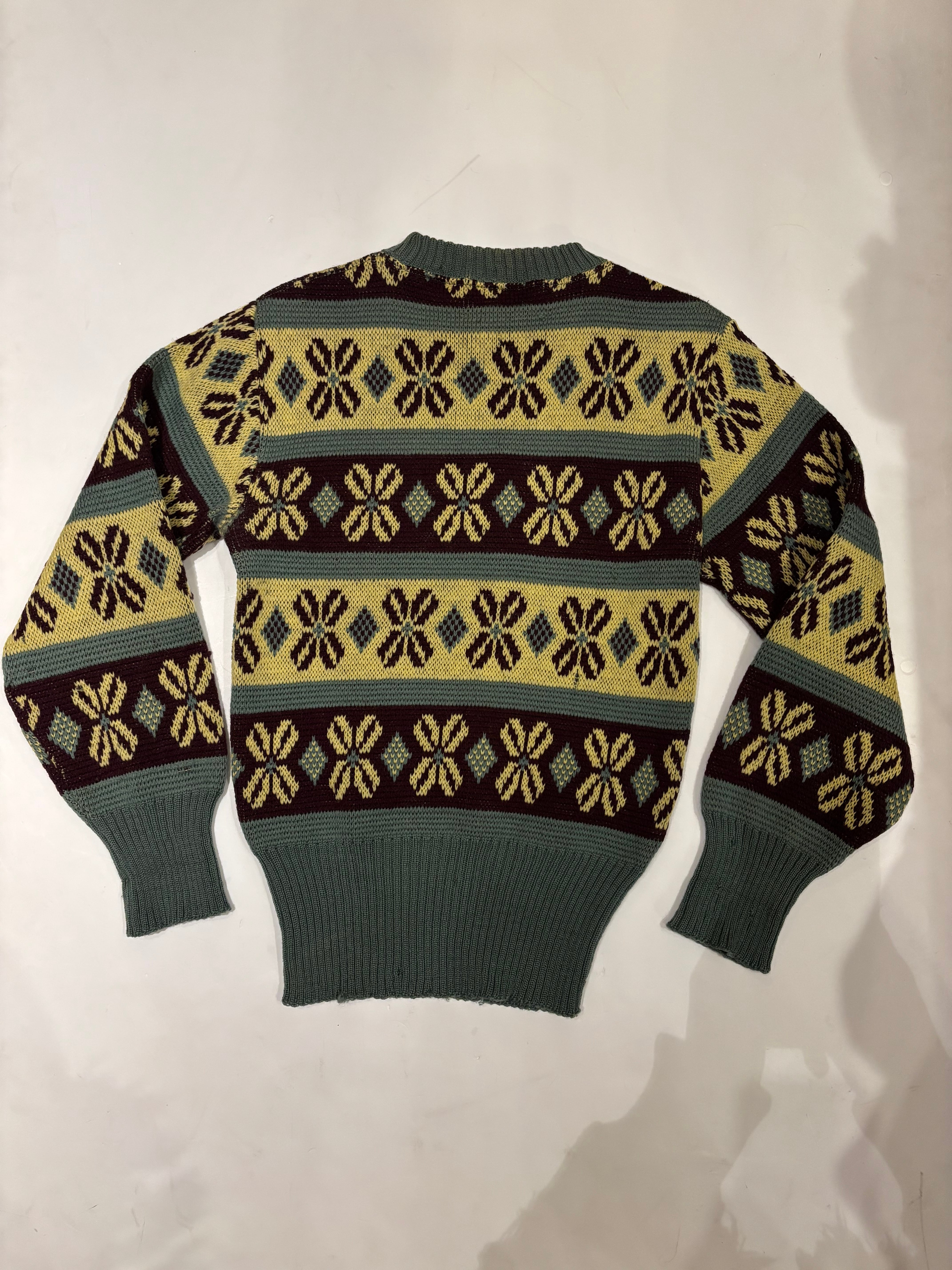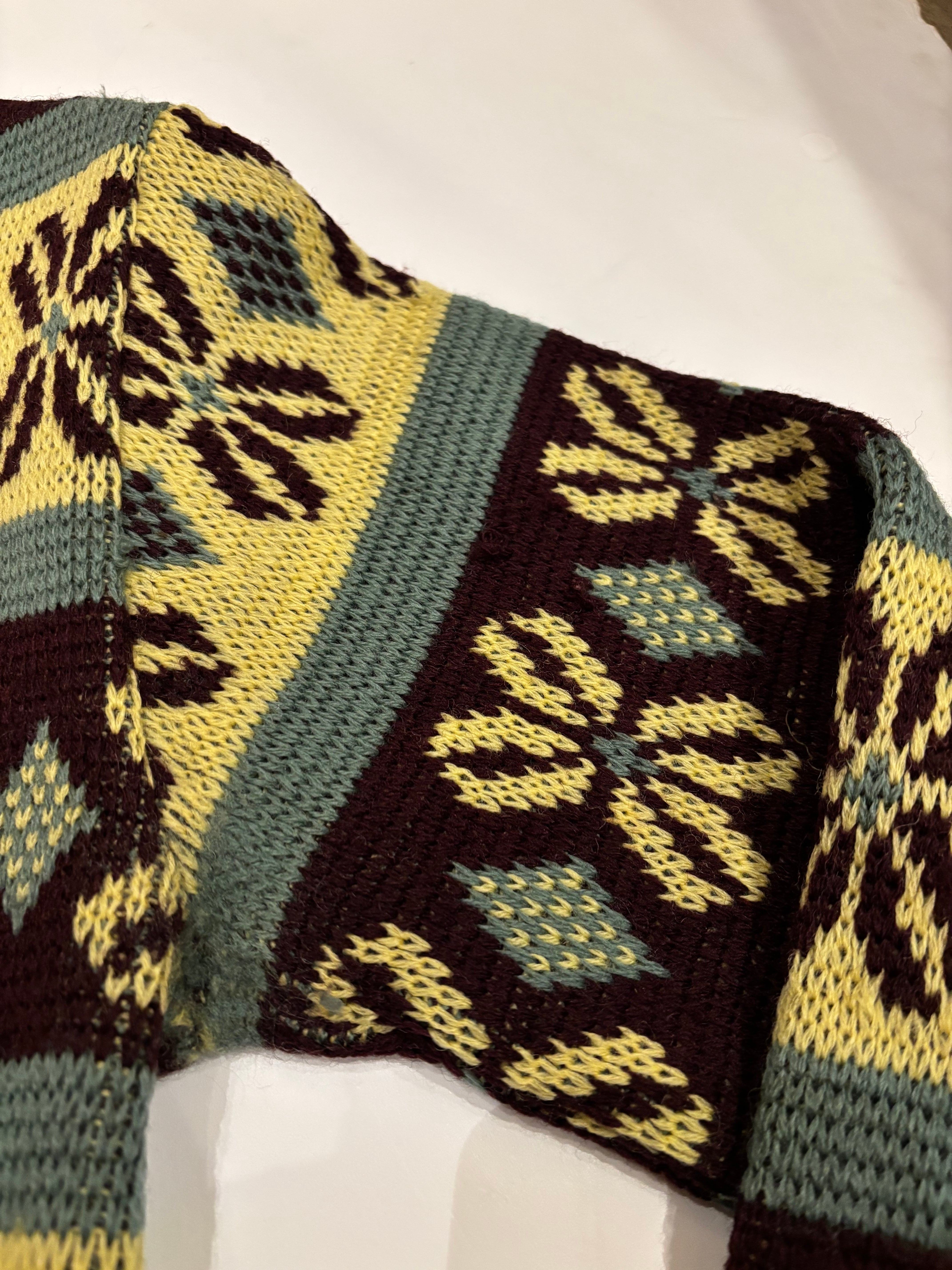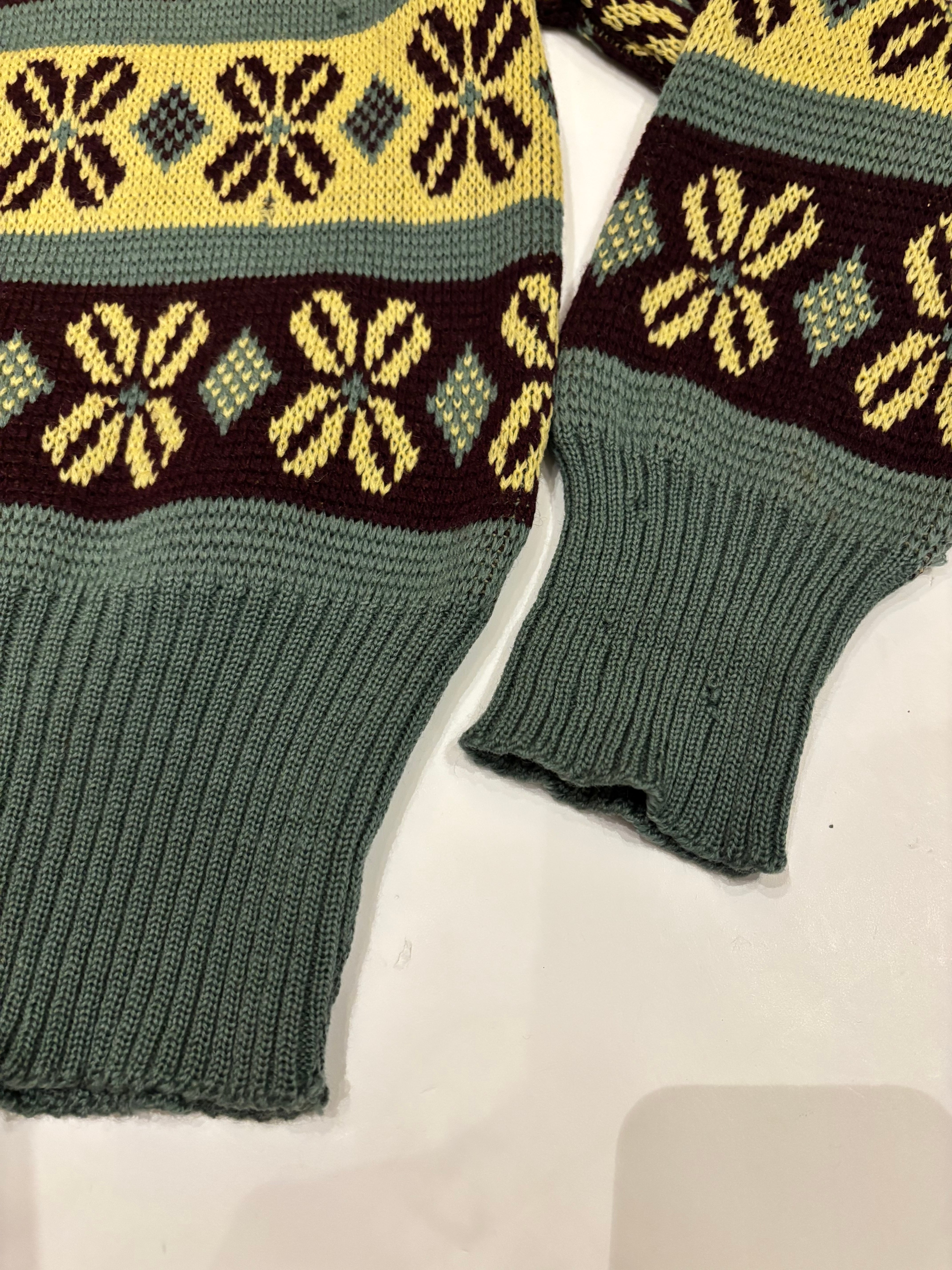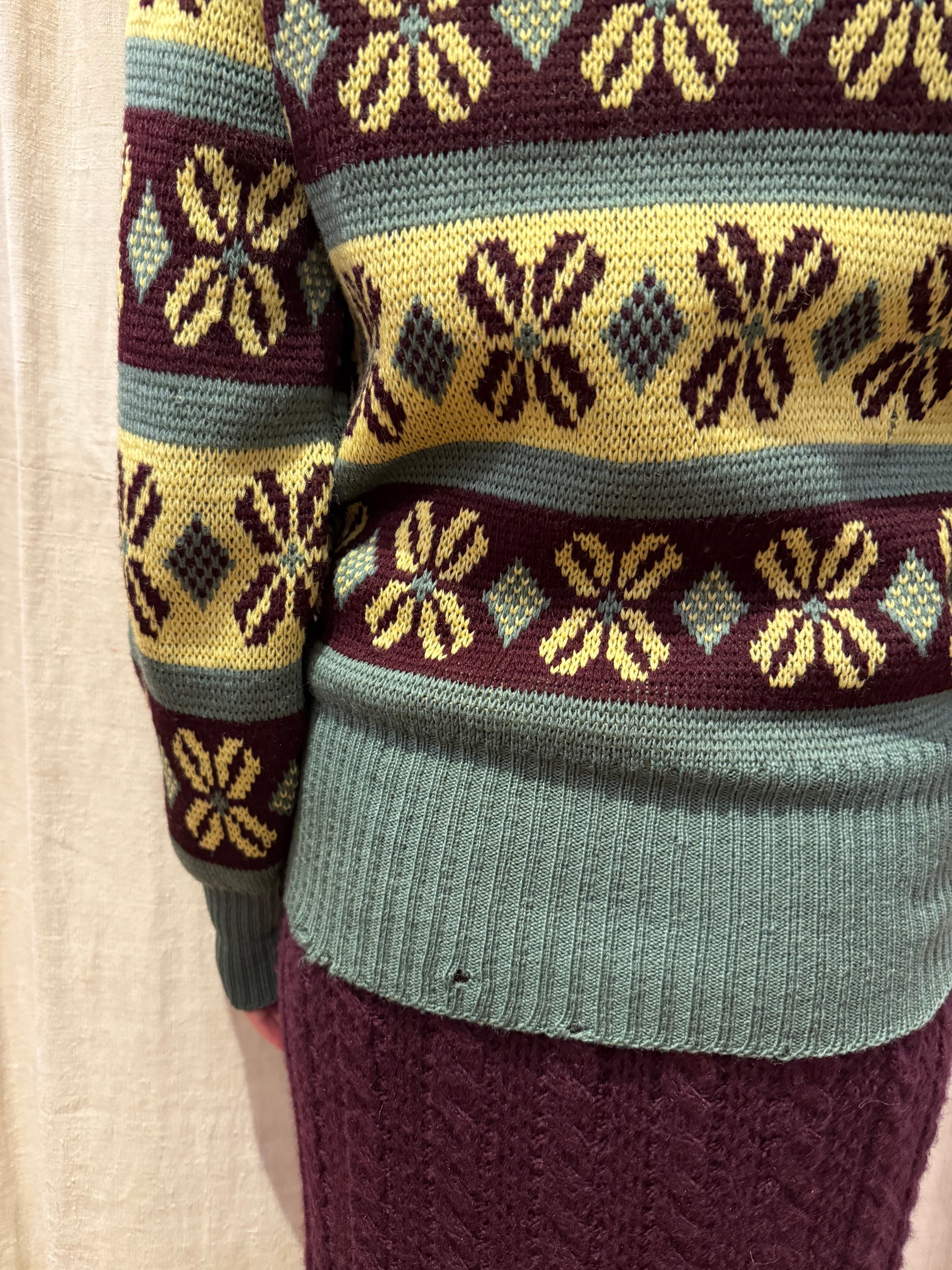 古いジャカード織りのセーターです。この年代のウールなのでチクチクしすぎない着心地で、リブの長さが堪らなく良いです。茶、黄、オリーブの珍しい配色なのも◎新しい物と合わせてコーディネートにギャップを生んでも面白そうです。