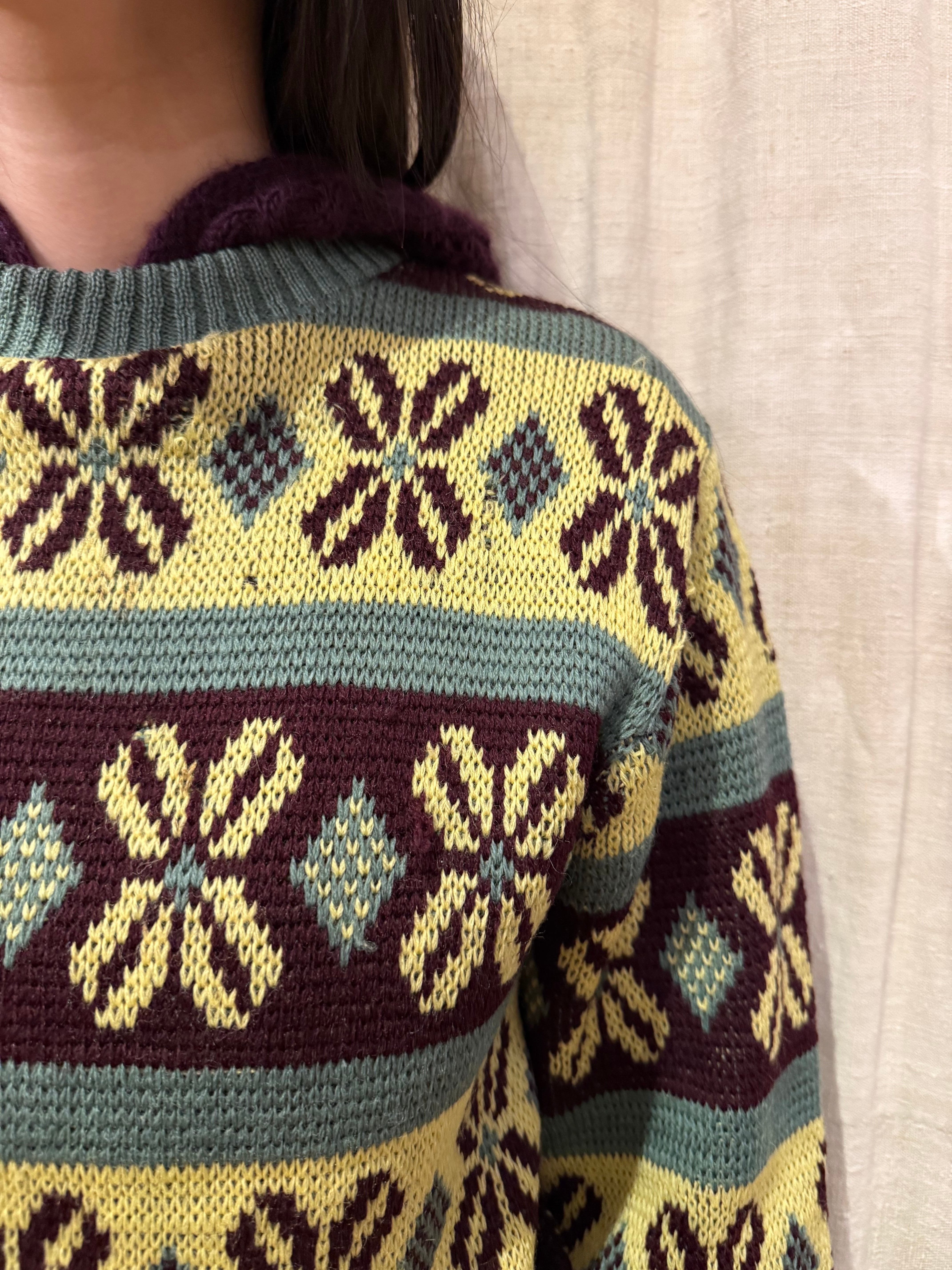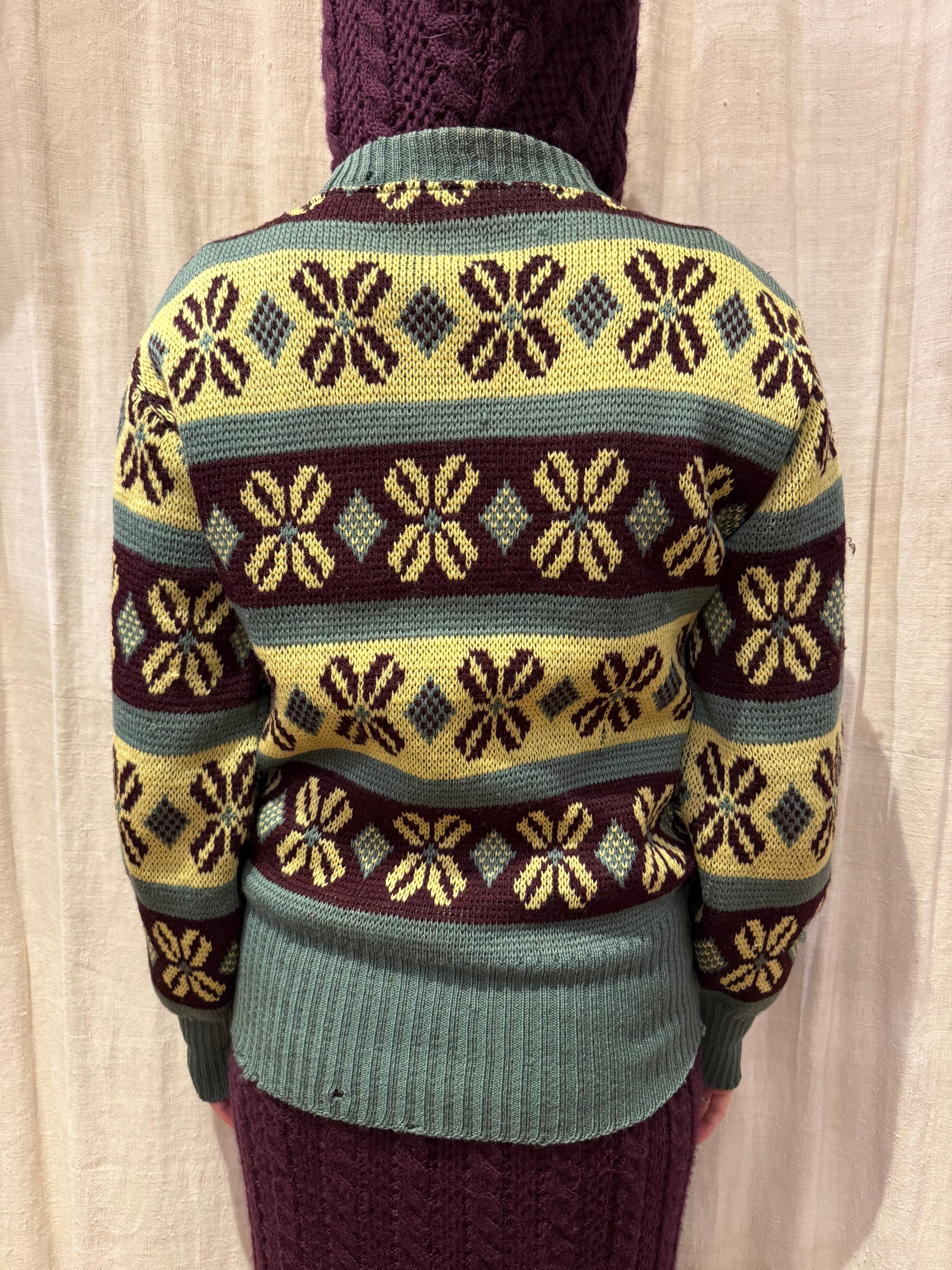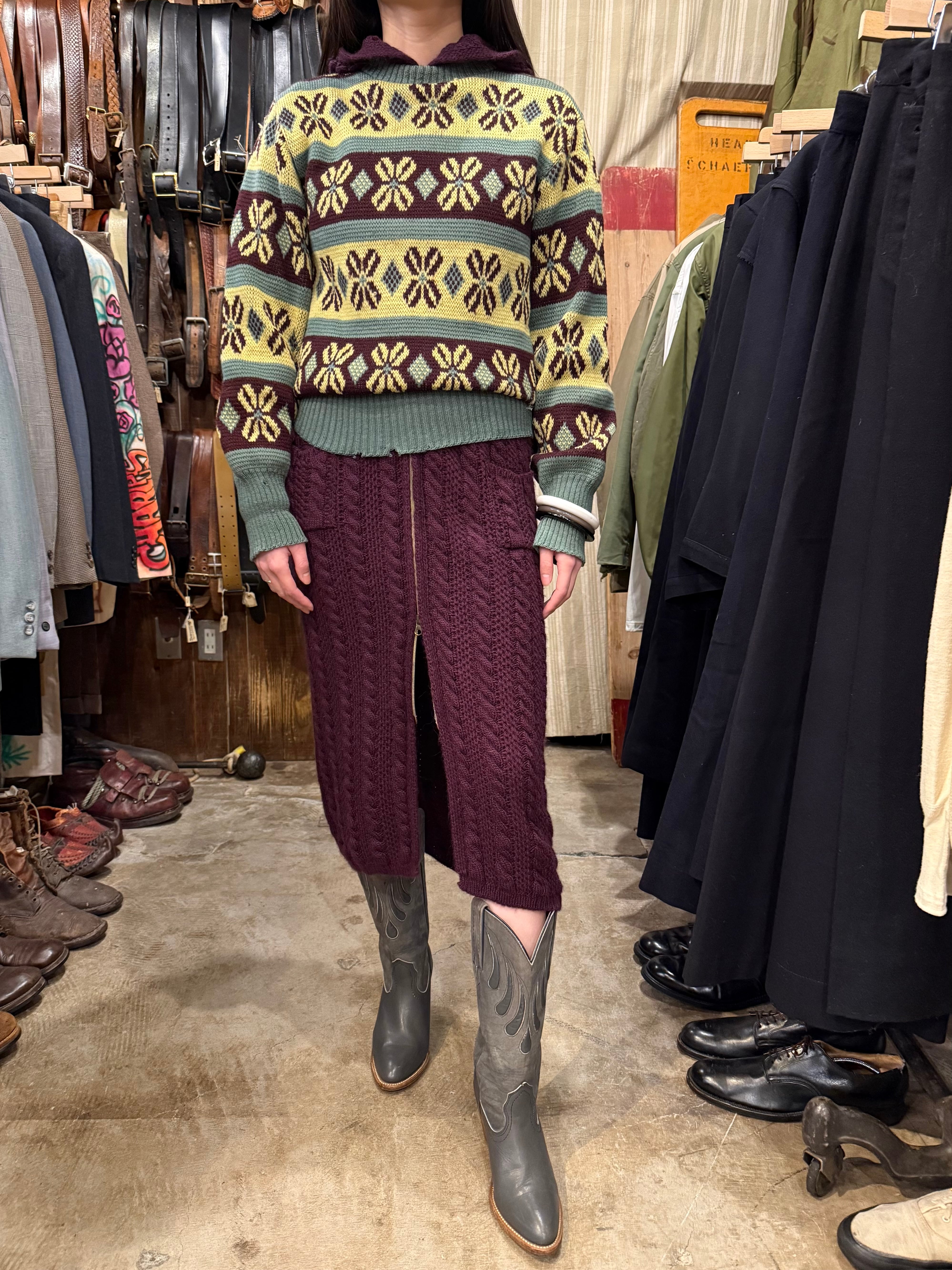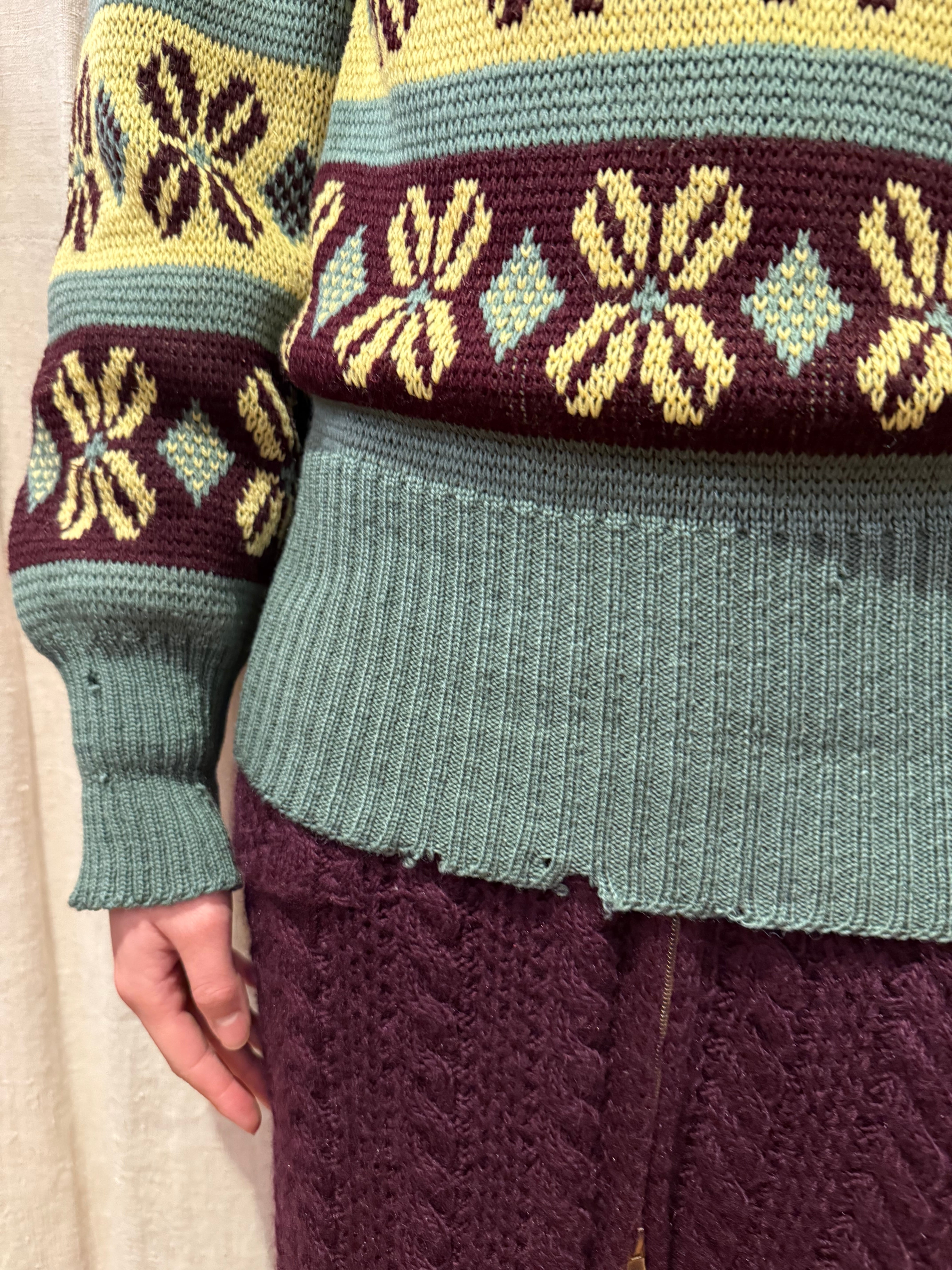 古いジャカード織りのセーターです。この年代のウールなのでチクチクしすぎない着心地で、リブの長さが堪らなく良いです。茶、黄、オリーブの珍しい配色なのも◎新しい物と合わせてコーディネートにギャップを生んでも面白そうです。