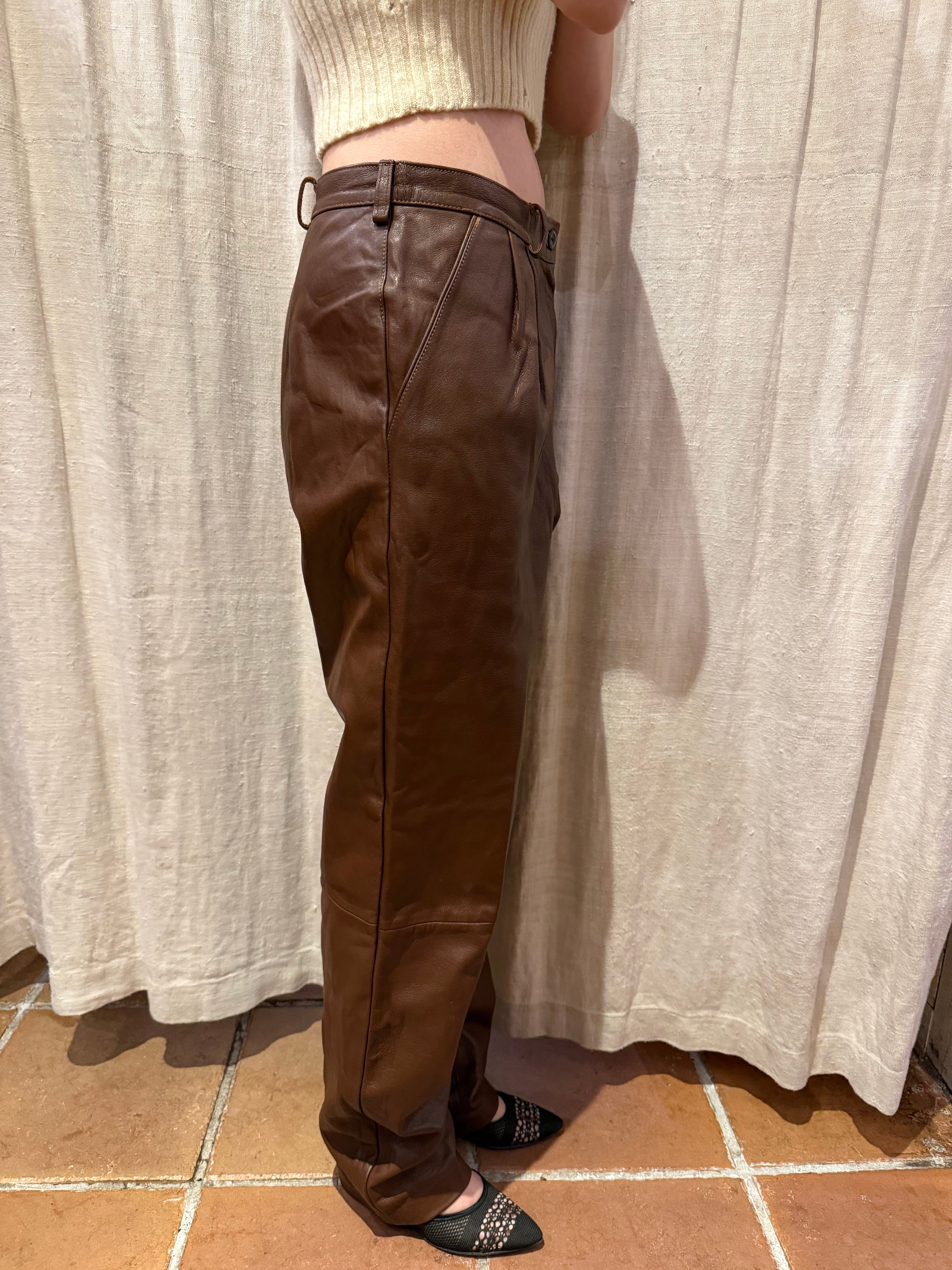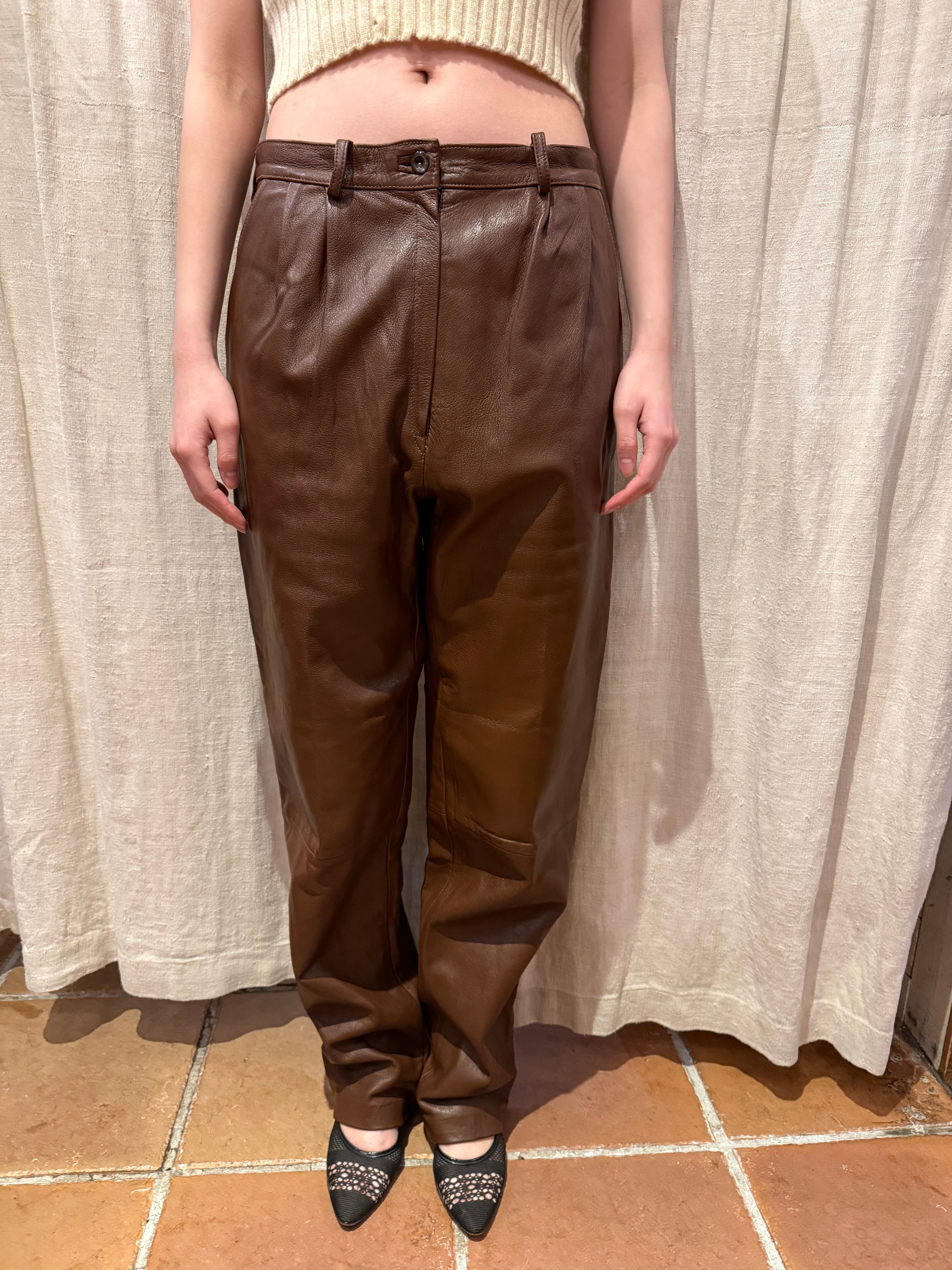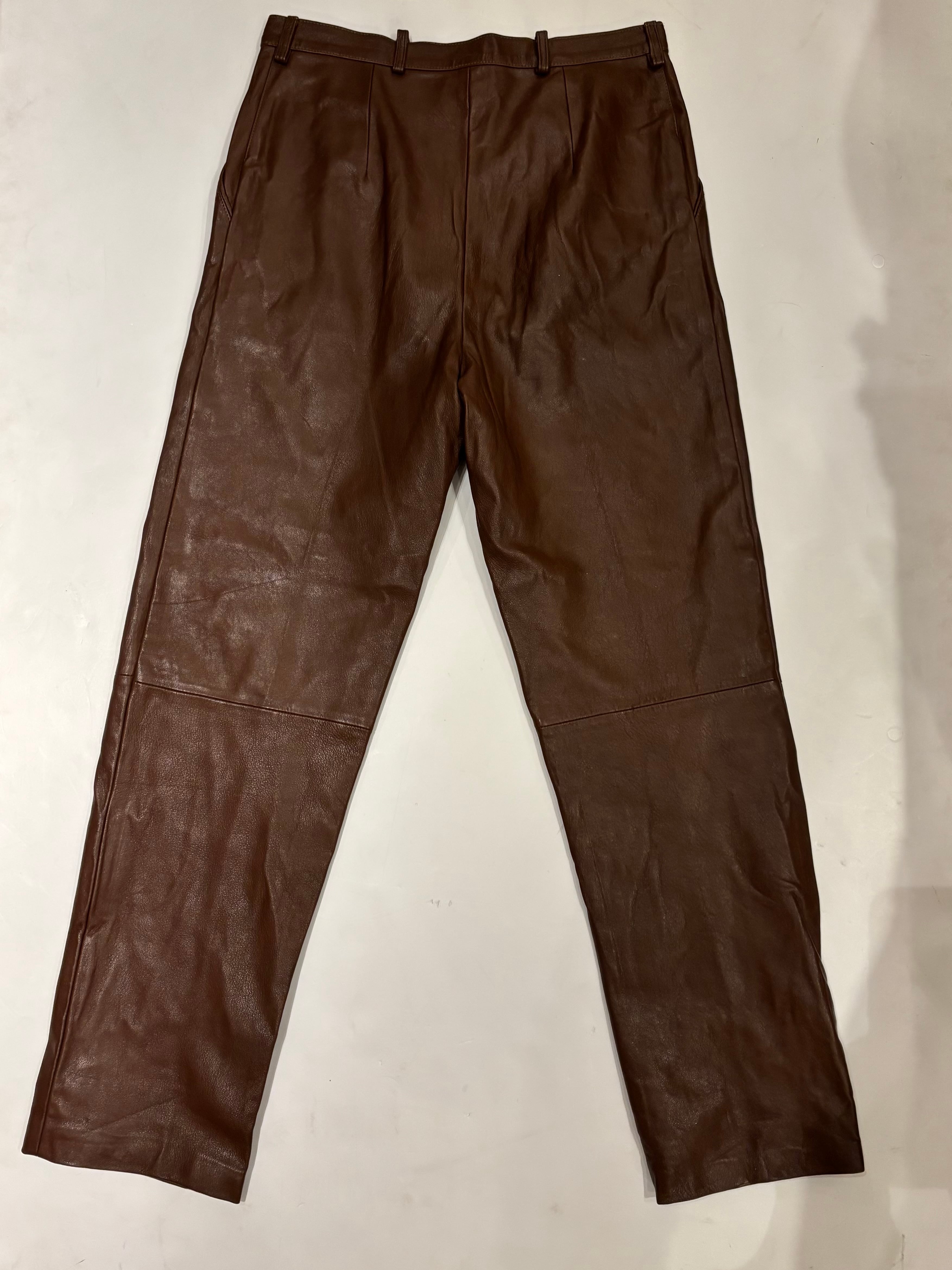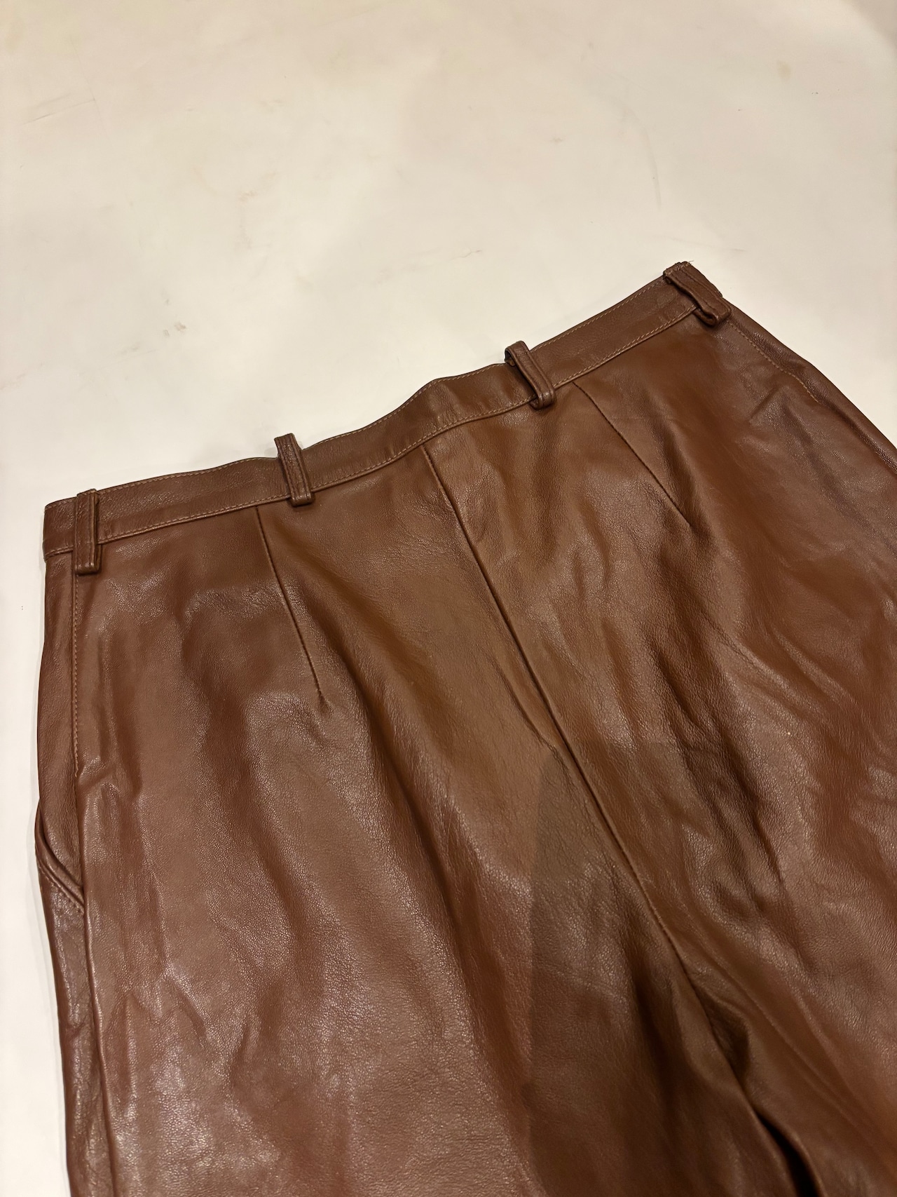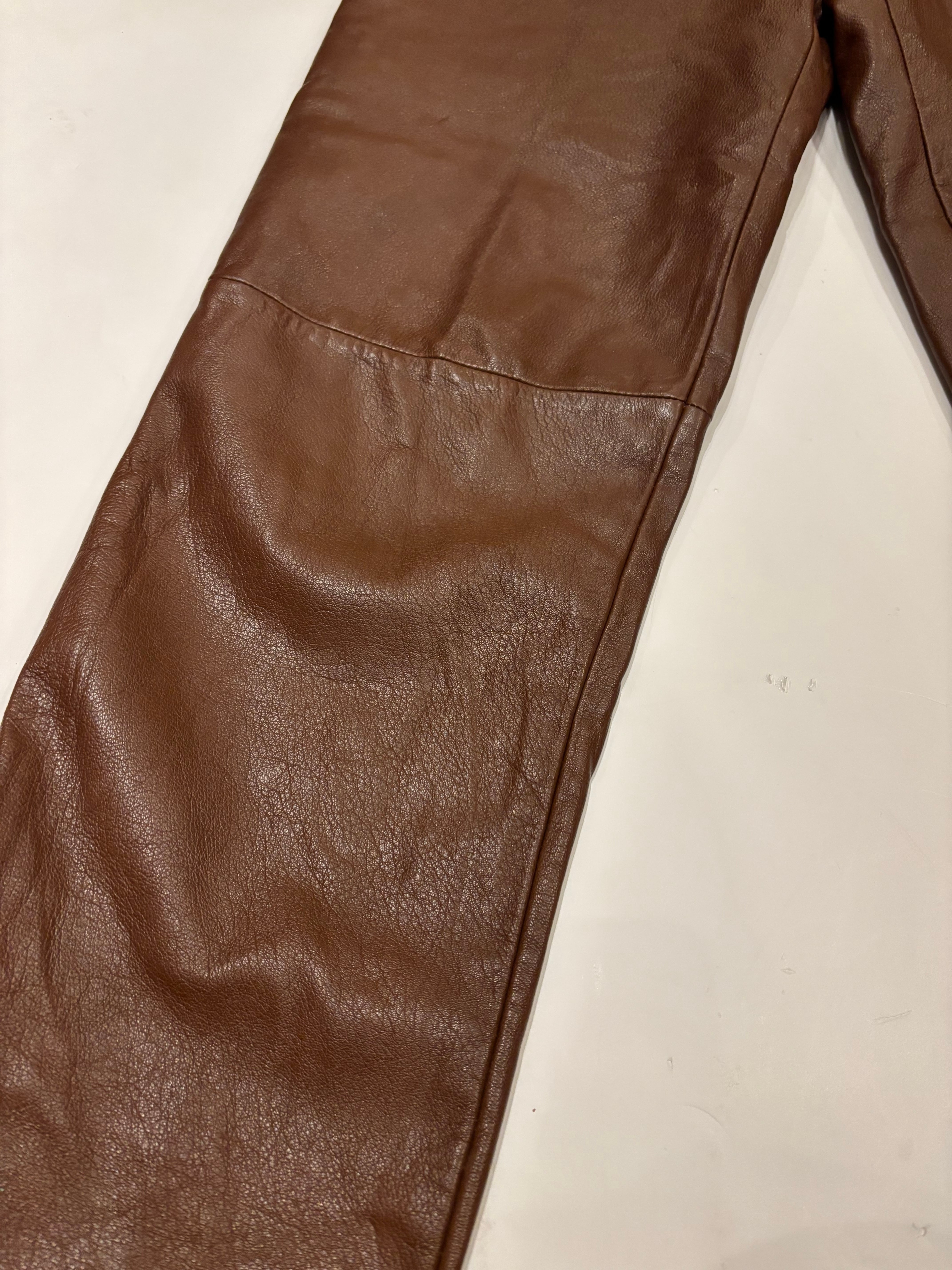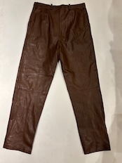 ブラウンのレザーパンツです。ウエストにツータック入っているのでシルエットも良く、膝部分には切り返しが入っていらデザインです。ブラックのレザーパンツでは強すぎてしまうイメージですが、ブラウンだと女性らしい上品な雰囲気を演出する事が出来るのでおすすめです。