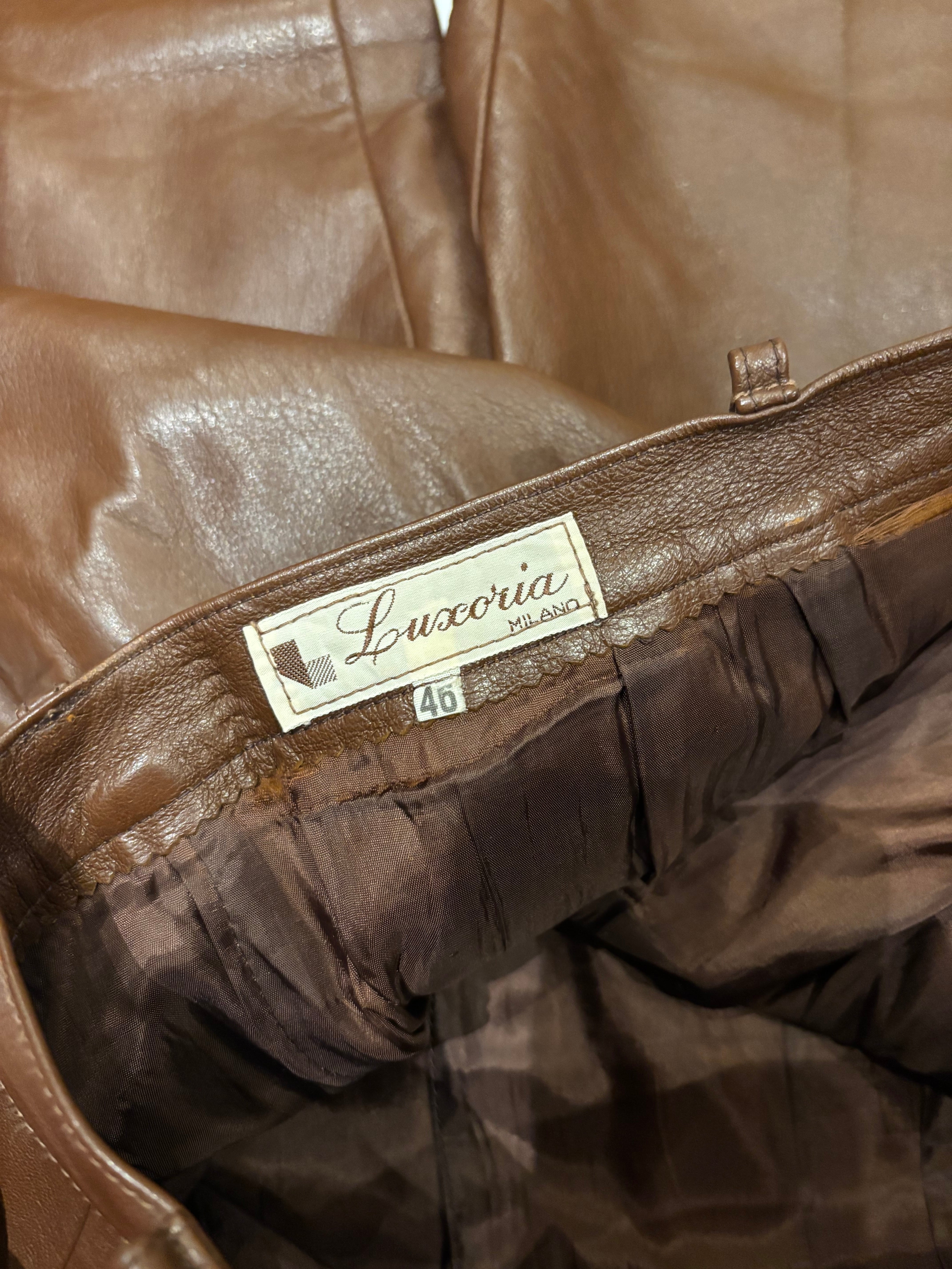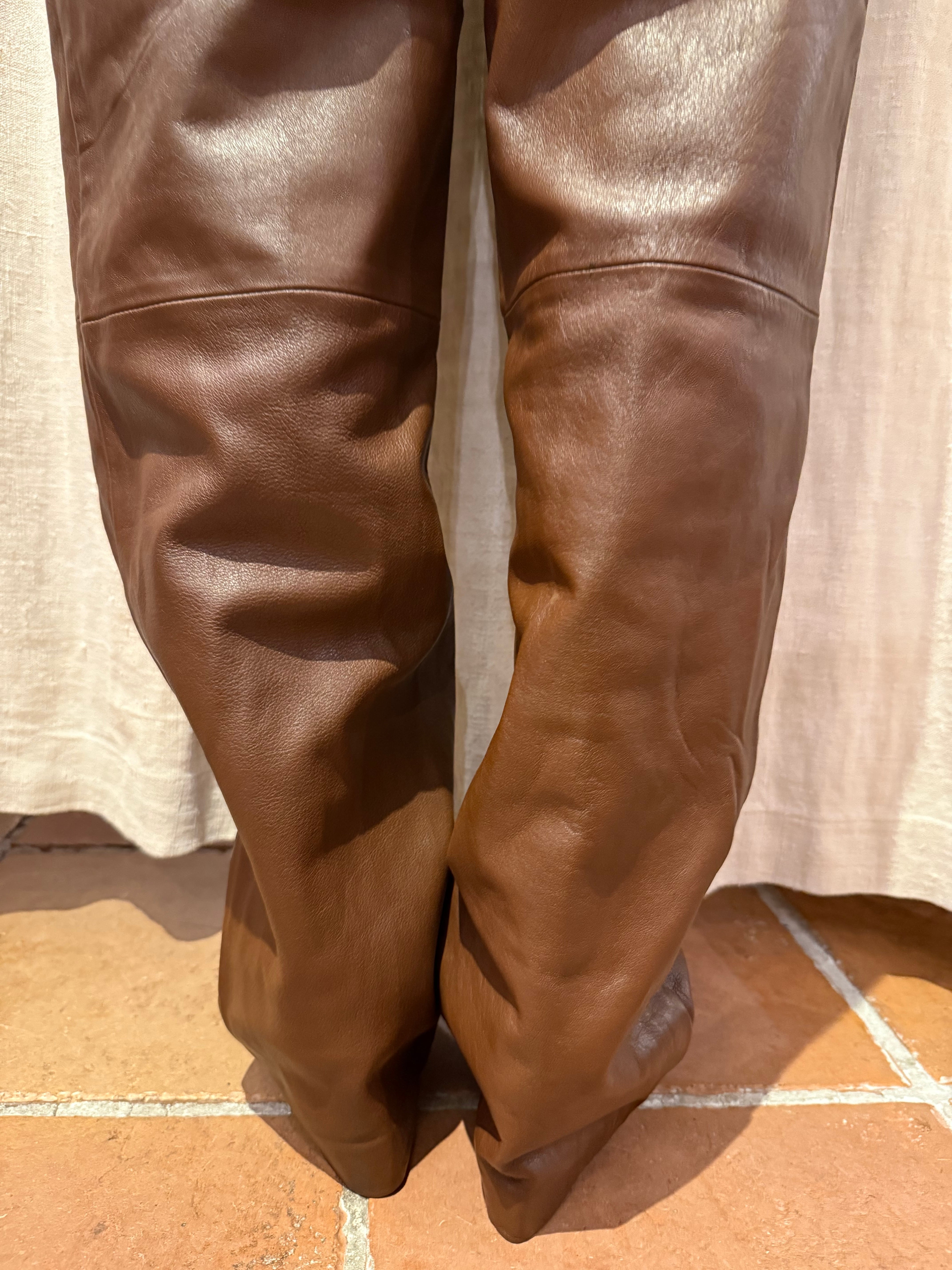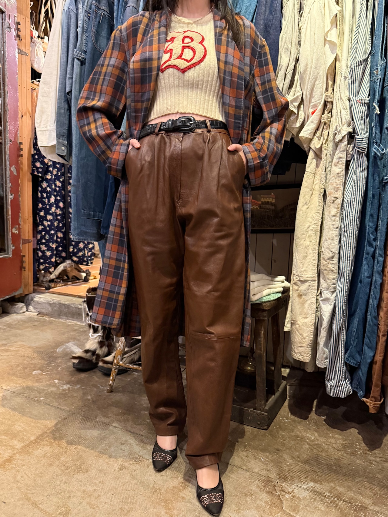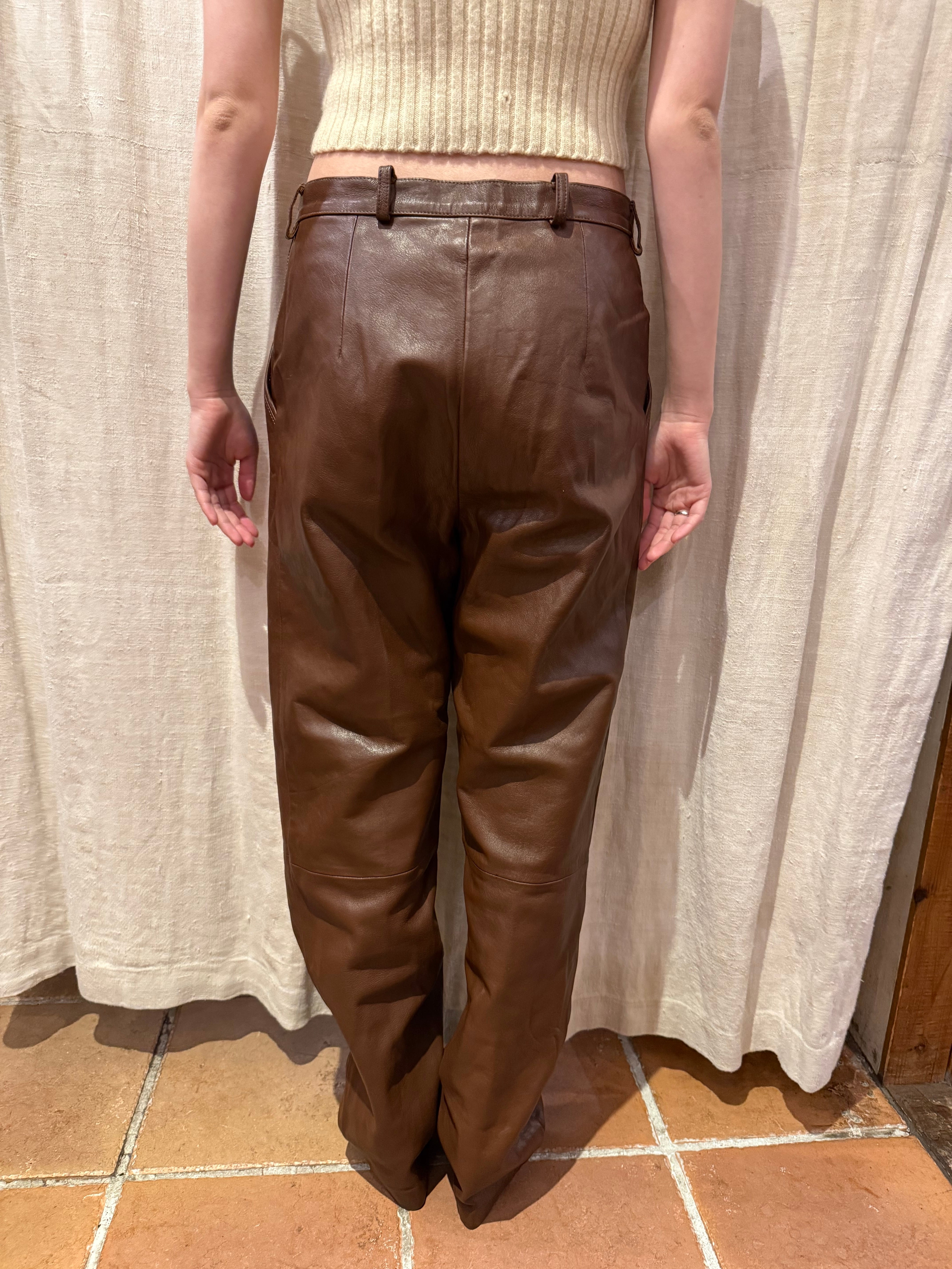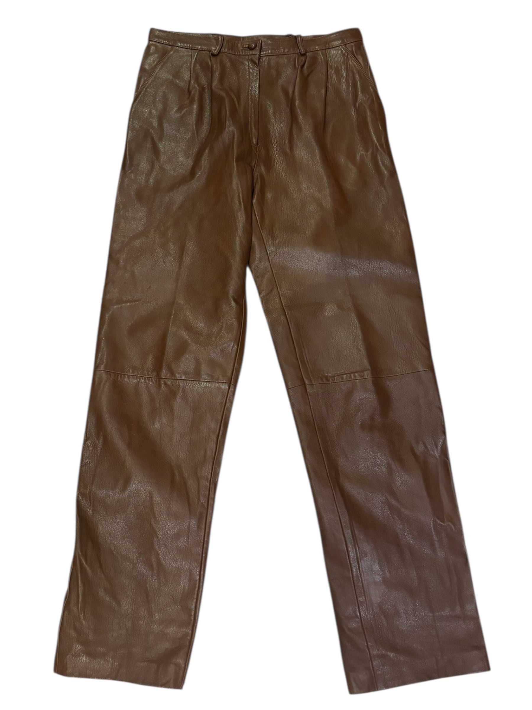ブラウンのレザーパンツです。ウエストにツータック入っているのでシルエットも良く、膝部分には切り返しが入っていらデザインです。ブラックのレザーパンツでは強すぎてしまうイメージですが、ブラウンだと女性らしい上品な雰囲気を演出する事が出来るのでおすすめです。
