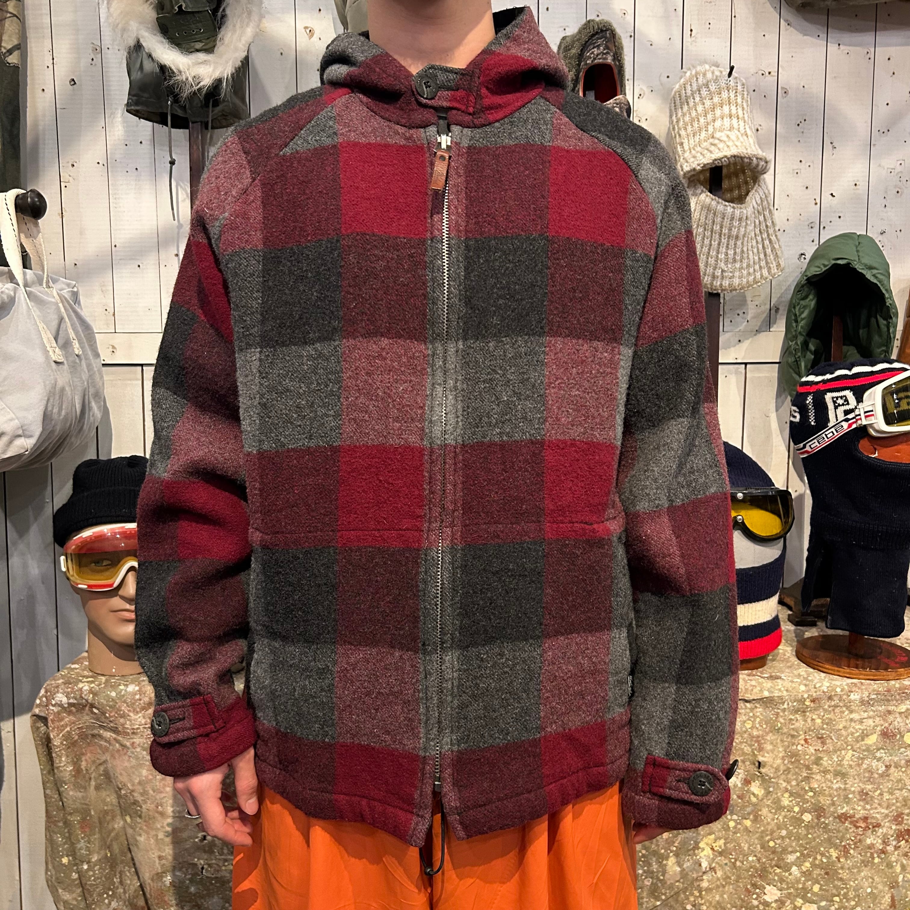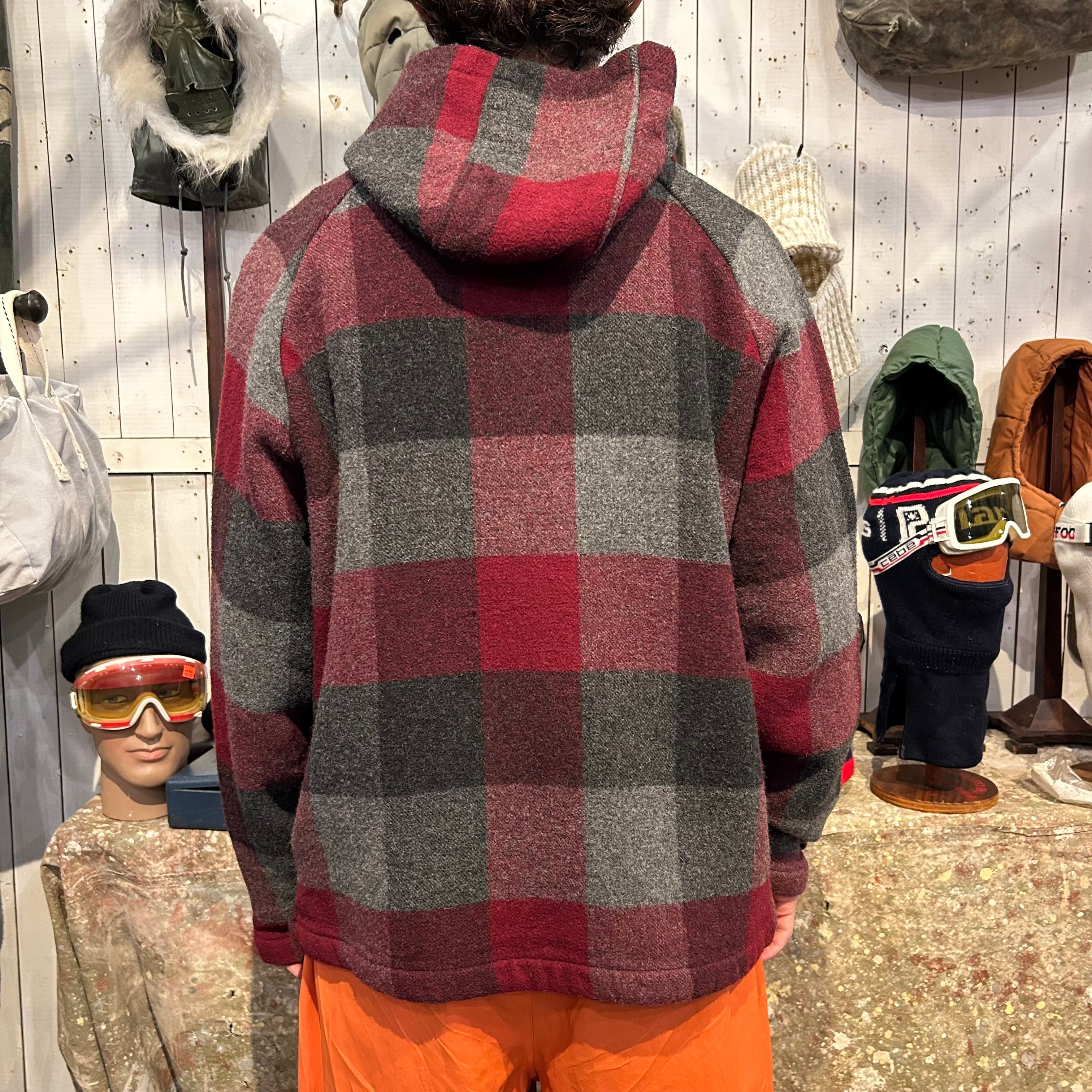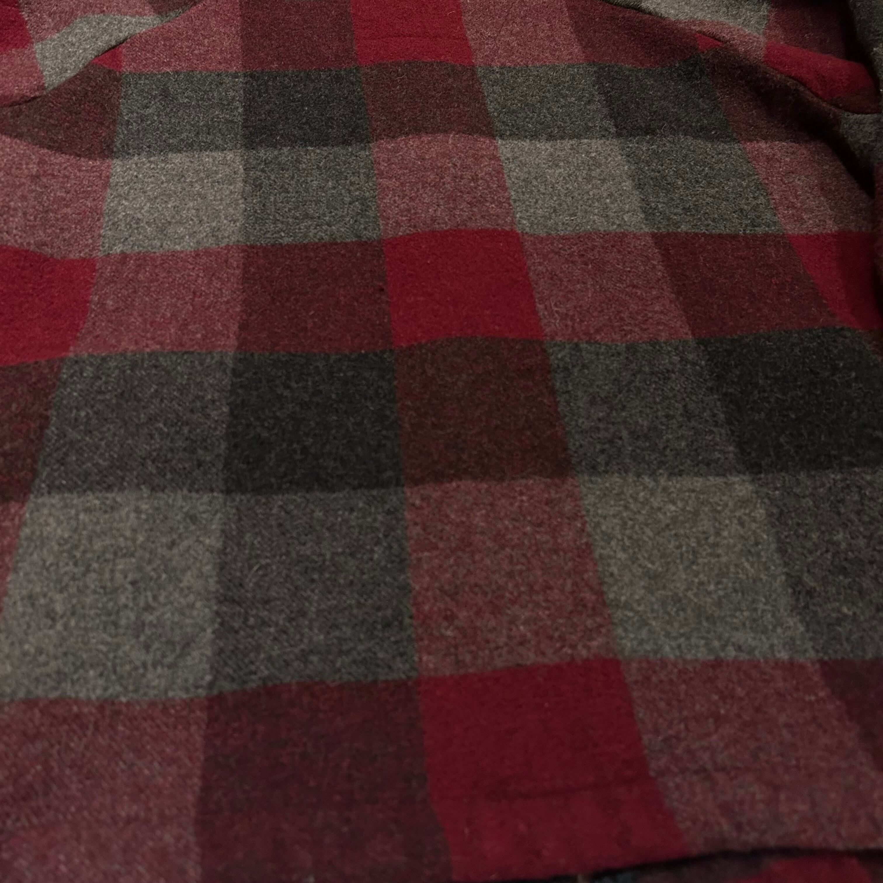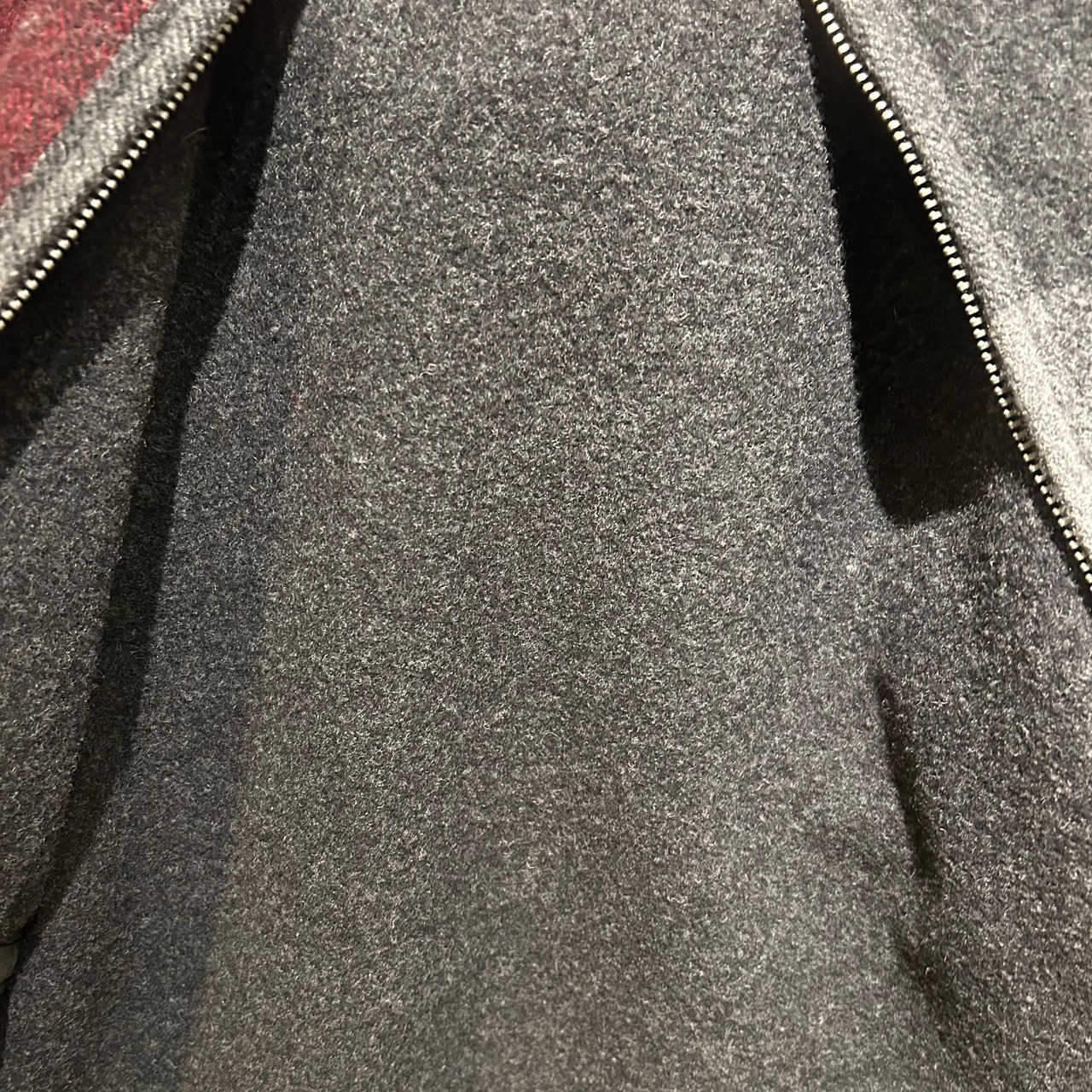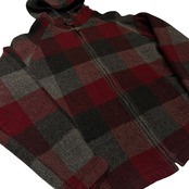 赤、グレー、灰色が混ざっているチェックです。ウールですが、柔らかい肌触りの素材です。フードも大きいですし、チンストラップも付属してありますので、気分で変えてもよろしいかと。