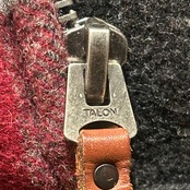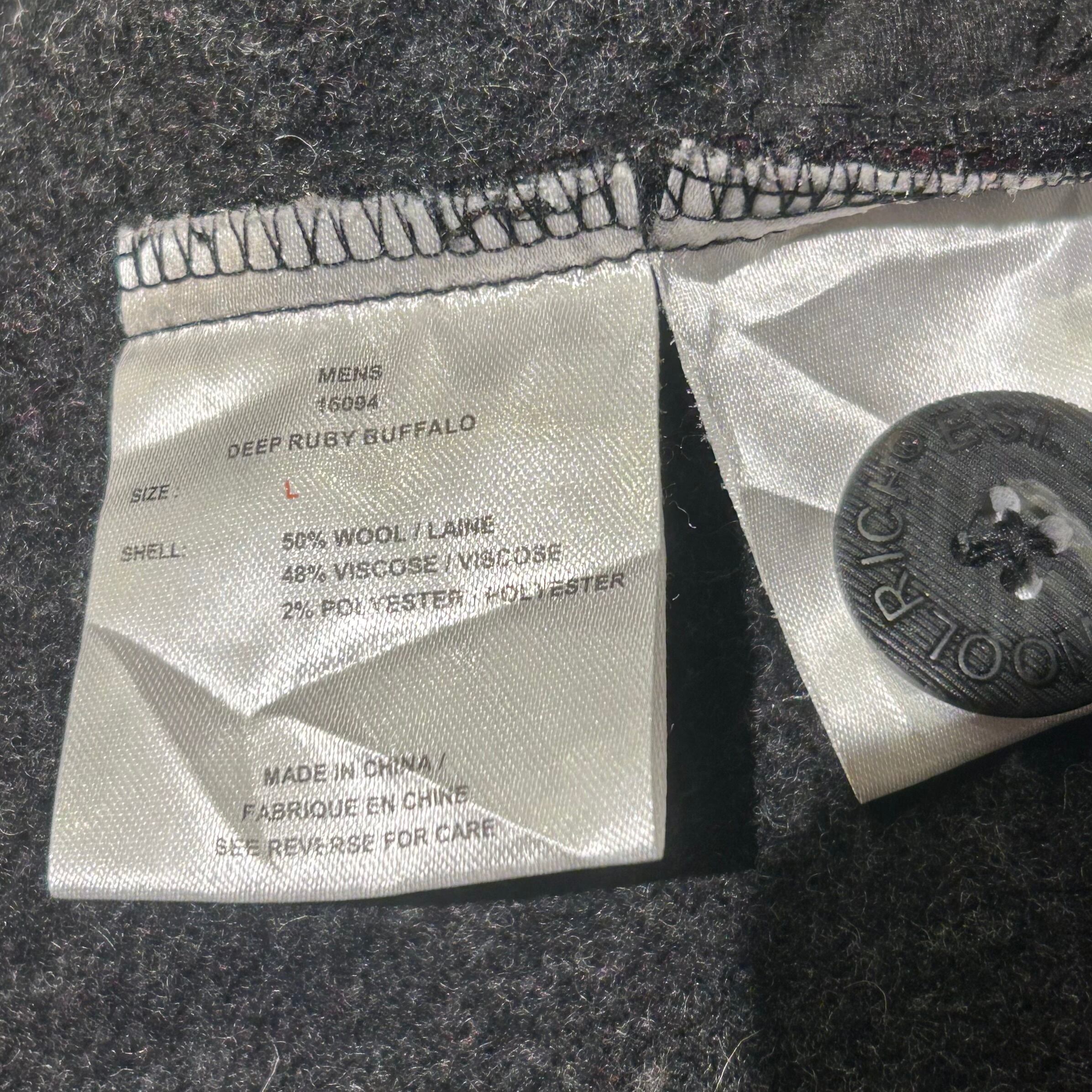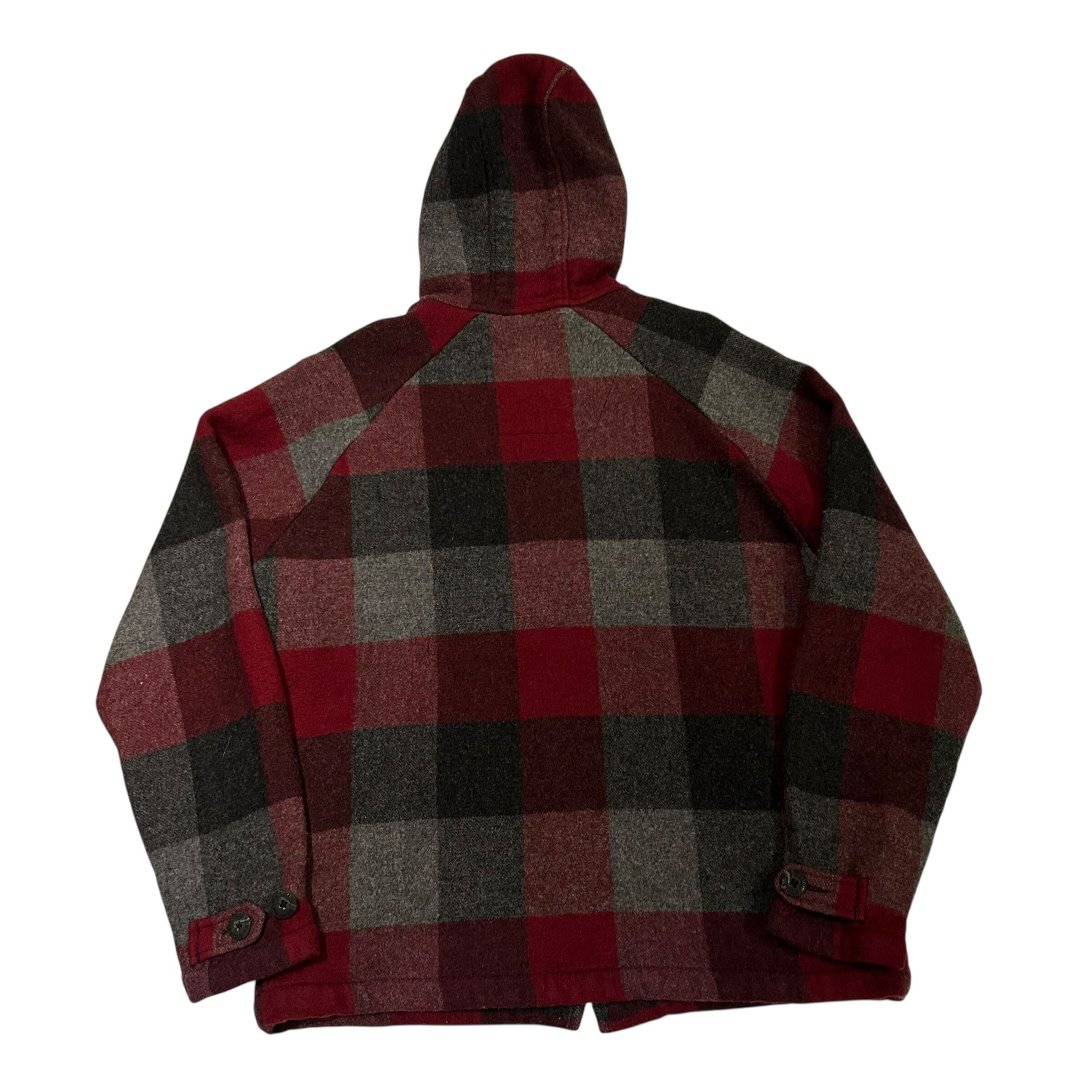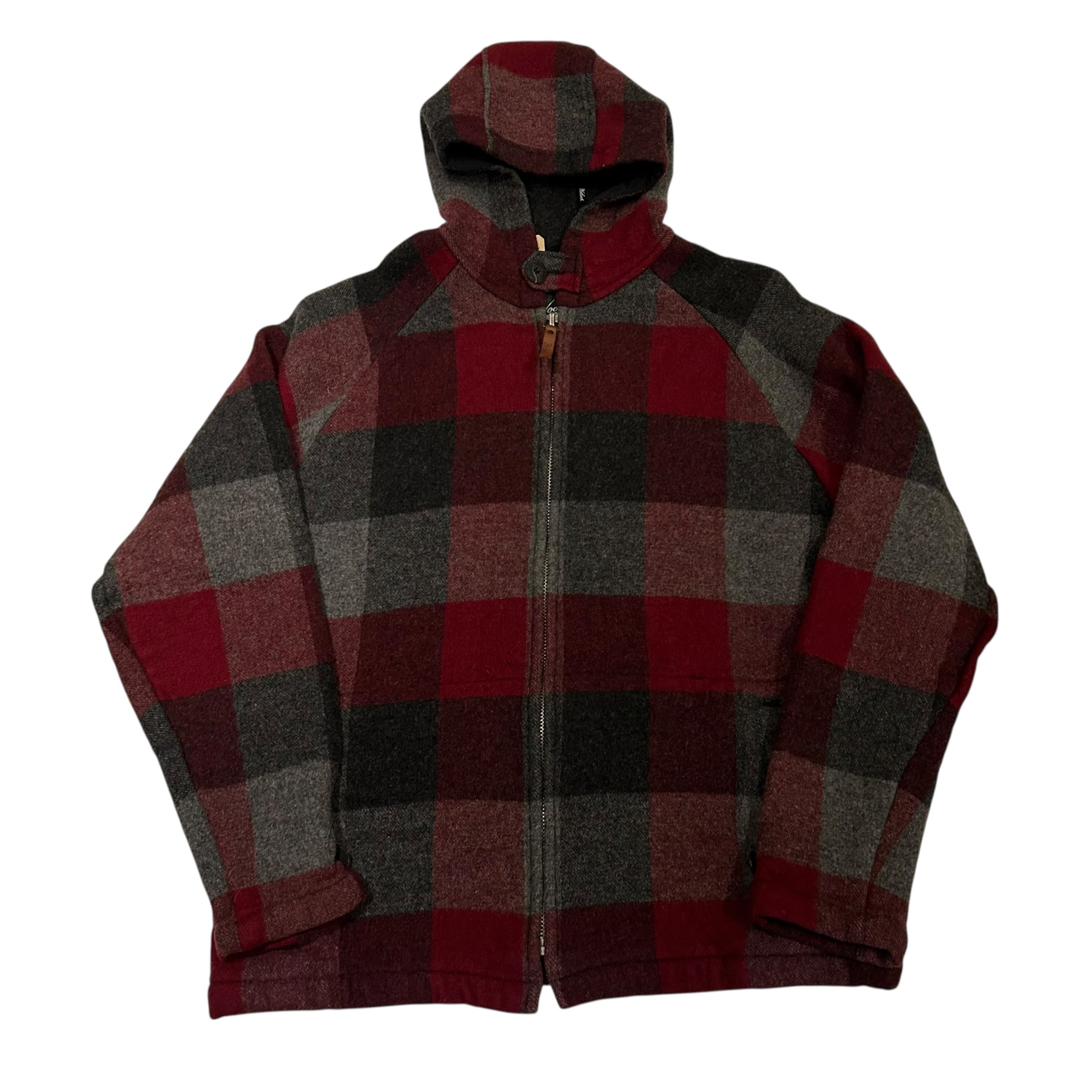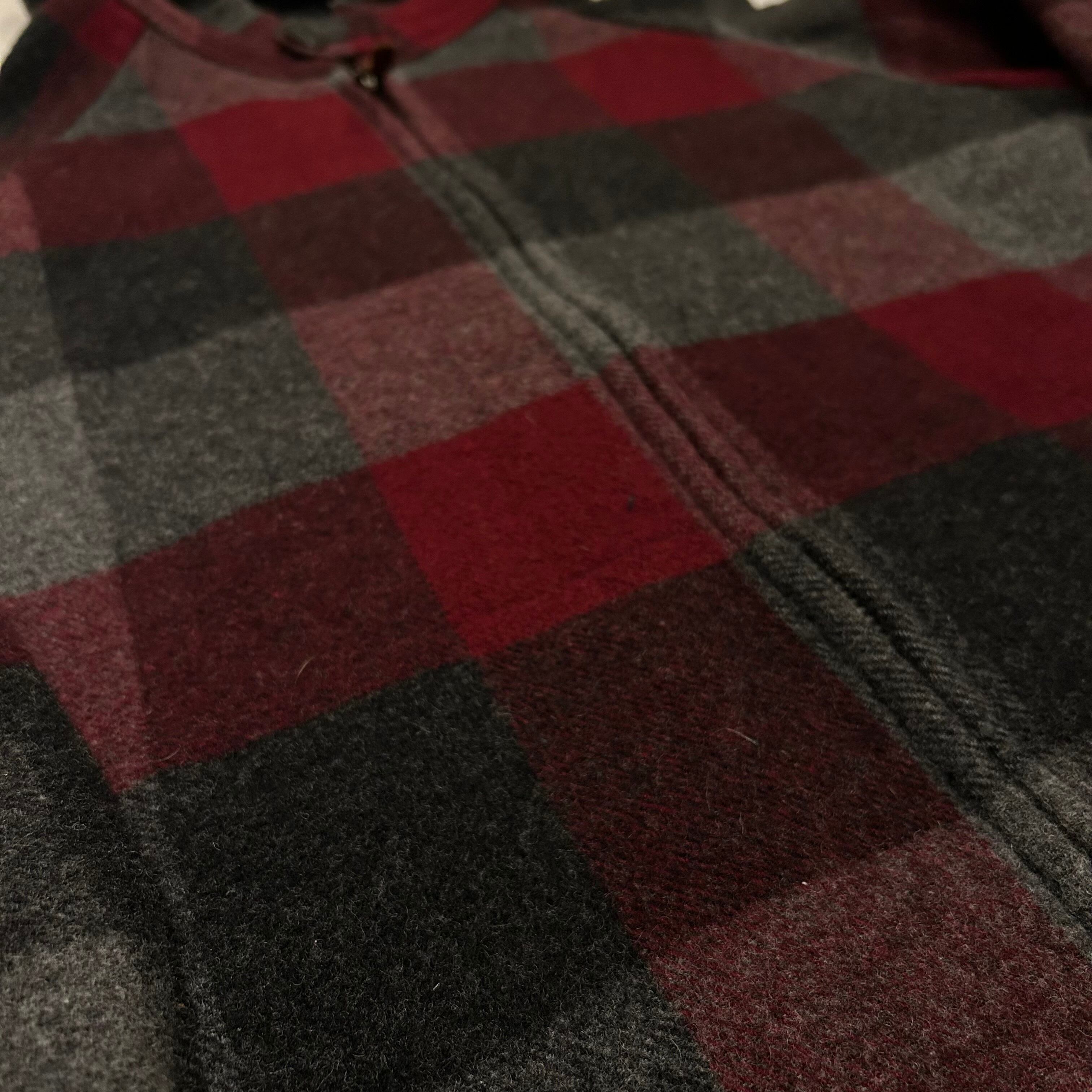 赤、グレー、灰色が混ざっているチェックです。ウールですが、柔らかい肌触りの素材です。フードも大きいですし、チンストラップも付属してありますので、気分で変えてもよろしいかと。