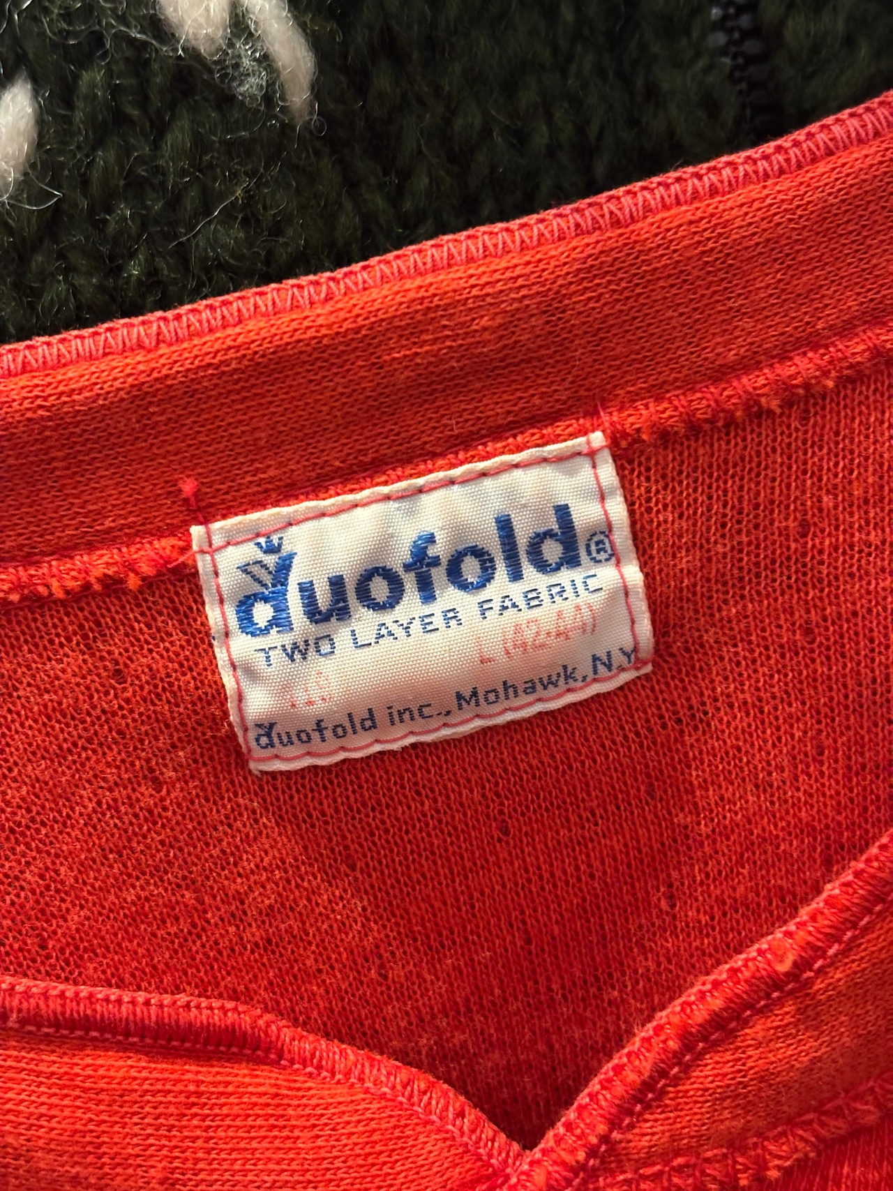 duofoldのオールインワンです。アンダーウェアの中でも一段と暖かく、肌触りも良い作りでお好きな方も多いはず。アイボリーや白が多く、赤はコーディネートのアクセントにもなるのでおすすめです。ヒップの部分はボタンとスナップボタンで2箇所とめることが可能となります。