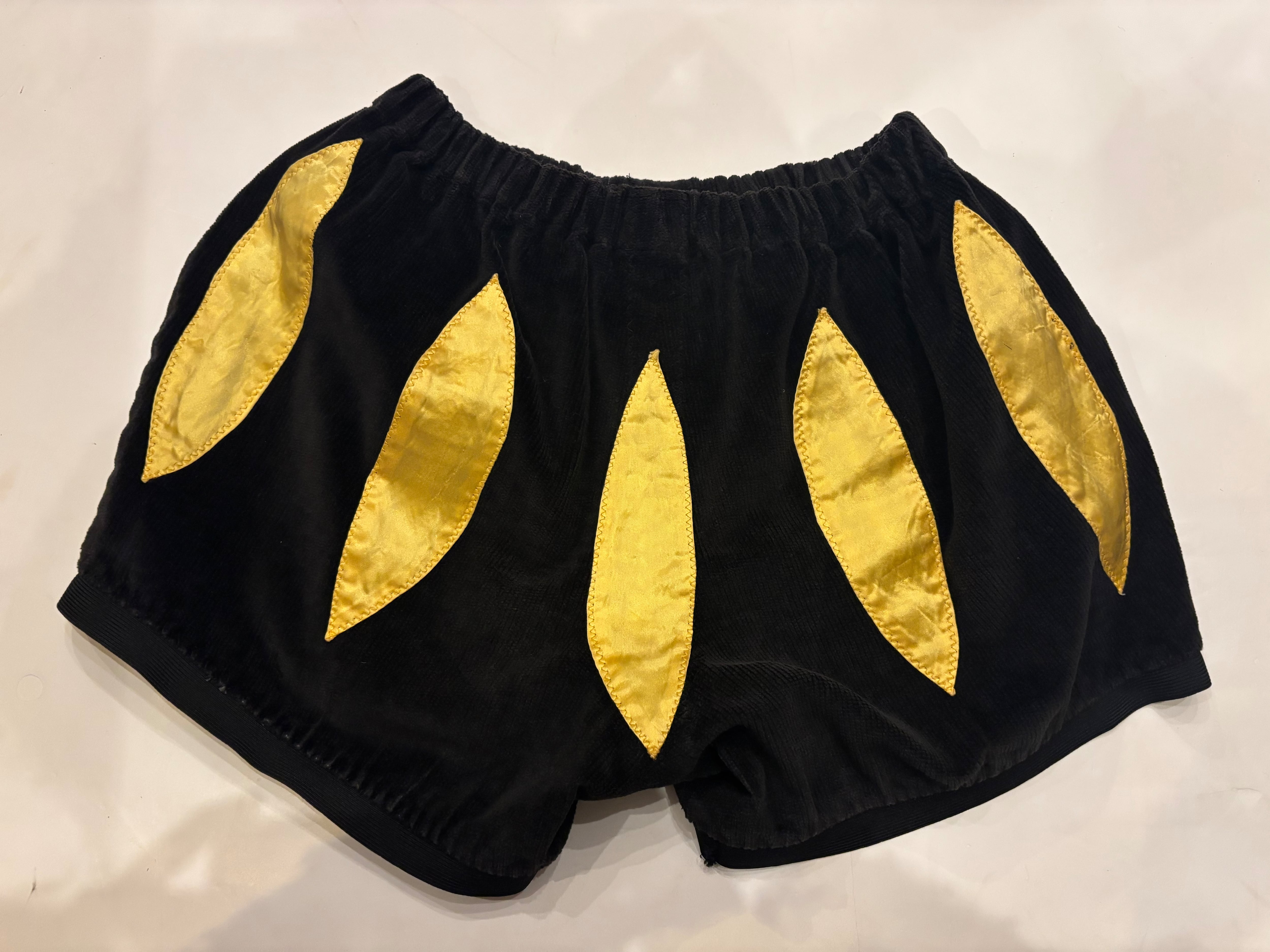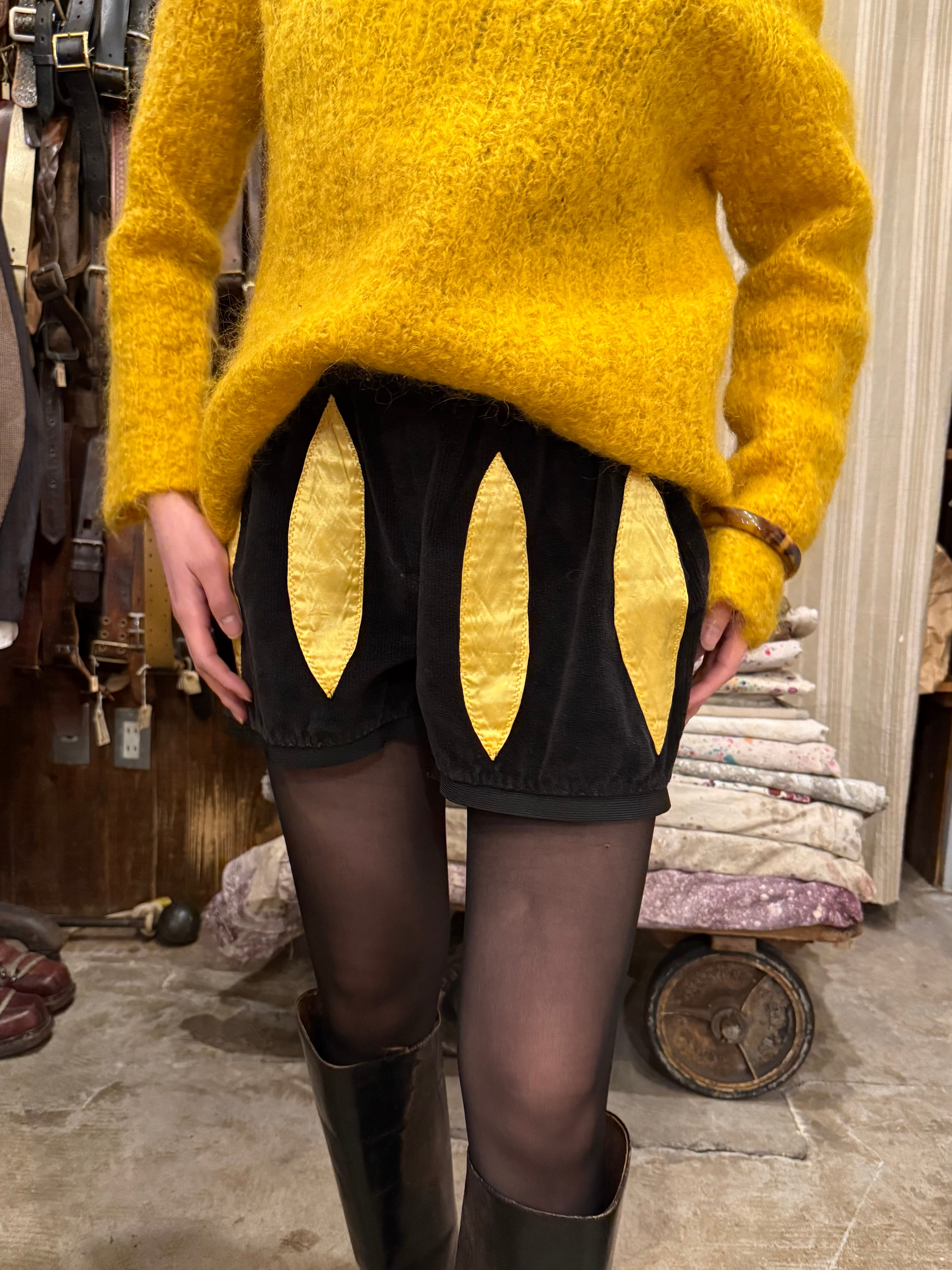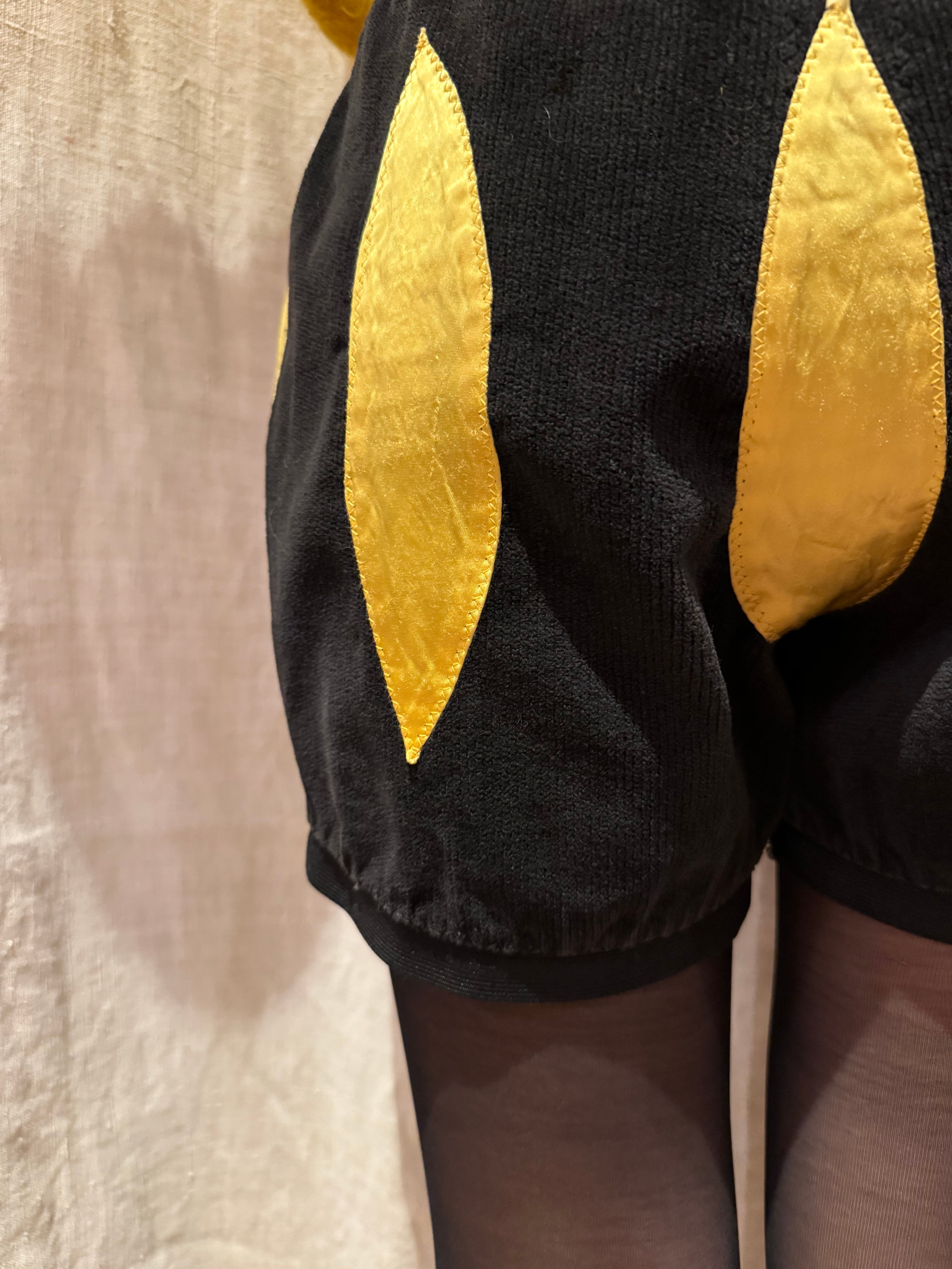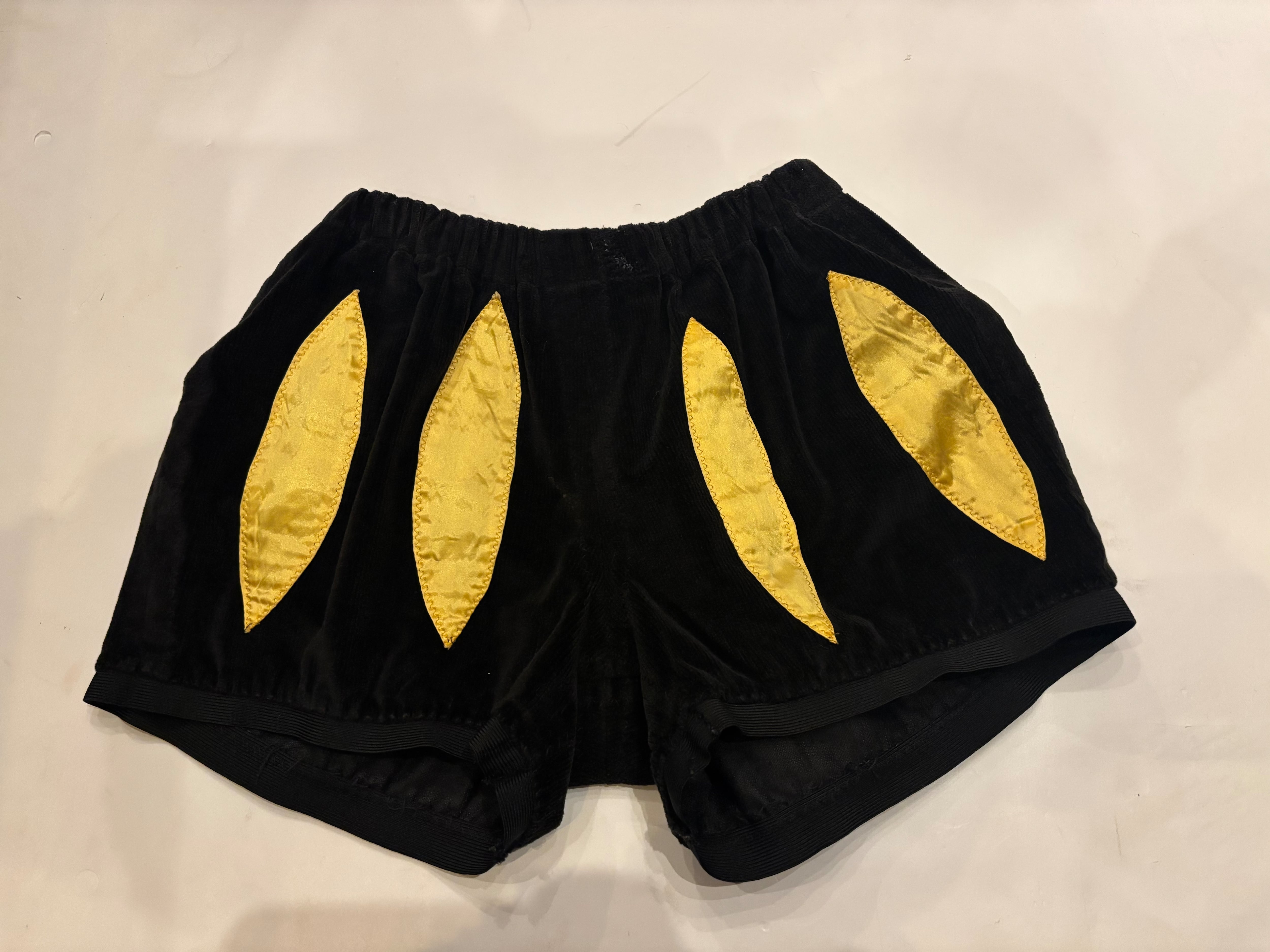 古いコスチュームパンツです。ブラックのベロアのベースに、サテンのような艶のあるリーフモチーフが雰囲気を演出してくれます。ウエストとリブはゴム仕様になっているので着脱もしやすく、タイツと合わせたりパンツの上から重ねても可愛らしくオススメです。