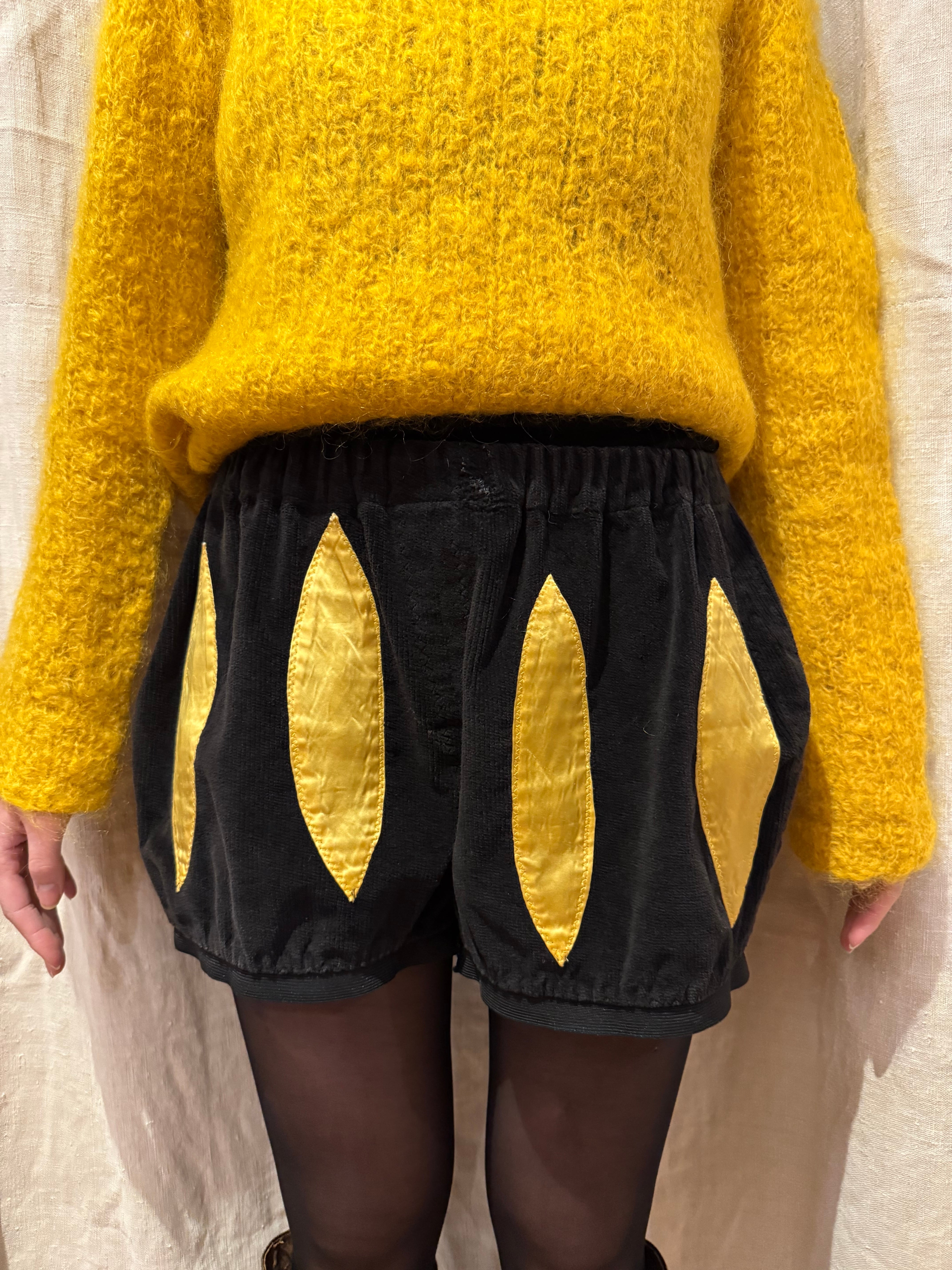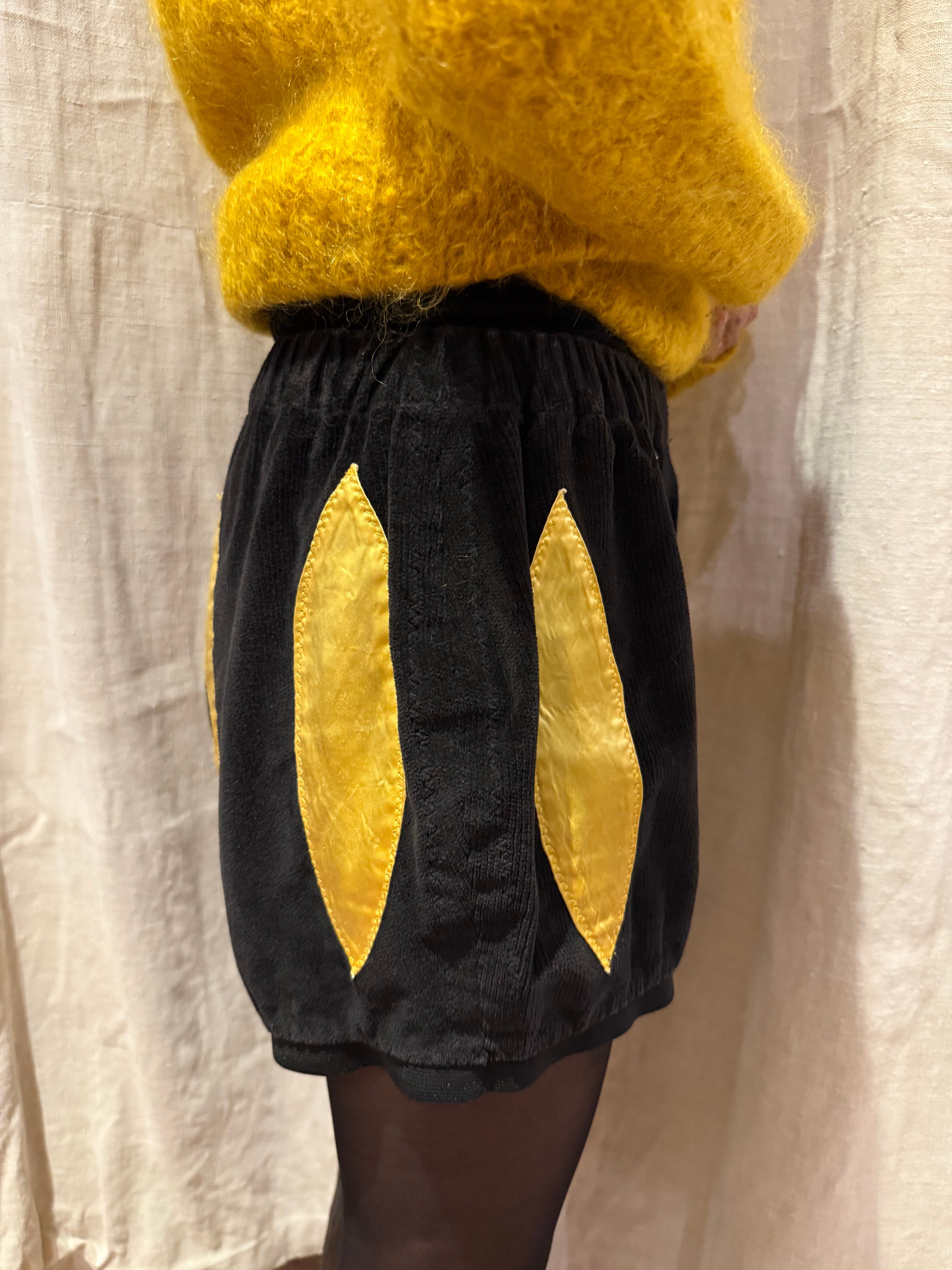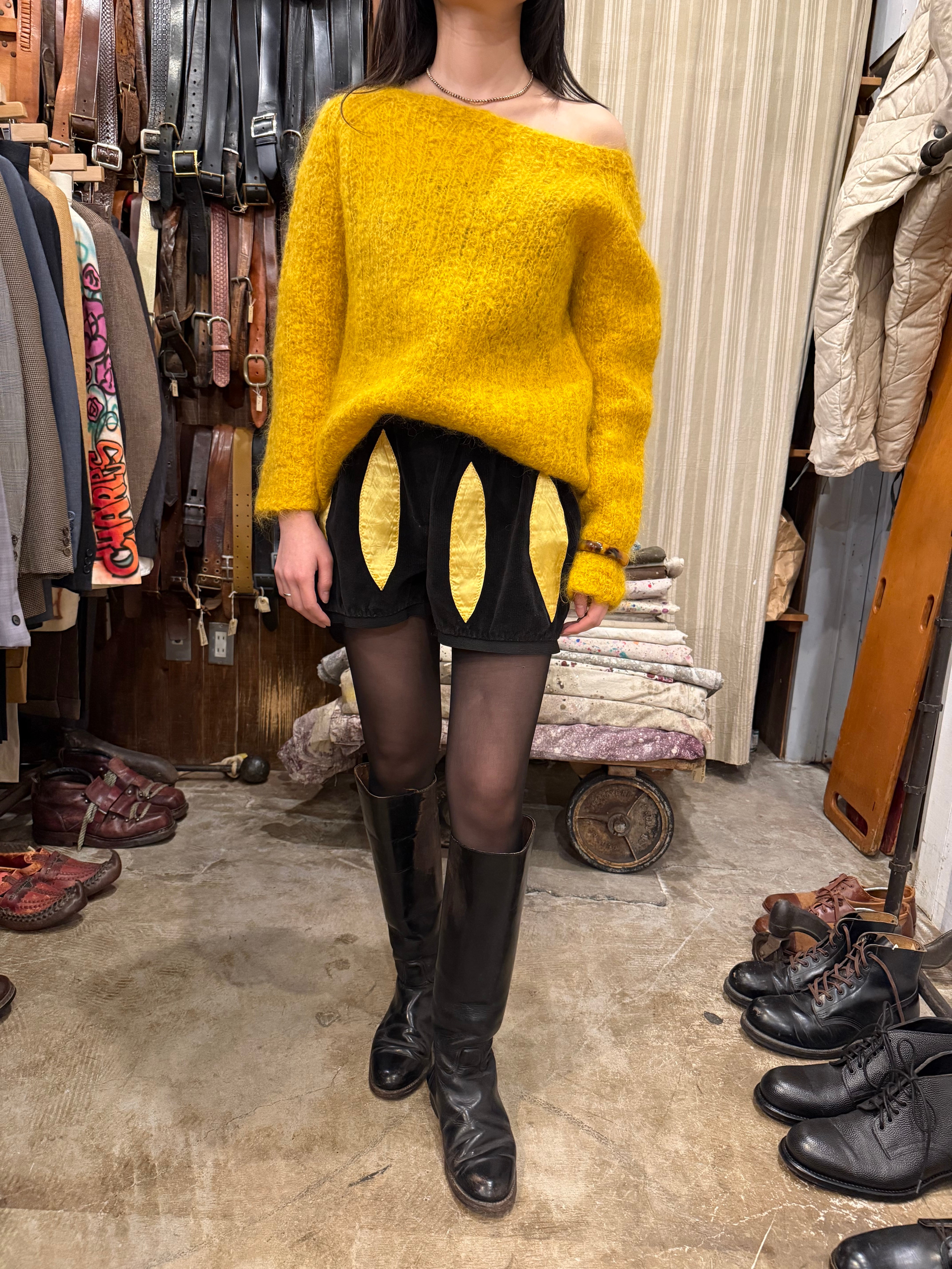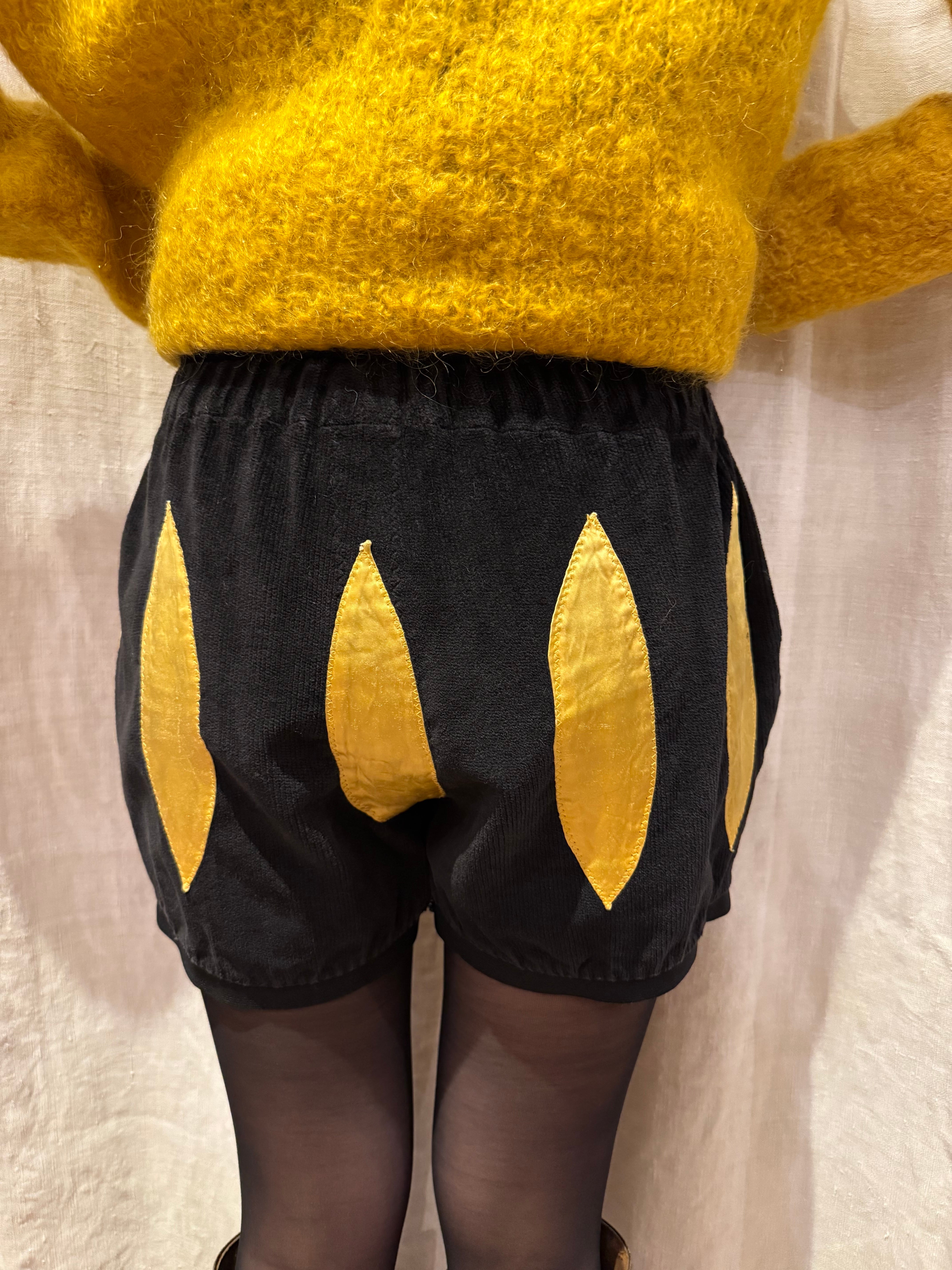 古いコスチュームパンツです。ブラックのベロアのベースに、サテンのような艶のあるリーフモチーフが雰囲気を演出してくれます。ウエストとリブはゴム仕様になっているので着脱もしやすく、タイツと合わせたりパンツの上から重ねても可愛らしくオススメです。