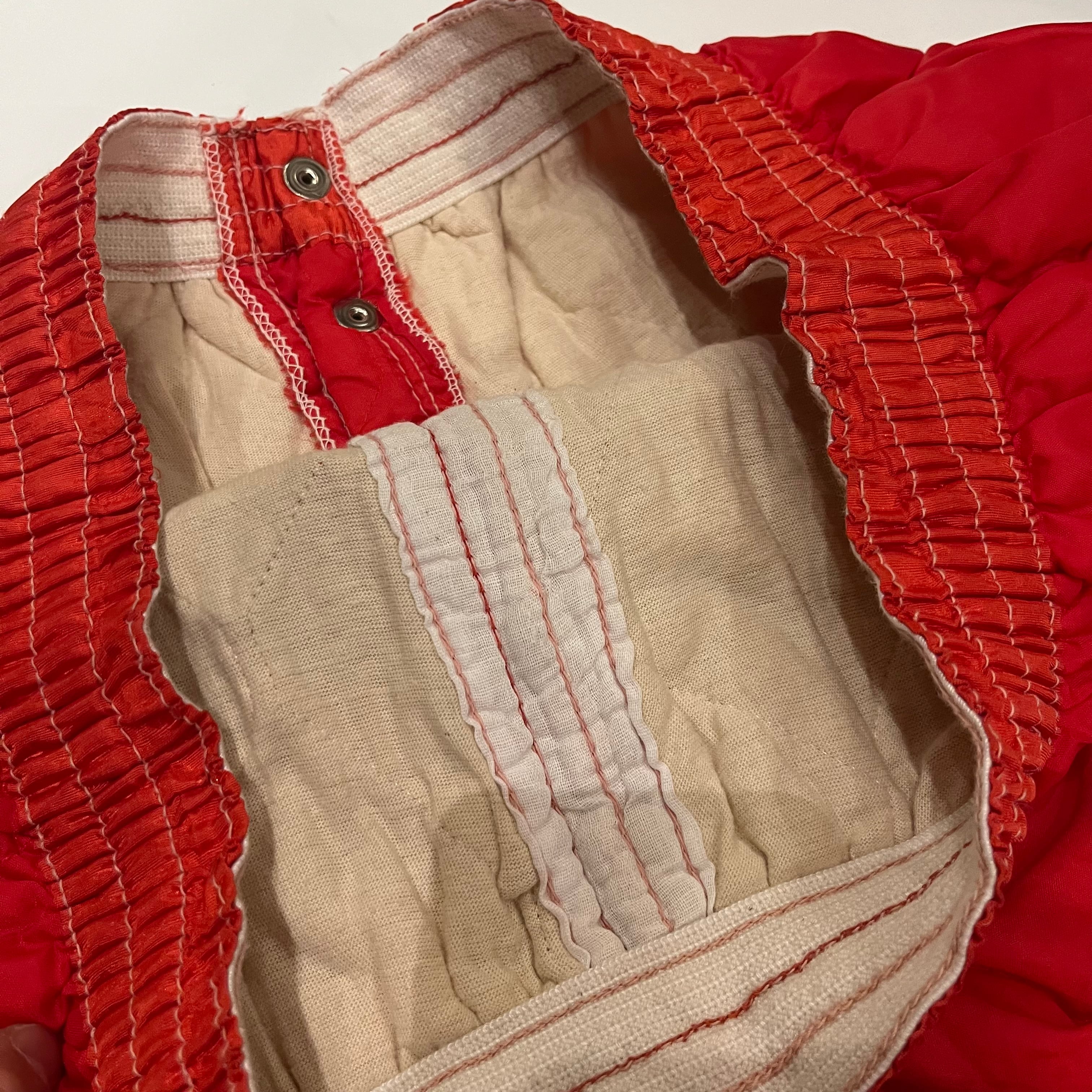 キルティングのパンツになります。カラーはレッドで、裾リブの部分はブラック。ハンドステッチのような股上の作りになっていて、パンツのアップの写真からでもわかるように独特な留め方になっていて斬新です。色味自体もパキッとしたカラーで刺さる色かと思います。