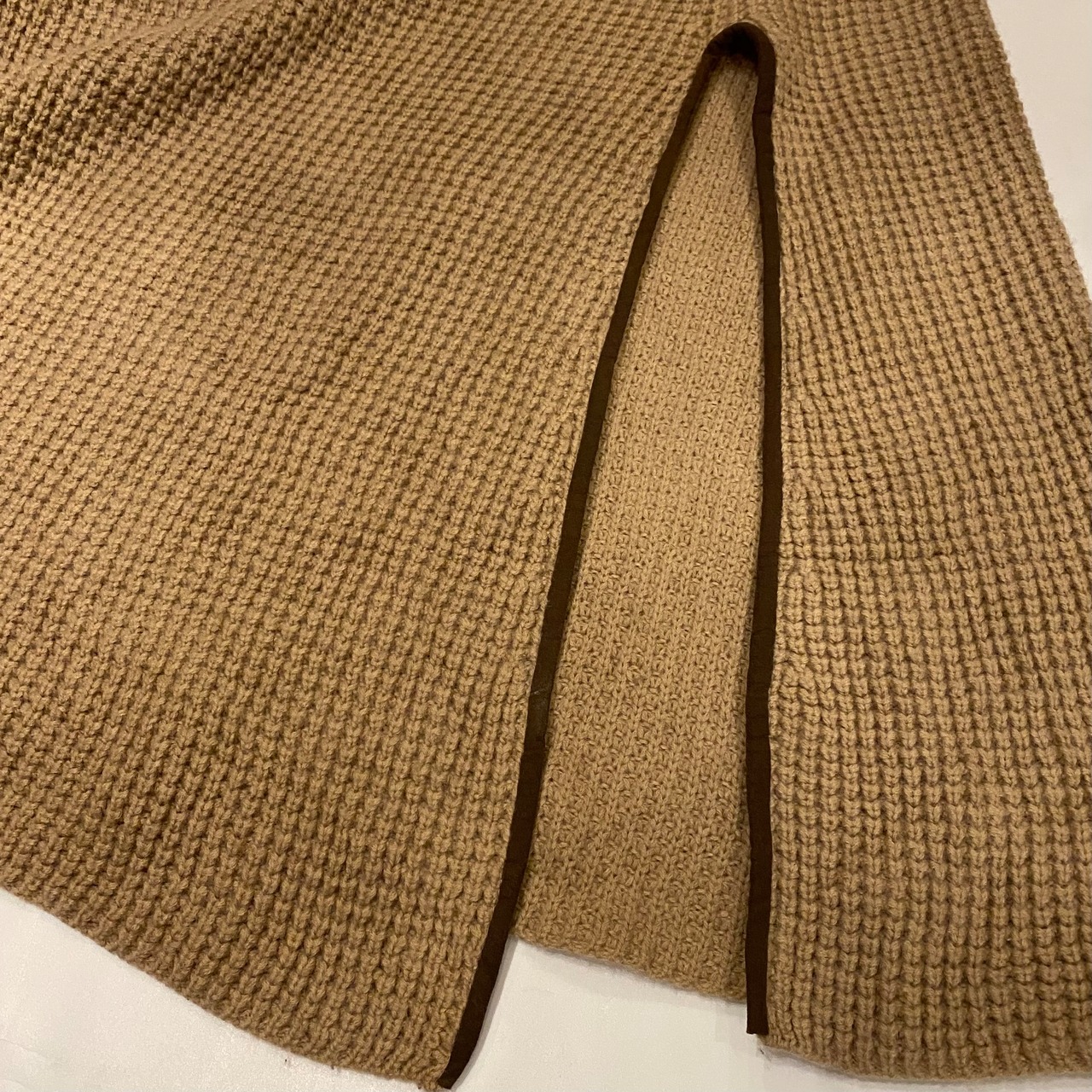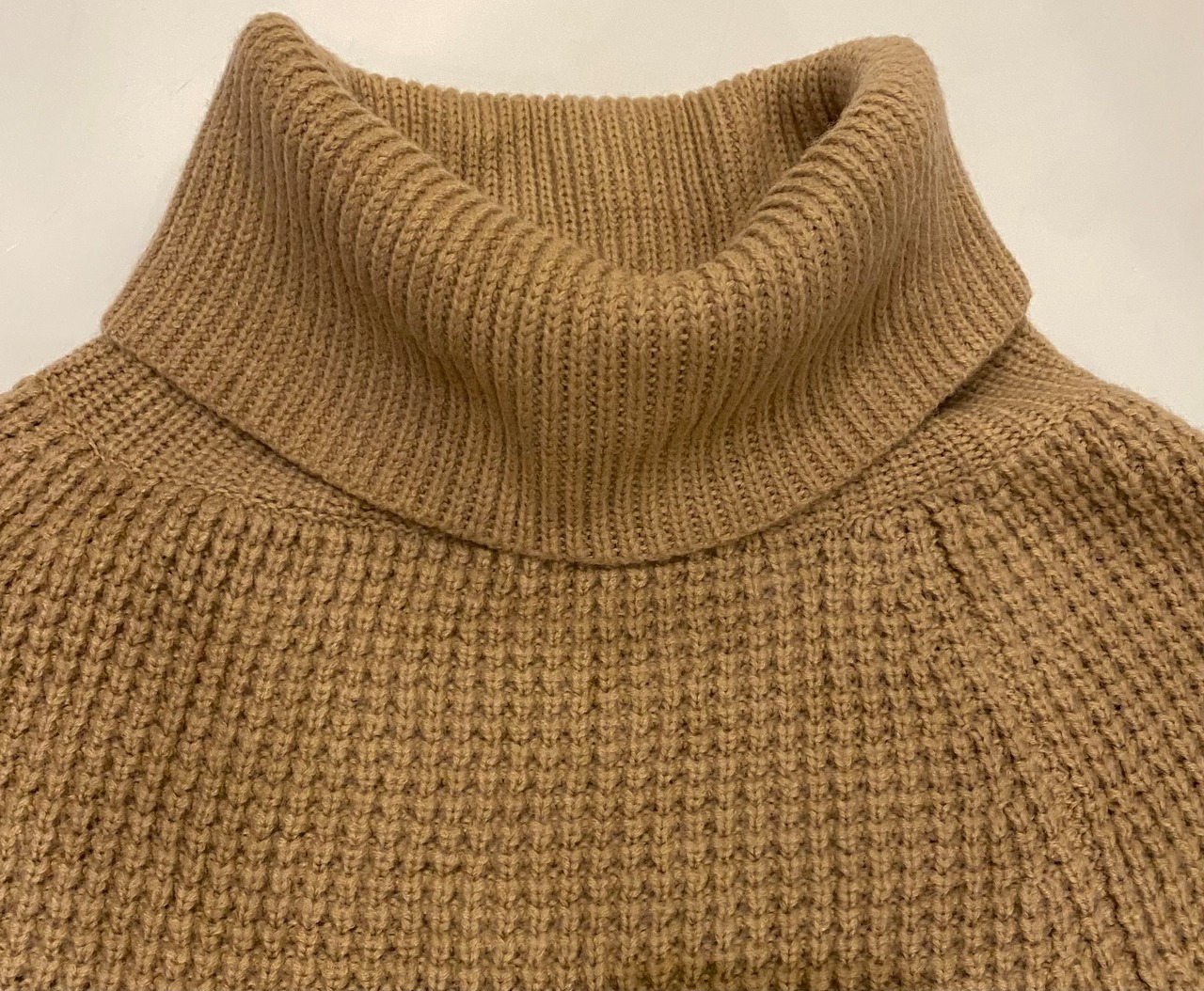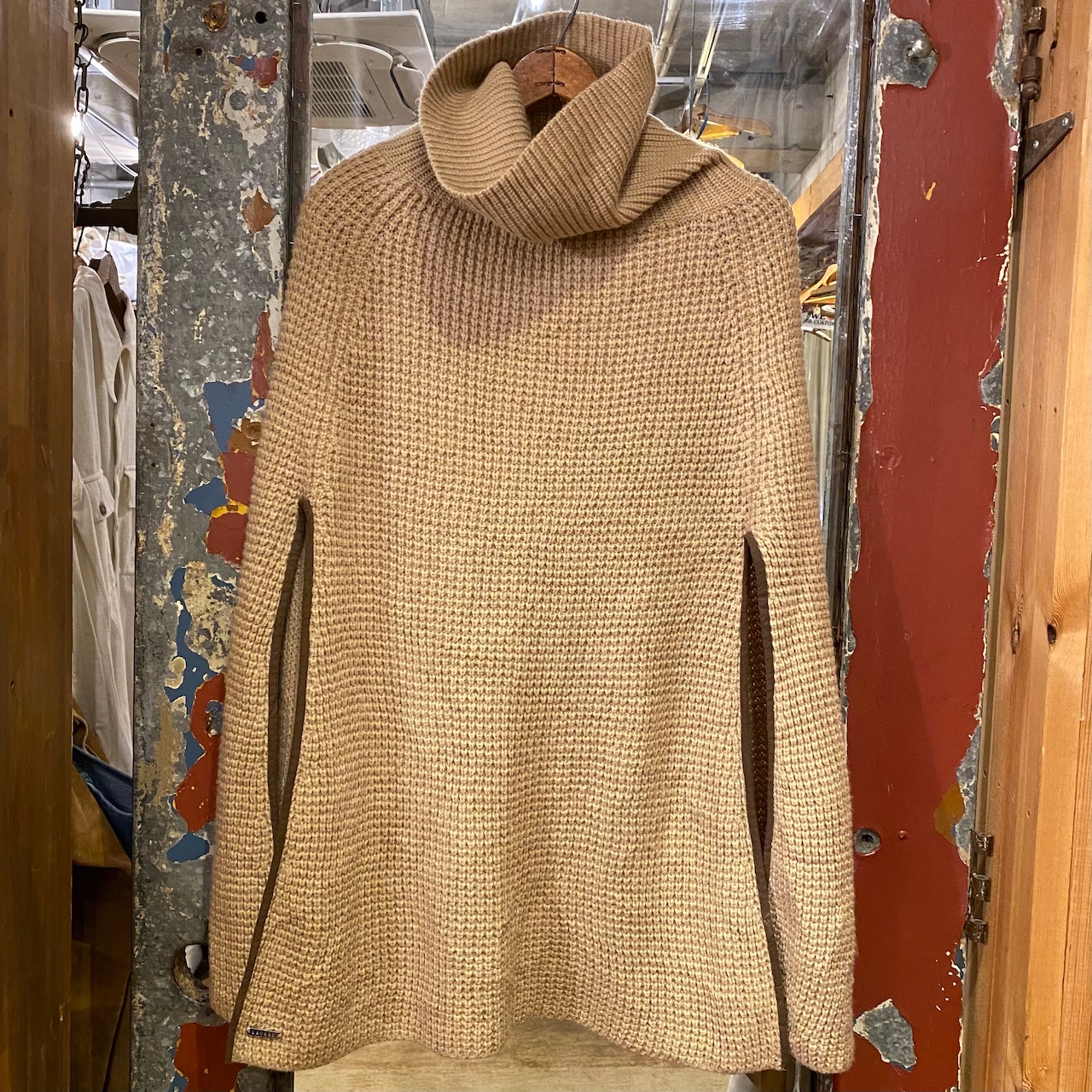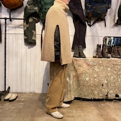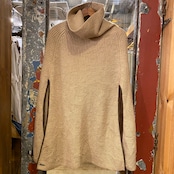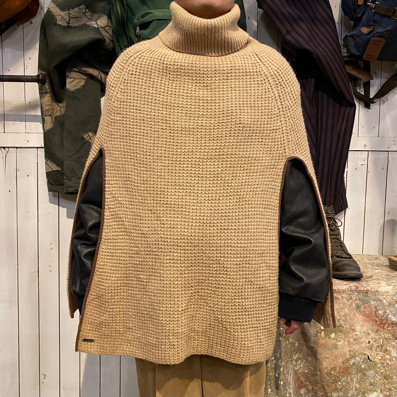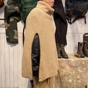 90年代くらいのローレン、ラルフローレンのタートルネックニットポンチョになります。左右にパイピングされたスリットが入り腕が出る仕様です。体に沿うようなライン、ネックのボリューム感が綺麗です。長くない丈感もレイヤードしやすく、コーディネートに取り入れていただける思います。レザージャケットの上に合わせて着ると素材の対比が引き立ちますね。