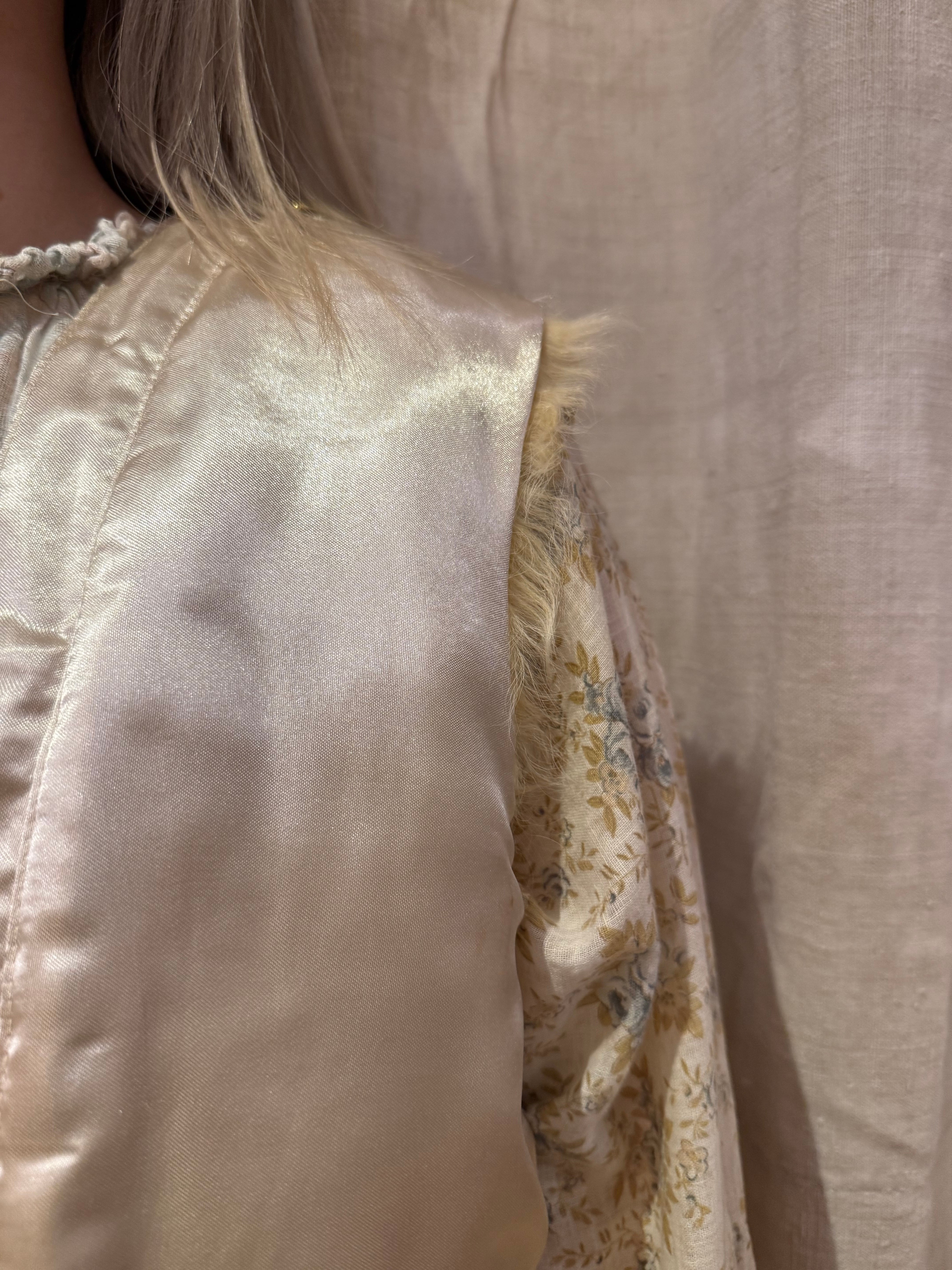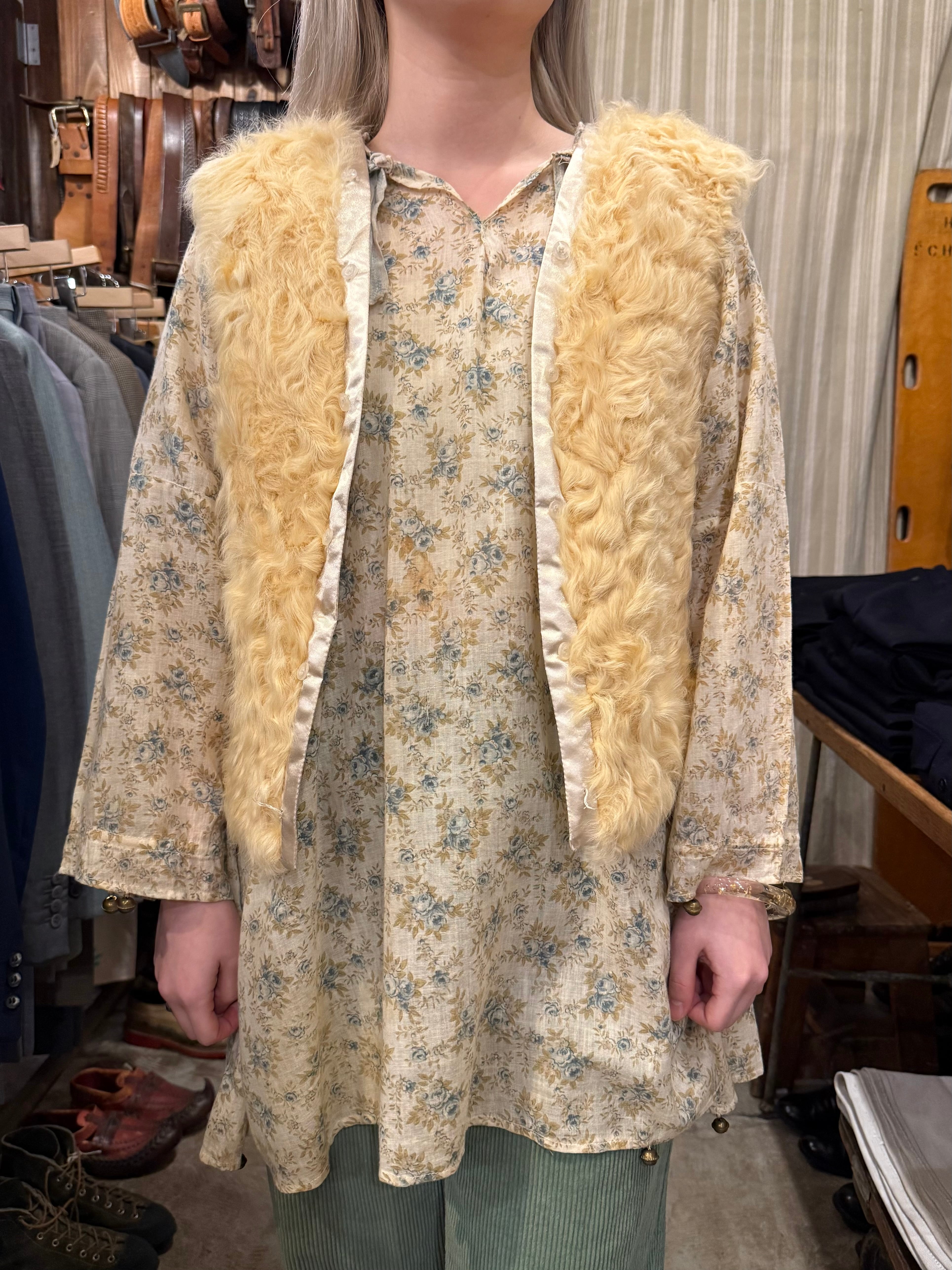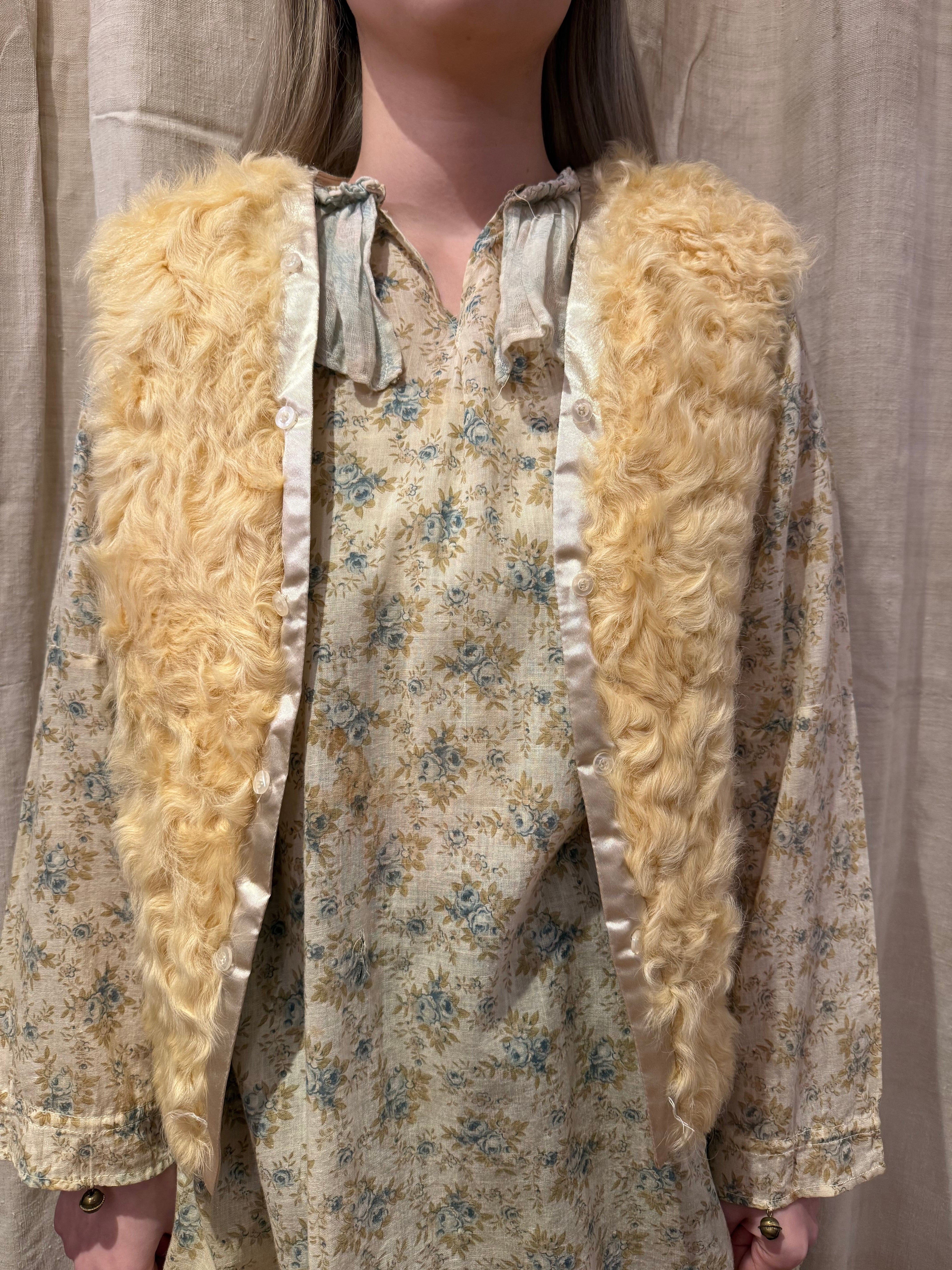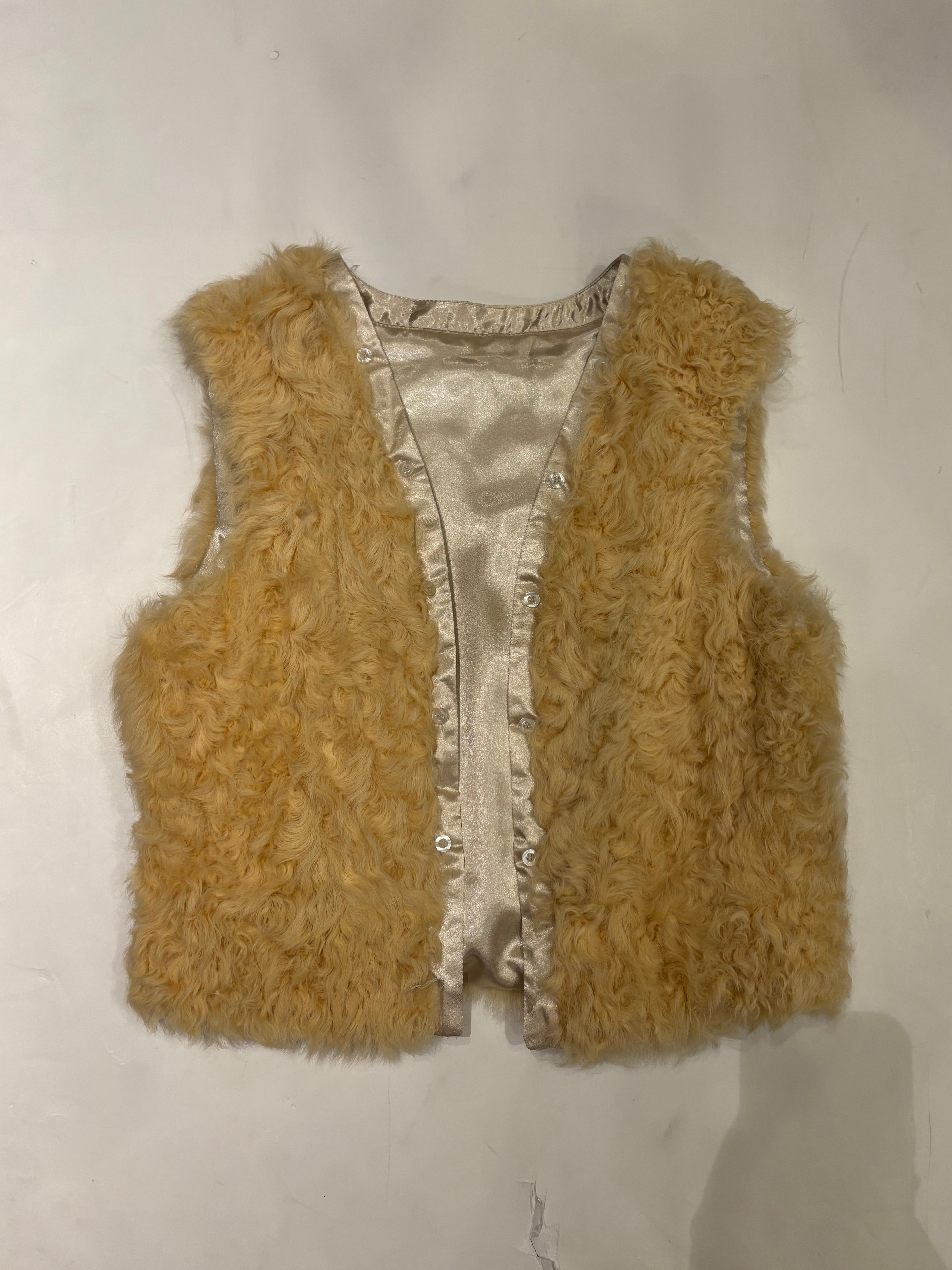 リバーシブルで使えるファーベスト。元々は何かのライナーだったのか、縁にボタンのついた仕様となっております。ラムの毛で出来ており、柔らかな肌触りでとても暖かな着心地。もう片面はツヤのあるサテンで、どちらで着用しても上品でとても可愛らしいです。フロント部分にボタンなどは無いので、シルバーのブローチなどで留めてアクセントを加えても良さそうです◎