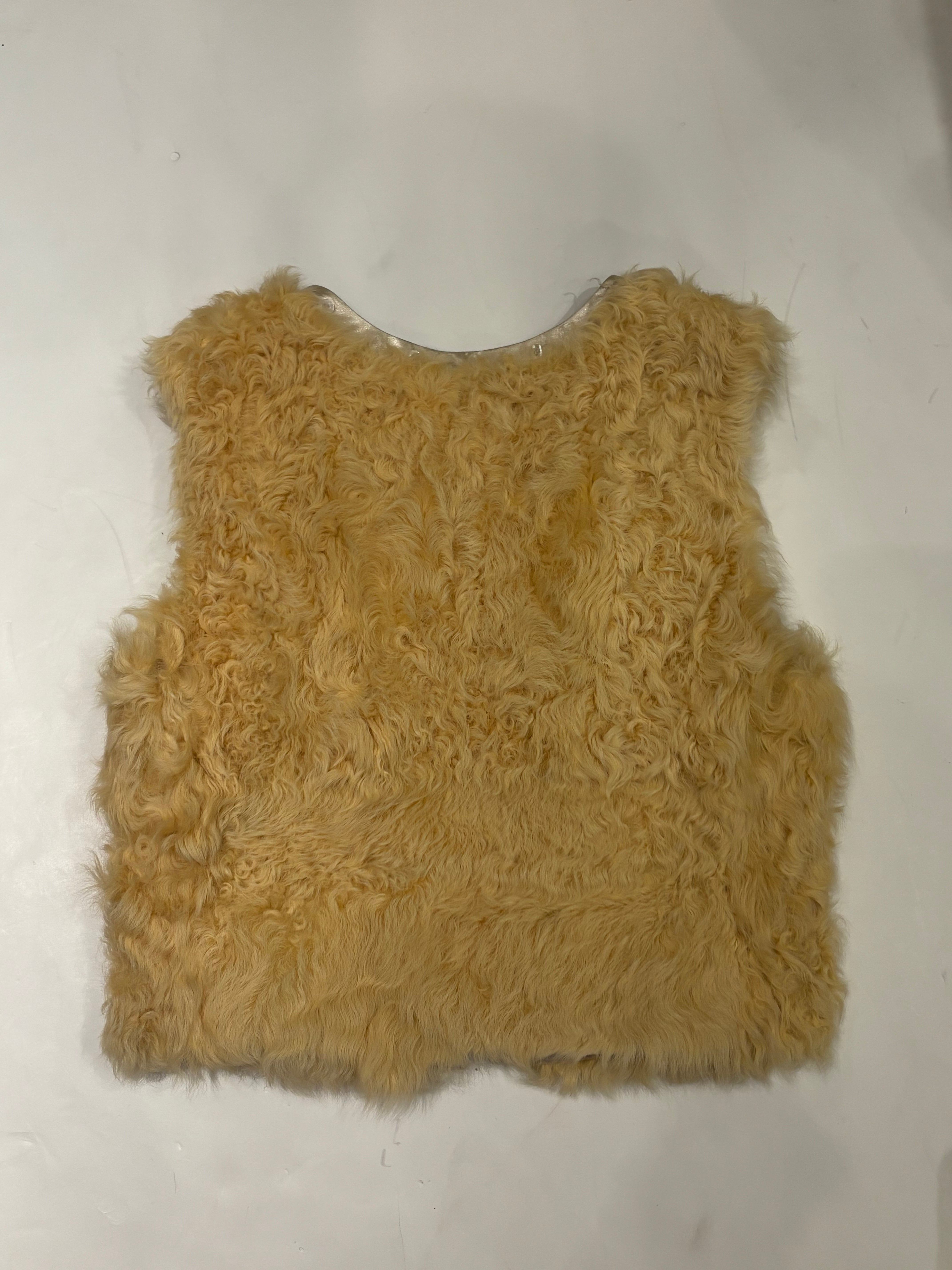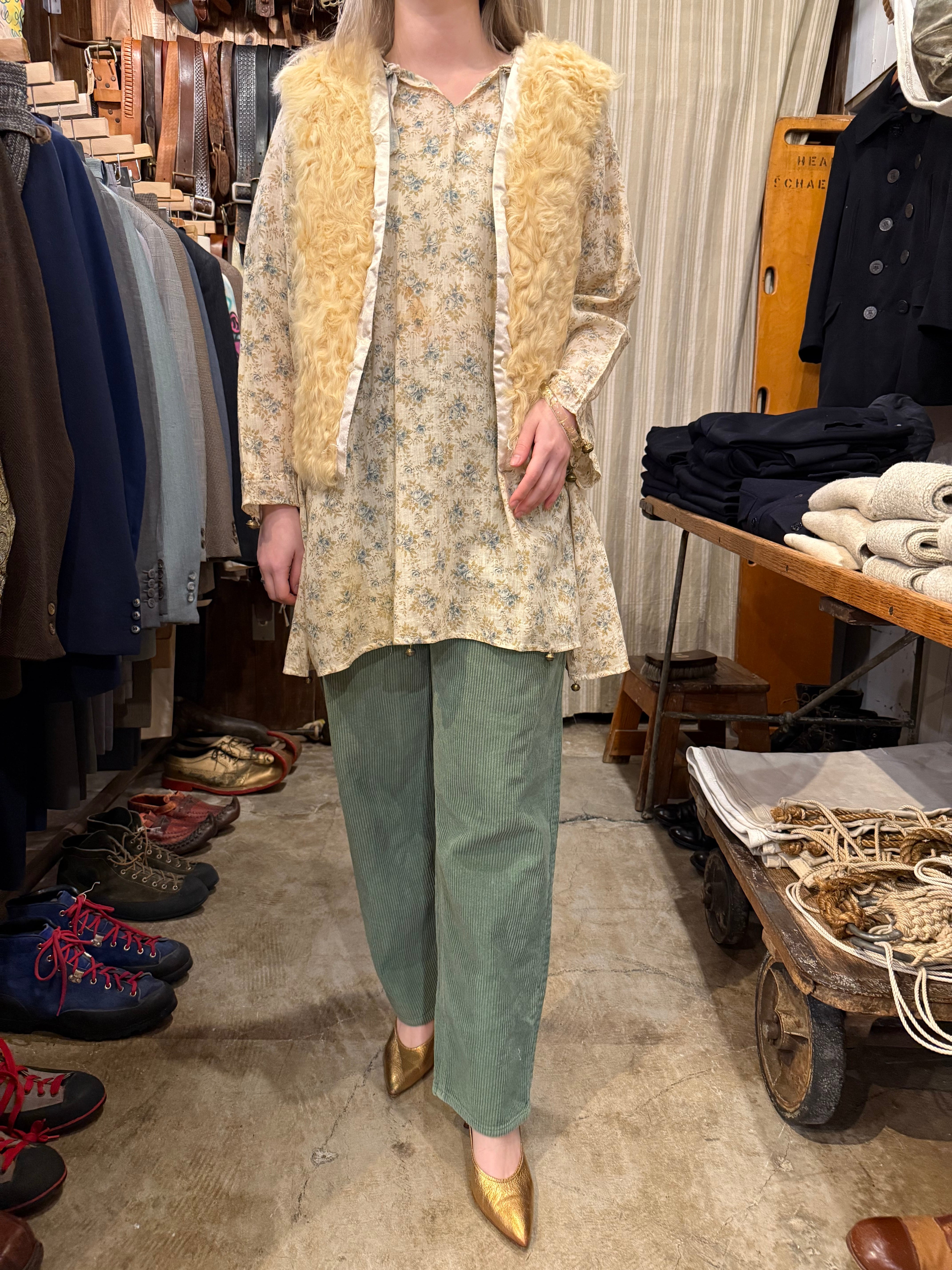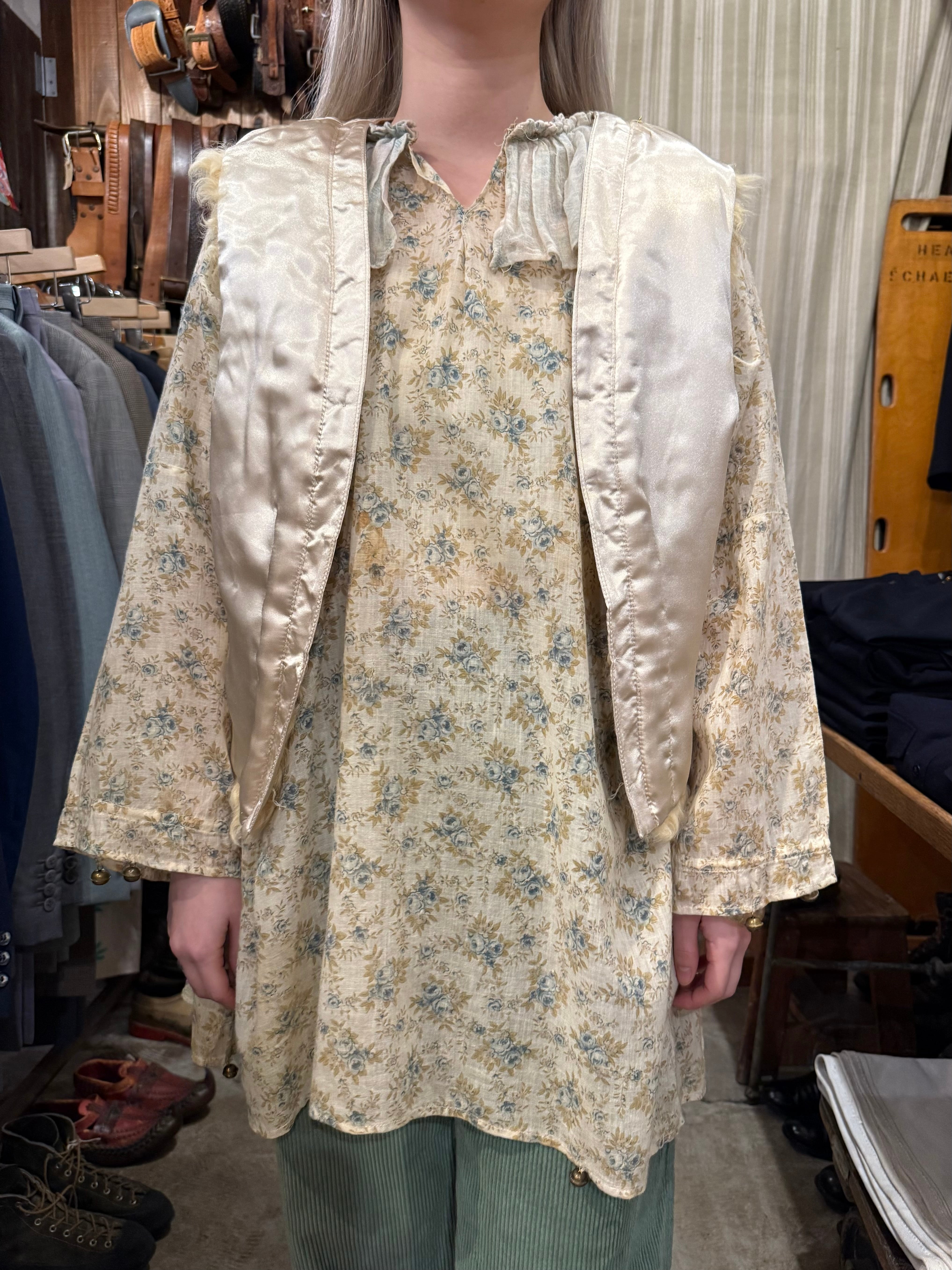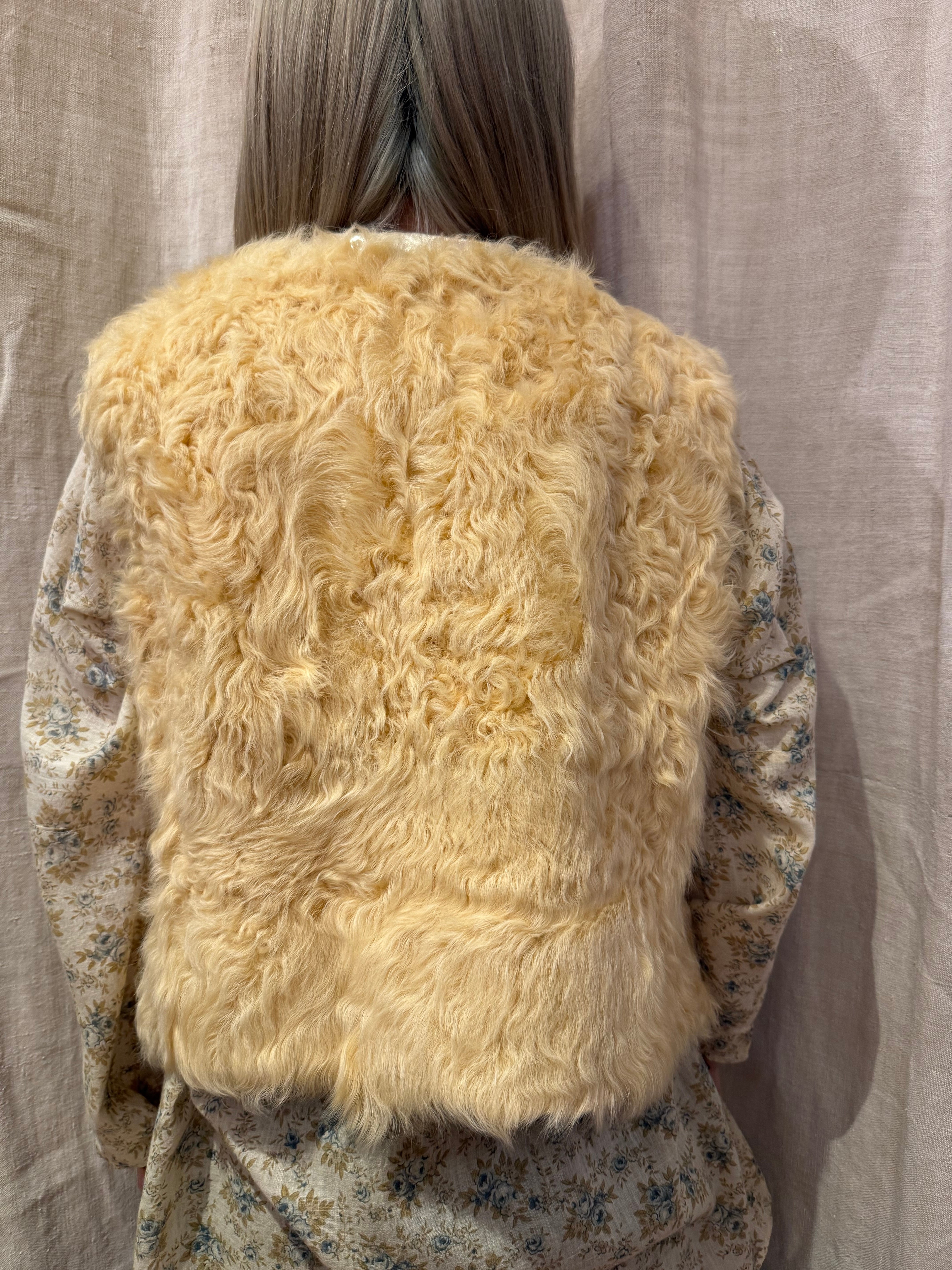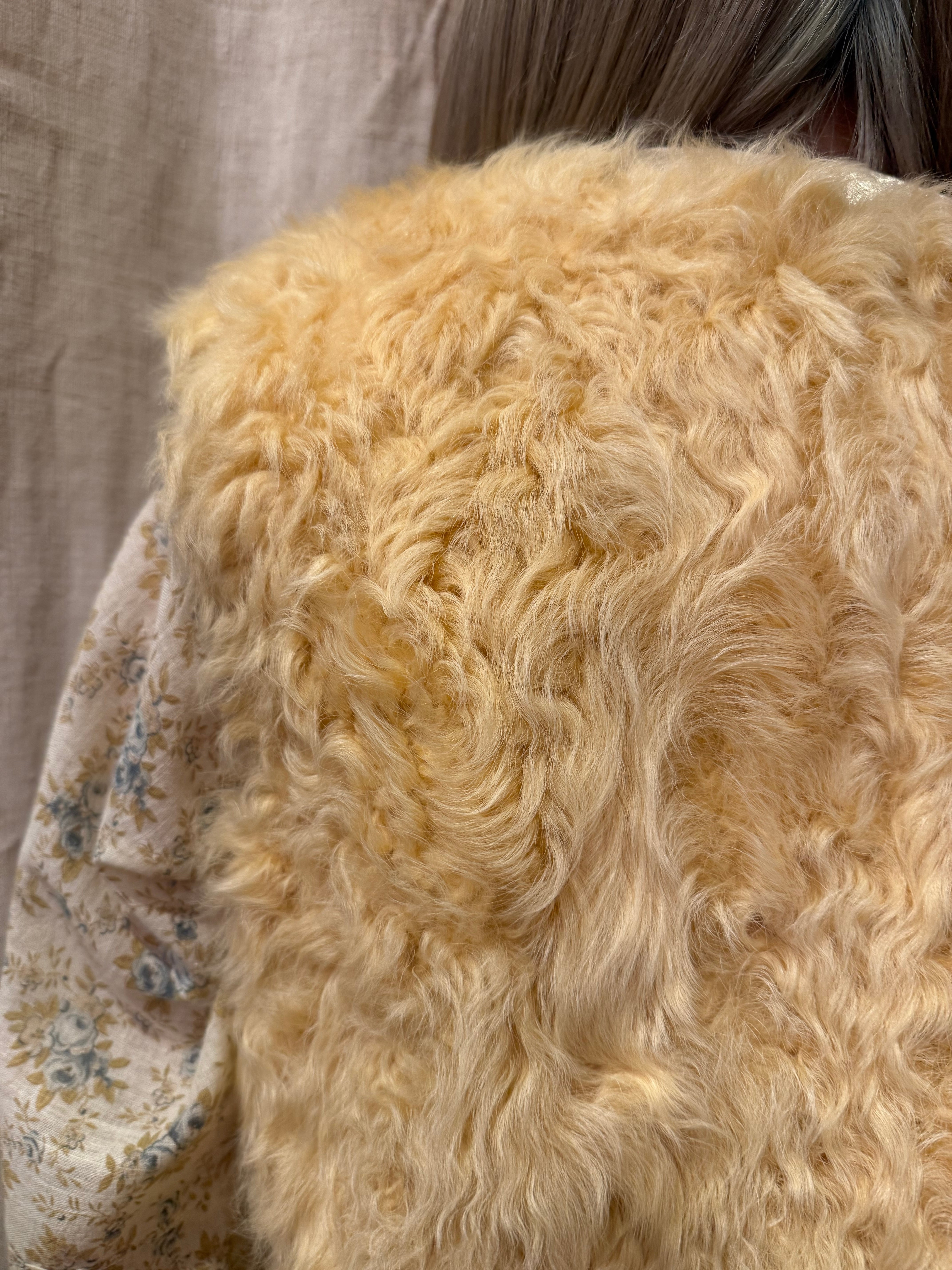 リバーシブルで使えるファーベスト。元々は何かのライナーだったのか、縁にボタンのついた仕様となっております。ラムの毛で出来ており、柔らかな肌触りでとても暖かな着心地。もう片面はツヤのあるサテンで、どちらで着用しても上品でとても可愛らしいです。フロント部分にボタンなどは無いので、シルバーのブローチなどで留めてアクセントを加えても良さそうです◎