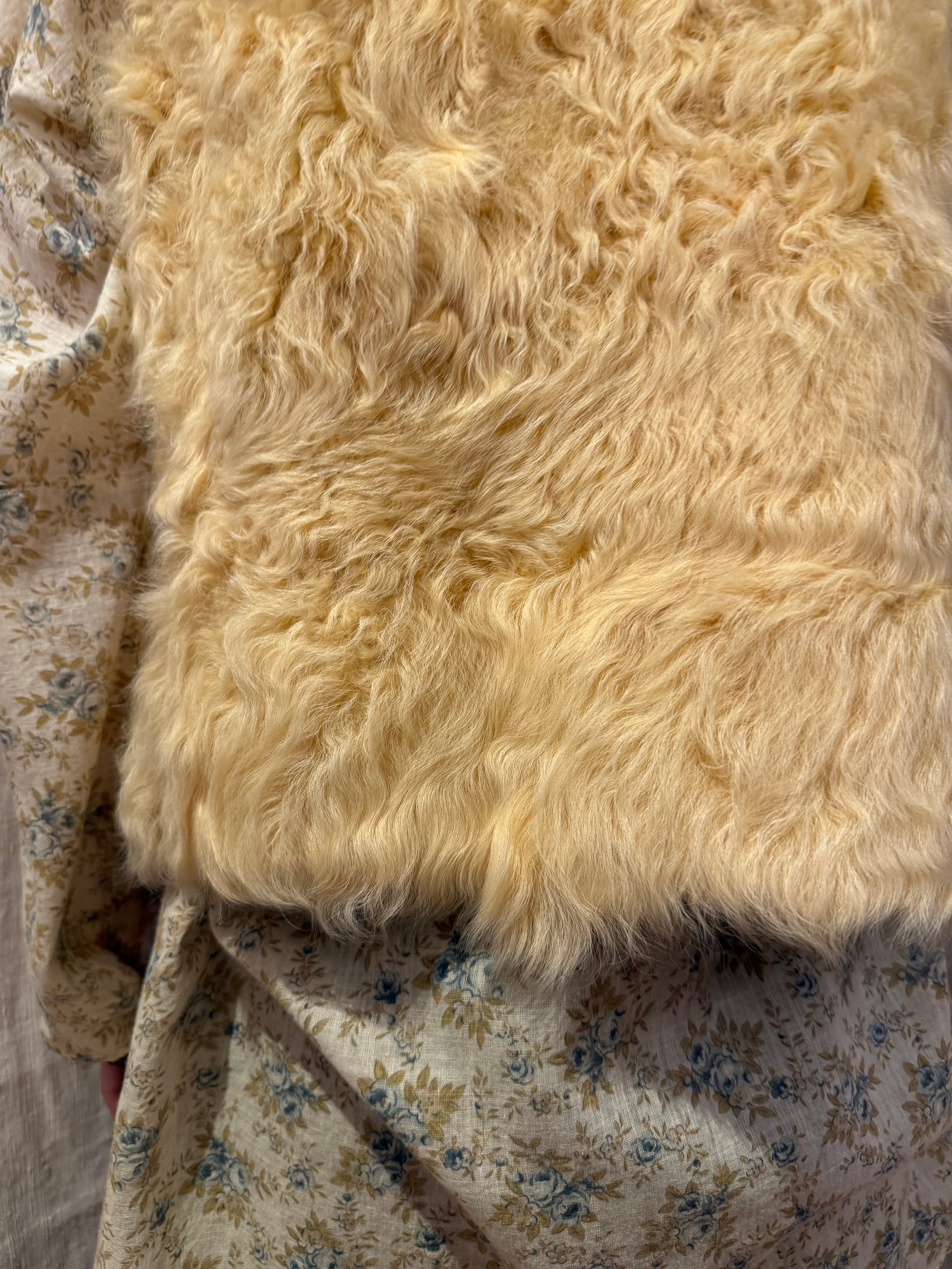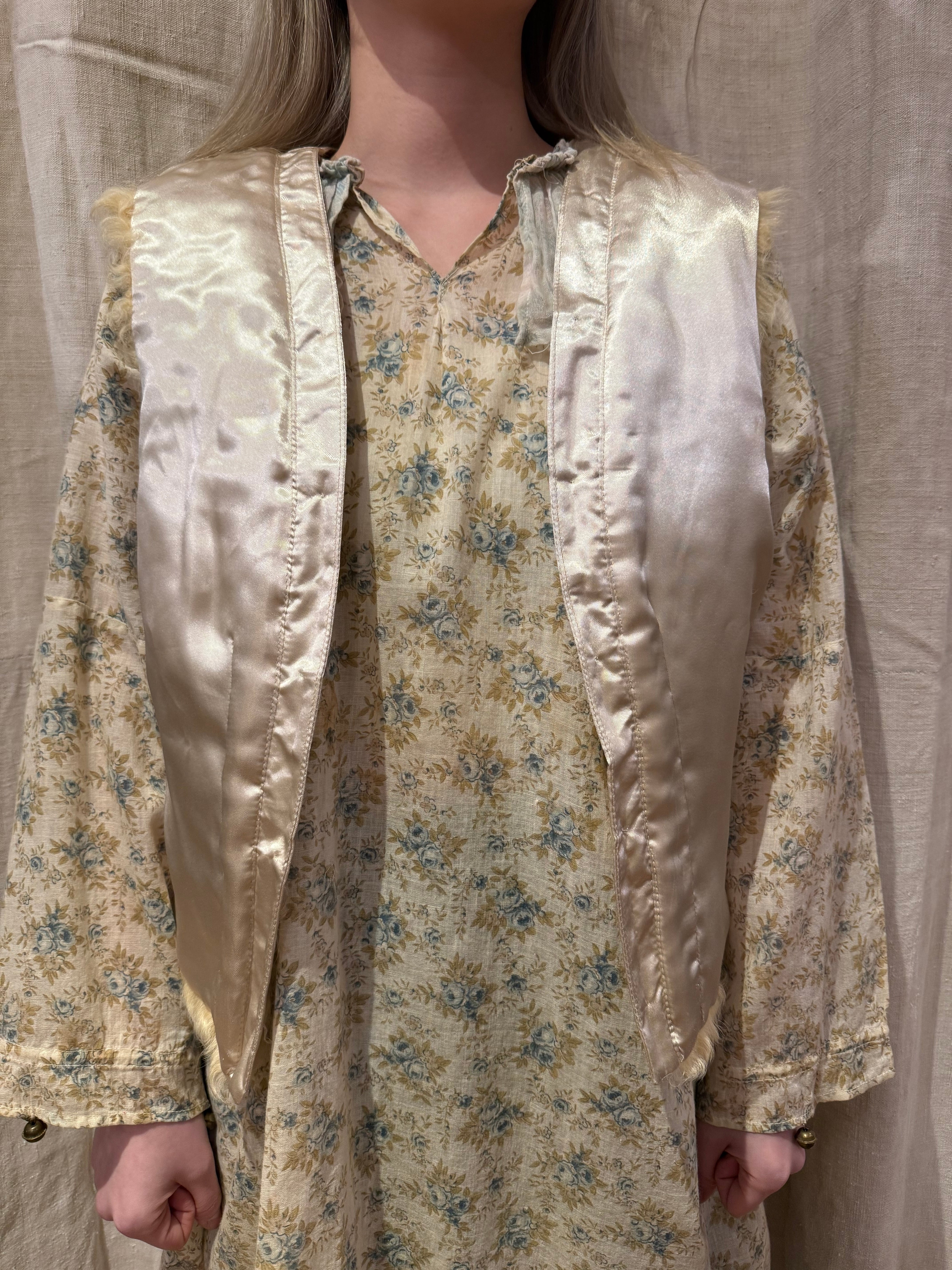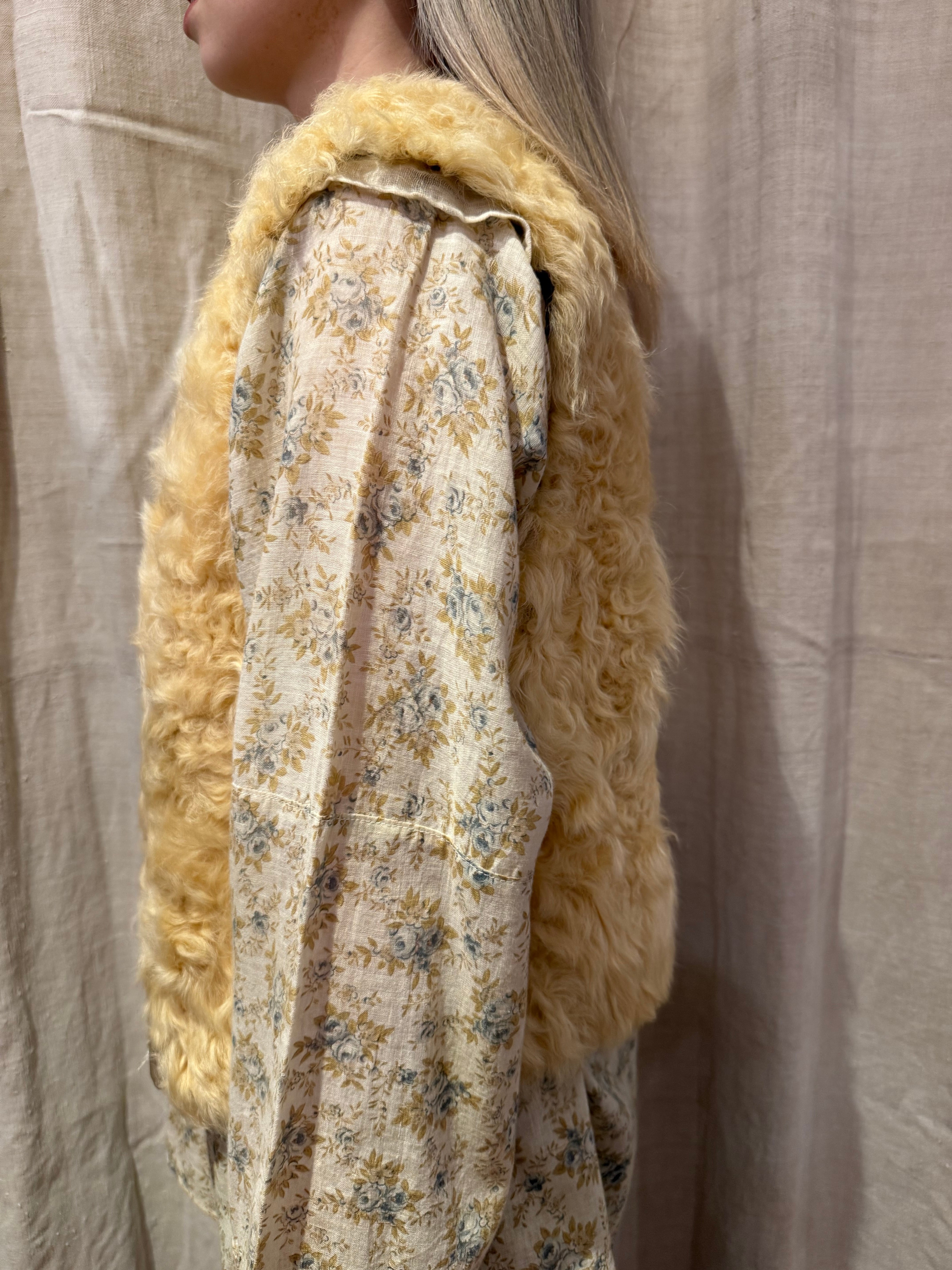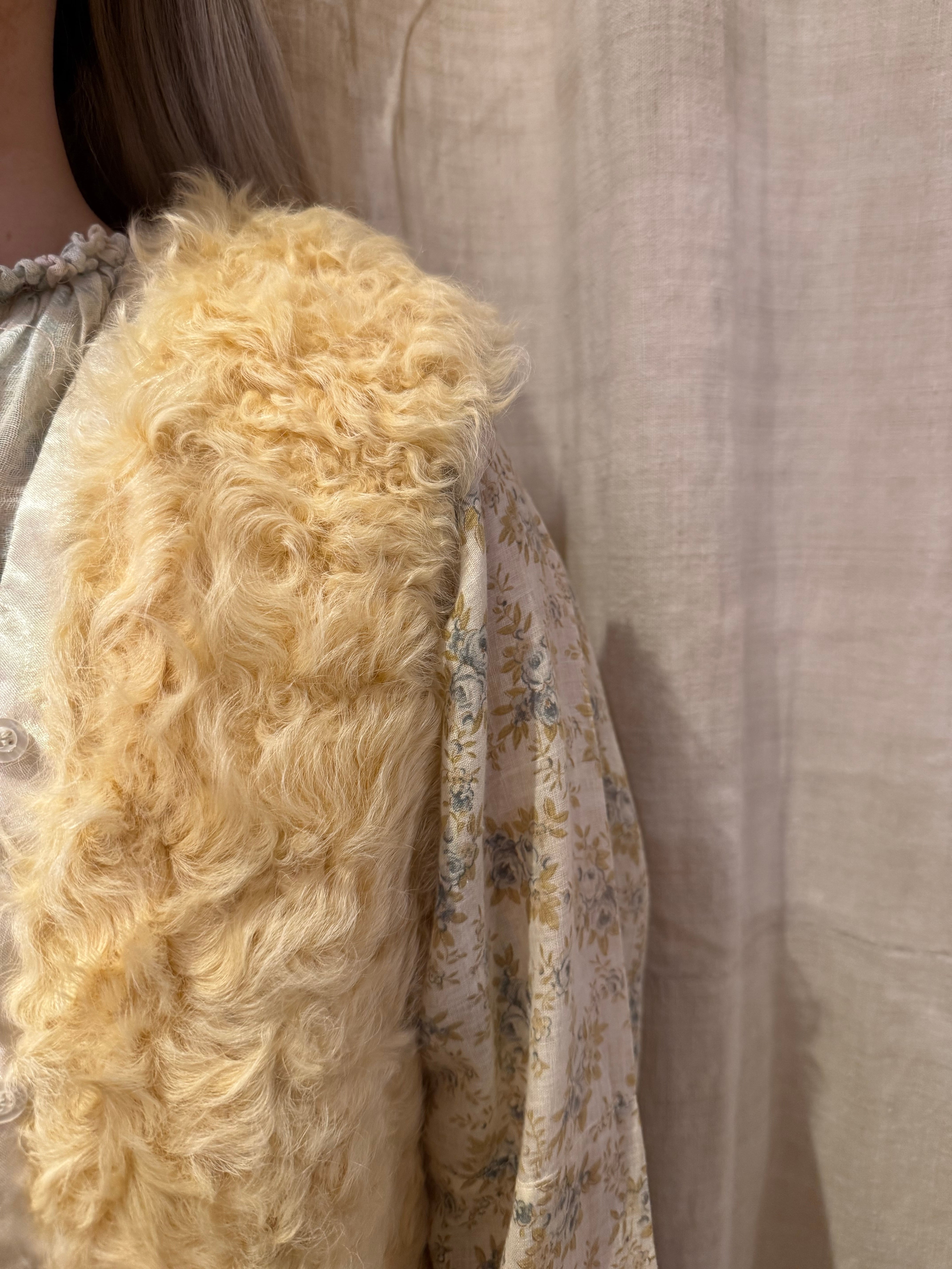 リバーシブルで使えるファーベスト。元々は何かのライナーだったのか、縁にボタンのついた仕様となっております。ラムの毛で出来ており、柔らかな肌触りでとても暖かな着心地。もう片面はツヤのあるサテンで、どちらで着用しても上品でとても可愛らしいです。フロント部分にボタンなどは無いので、シルバーのブローチなどで留めてアクセントを加えても良さそうです◎