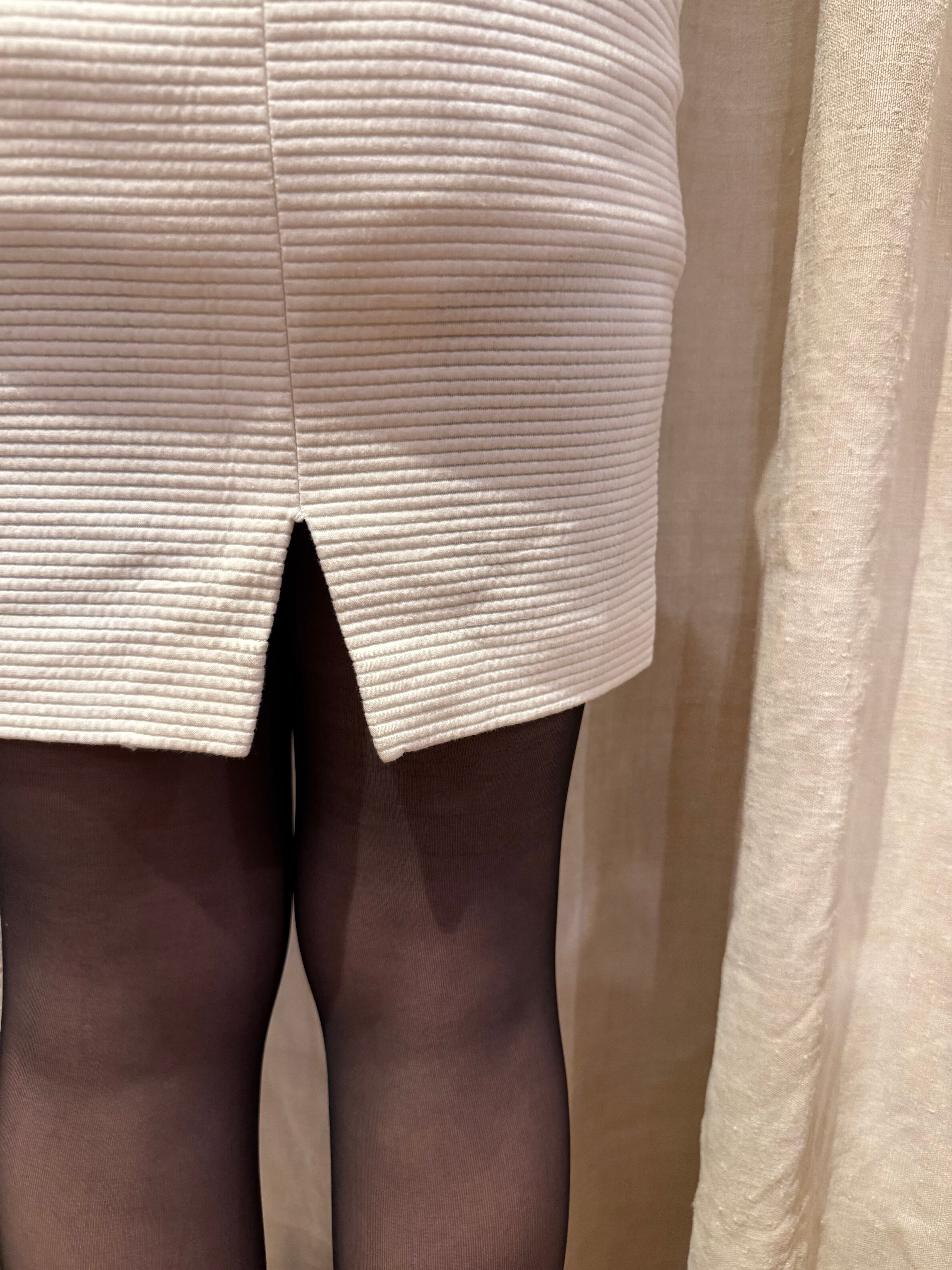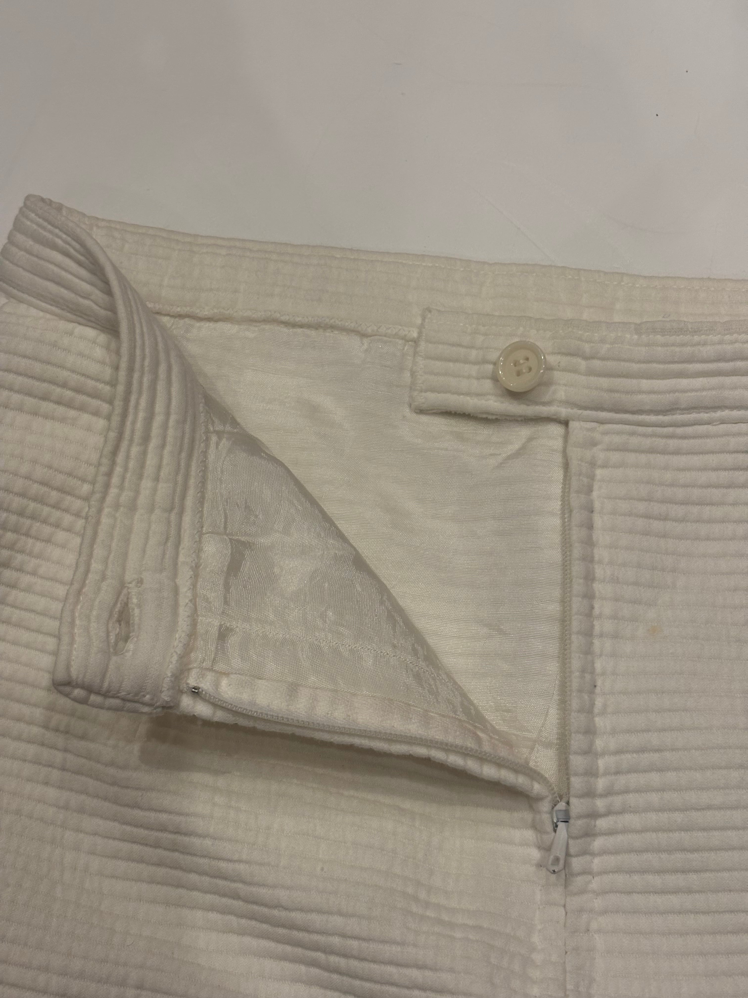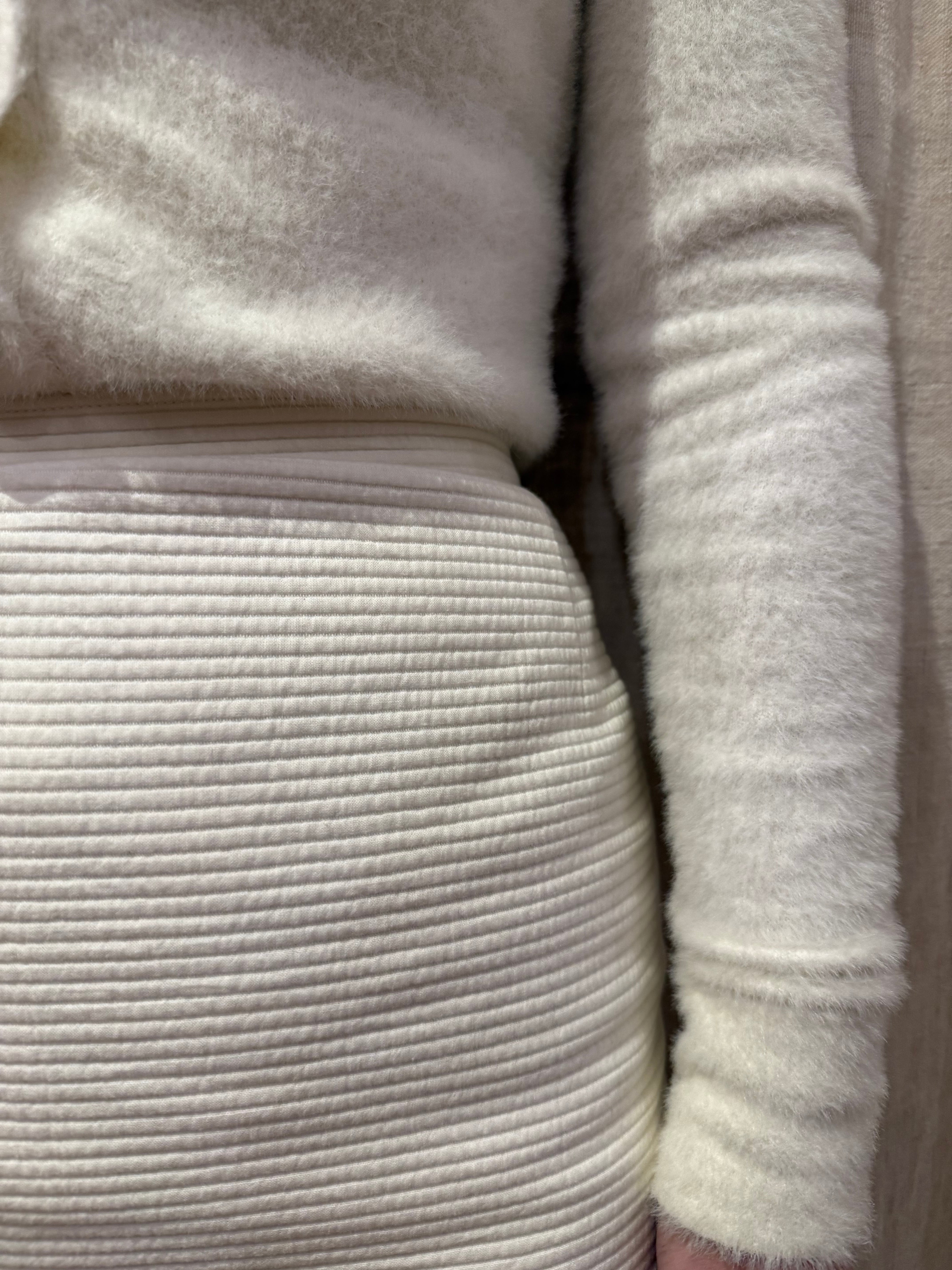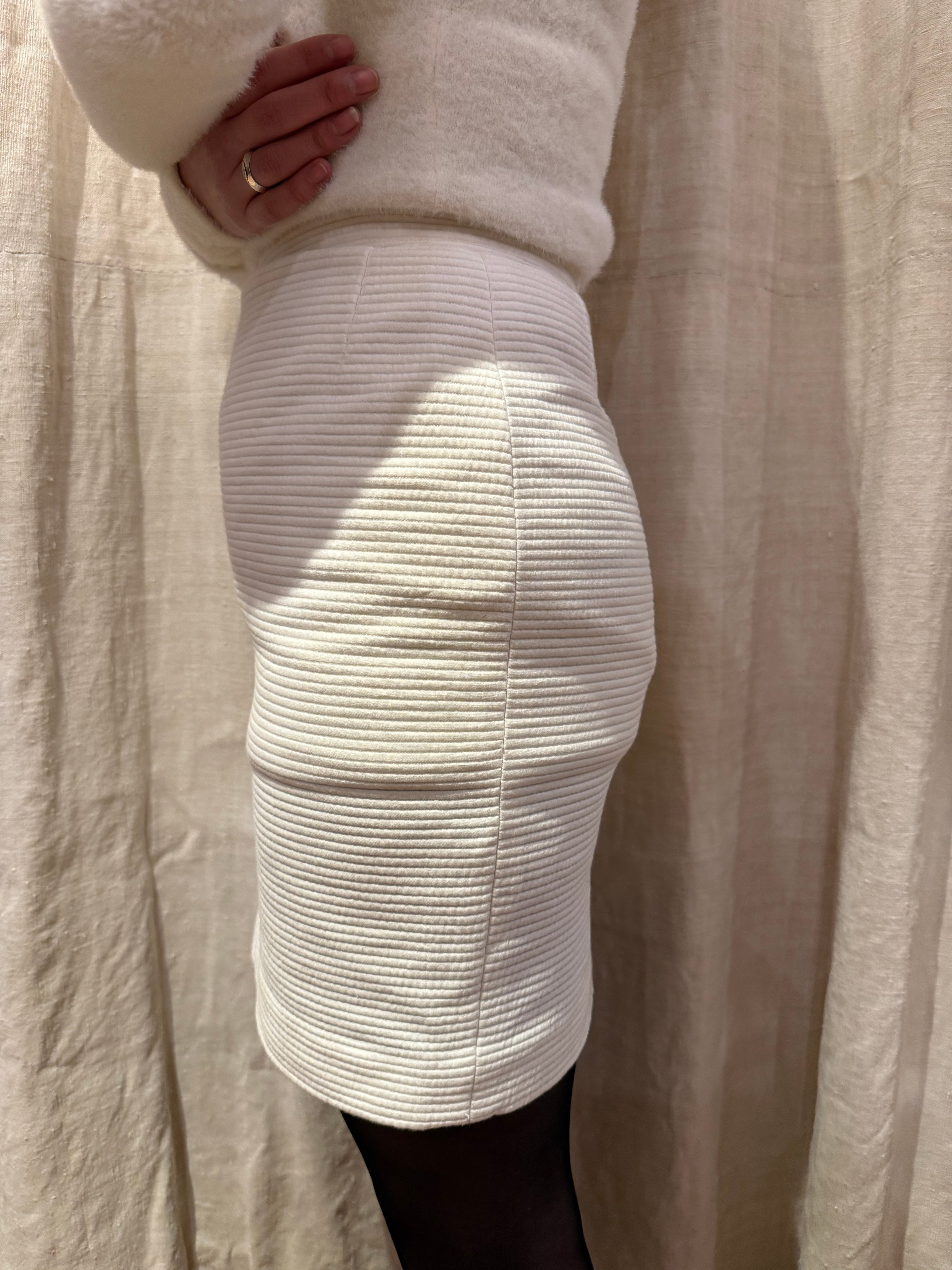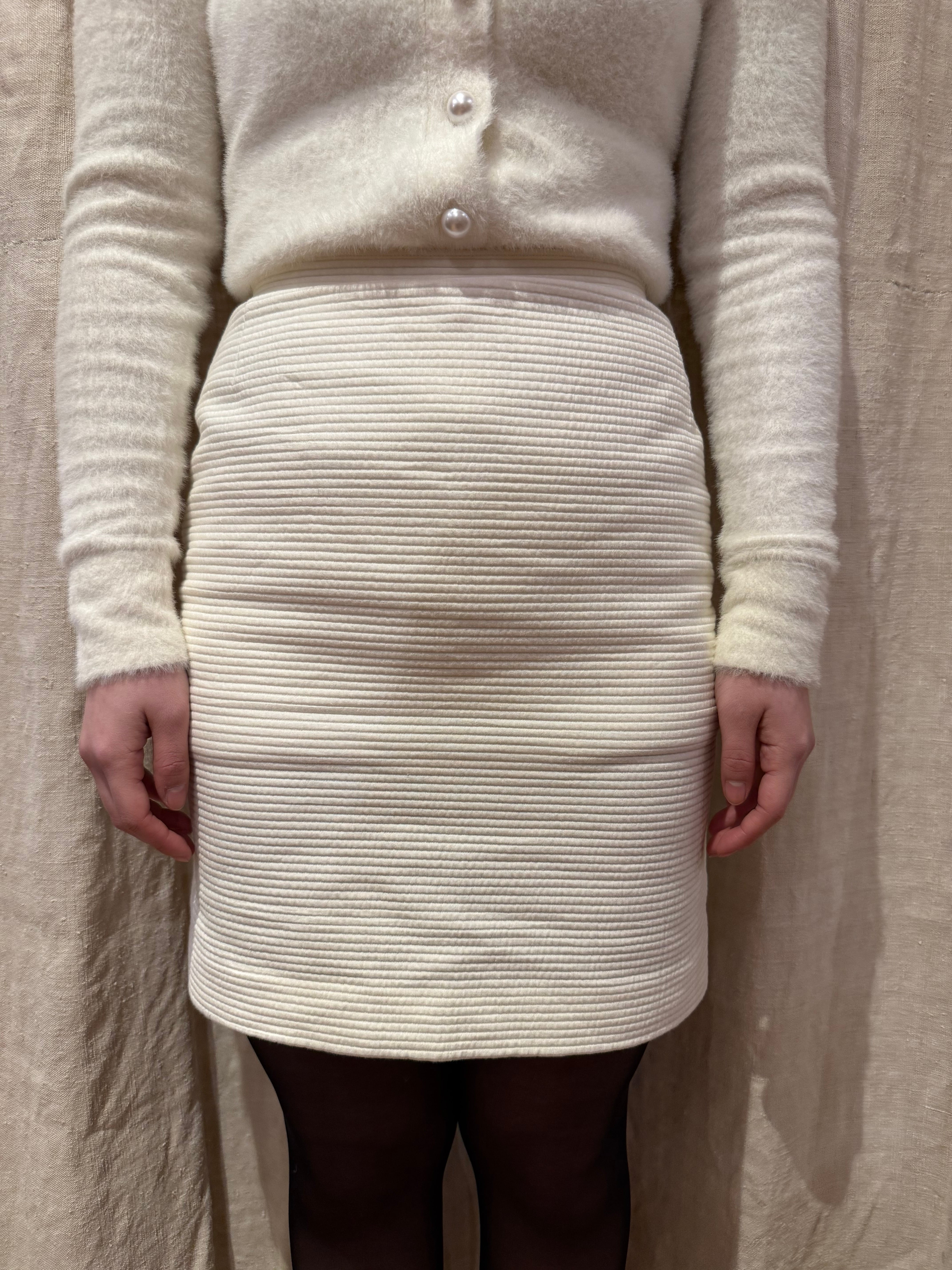 タイトなシルエットのミニスカートです。コットン地のしっかりとした凹凸のある肌触りで、肉厚の裏地がついているデザインで、冬でも履ける仕様となっております。もふっとしたトップスやアウターと合わせてもバランスが良いかなと。後ろはスリットが入っていて歩きやすく、チラリと見えるラインが上品で可愛らしいです。