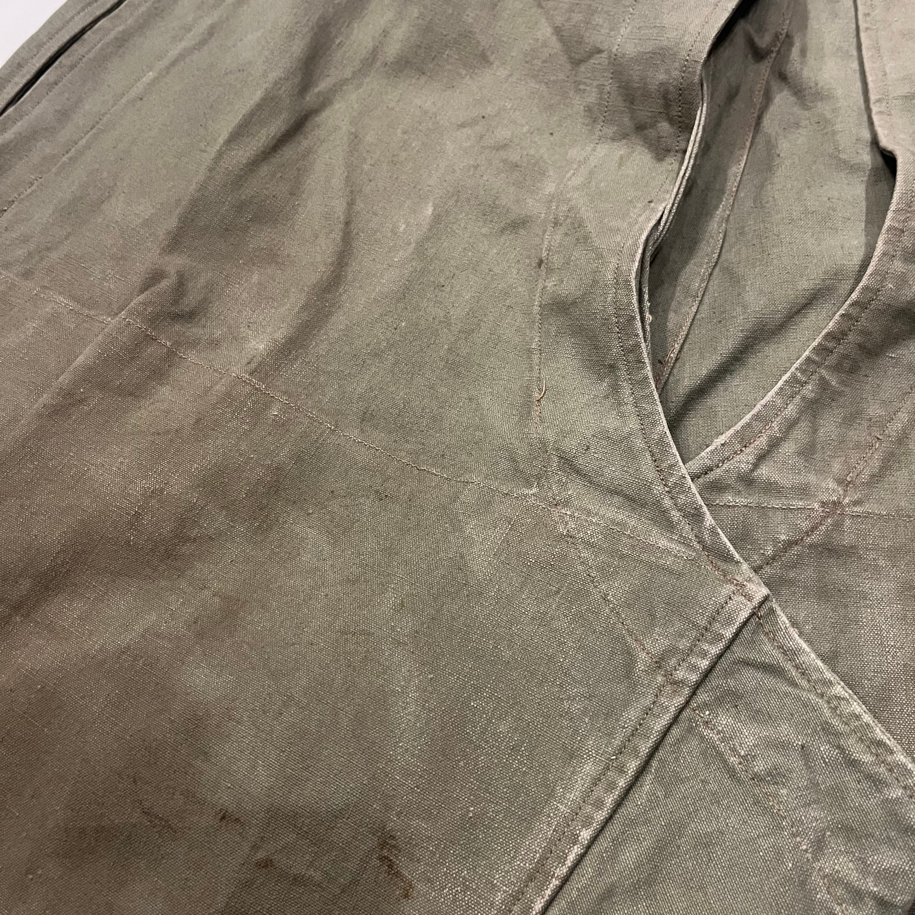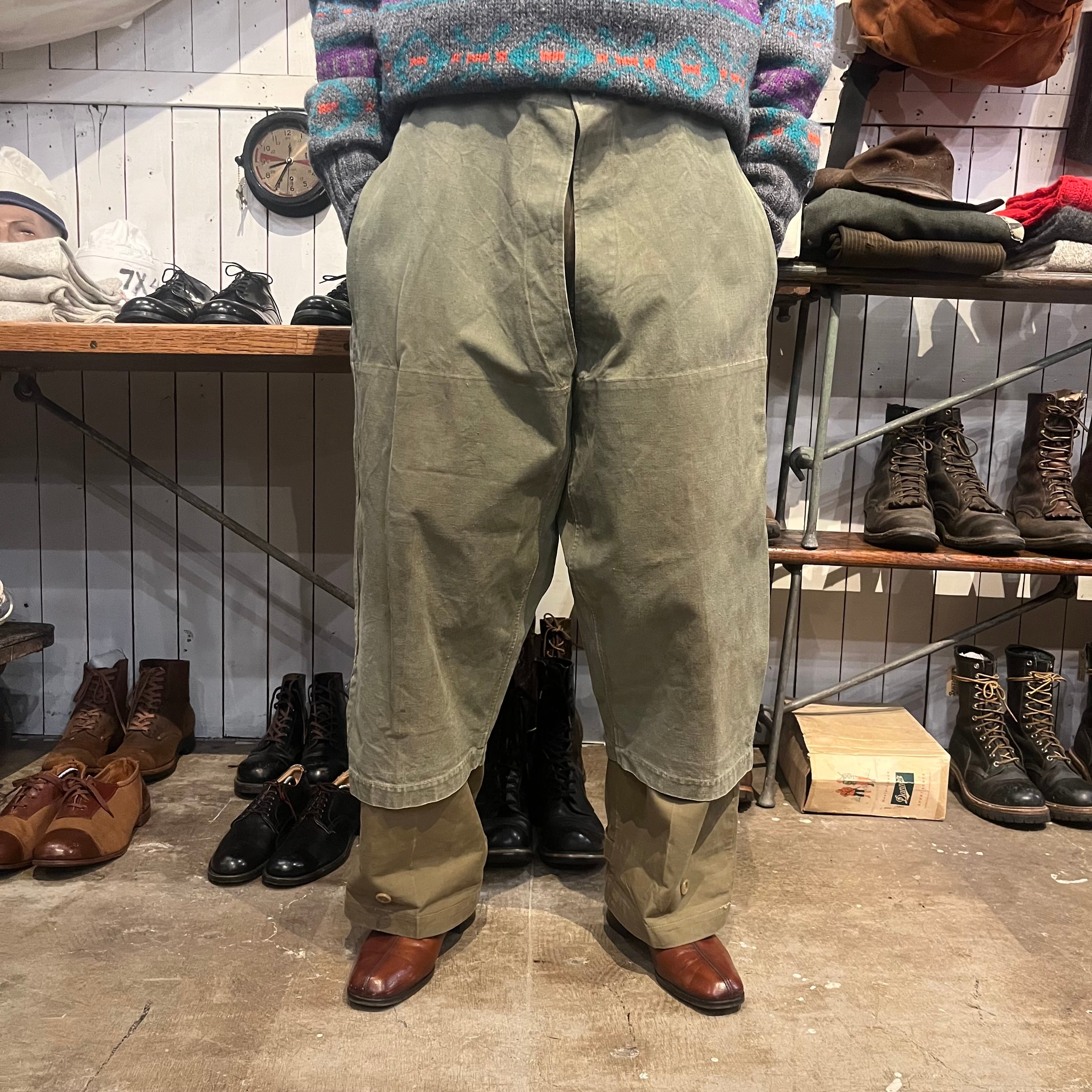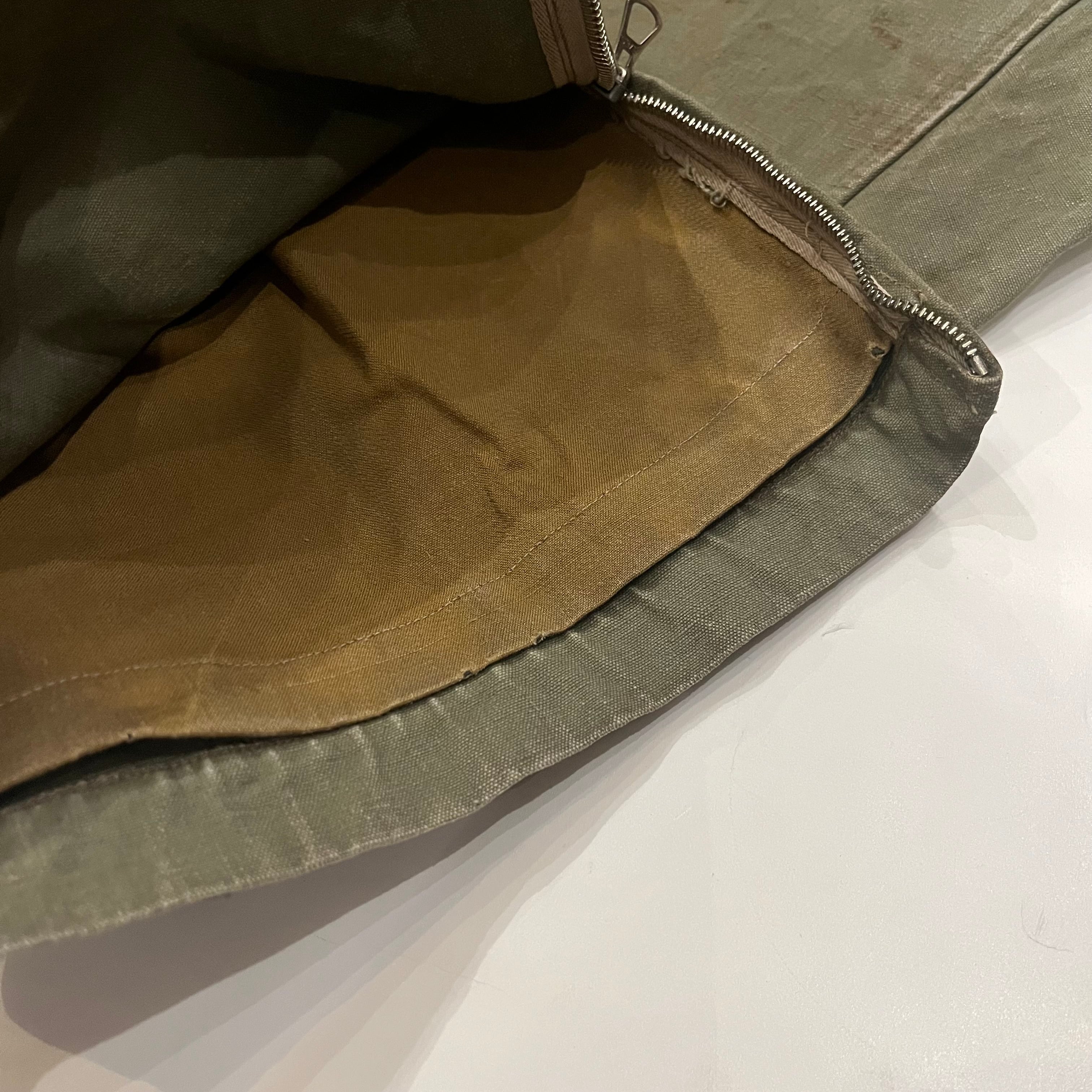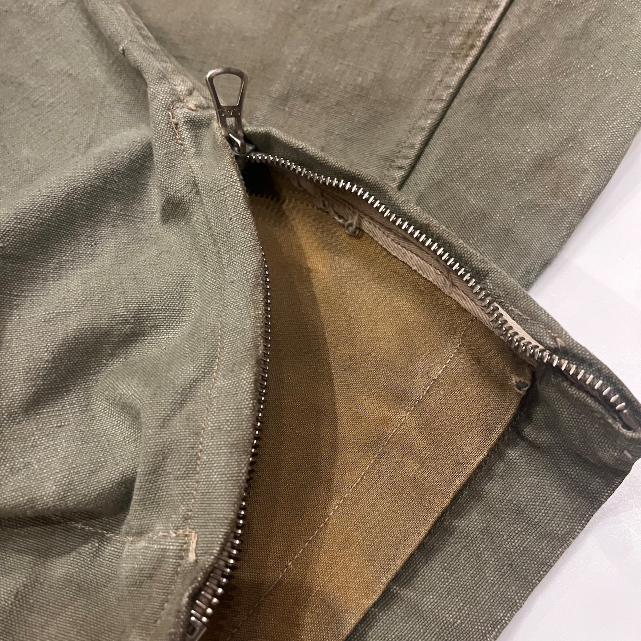 フランスからjacques marautのコットンチャップスになります。丁寧に細部にこだわった一本になります。リングベルトなのでウエストの調整は自由が利きます。おそらく実際に作業では締めやすかったりと実際に使われていたであろう膝付近の汚れがとても良いです。太いパンツの上から履くにしても、裾のジップがあるのもありがたいですし、ファッション的にも魅せれるアイテムだと思います。裾のジップはSASジッパーです。良いオリーブのカラーで同系色に近いベージュのパンツで合わせてみましたが秋冬らしいカラーのアイテムでも合わせやすそうです。