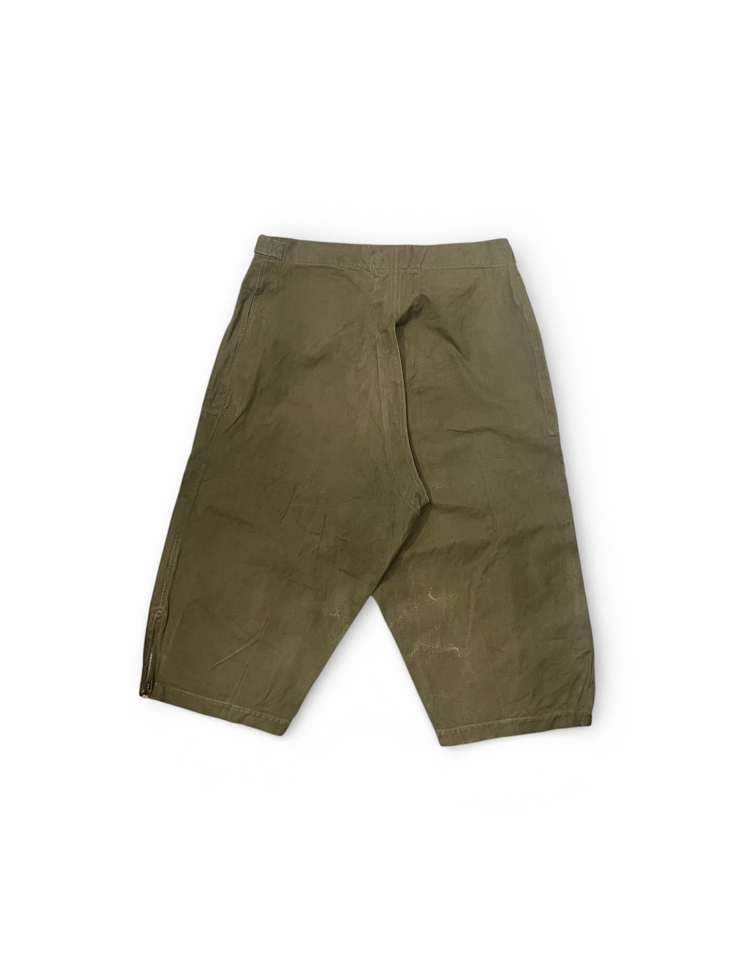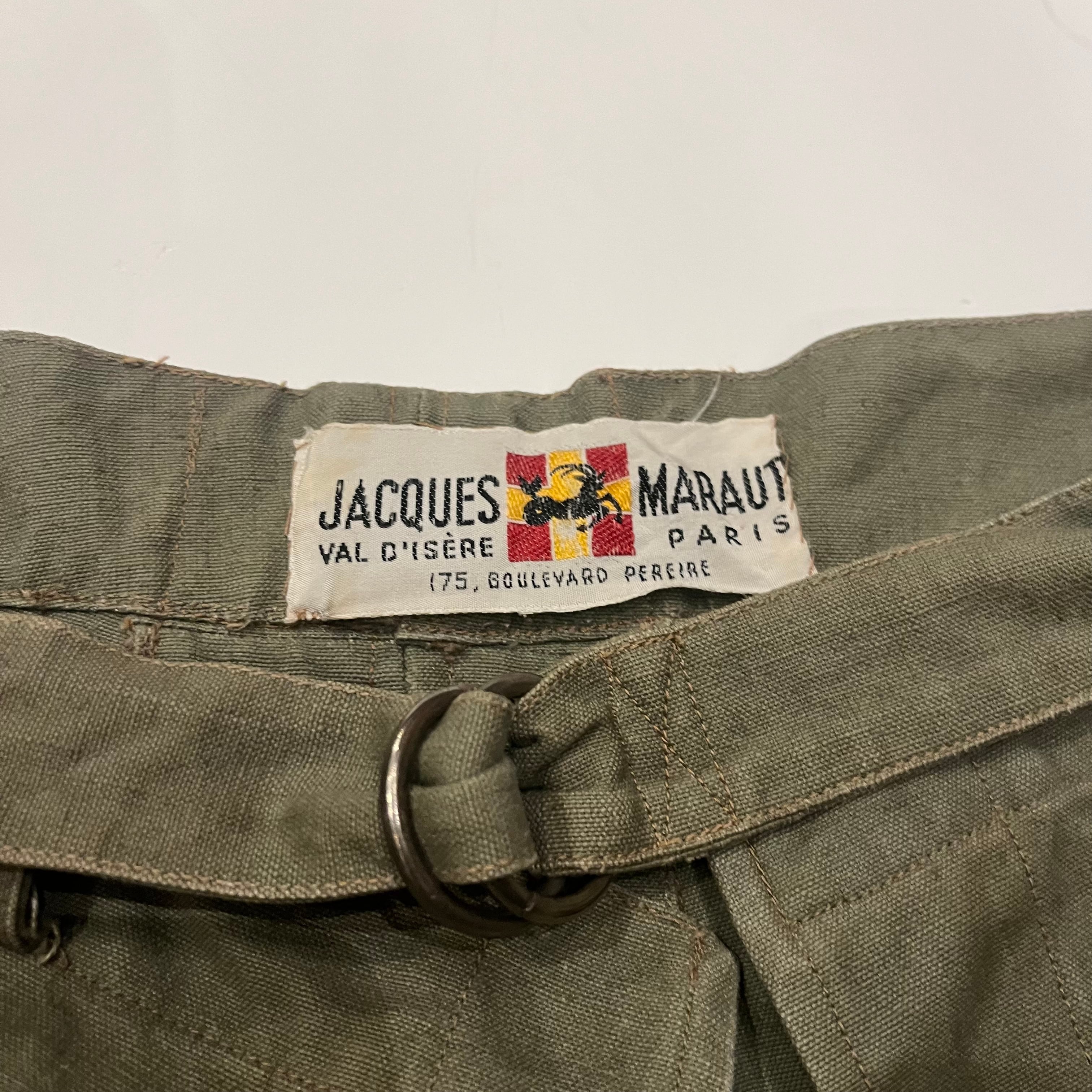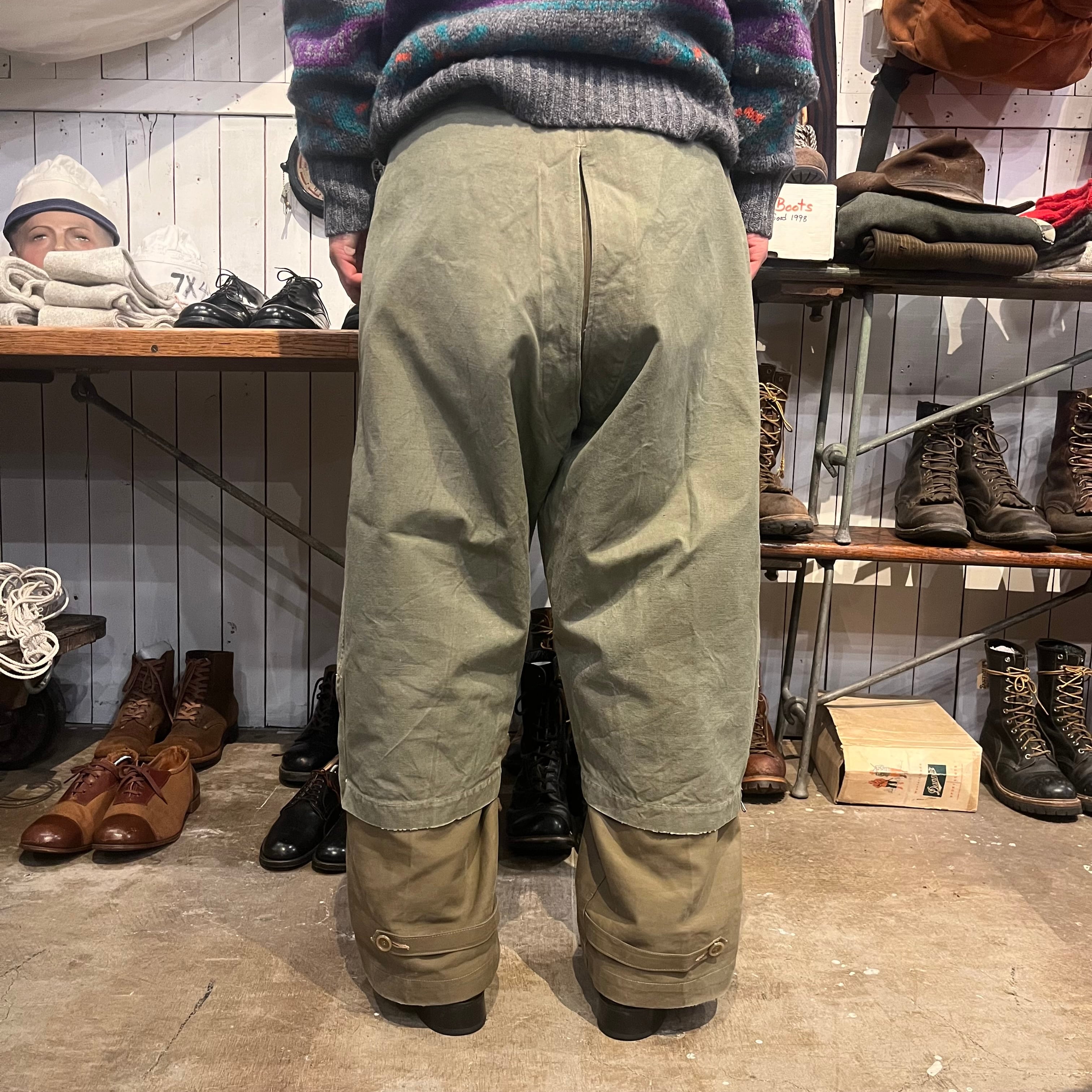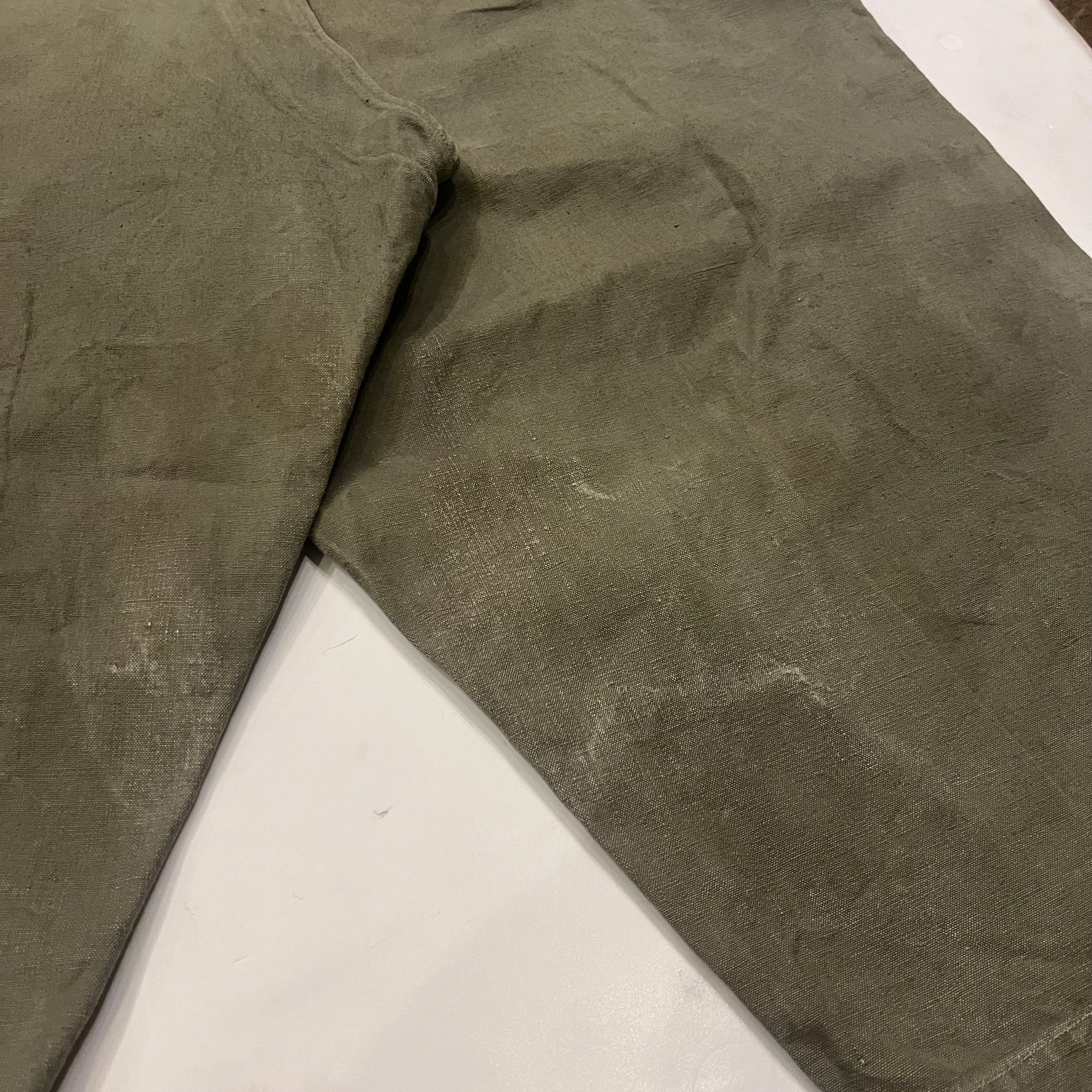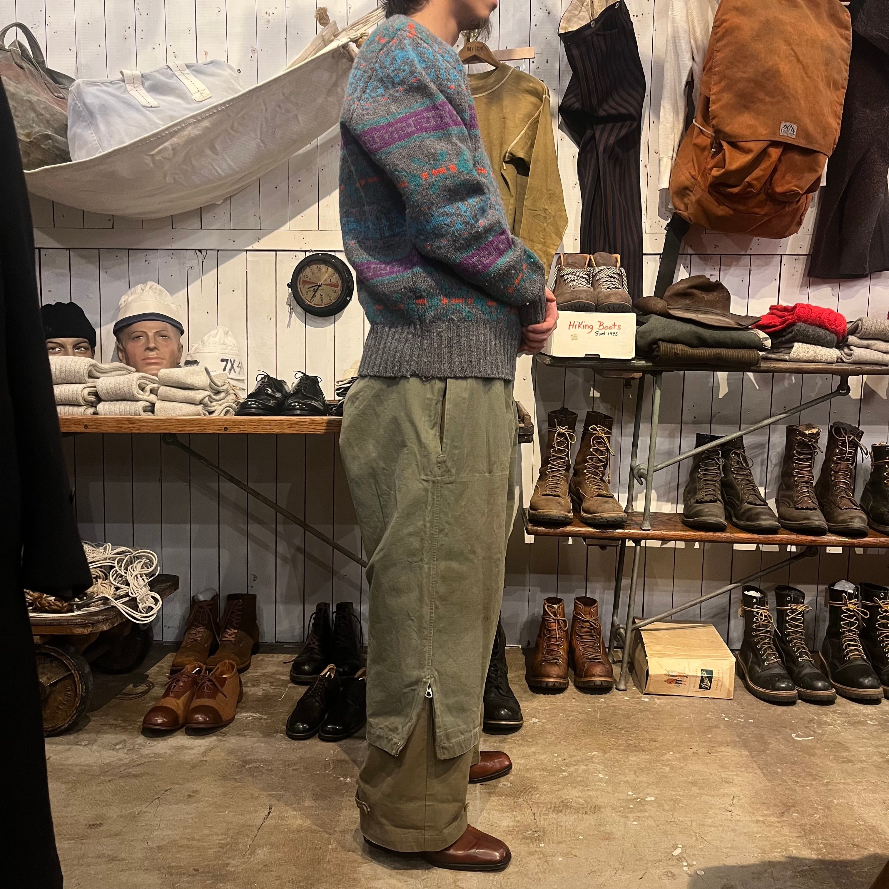 フランスからjacques marautのコットンチャップスになります。丁寧に細部にこだわった一本になります。リングベルトなのでウエストの調整は自由が利きます。おそらく実際に作業では締めやすかったりと実際に使われていたであろう膝付近の汚れがとても良いです。太いパンツの上から履くにしても、裾のジップがあるのもありがたいですし、ファッション的にも魅せれるアイテムだと思います。裾のジップはSASジッパーです。良いオリーブのカラーで同系色に近いベージュのパンツで合わせてみましたが秋冬らしいカラーのアイテムでも合わせやすそうです。