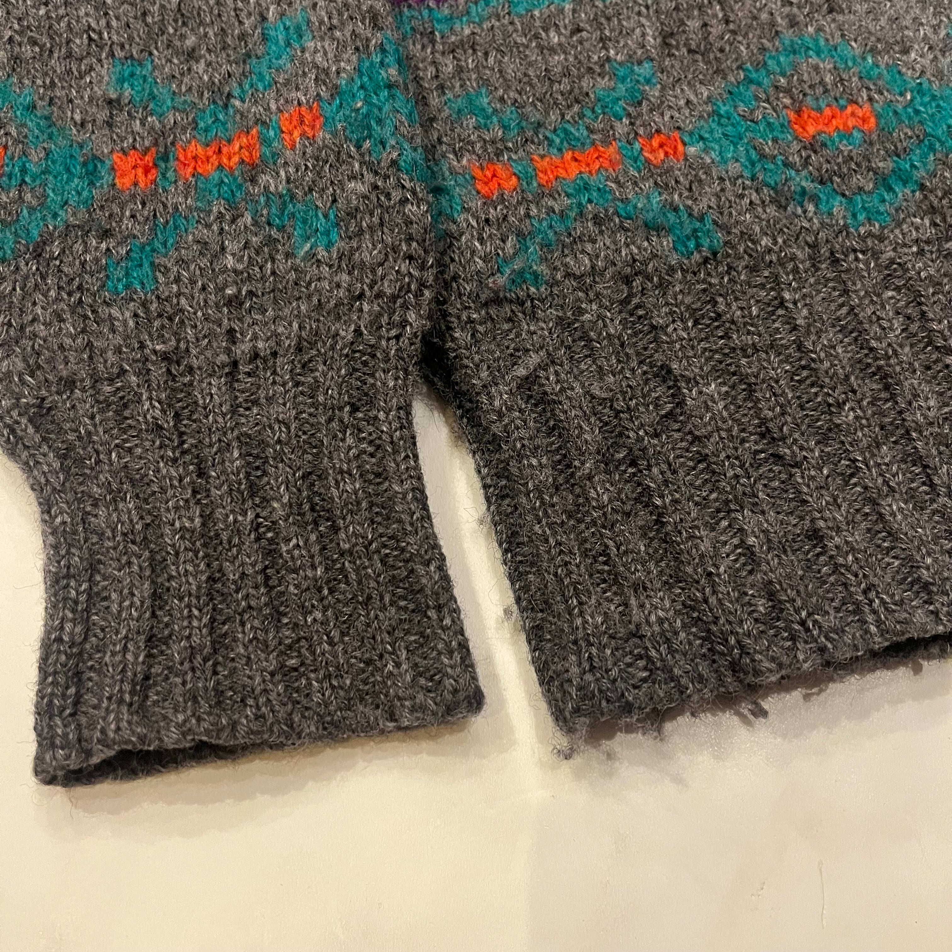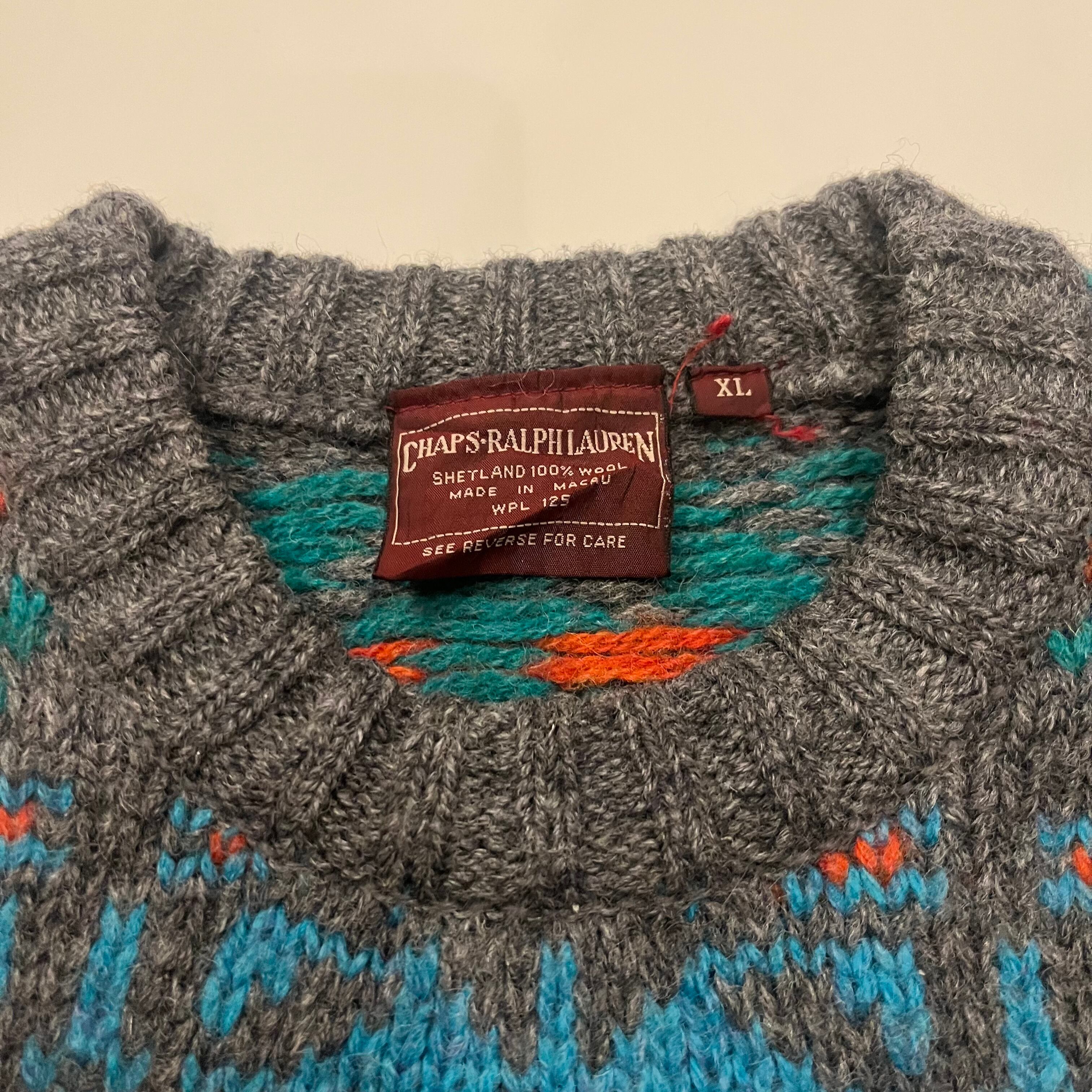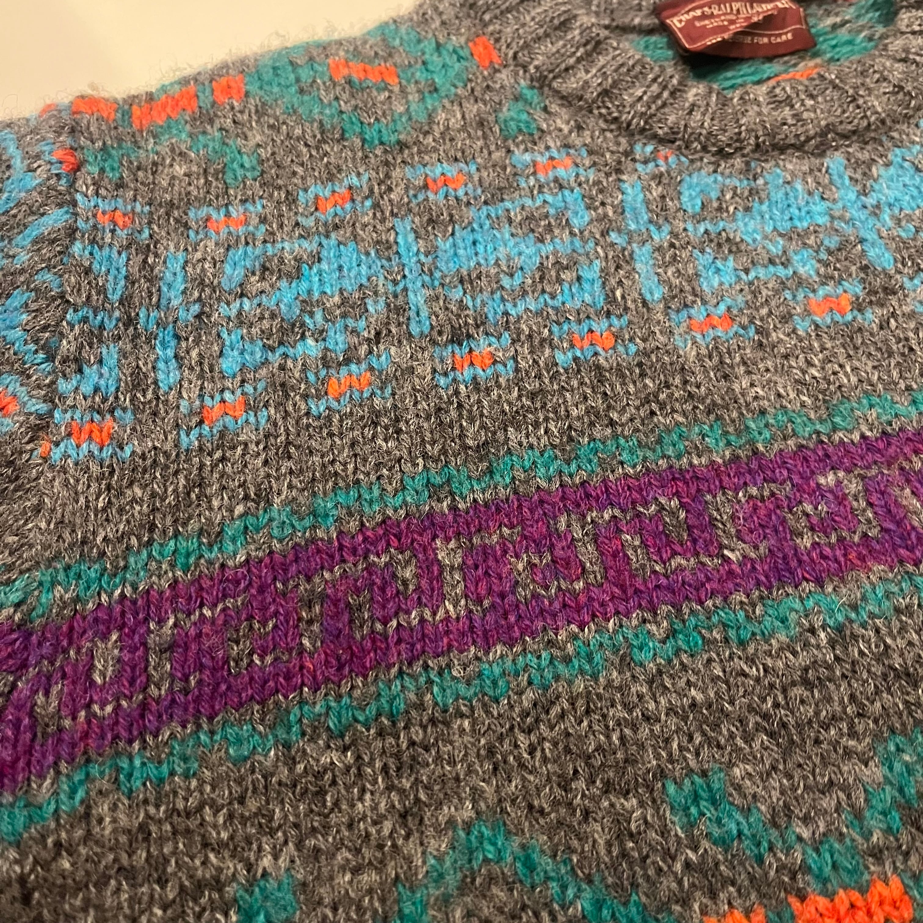 チャップスラルフローレンからシェットランドウールのニットになります。80年代頃のアイテムになります。綺麗な幾何学模様のデザイン。グレーが主なカラーでパープル、ライトブルー、オレンジも少し入ったカラフルな配色ですがパキッとした色味が少ないため全体的にまとまったデザインかと思います。80年代頃のアイテムらしい気軽に今着れるアイテムかと思います。