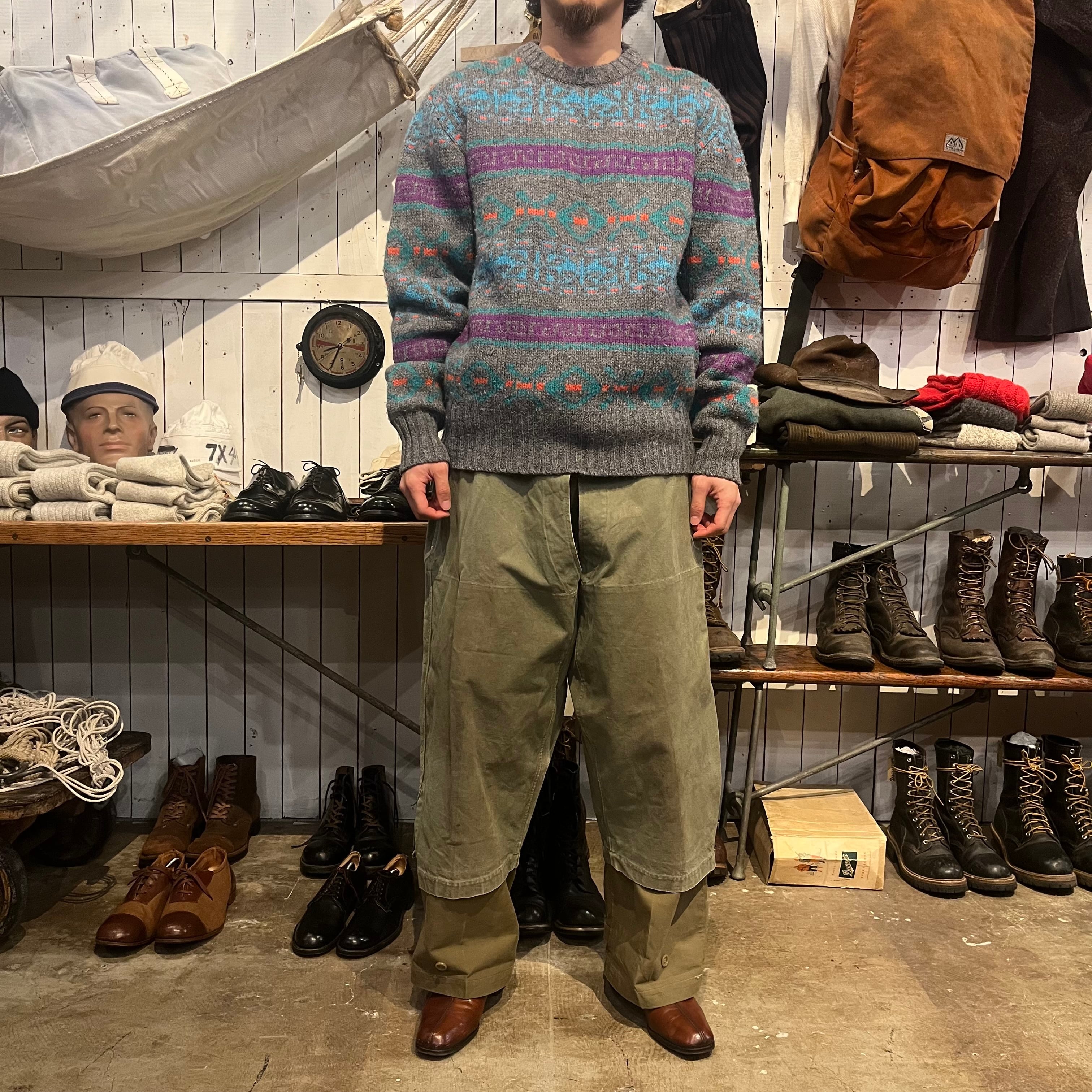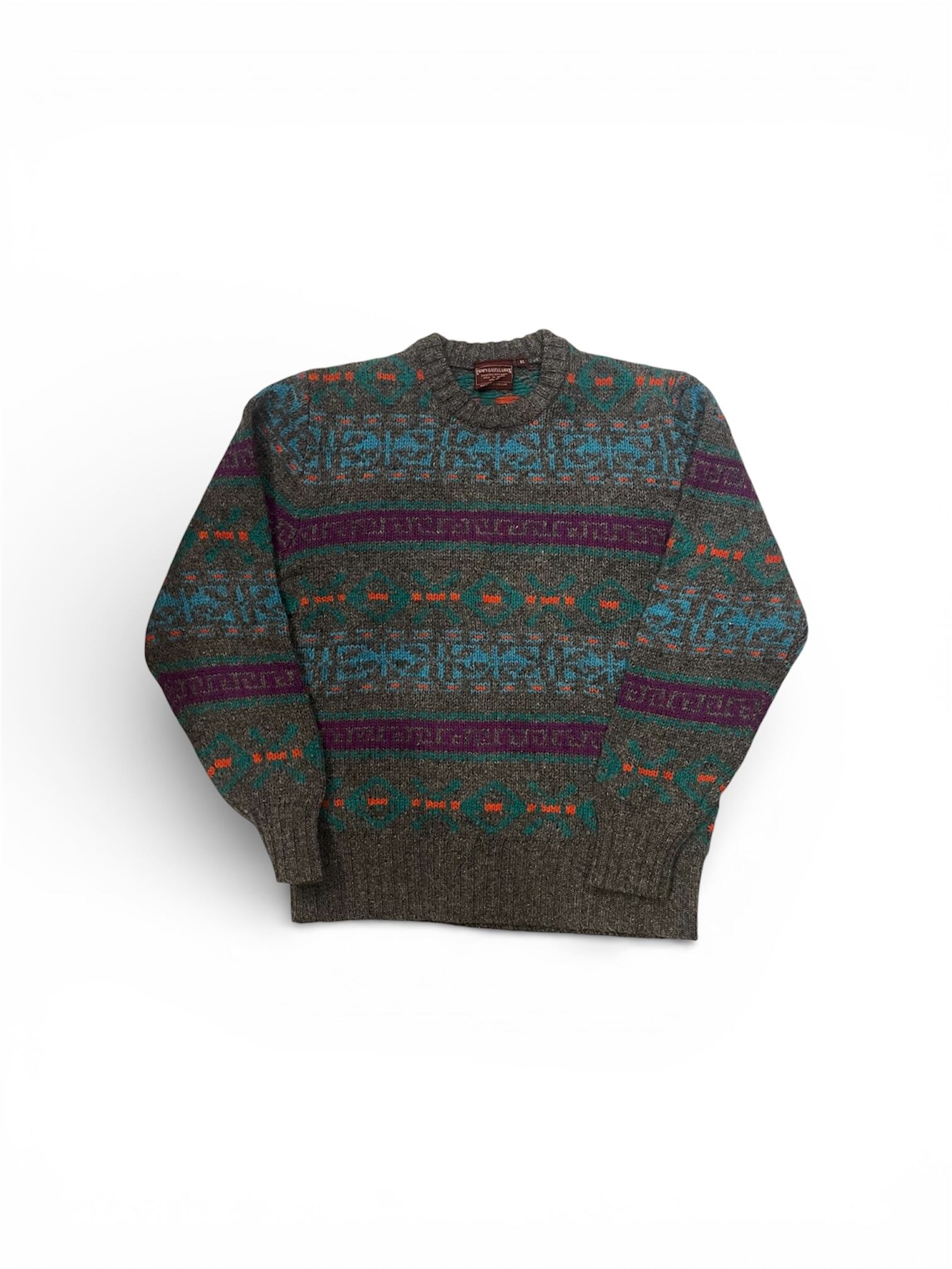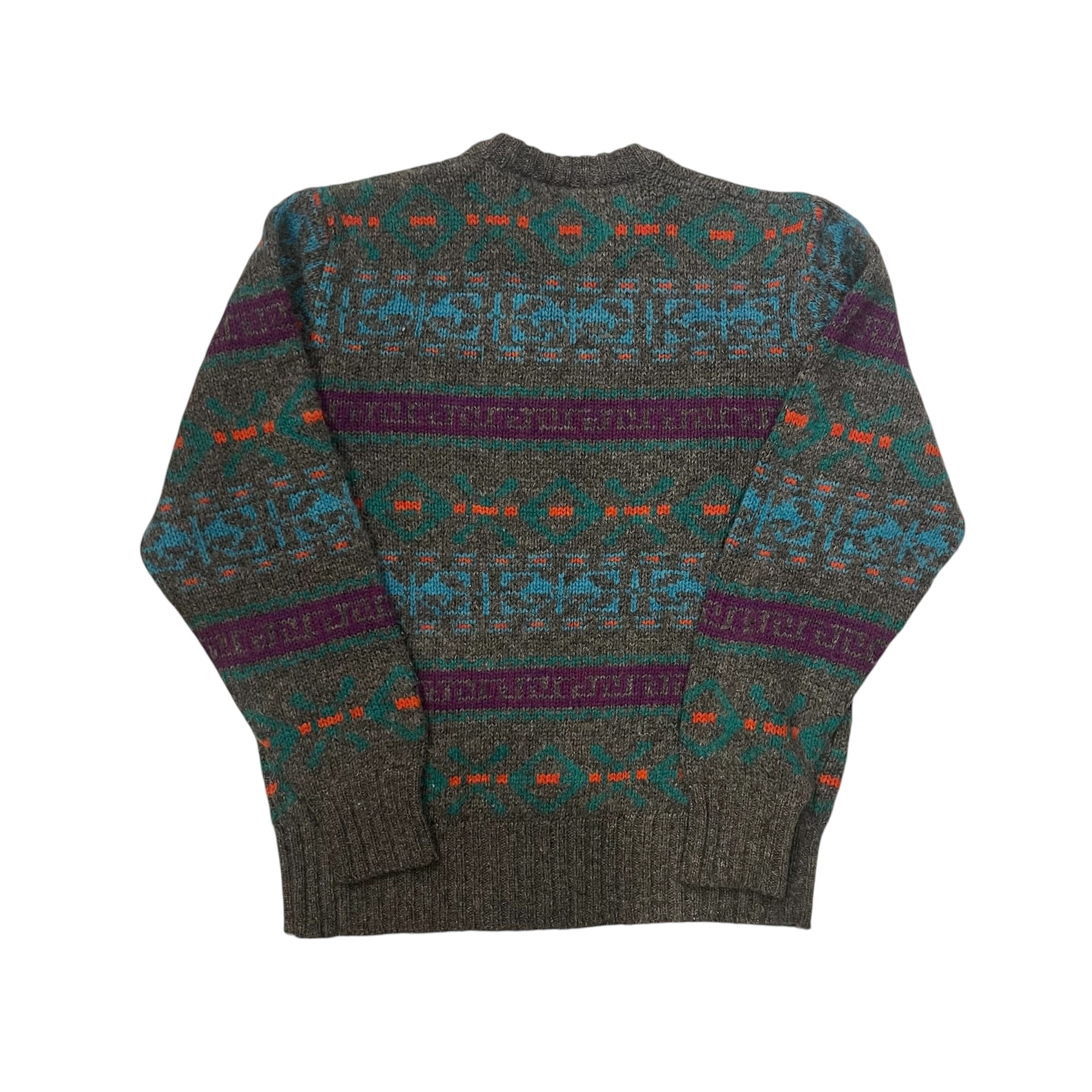 チャップスラルフローレンからシェットランドウールのニットになります。80年代頃のアイテムになります。綺麗な幾何学模様のデザイン。グレーが主なカラーでパープル、ライトブルー、オレンジも少し入ったカラフルな配色ですがパキッとした色味が少ないため全体的にまとまったデザインかと思います。80年代頃のアイテムらしい気軽に今着れるアイテムかと思います。
