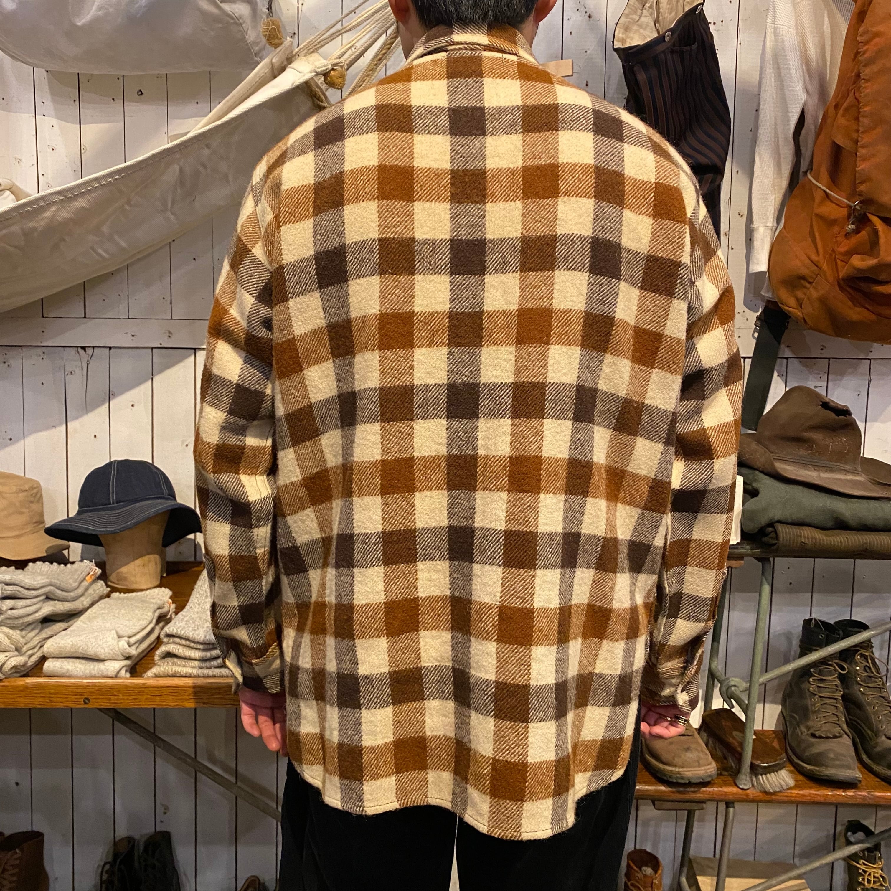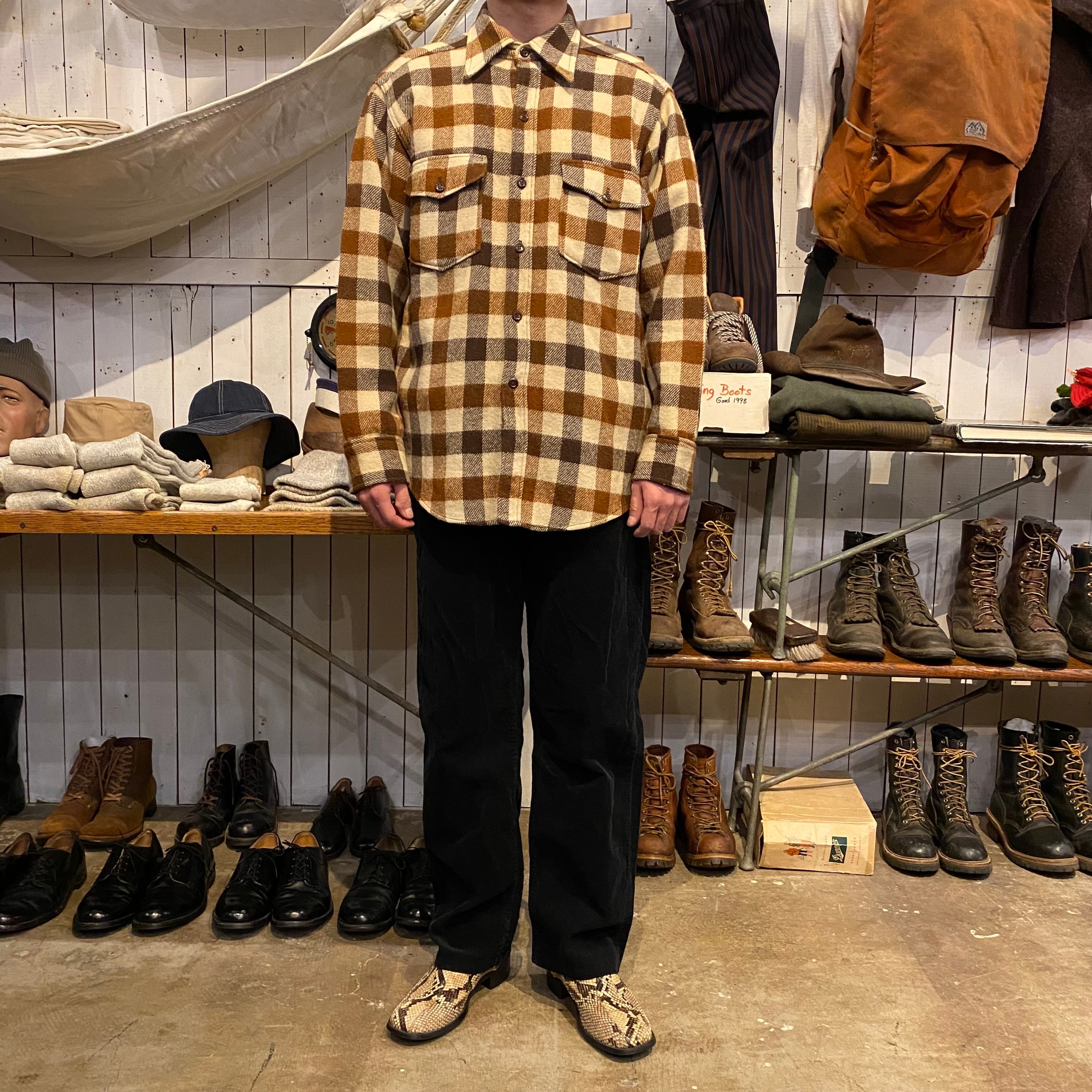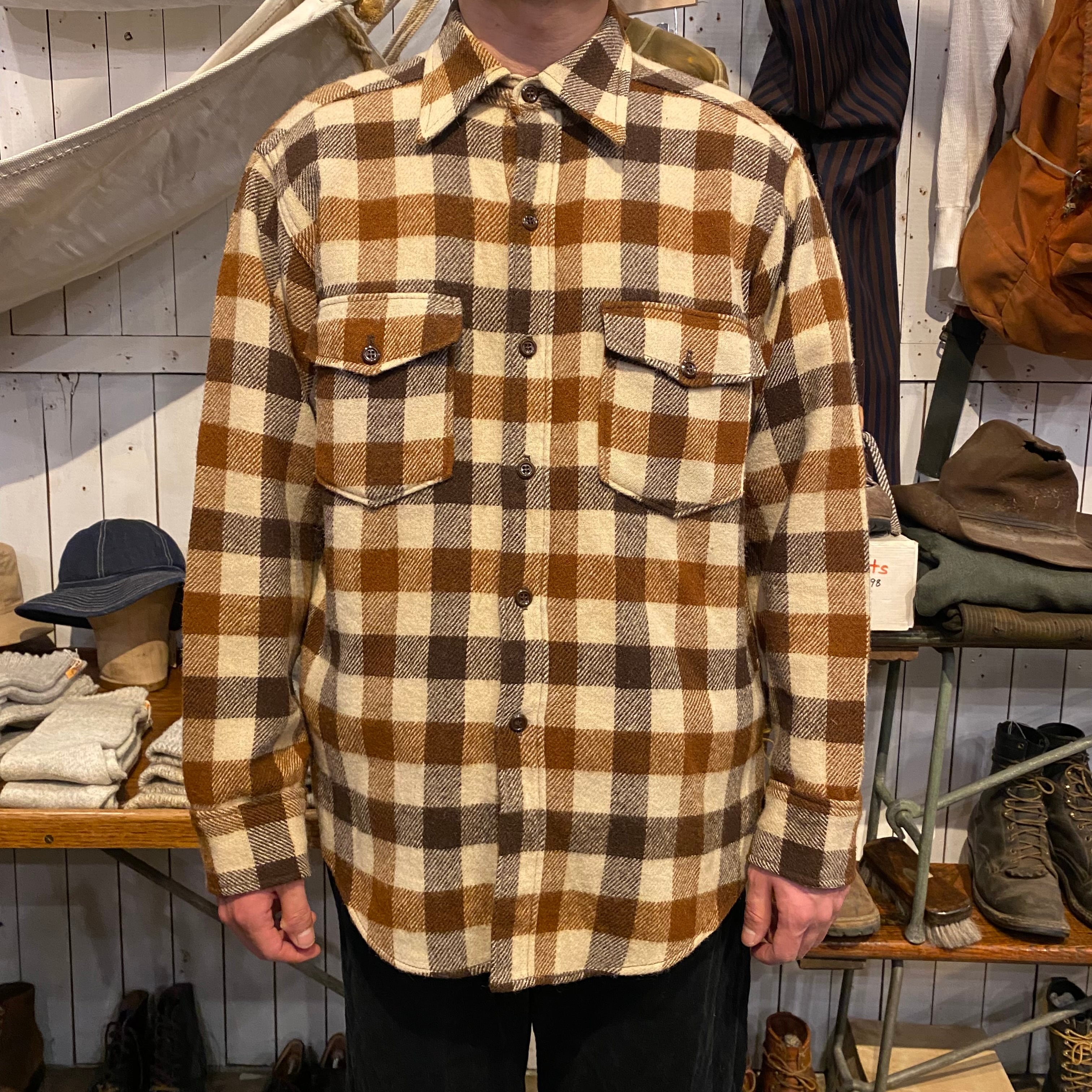 80年代頃のエディーバウアー、ブロックチェックのウールシャツになります。ブラウンベースのこの配色、良いです。裾がラウンドですが着丈が長すぎずバランスの良いサイズ感だと思います。ウールですが虫喰い穴などないグッドコンディションになります。