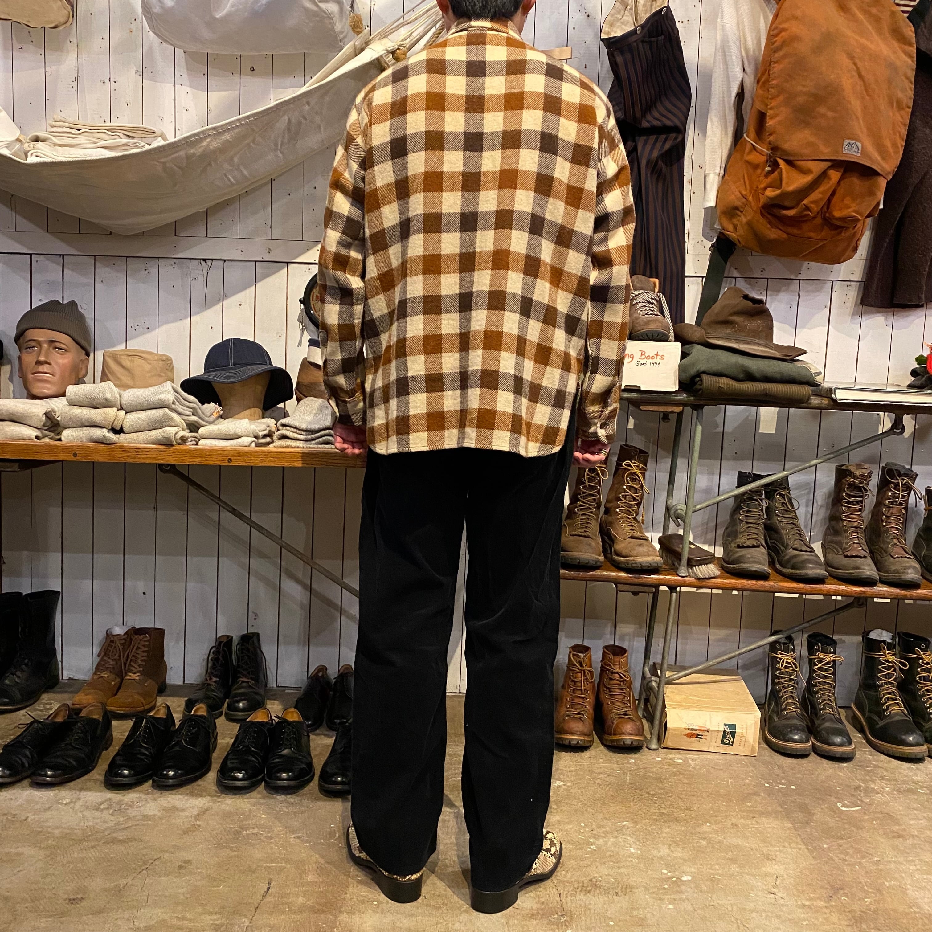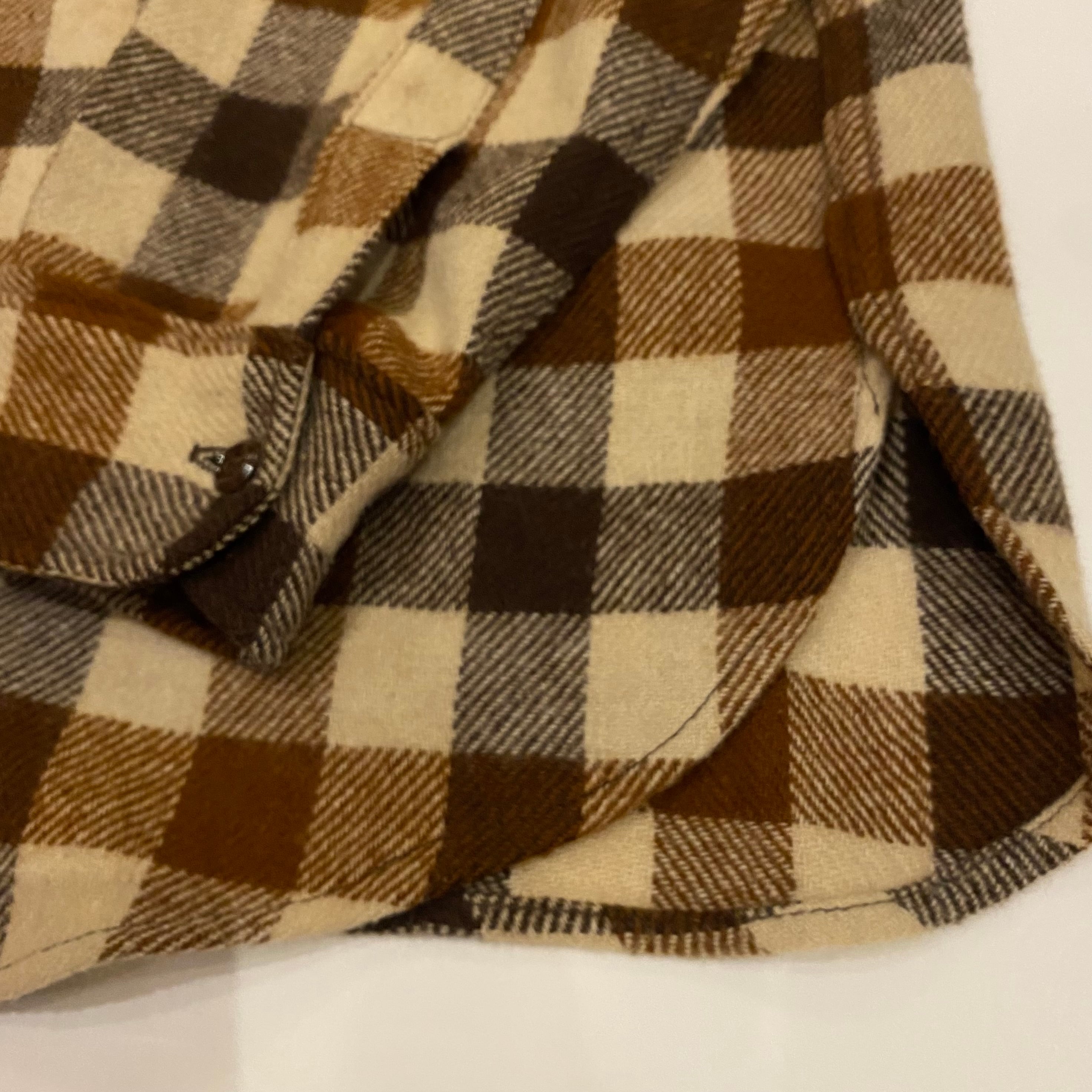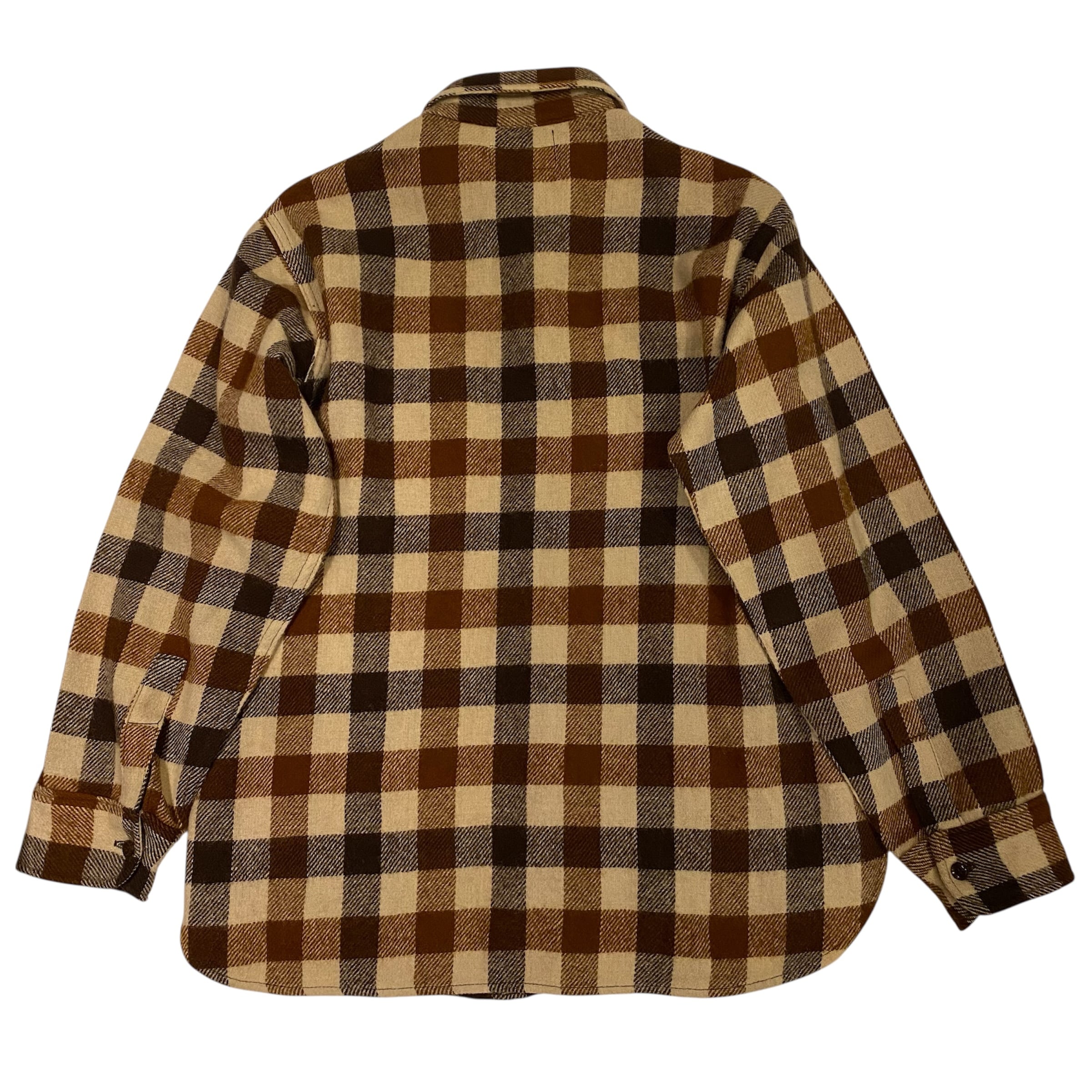 80年代頃のエディーバウアー、ブロックチェックのウールシャツになります。ブラウンベースのこの配色、良いです。裾がラウンドですが着丈が長すぎずバランスの良いサイズ感だと思います。ウールですが虫喰い穴などないグッドコンディションになります。