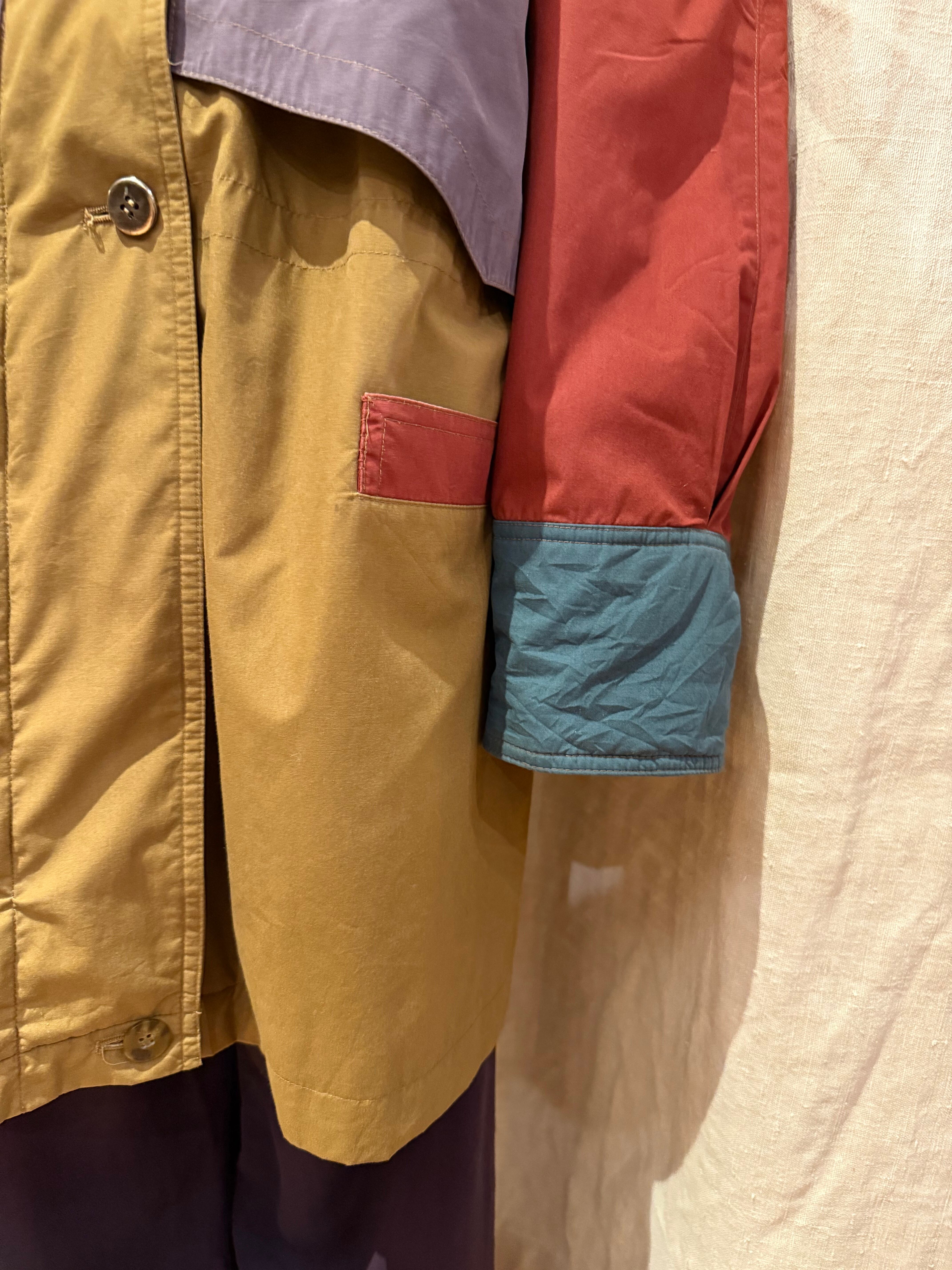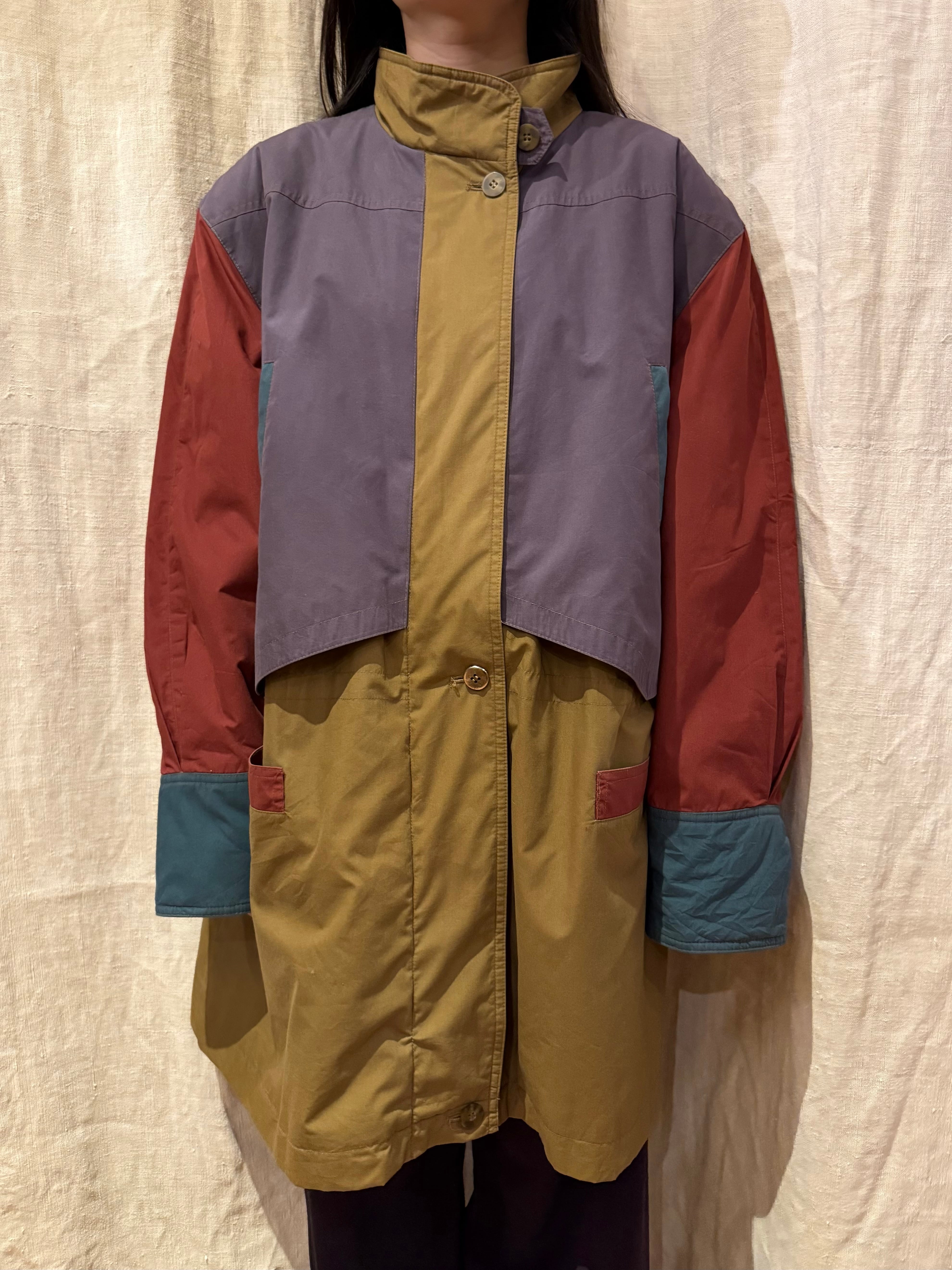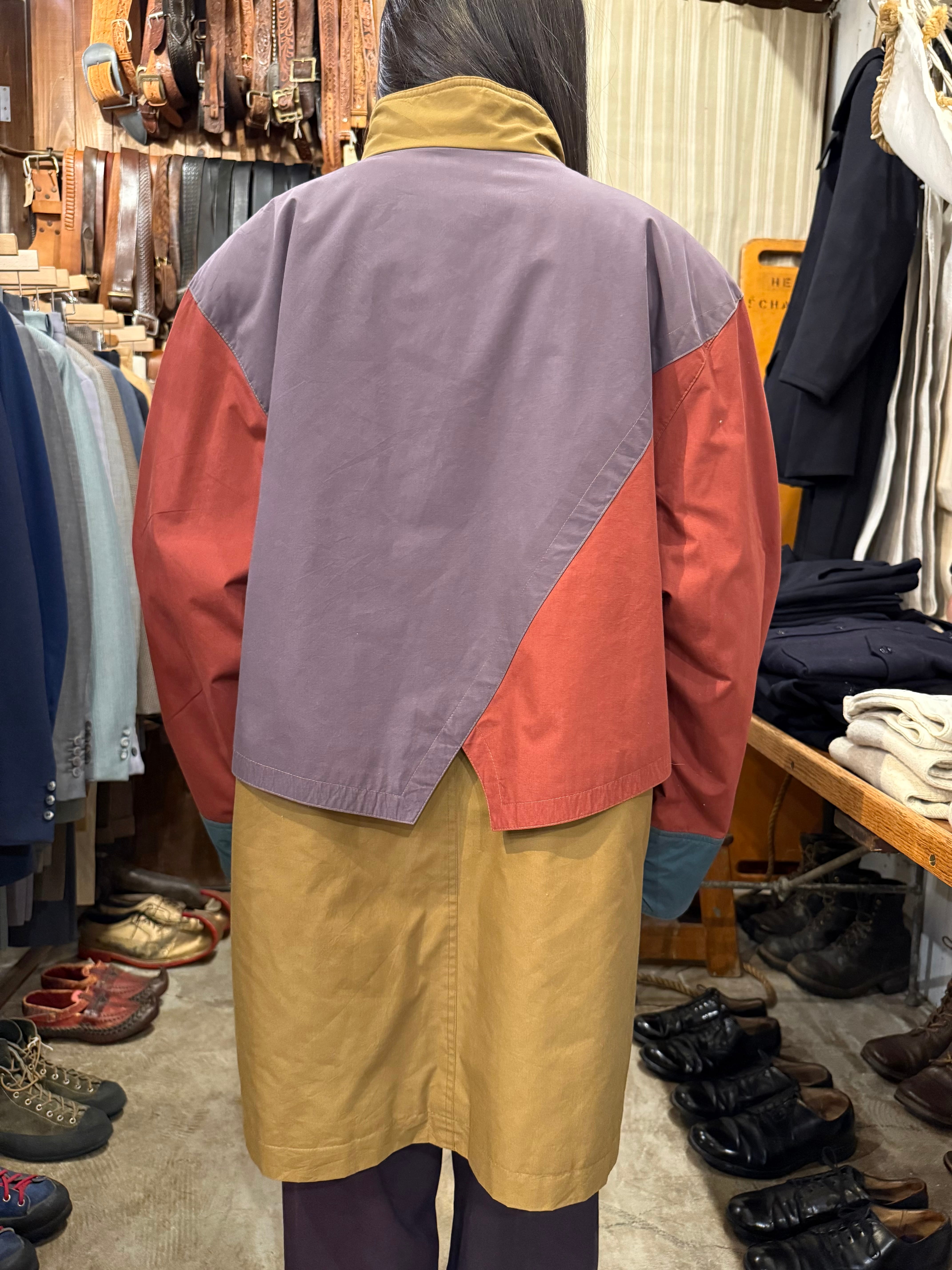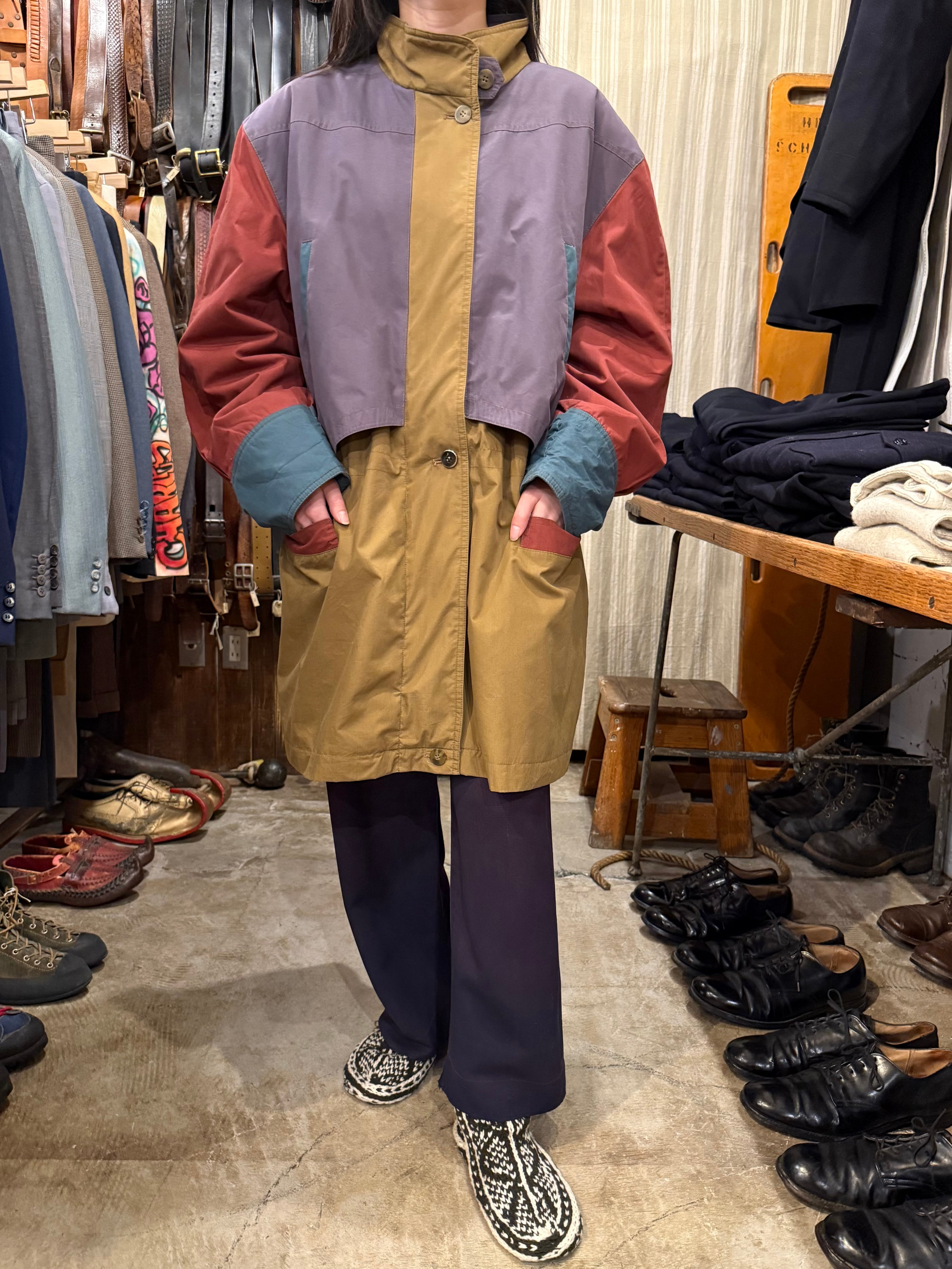 クレイジーパターンの中綿ジャケットでございます。暖かな着心地で全体的にくすみカラーで可愛らしく、大きめなサイズ感で男性の方でも着用可能です。ヨークの部分が特徴的でドローコードも付けられる仕様でデザイン製もある一着です。