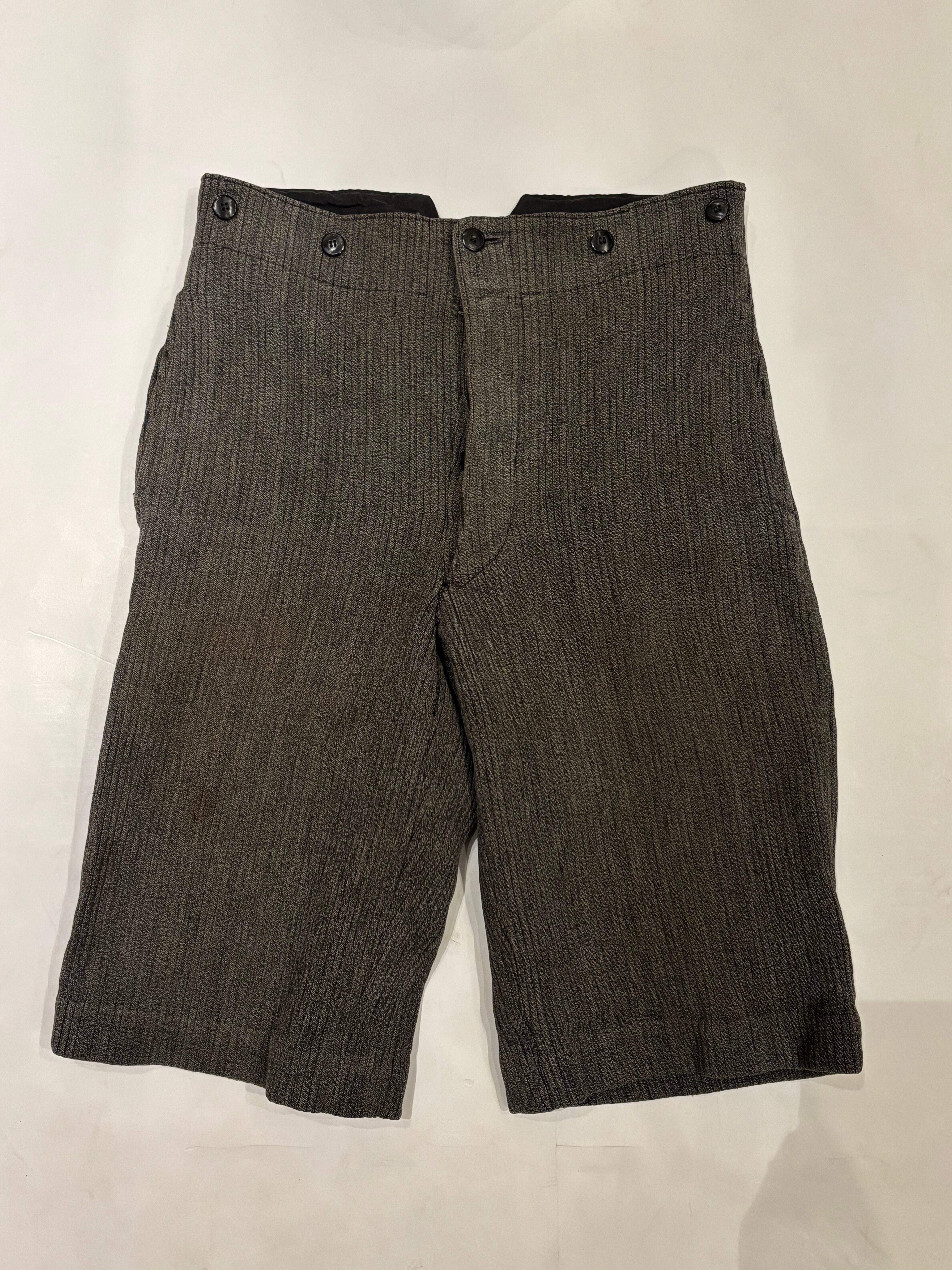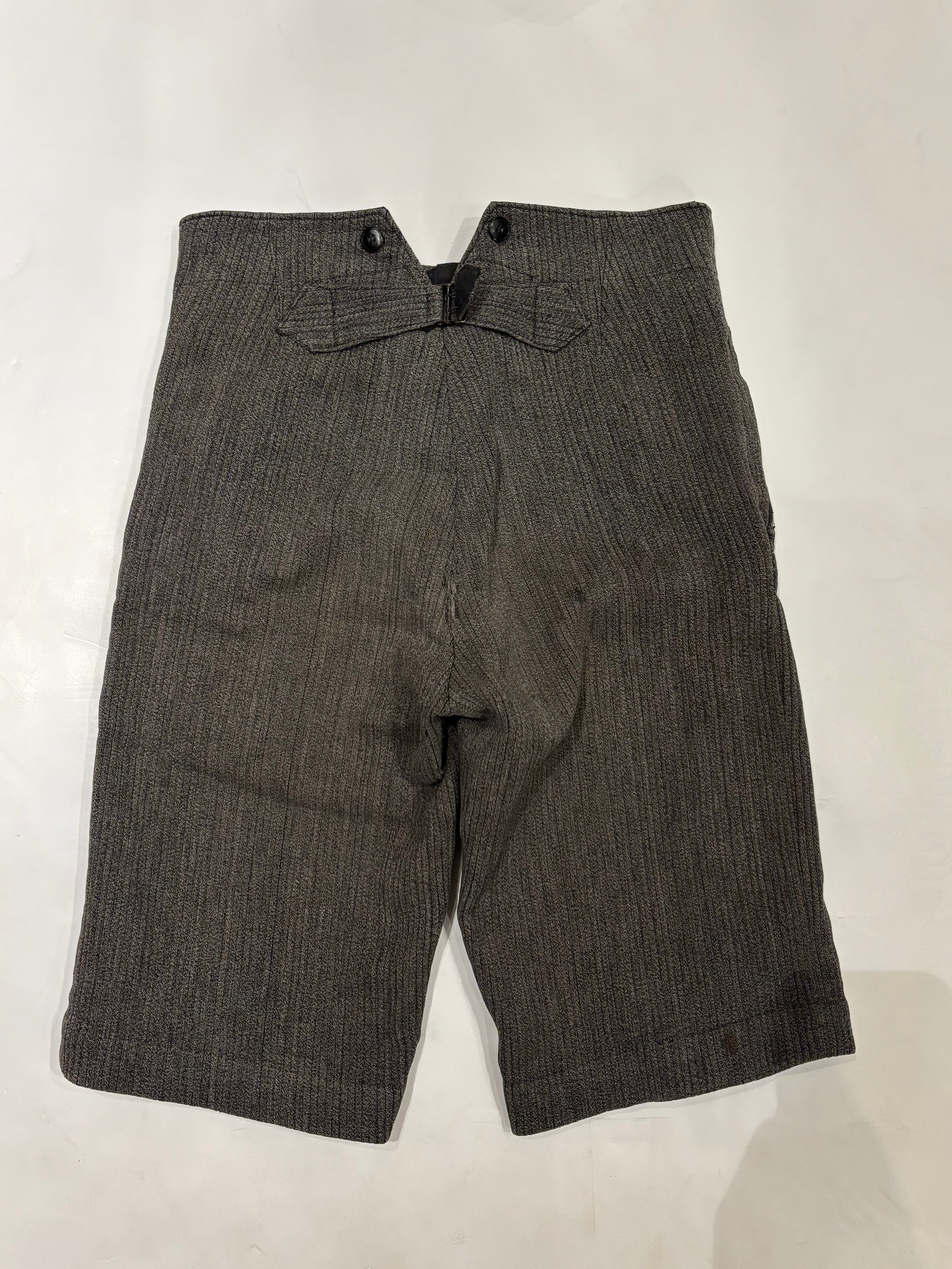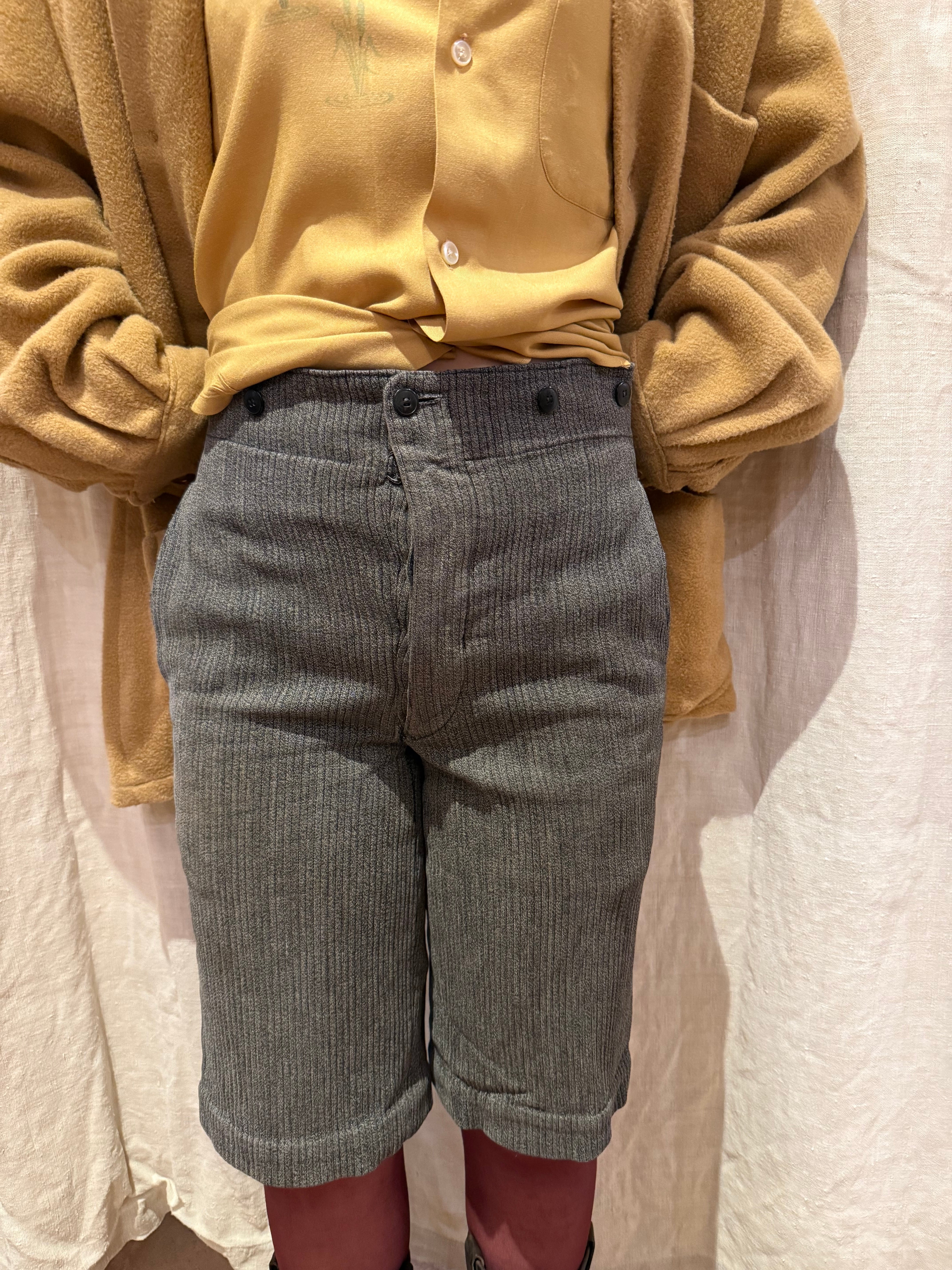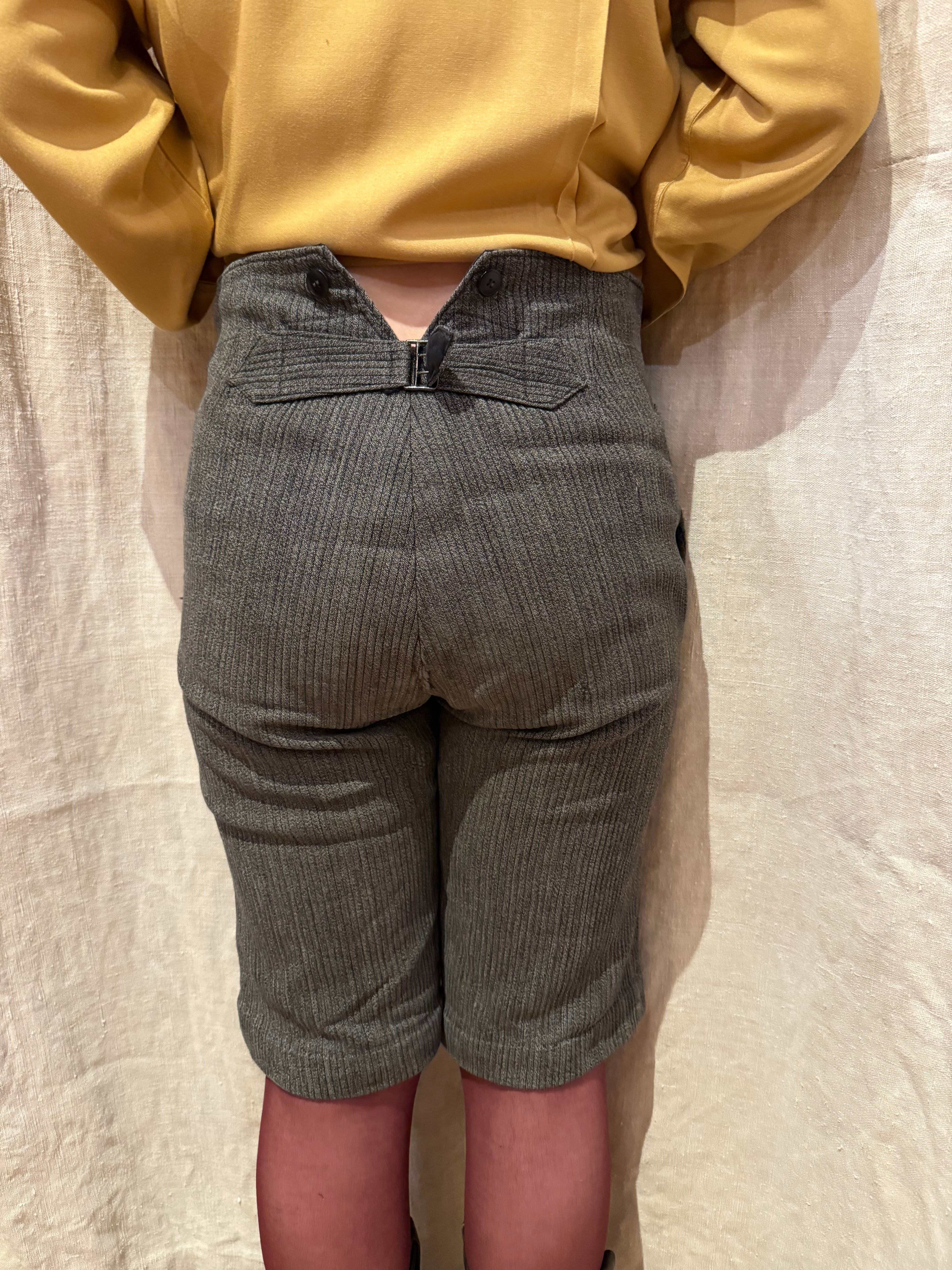 古いフレンチハンティングパンツです。ウエストはサスペンダーを付けられるデザインで、針刺しバックルがついています。太畝のピケで、厚さのあるしっかりとした質感の肌触り。ショート丈はオリジナルとなっております。今の時期はブーツやカラータイツと合わせても可愛らしいと思います。