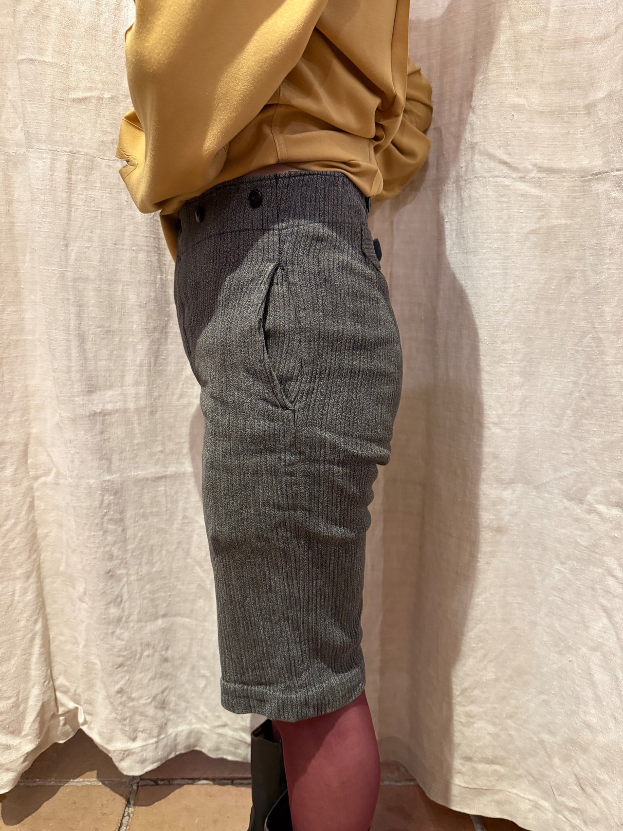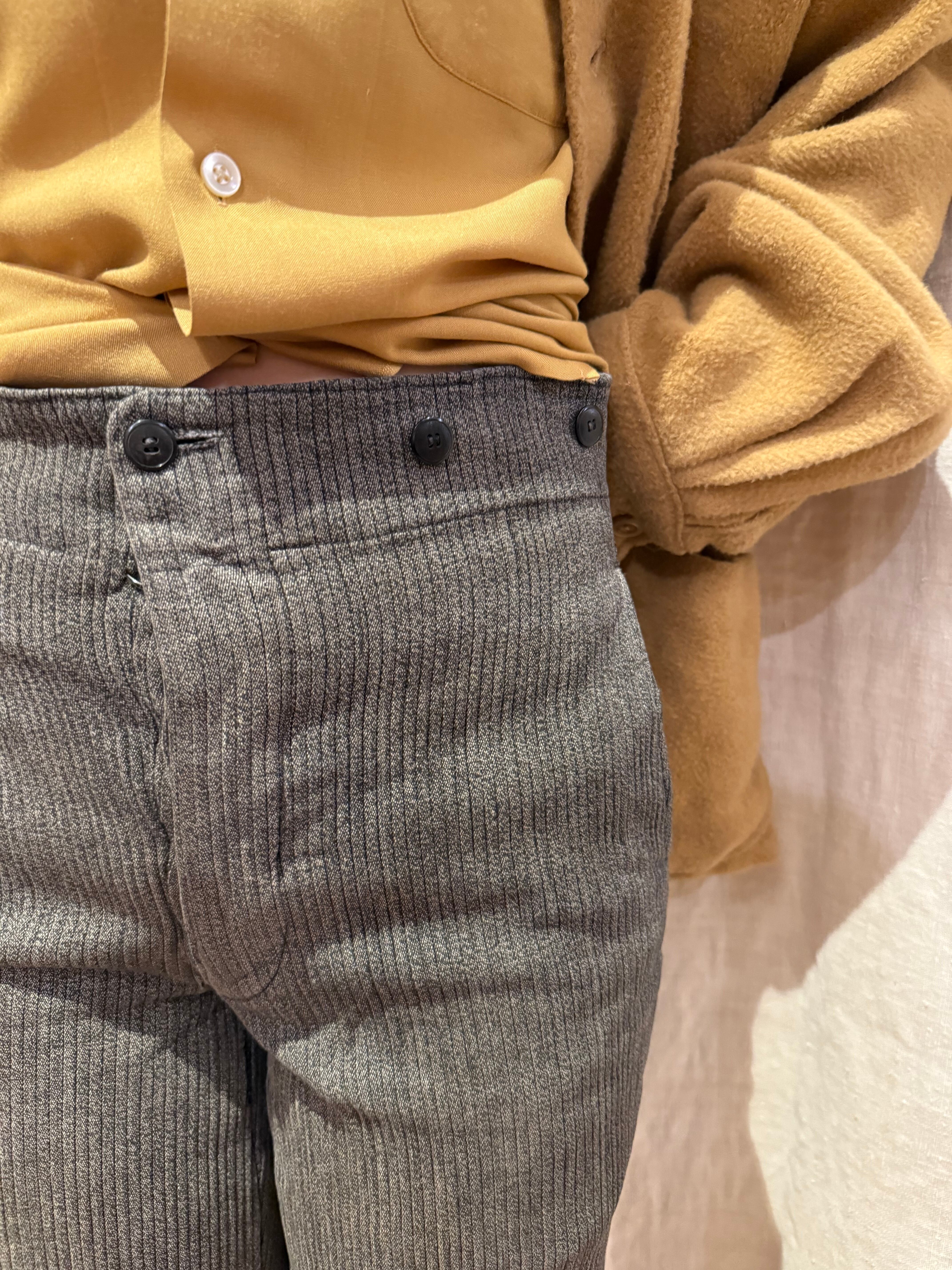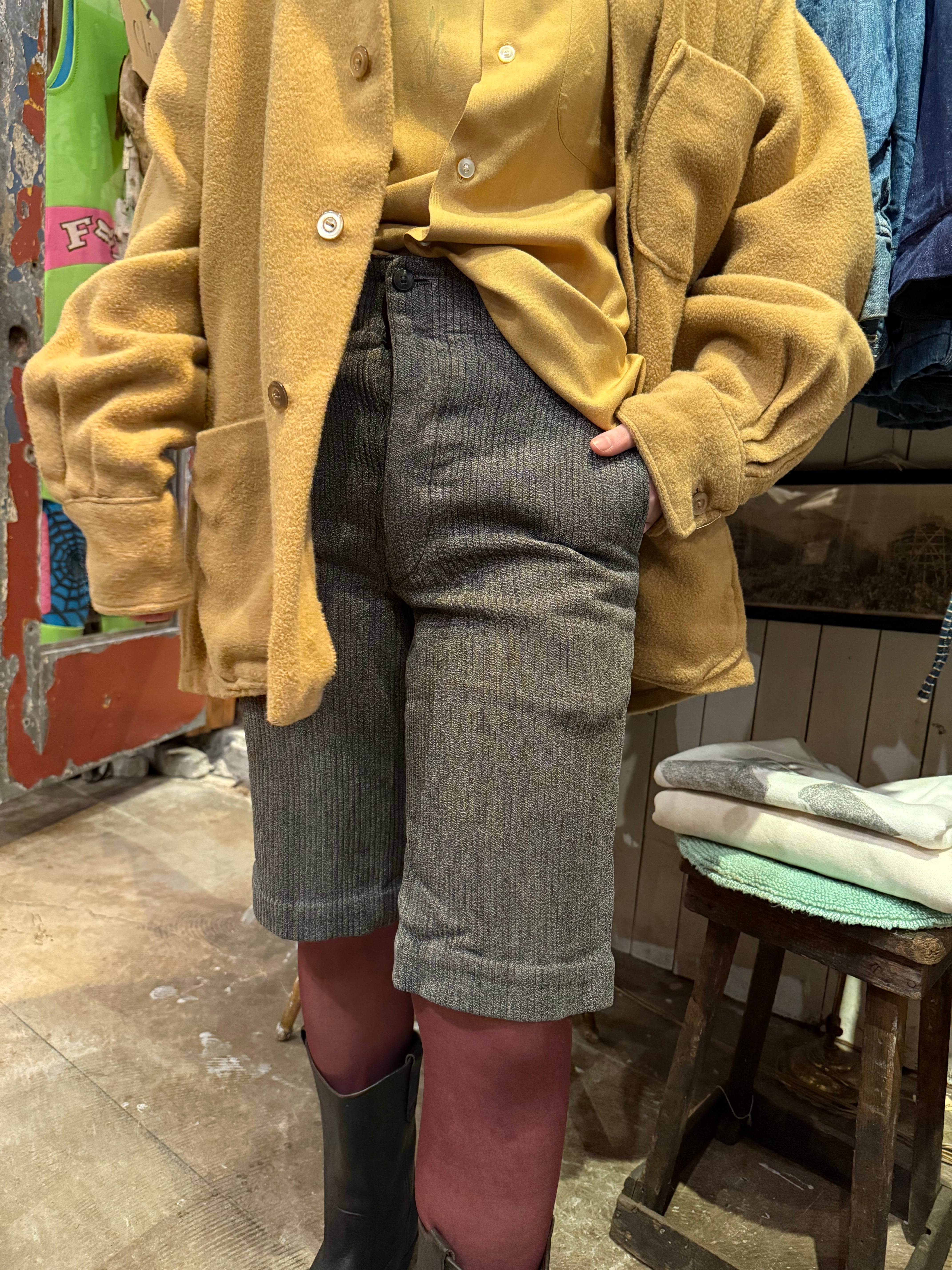 古いフレンチハンティングパンツです。ウエストはサスペンダーを付けられるデザインで、針刺しバックルがついています。太畝のピケで、厚さのあるしっかりとした質感の肌触り。ショート丈はオリジナルとなっております。今の時期はブーツやカラータイツと合わせても可愛らしいと思います。