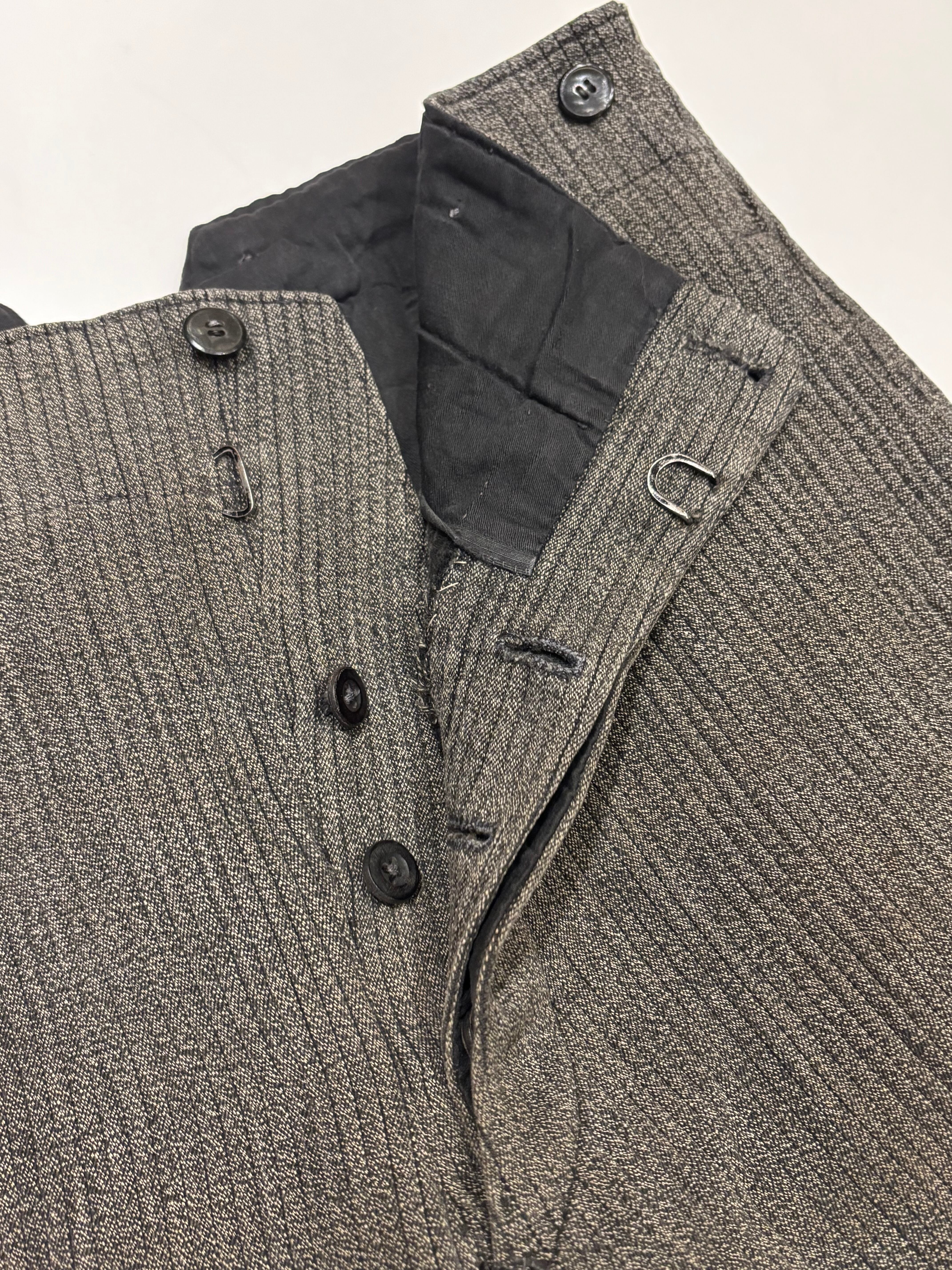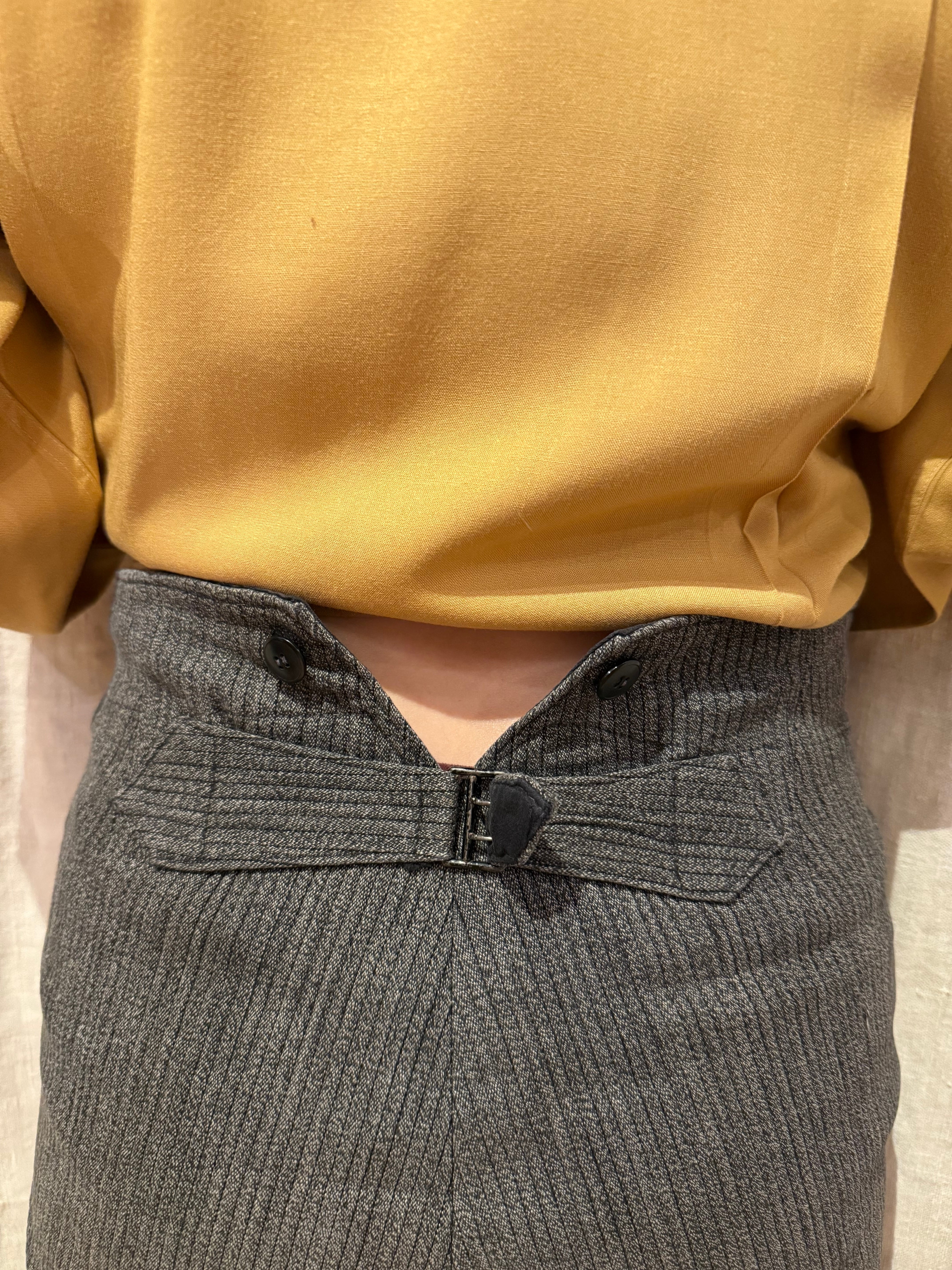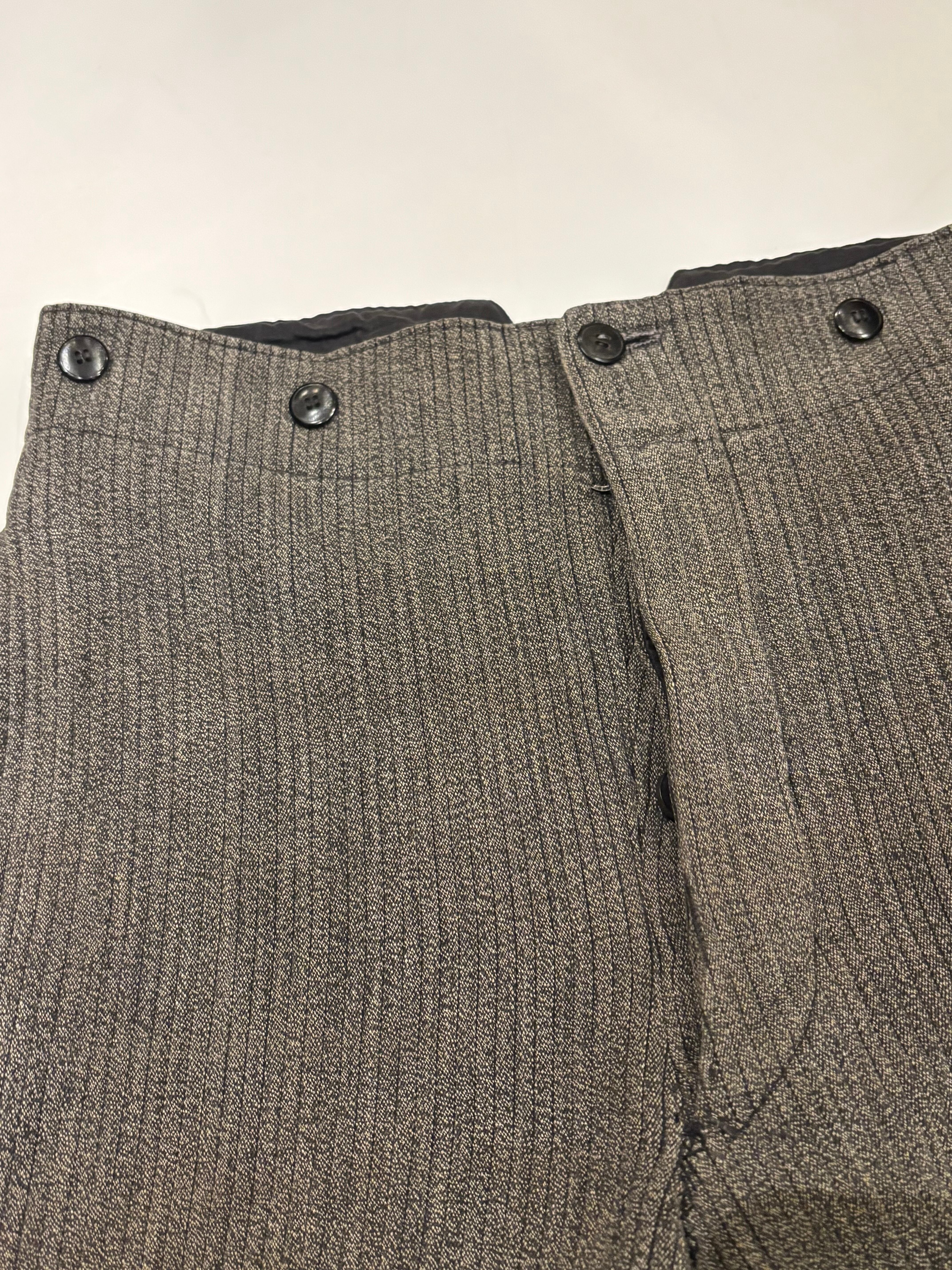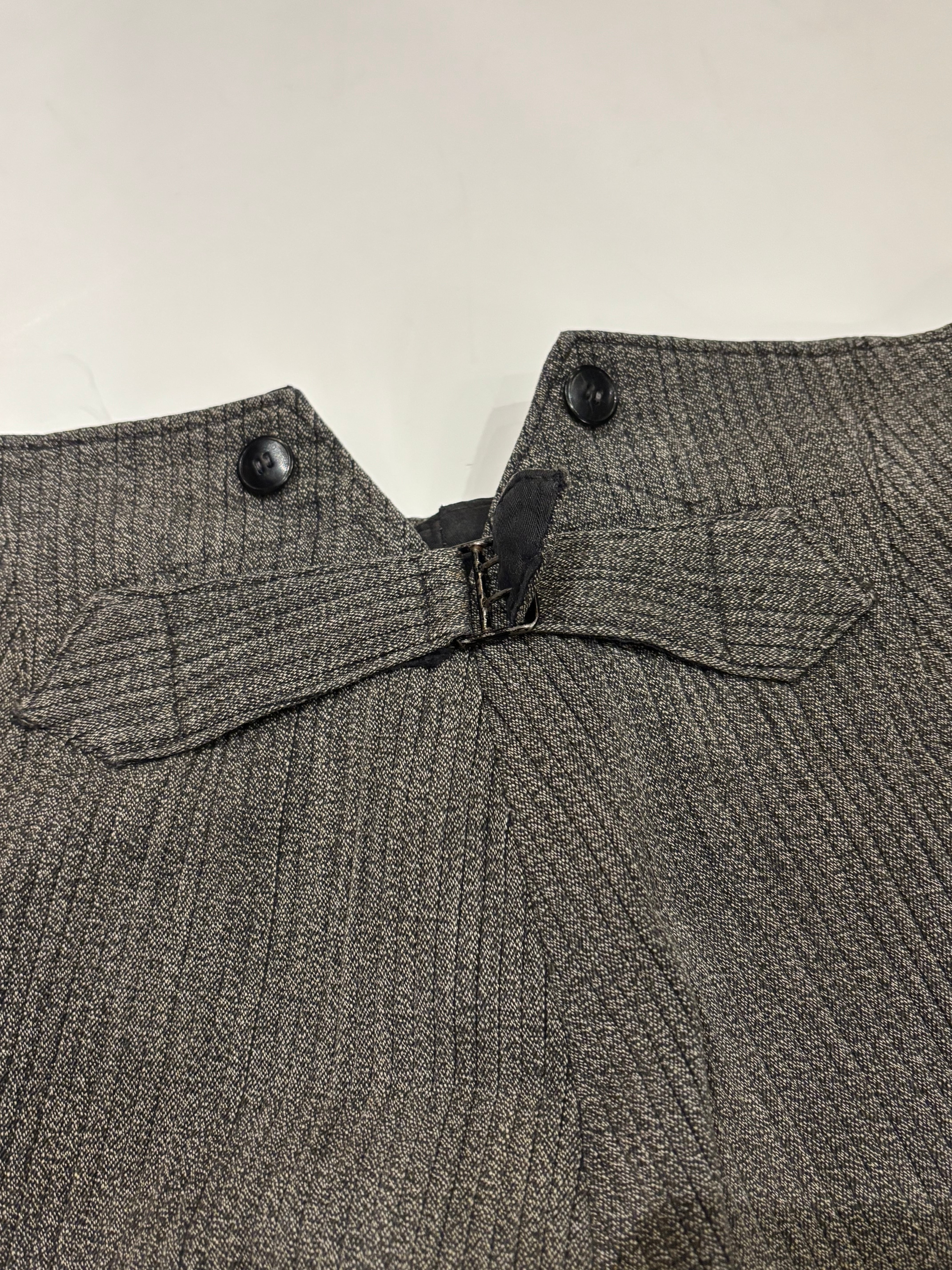 古いフレンチハンティングパンツです。ウエストはサスペンダーを付けられるデザインで、針刺しバックルがついています。太畝のピケで、厚さのあるしっかりとした質感の肌触り。ショート丈はオリジナルとなっております。今の時期はブーツやカラータイツと合わせても可愛らしいと思います。
