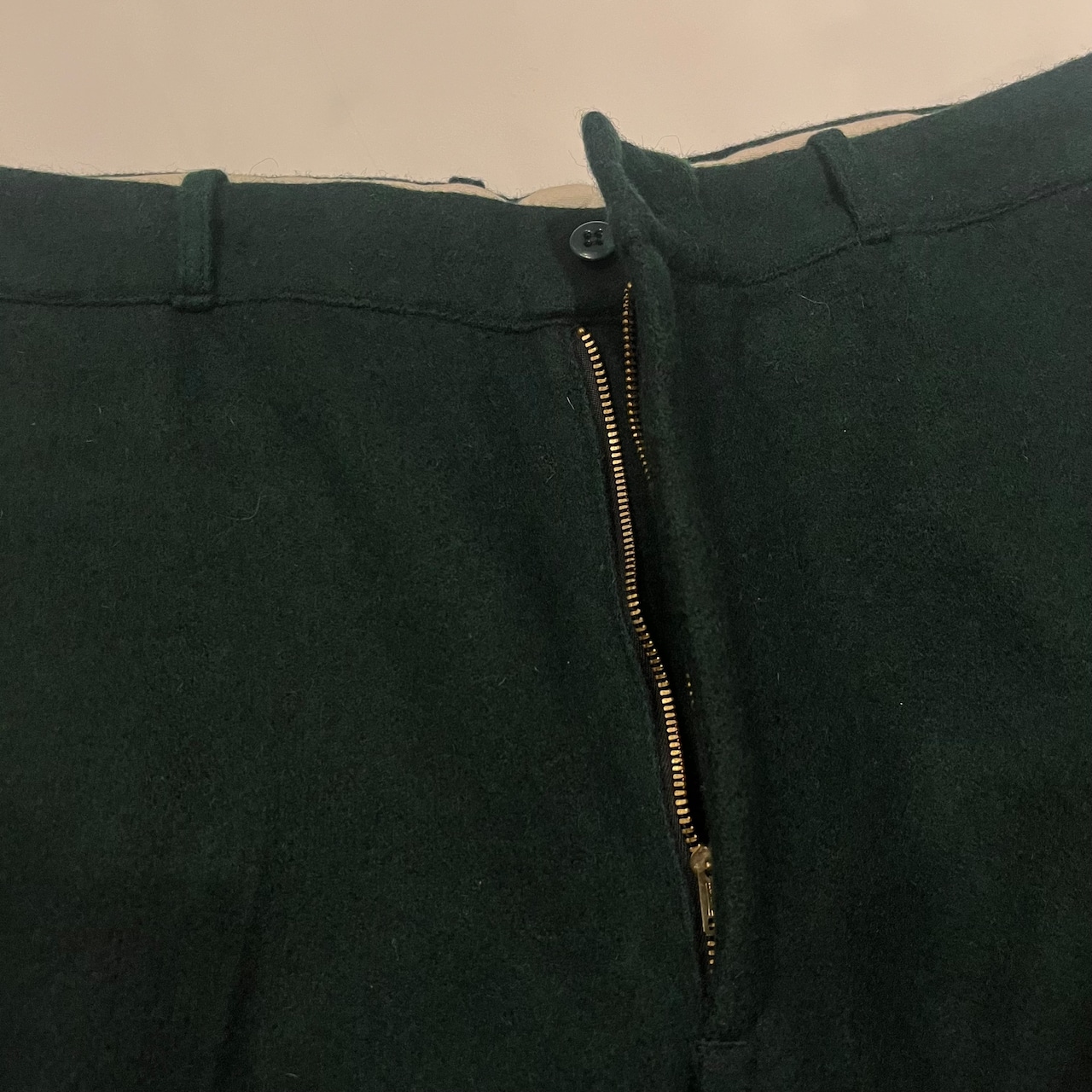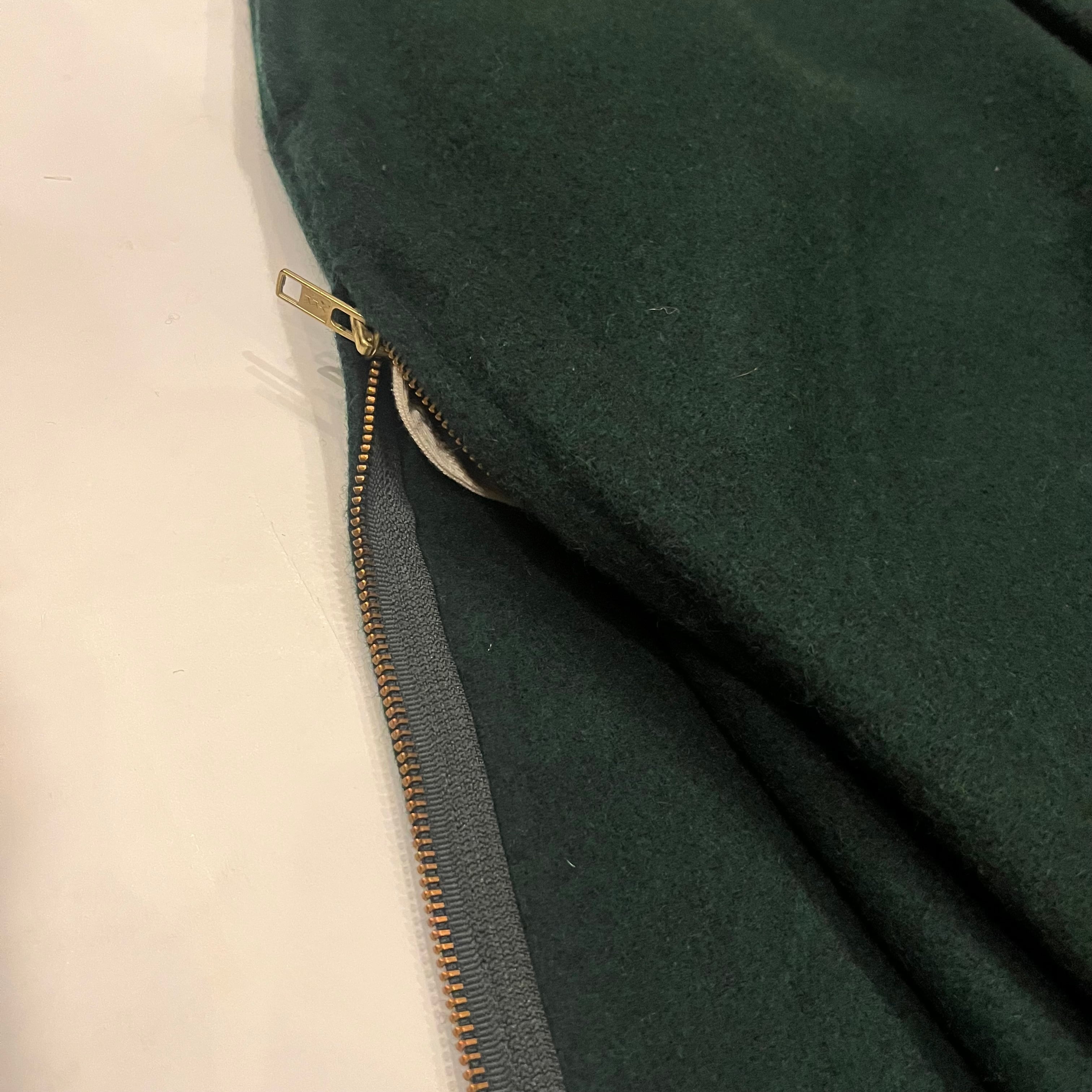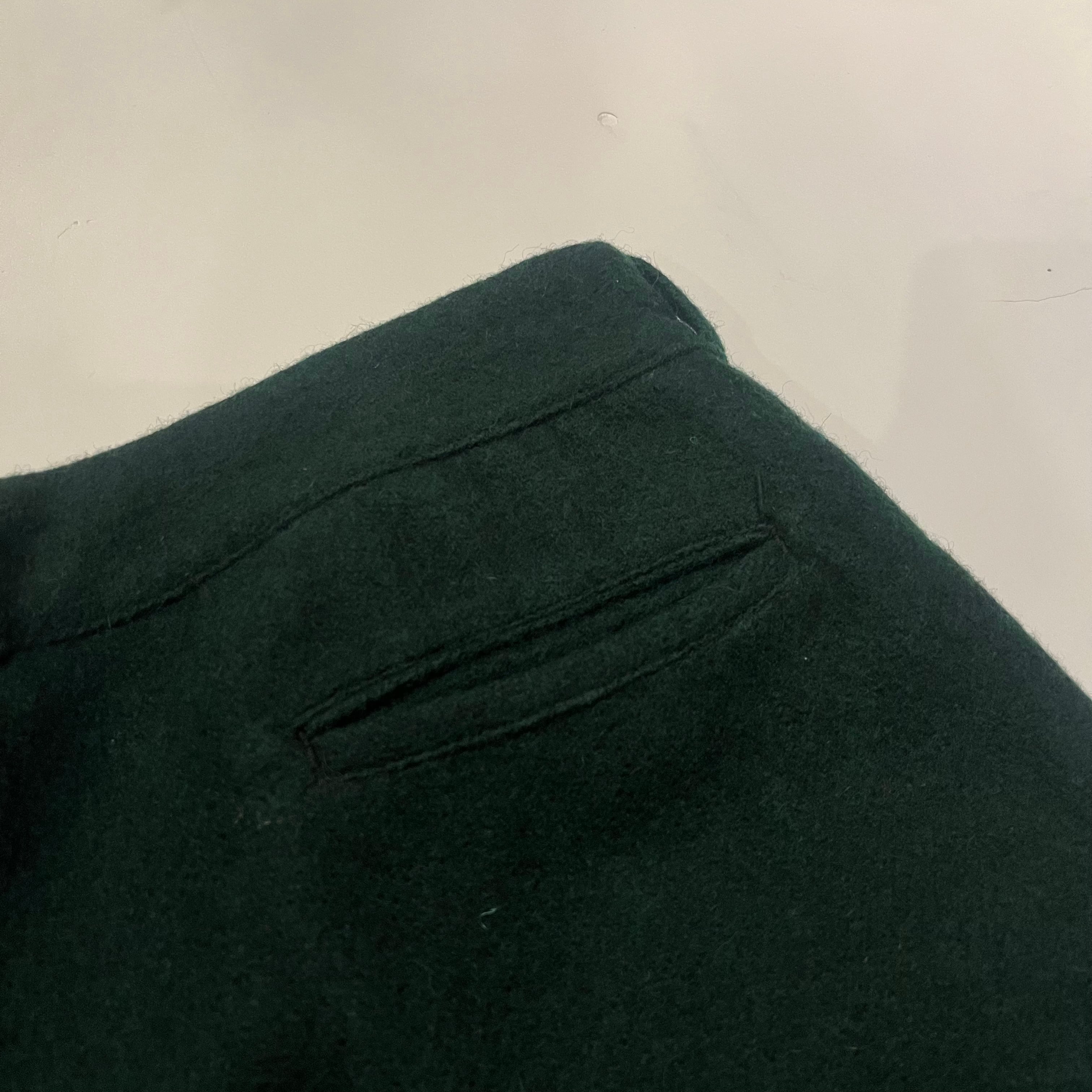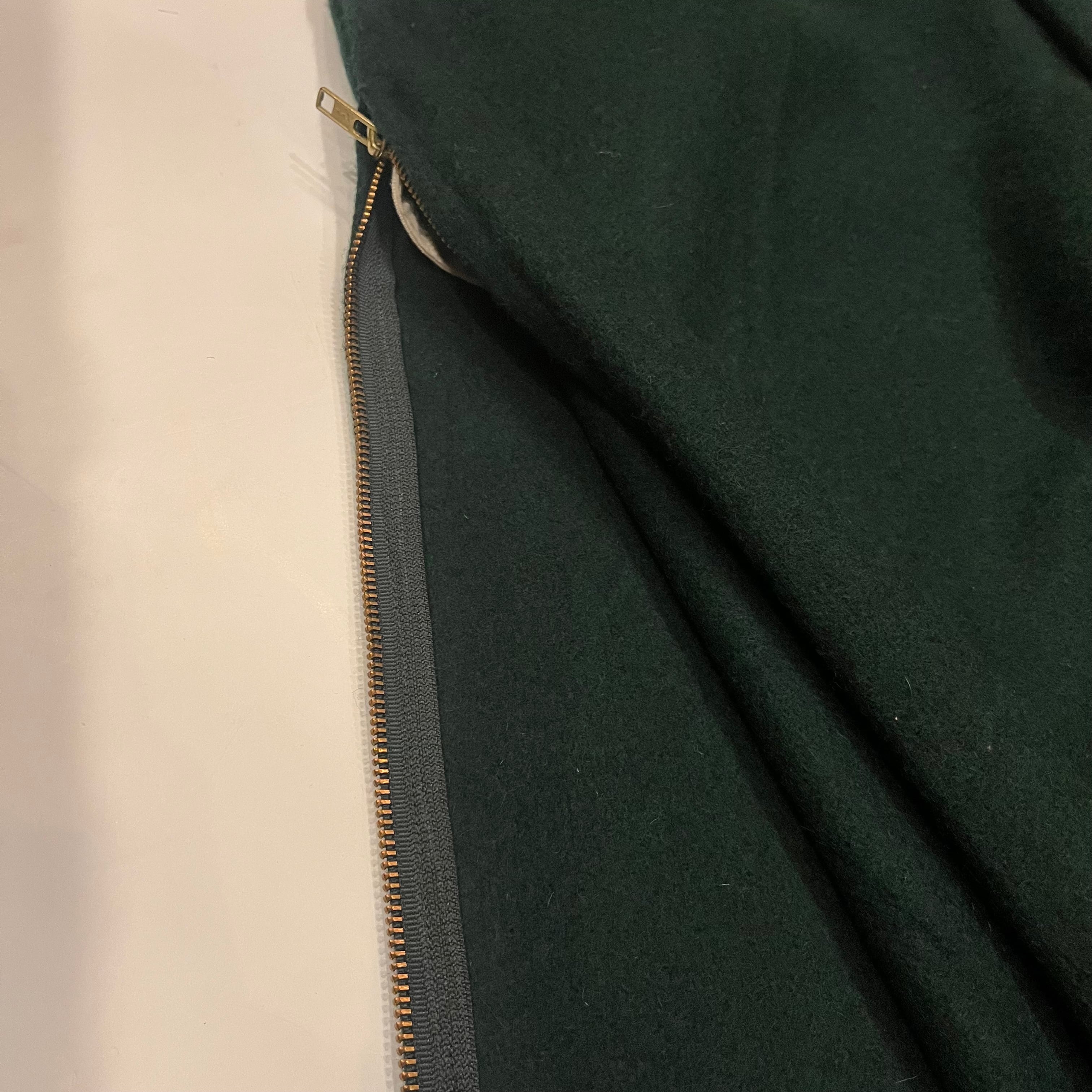 メルトンウールのパンツになります。色はオリーブのようなカラーです。サイドには長めのジップがついていてパンツをレイヤードして履くことも可能です。スカート感覚で重ねることができると思います。重さがあるので下にストンと落ちるようなシルエットになります。ベストの締め具合に寄って変化をつけて履くこともできそうです。